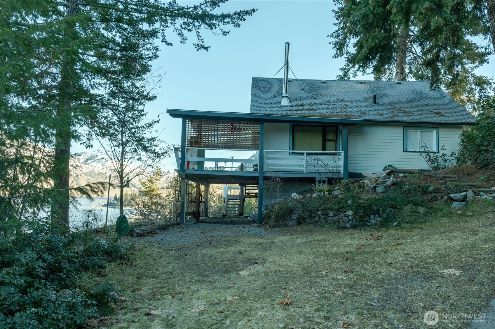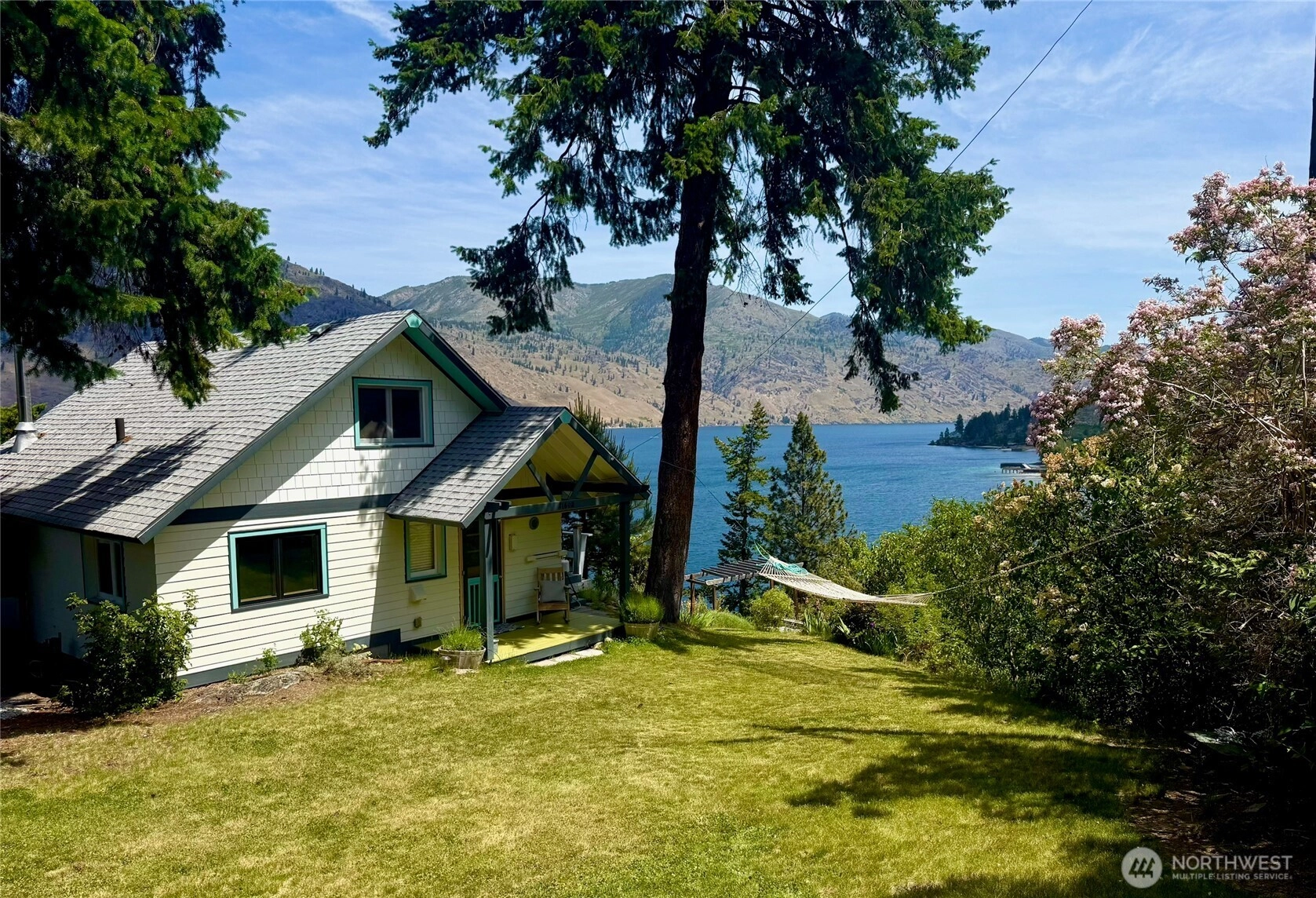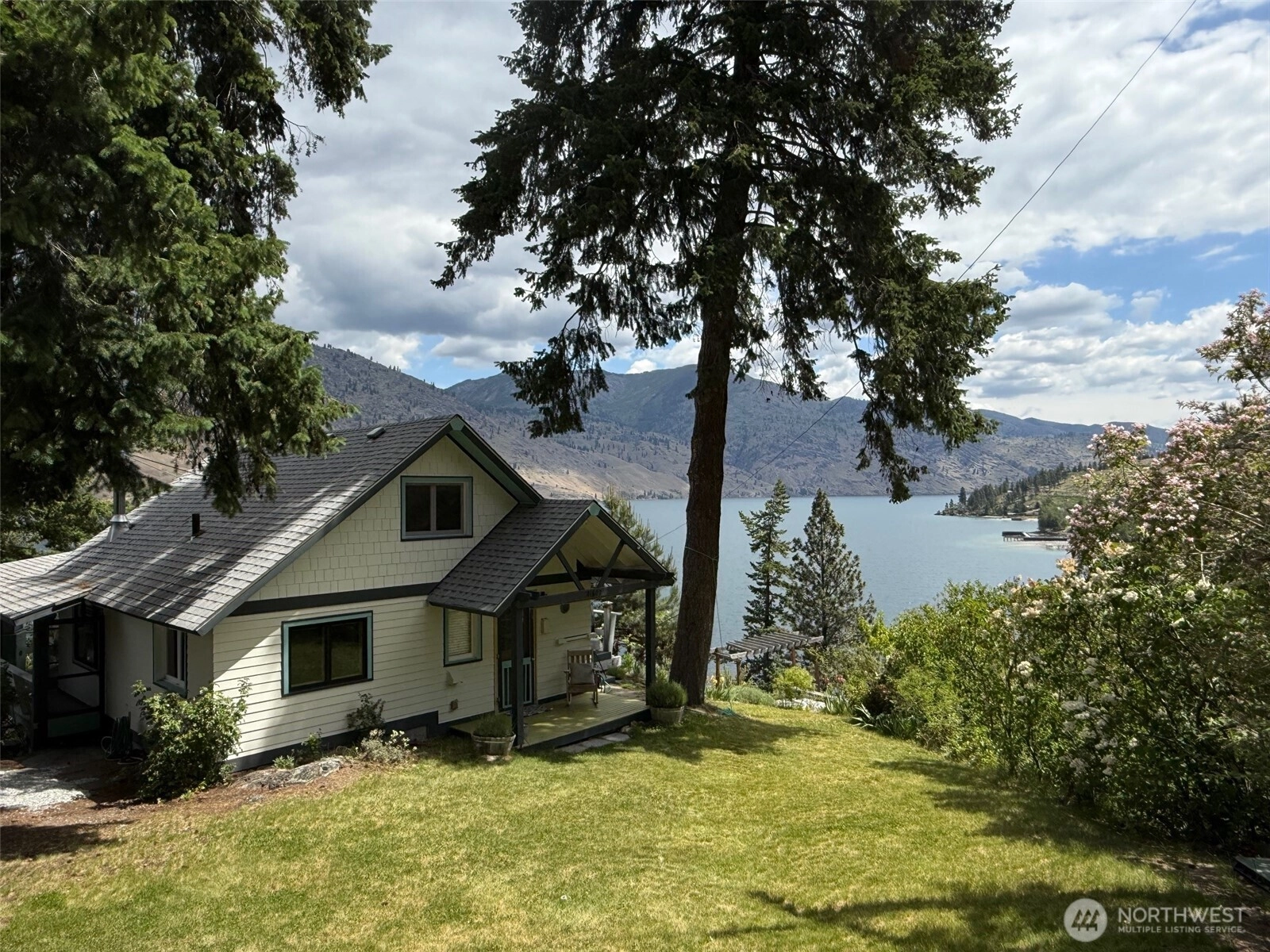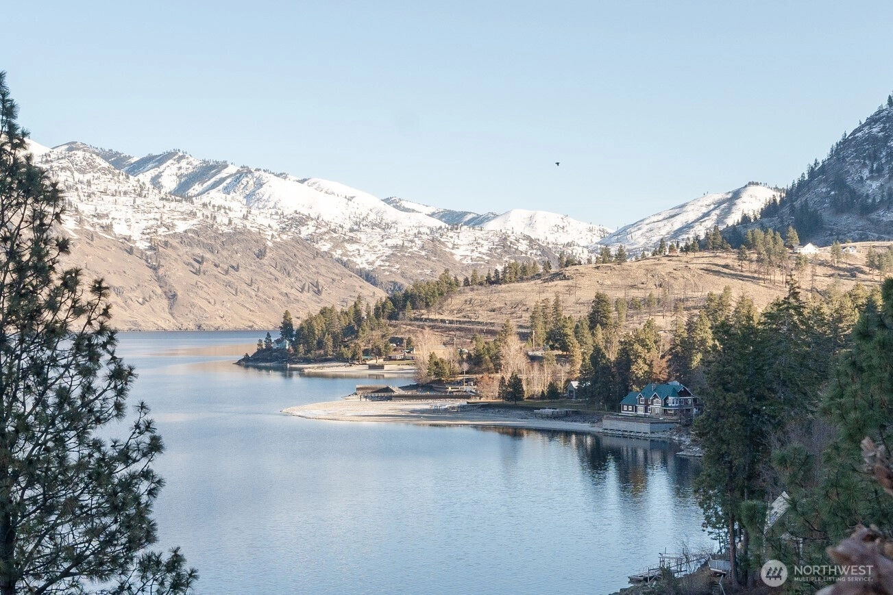 Price reduction for this charming waterfront cottage on the wooded knoll of Robison's Holiday Point, is located close to 25 Mile Creek. Home has been artfully updated to an appealing mid century style. Featuring an intimate three bedroom / two bath home. View the sunrise from your covered deck. Take a shared stairway to your 50 feet of waterfront and boat house. Shared Dock has boat lift and steel gangway. This naturalized setting is a stunning viewpoint both up and down lake. Lots of room for outdoor activities with fenced yard, lawn, trees, sun deck, covered deck attached to home or walking on this quiet dead end lane. This is a unique one of a kind location for Lake Chelan. Property is over one half acre and a water right.