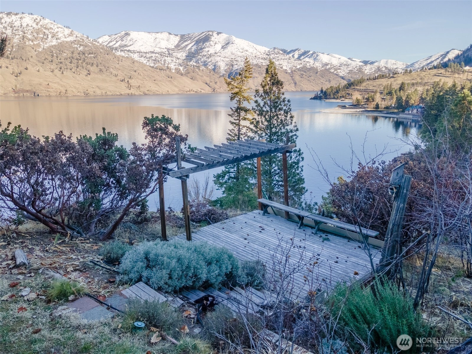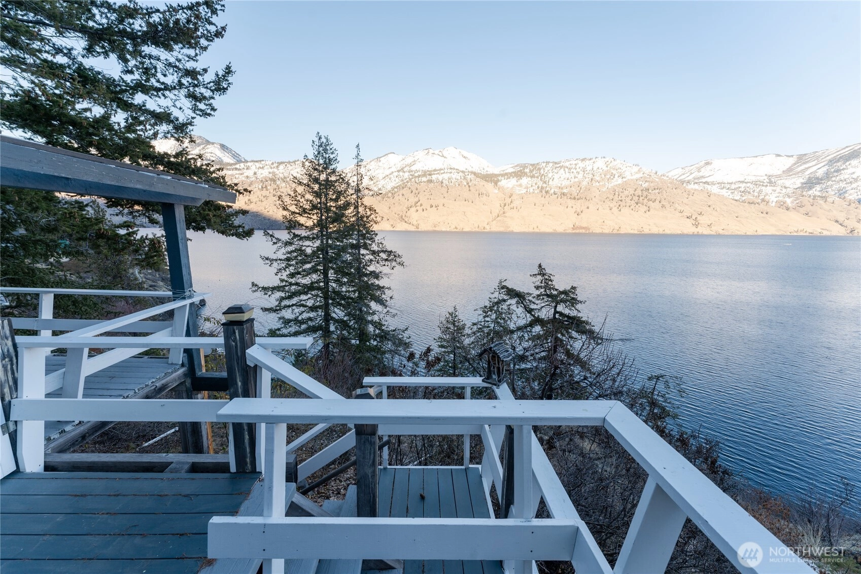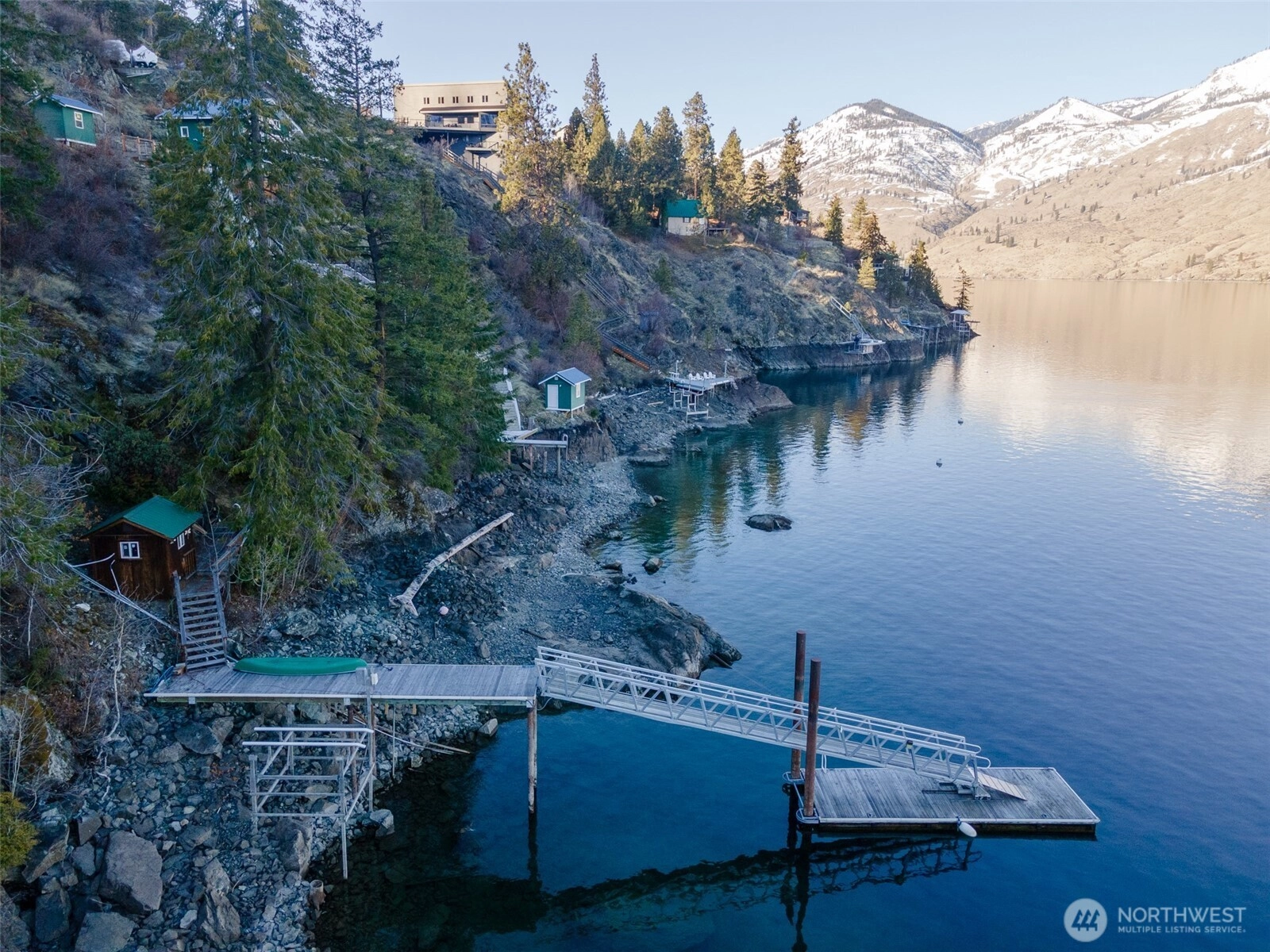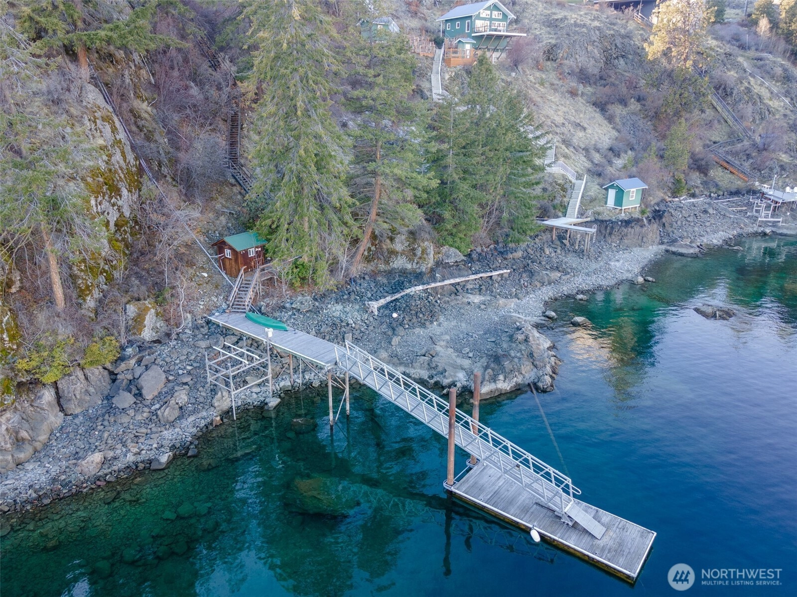 Price reduction for this charming waterfront cottage on the wooded knoll of Robison's Holiday Point, is located close to 25 Mile Creek. Home has been artfully updated to an appealing mid century style. Featuring an intimate three bedroom / two bath home. View the sunrise from your covered deck. Take a shared stairway to your 50 feet of waterfront and boat house. Shared Dock has boat lift and steel gangway. This naturalized setting is a stunning viewpoint both up and down lake. Lots of room for outdoor activities with fenced yard, lawn, trees, sun deck, covered deck attached to home or walking on this quiet dead end lane. This is a unique one of a kind location for Lake Chelan. Property is over one half acre and a water right.