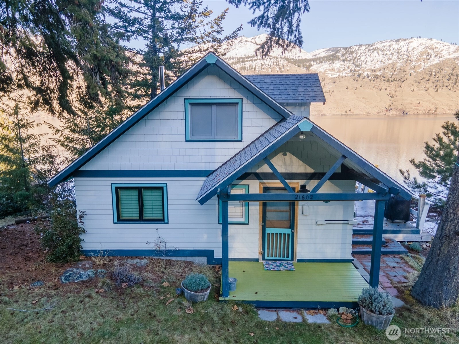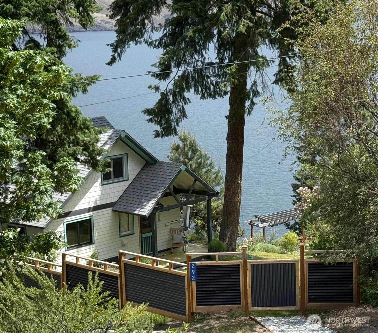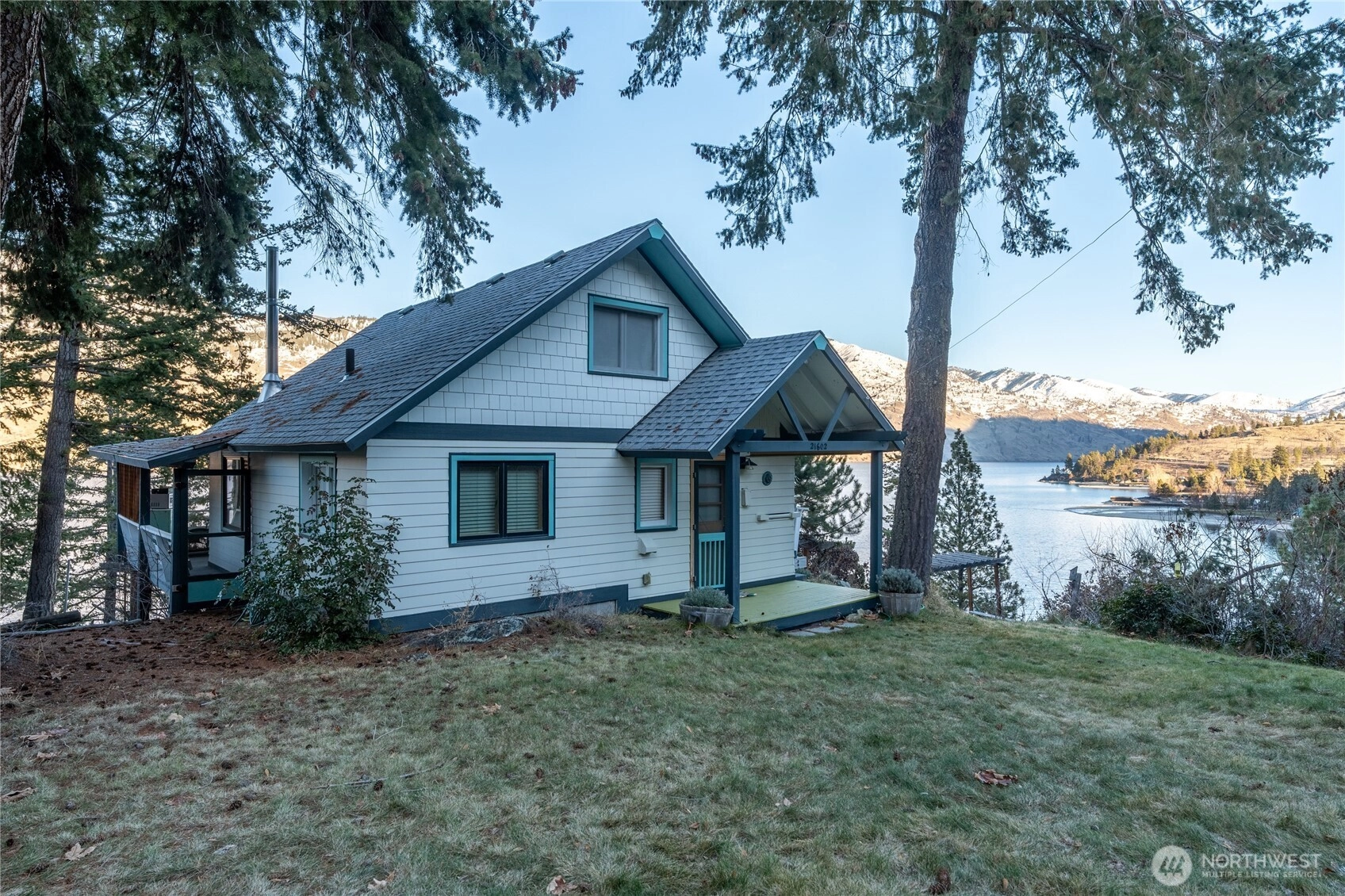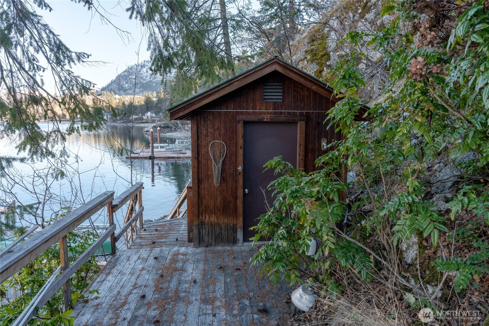 Price reduction for this charming waterfront cottage on the wooded knoll of Robison's Holiday Point, is located close to 25 Mile Creek. Home has been artfully updated to an appealing mid century style. Featuring an intimate three bedroom / two bath home. View the sunrise from your covered deck. Take a shared stairway to your 50 feet of waterfront and boat house. Shared Dock has boat lift and steel gangway. This naturalized setting is a stunning viewpoint both up and down lake. Lots of room for outdoor activities with fenced yard, lawn, trees, sun deck, covered deck attached to home or walking on this quiet dead end lane. This is a unique one of a kind location for Lake Chelan. Property is over one half acre and a water right.