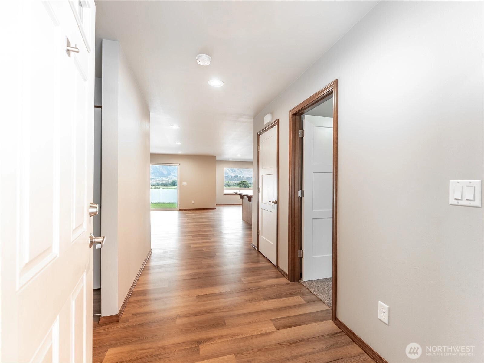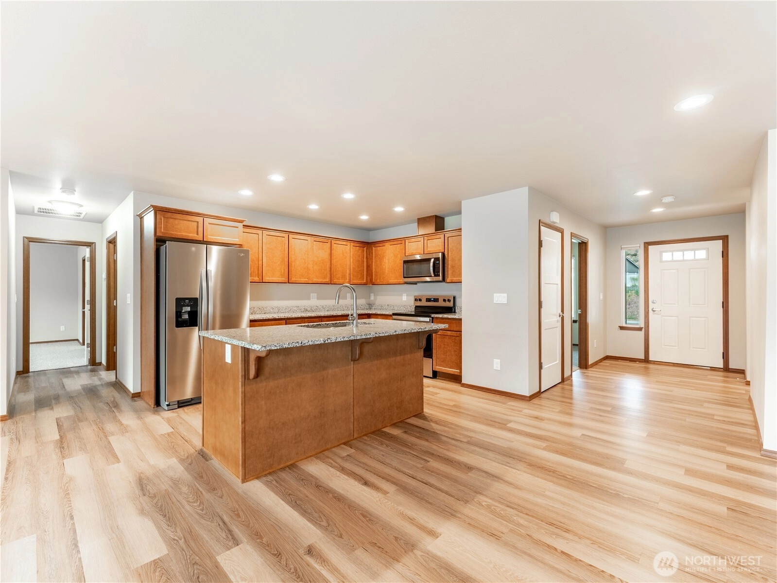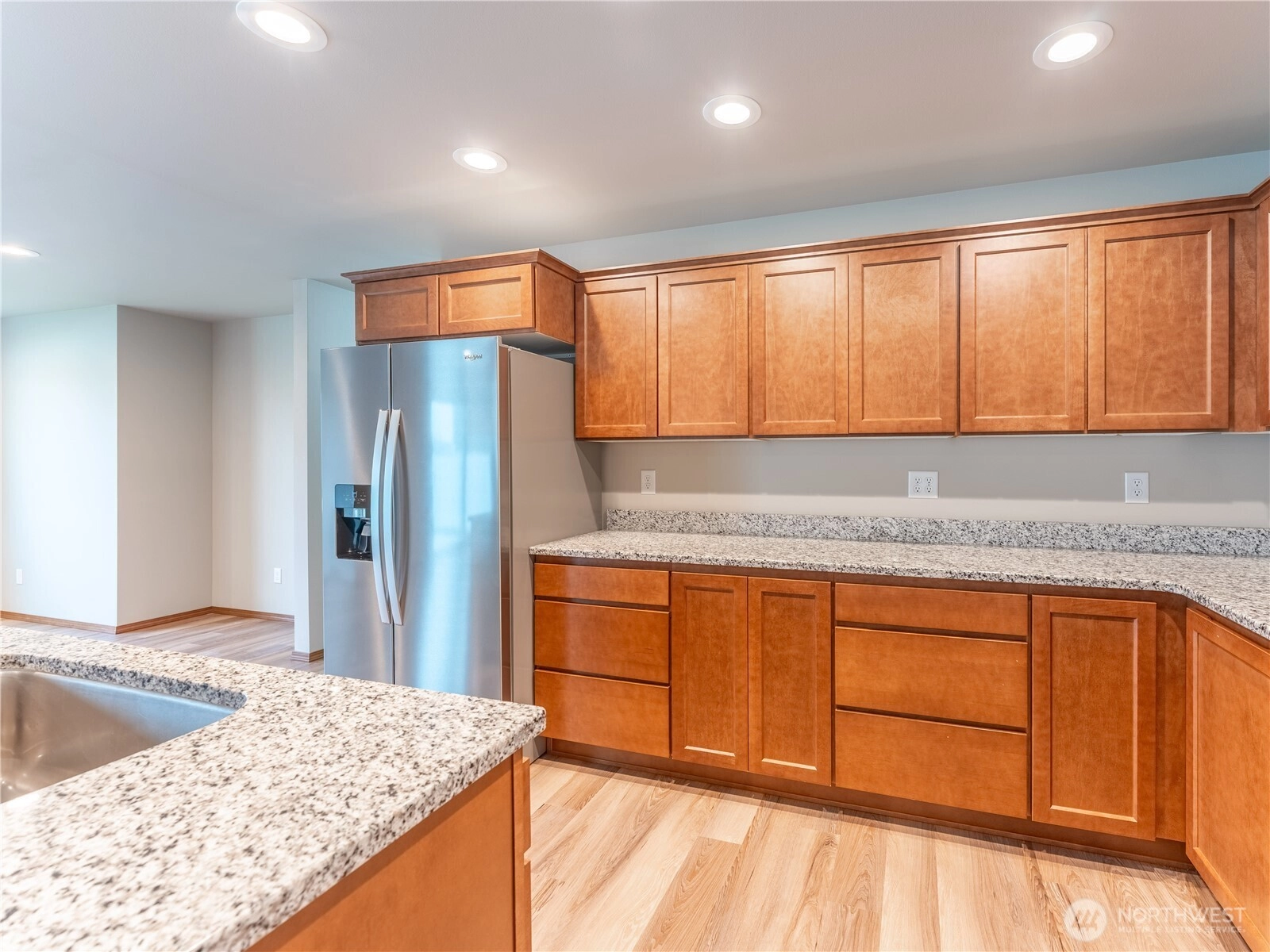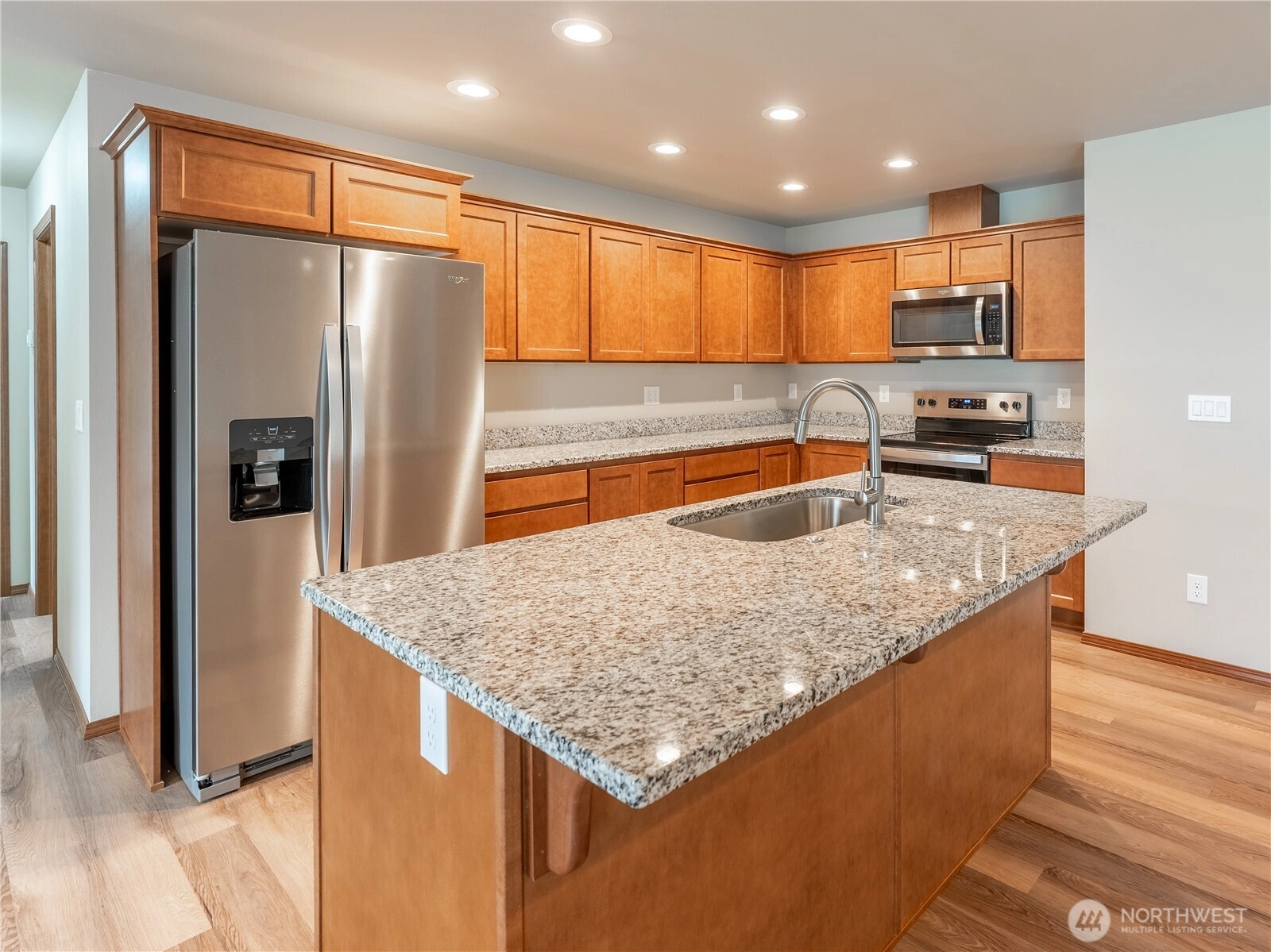 Wonderful one level home overlooking Hammond Lake with new carpet, lvp flooring and interior paint! This beautiful plan frames the views and is fully landscaped with fencing and RV Parking. The great room is spacious. The kitchen boasts granite counters, lvp flooring, an island and refrigerator and overlooks Great room and dining with slider to patio. The primary suite is oversized and boasts a tiled shower, walk in closet and granite counters. The 2nd and 3rd bedrooms share a full bath with granite counters. Laundry room offers cabinetry and hanging rod as well as a washer/dryer! Home comes with blinds too! This great location boasts a walking path to Hammond Lake and Rock Island Golf Course!