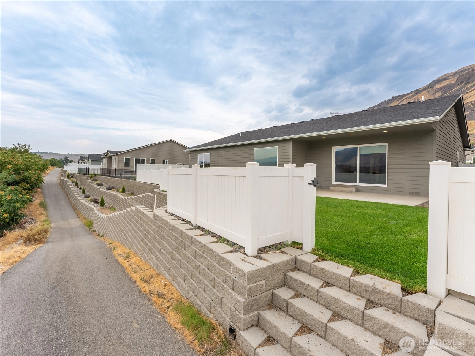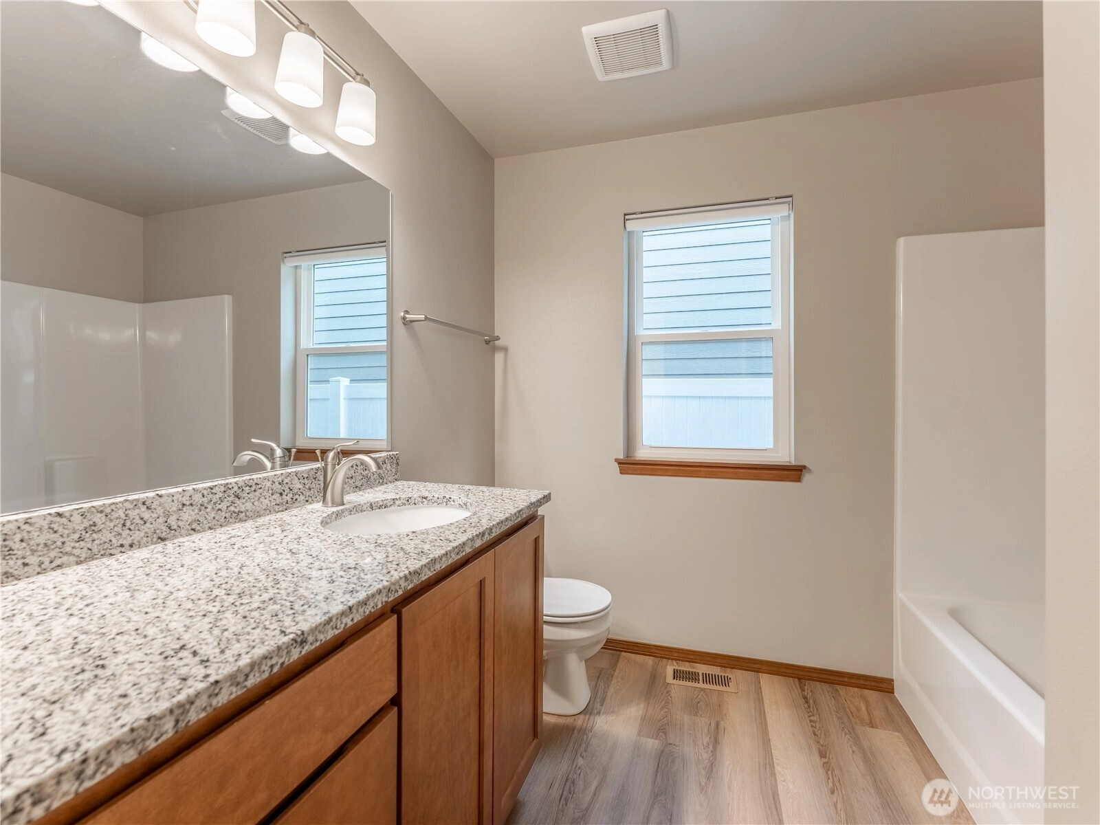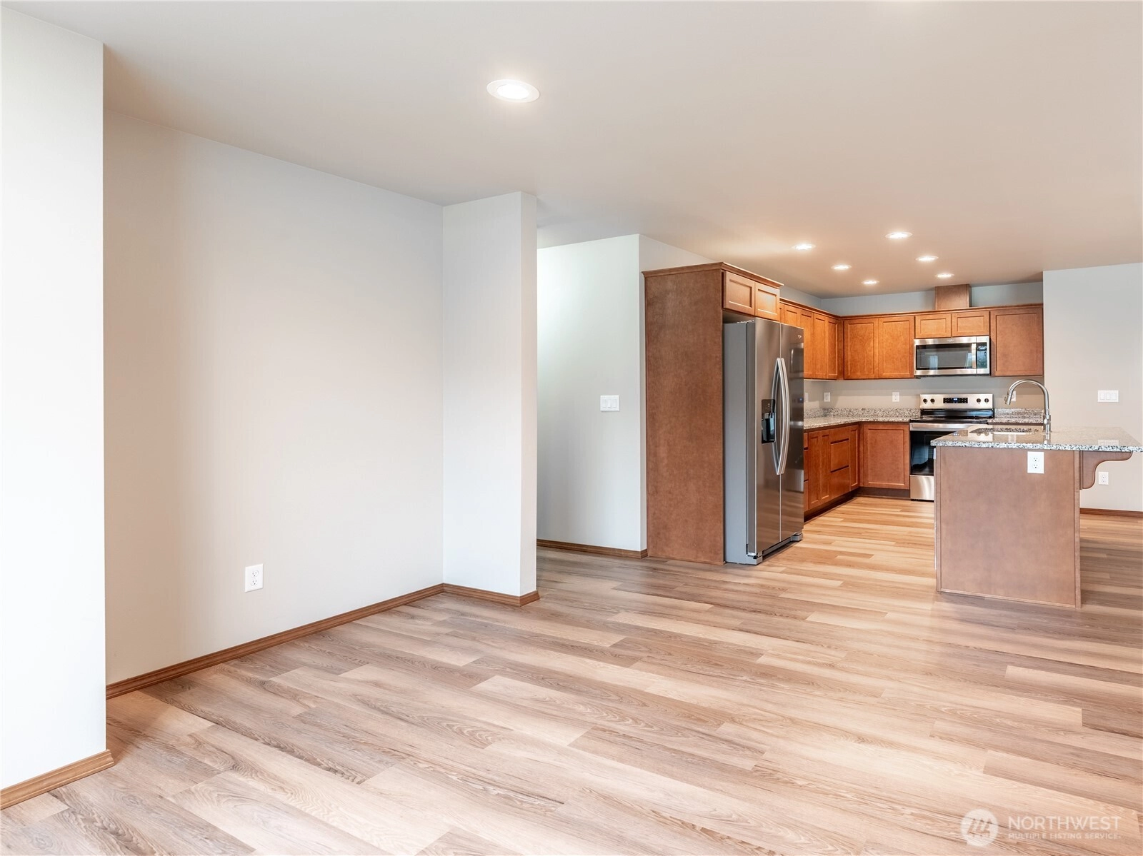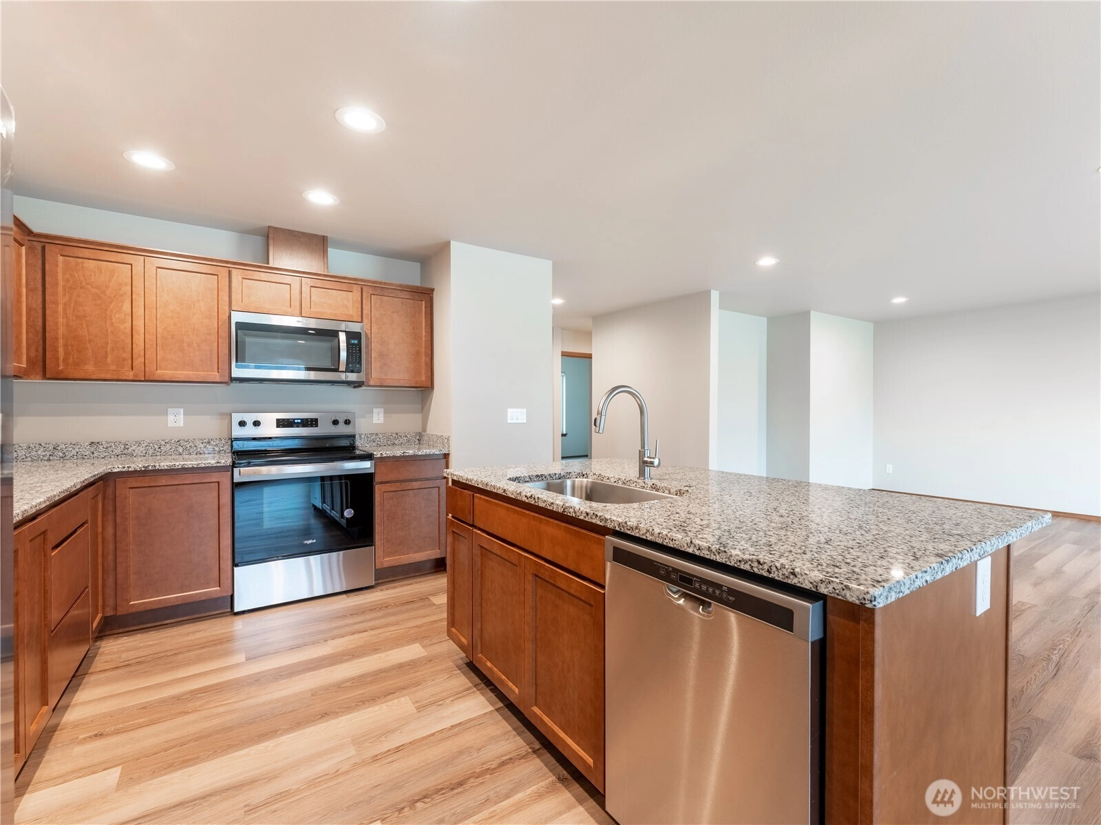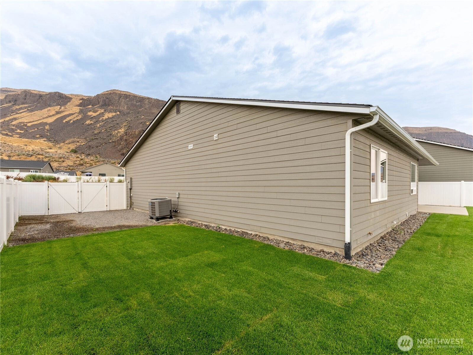 Wonderful one level home overlooking Hammond Lake with new carpet, lvp flooring and interior paint! This beautiful plan frames the views and is fully landscaped with fencing and RV Parking. The great room is spacious. The kitchen boasts granite counters, lvp flooring, an island and refrigerator and overlooks Great room and dining with slider to patio. The primary suite is oversized and boasts a tiled shower, walk in closet and granite counters. The 2nd and 3rd bedrooms share a full bath with granite counters. Laundry room offers cabinetry and hanging rod as well as a washer/dryer! Home comes with blinds too! This great location boasts a walking path to Hammond Lake and Rock Island Golf Course!