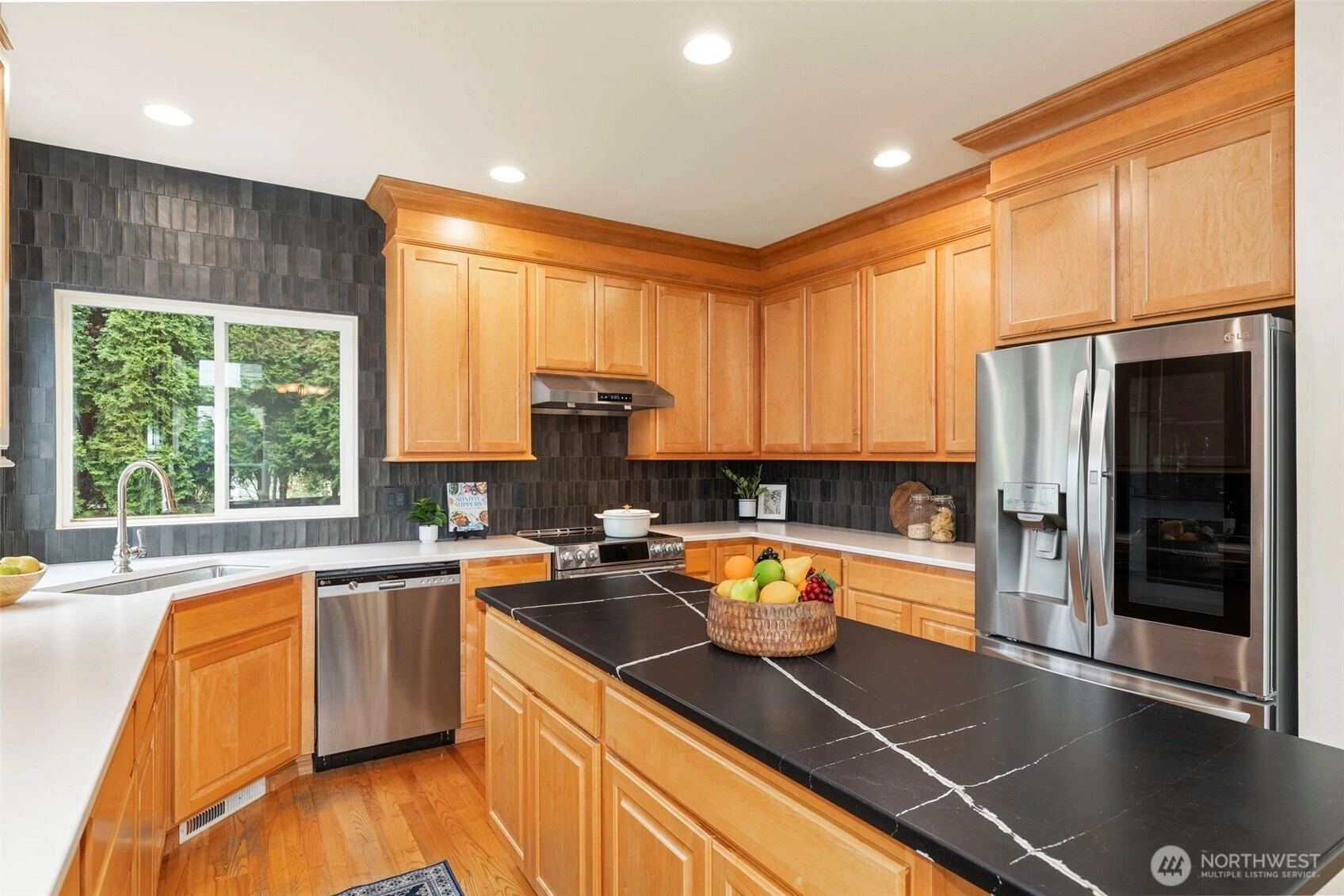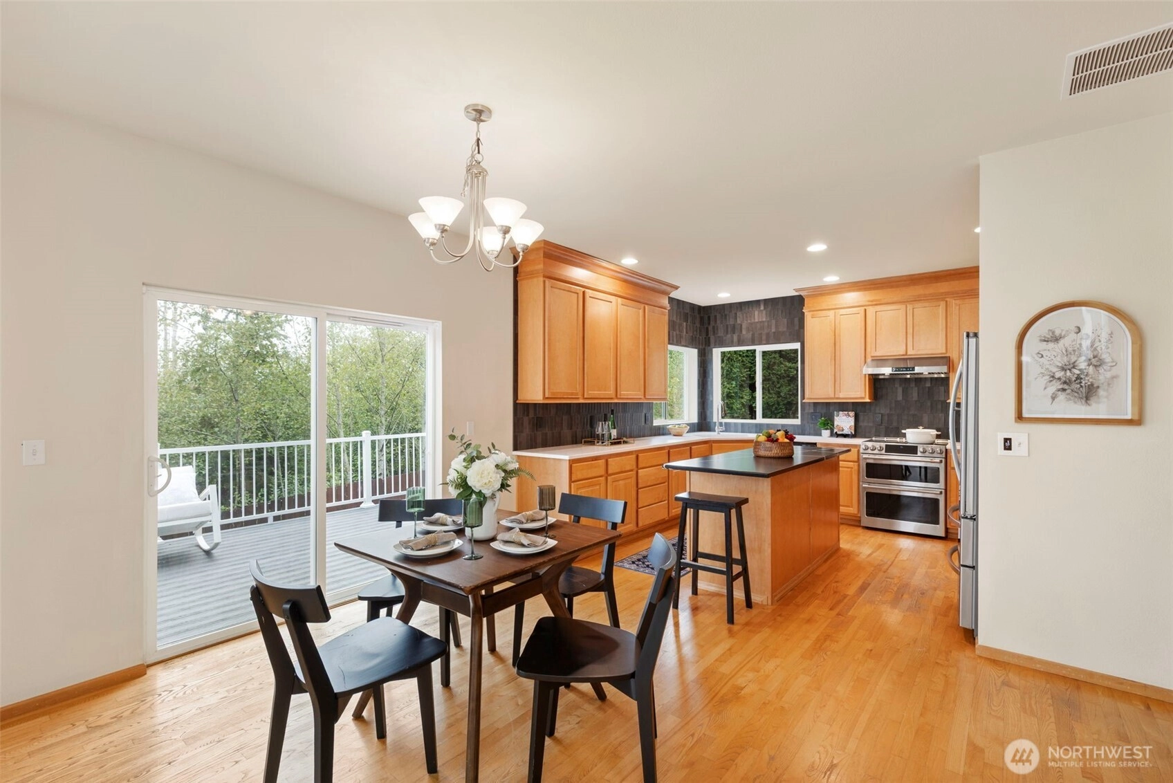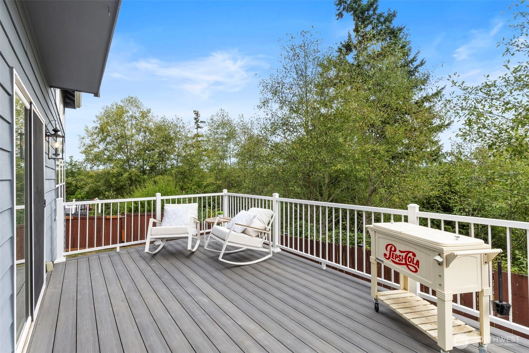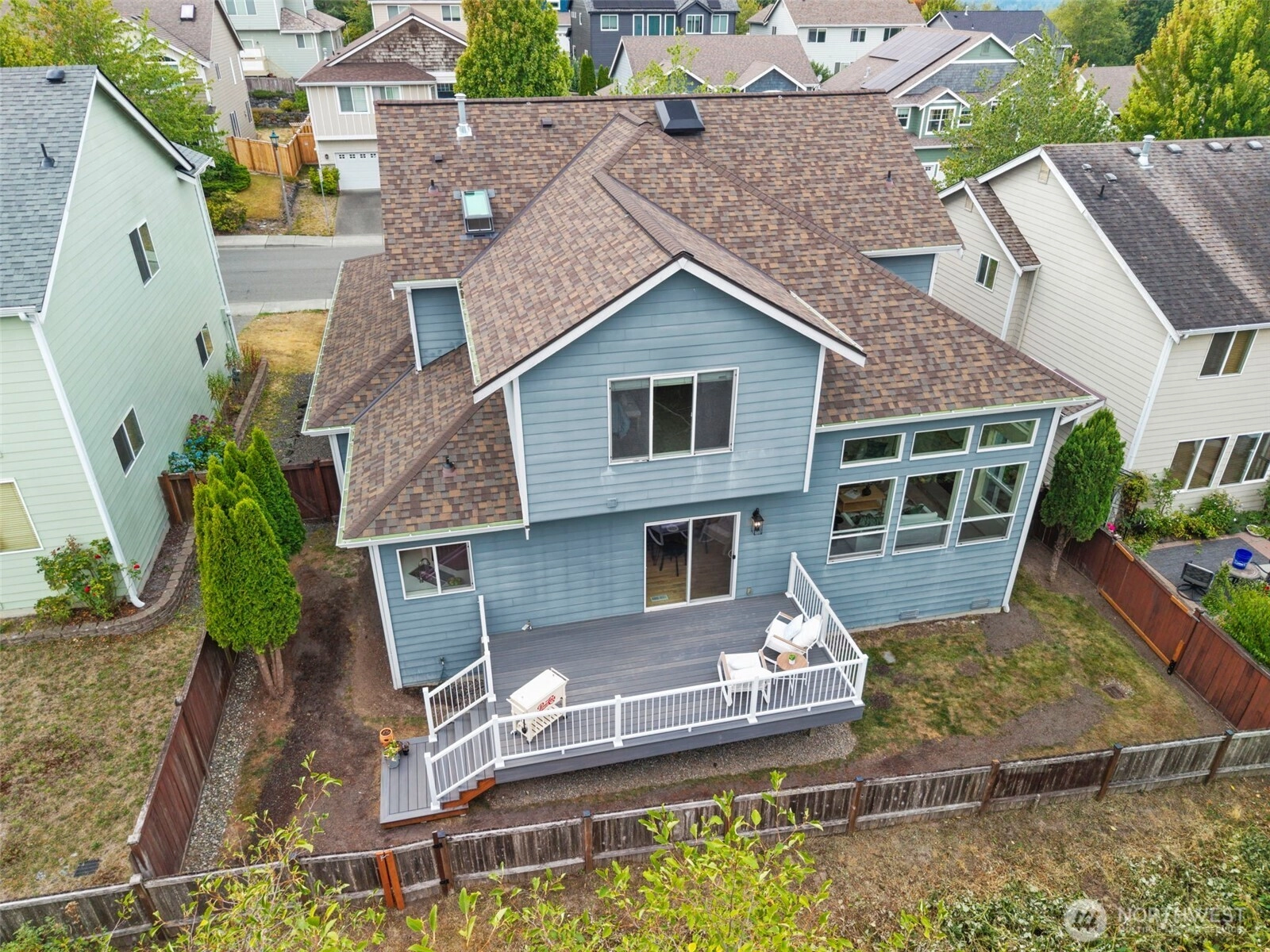 Beautifully maintained 4-bedroom home in quiet neighborhood of Meredith Heights in Poulsbo! Enter to vaulted ceilings and hardwood floors. Open and bright living room with gas fireplace. Recently updated kitchen with quartz counters, SS appliances, large island and slider to backyard with new Trex deck. Main floor bedroom, 3/4 bath and utility room. Spacious upstairs primary suite with 5pc bath and walk-in closet. Two additional bedrooms and full bathroom with double vanity, plus a huge family room! Fully fenced back yard, oversized two car garage, sprinkler system & wired for a generator! Perfectly located close to schools, downtown Poulsbo, shopping, dining and easy access to Highways, ferries & Navy Bases for an easy commute.