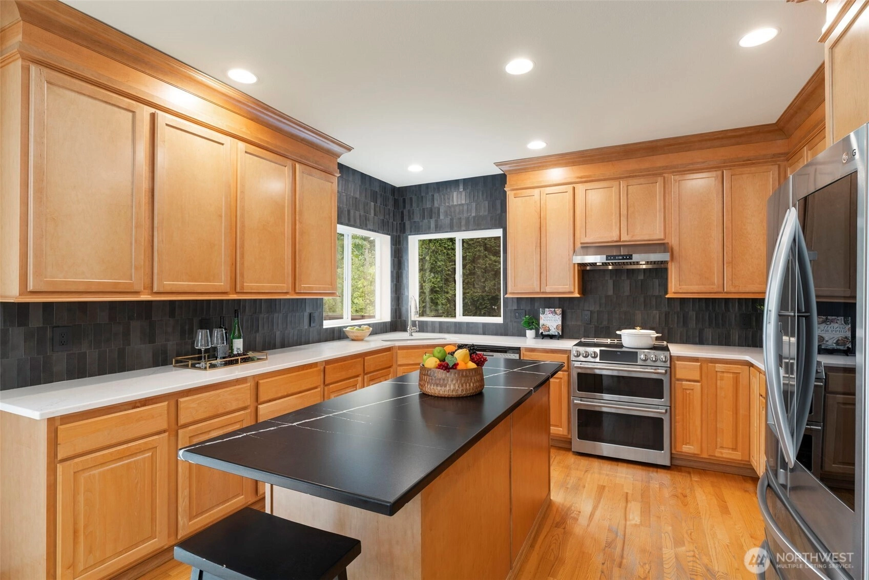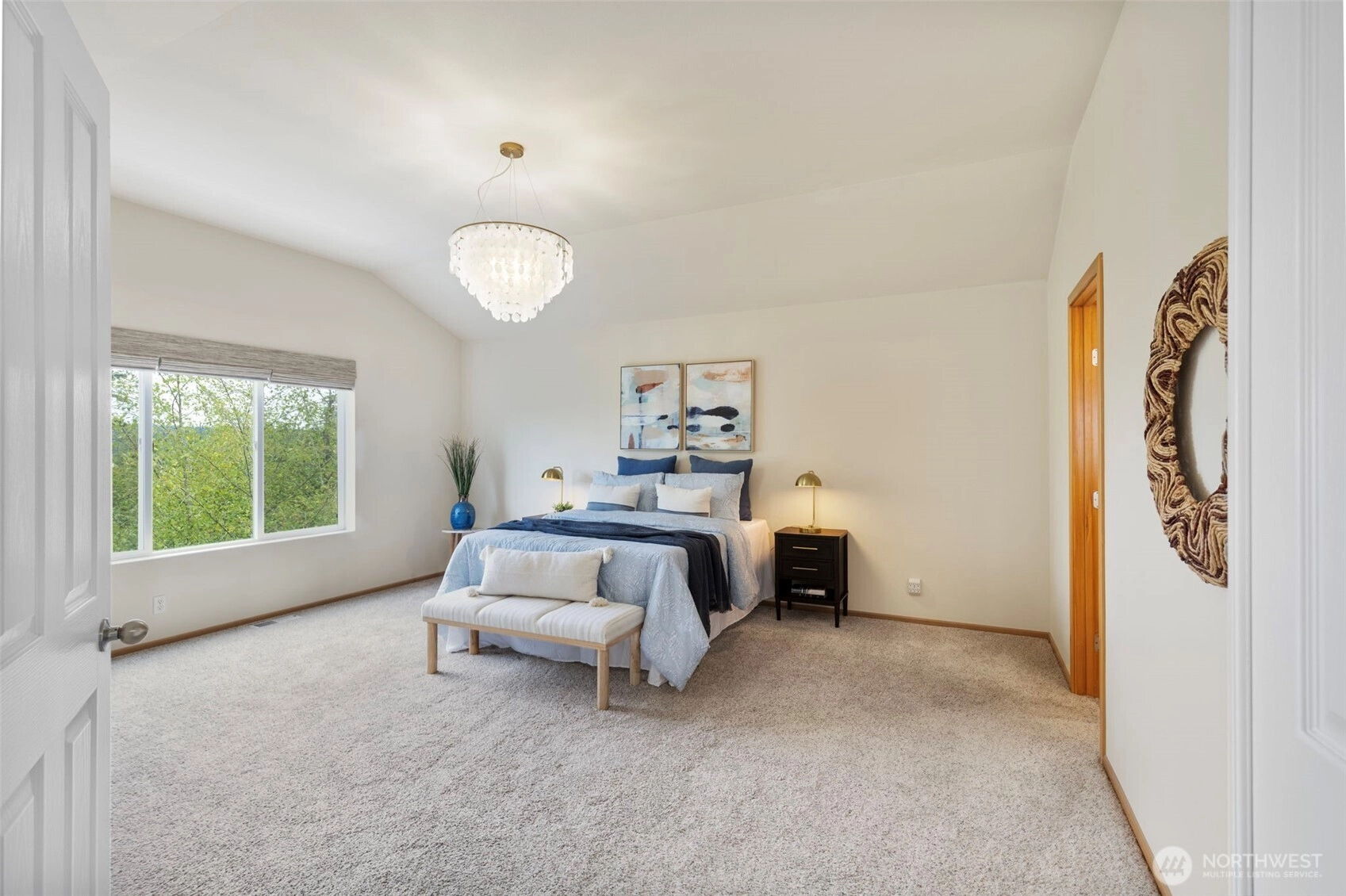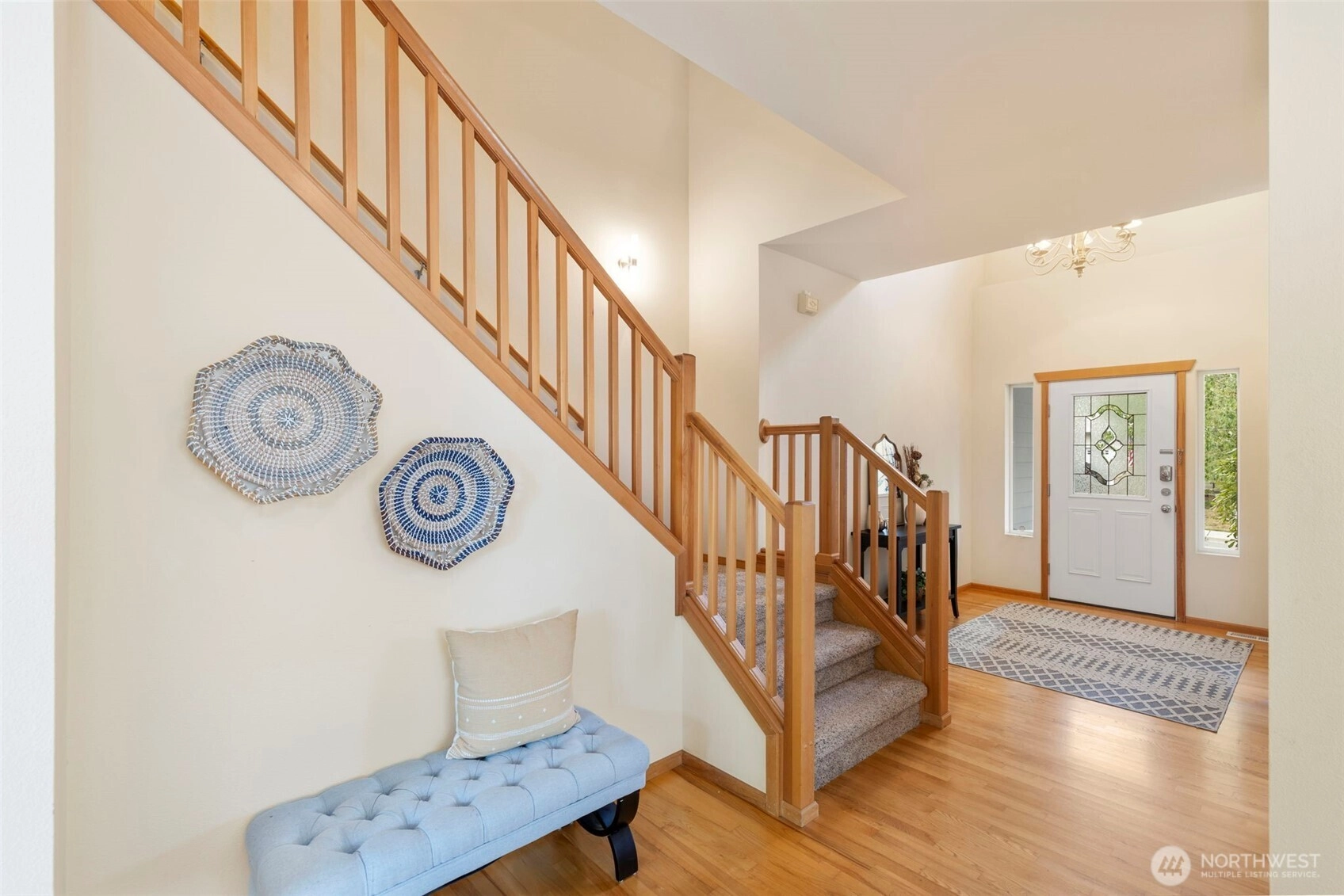 Beautifully maintained 4-bedroom home in quiet neighborhood of Meredith Heights in Poulsbo! Enter to vaulted ceilings and hardwood floors. Open and bright living room with gas fireplace. Recently updated kitchen with quartz counters, SS appliances, large island and slider to backyard with new Trex deck. Main floor bedroom, 3/4 bath and utility room. Spacious upstairs primary suite with 5pc bath and walk-in closet. Two additional bedrooms and full bathroom with double vanity, plus a huge family room! Fully fenced back yard, oversized two car garage, sprinkler system & wired for a generator! Perfectly located close to schools, downtown Poulsbo, shopping, dining and easy access to Highways, ferries & Navy Bases for an easy commute.
