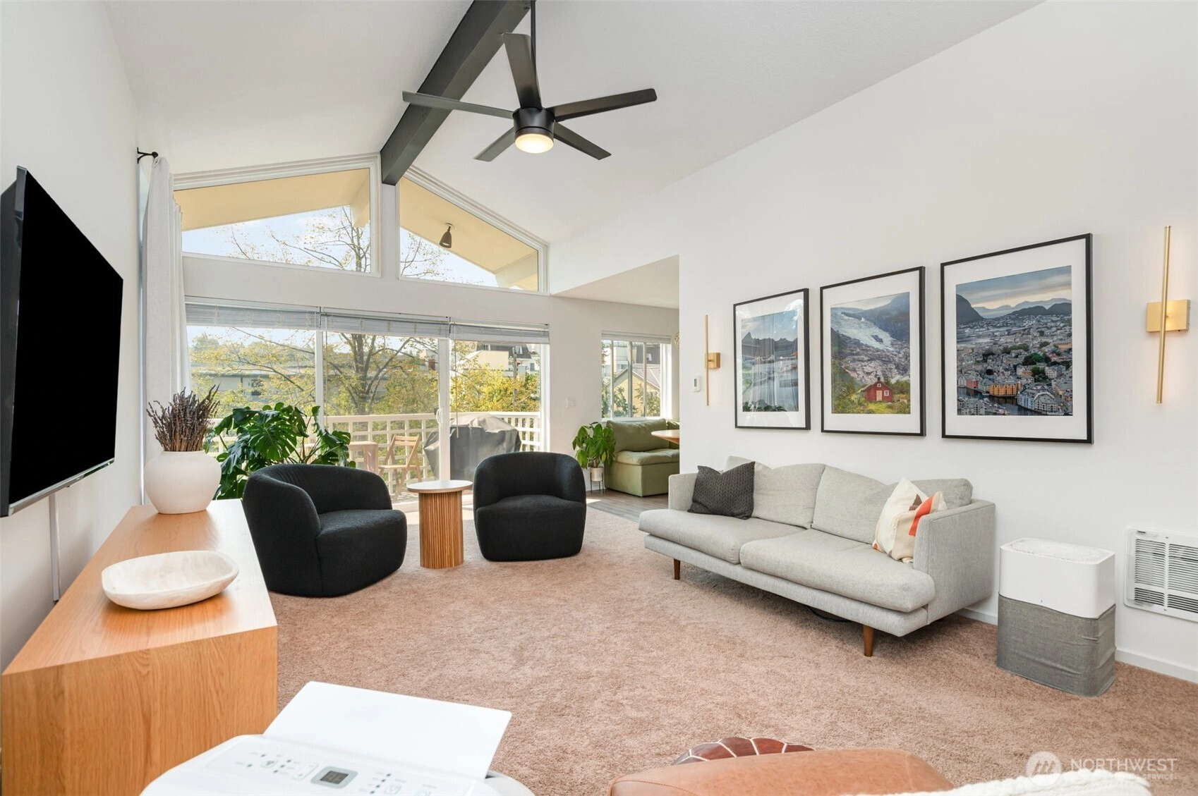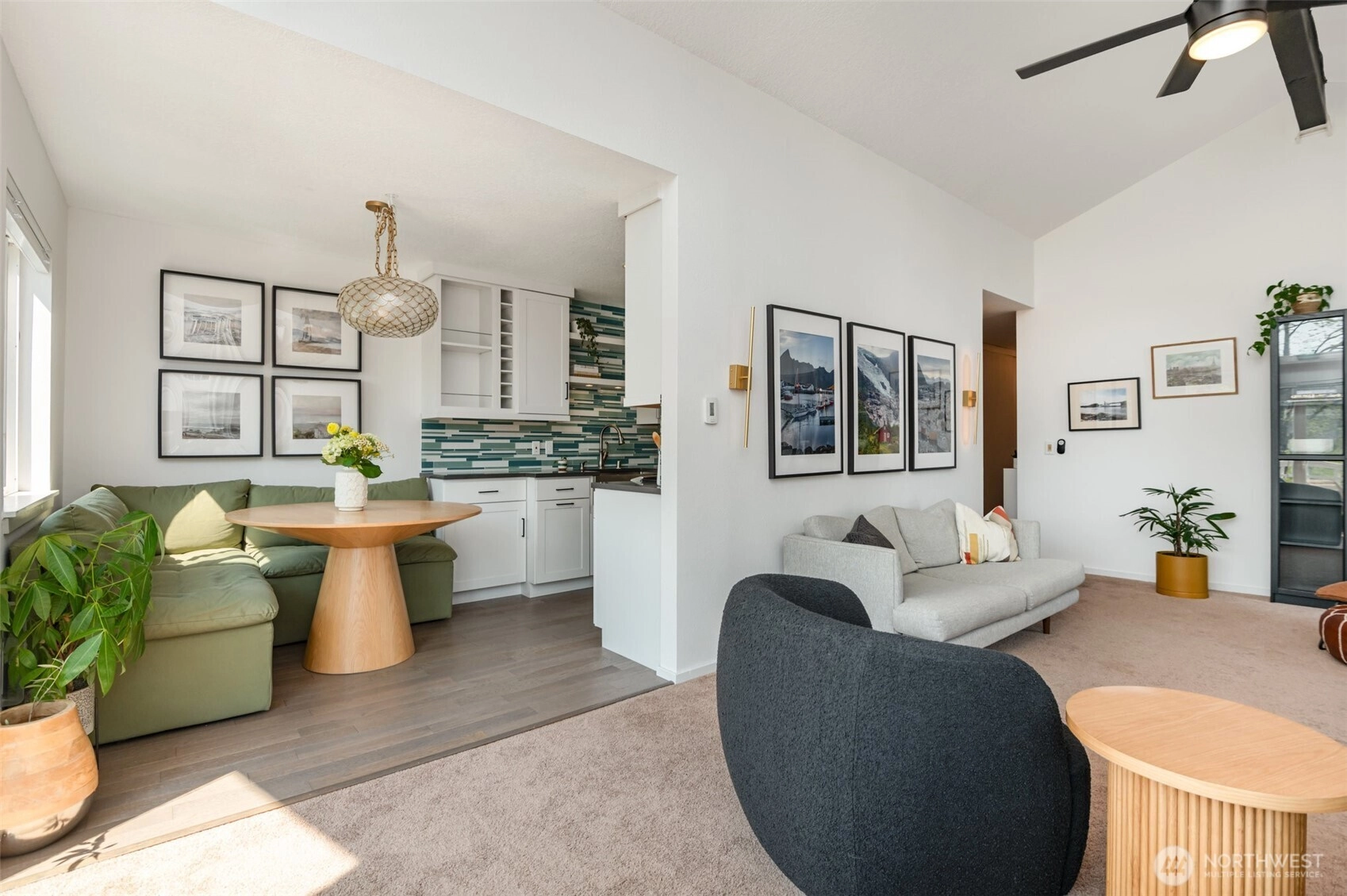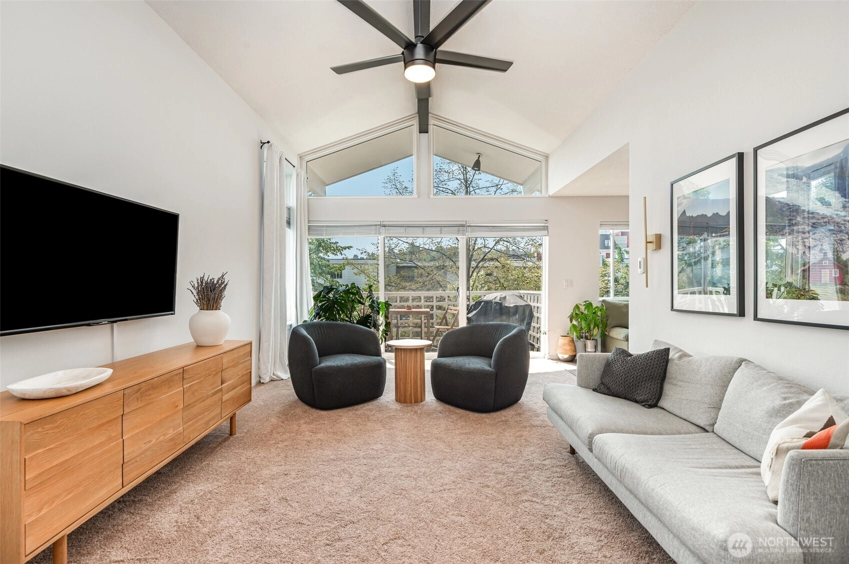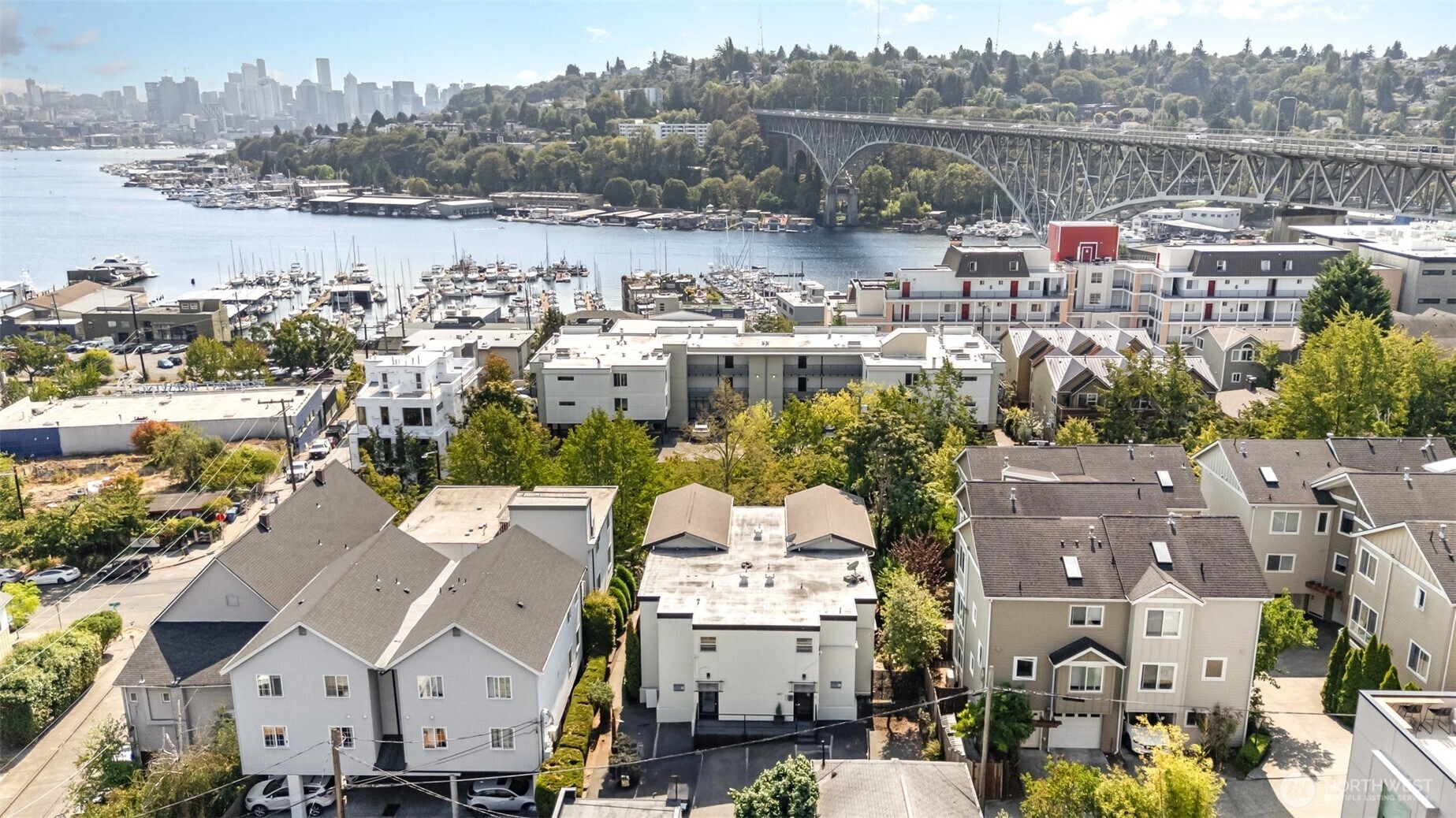 Welcome to Canal View! Rare opportunity in heart of Fremont. Penthouse unit with no shared walls & vaulted ceilings in Great room showcasing natural light & tree-lined views. Updated kitchen including quartz counters & tile backsplash. Cozy eating nook opens to living area & deck. Primary includes updated 3/4 bath & double closet w/built in organizer. Additional guest bedroom/office +Full bath! Excellent location, walking distance to shopping, coffee, restaurants, breweries, Sunday Street Market & Lake Union. Enjoy Summer BBQs on your deck while you take in all Fremont has to offer, serene peak-a-boo canal views & fireworks on 4th of July! Oversized parking spot/2-car Tandem. Well-run HOA, low dues & quiet friendly community. Move-in ready!