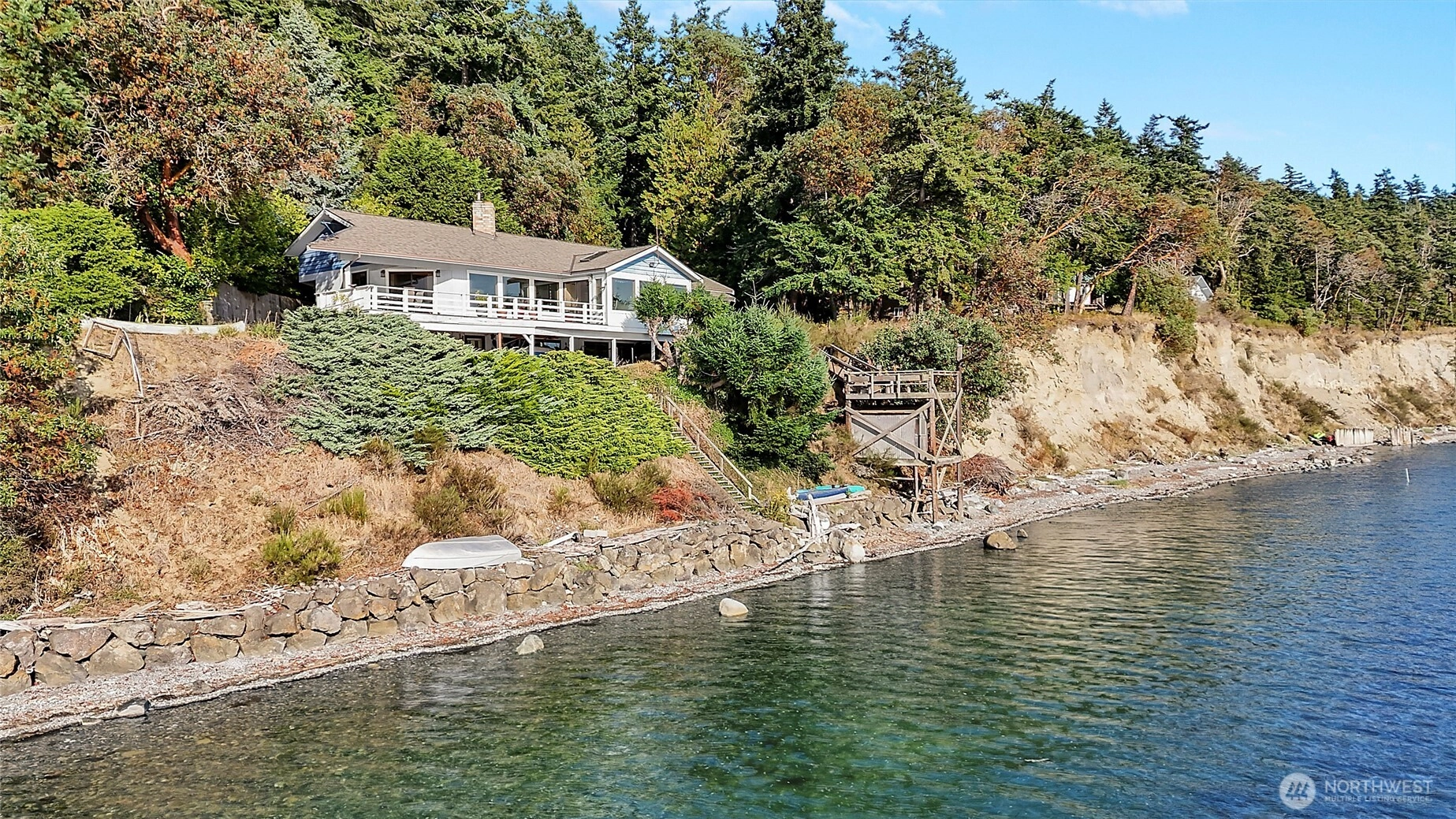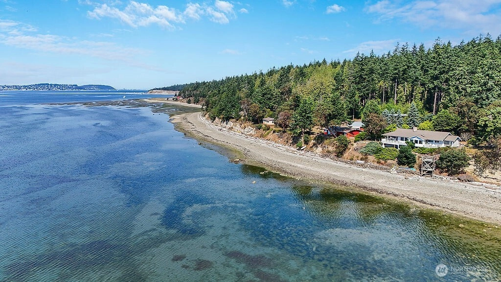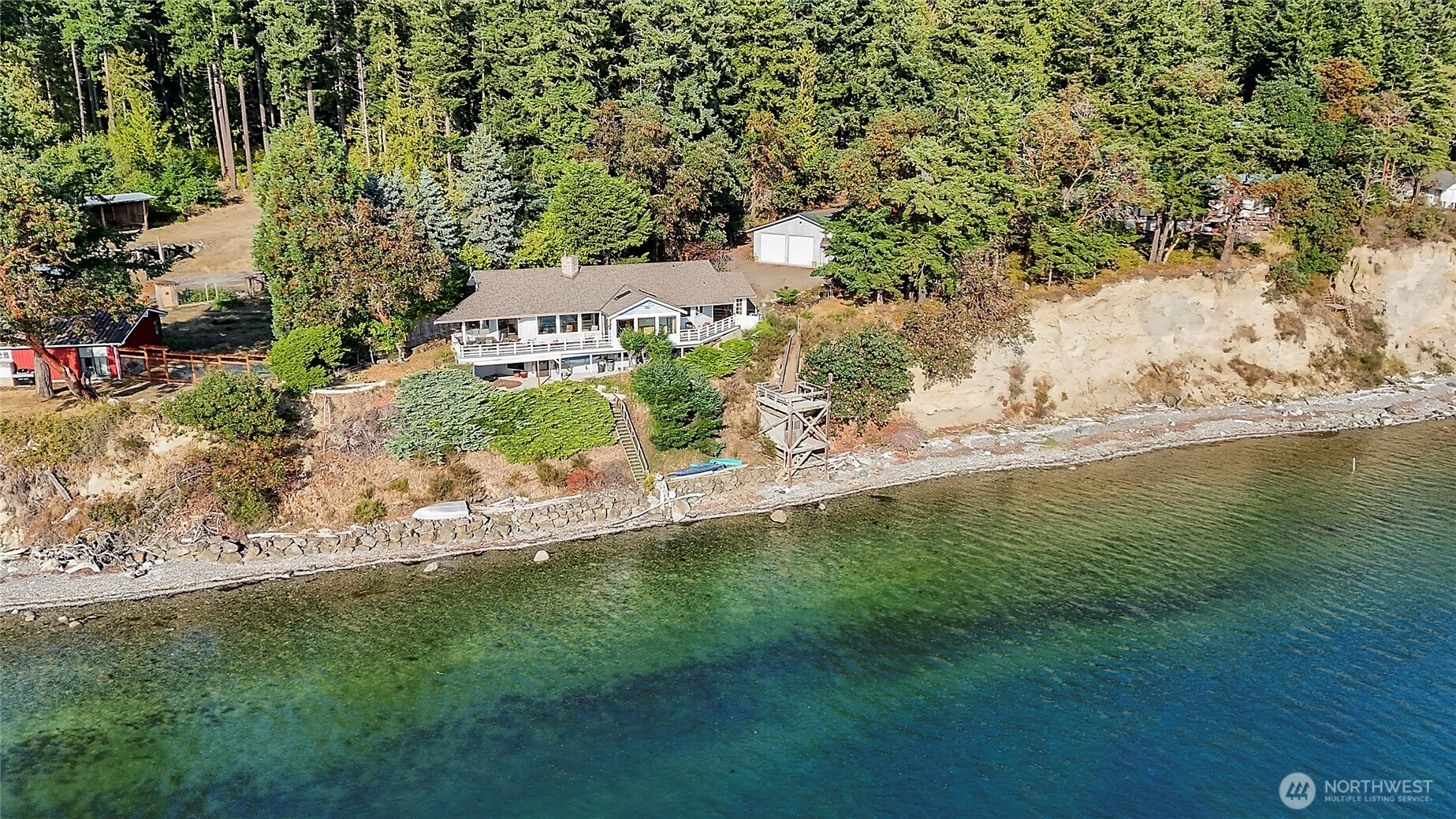 A rare opportunity to own a private waterfront retreat on a medium-bank bluff, just a few miles from Fort Flagler. This 2 bed/2 bath home combines natural beauty, quiet seclusion & endless recreation. Designed for single-level living, the main floor offers panoramic water views from the kitchen, dining & living rooms. The expansive basement provides abundant storage & flexible options; imagine a guest suite or recreation room. The detached oversized garage w/ shop space & carport accommodates all your hobbies and gear. Private beach stairs, protected by a rare bulkhead, lead to your own tidelands. Bask in all-day sun w/ western exposure, where the tranquil views of Kilisut Harbor give way to unforgettable sunsets over the Olympics.