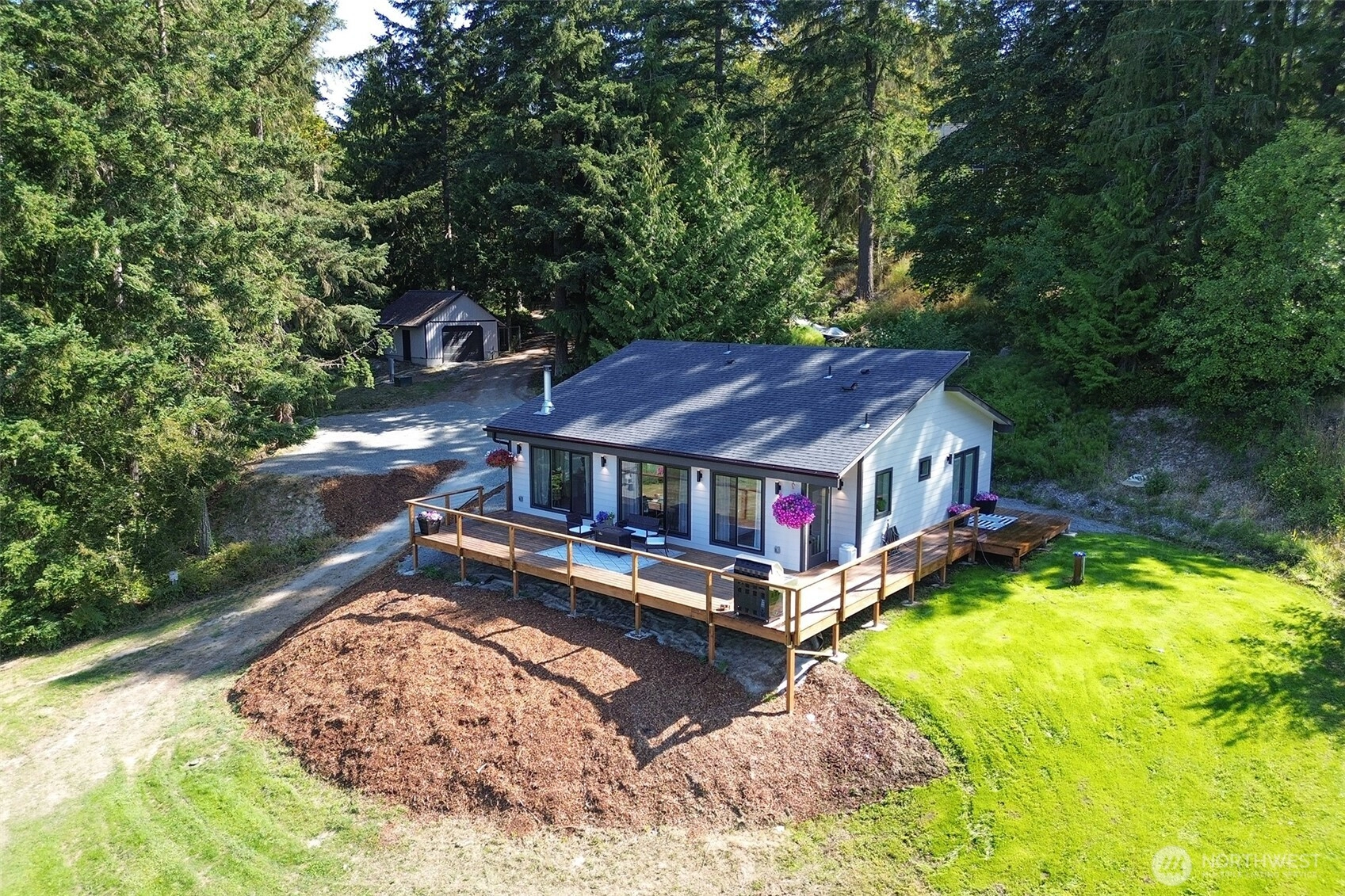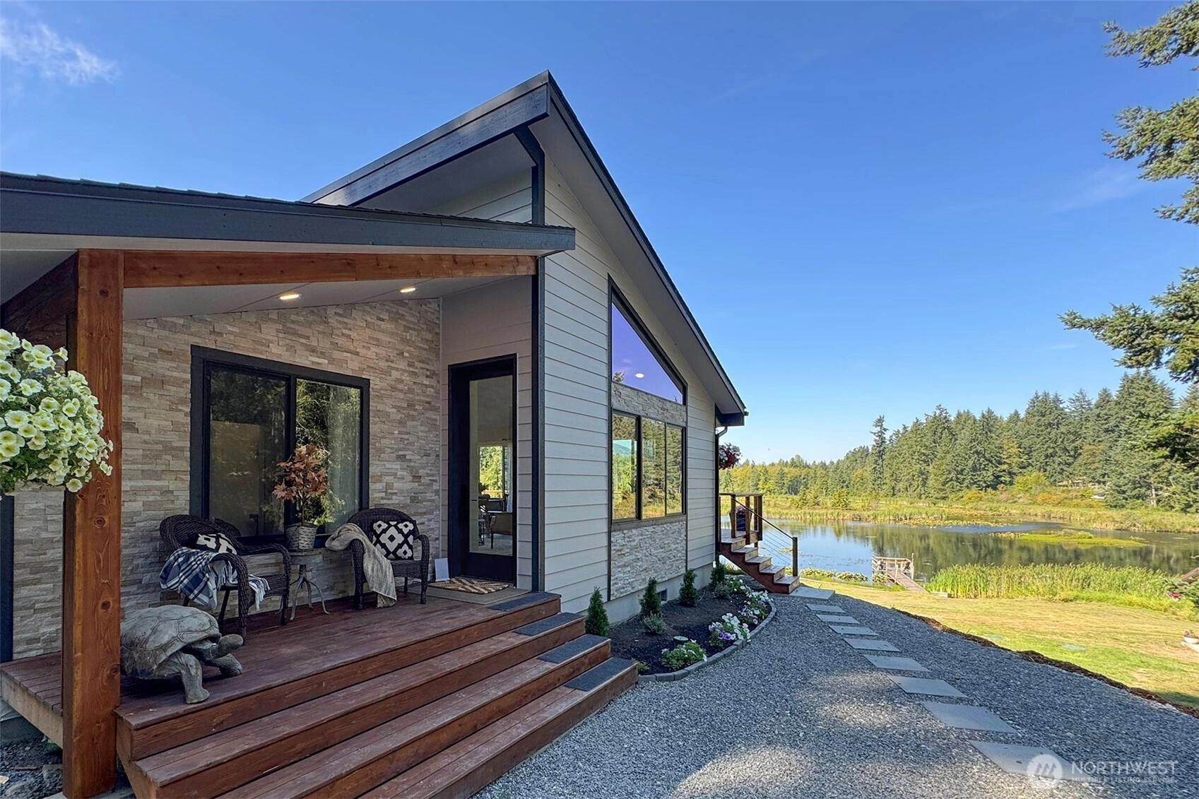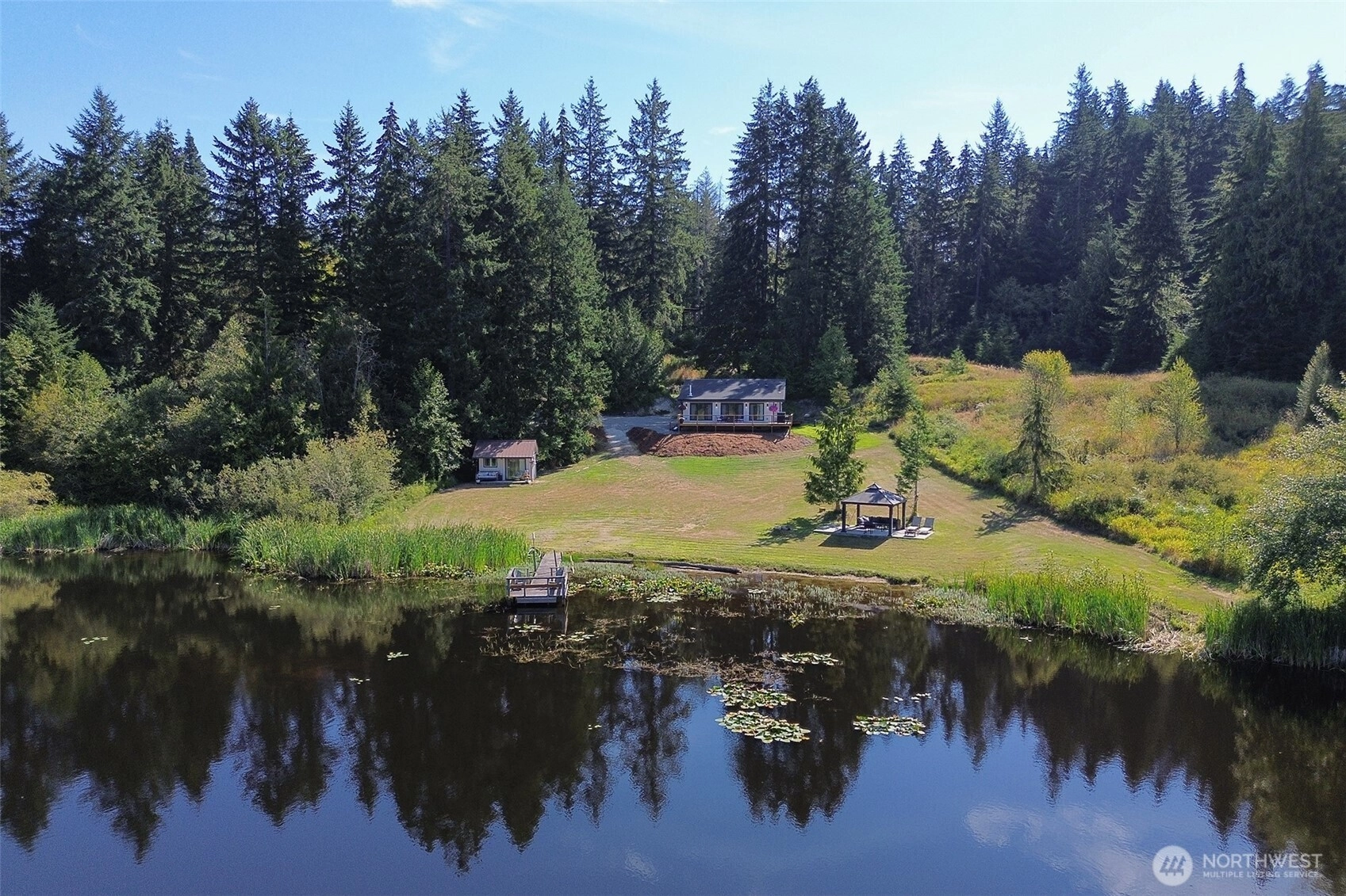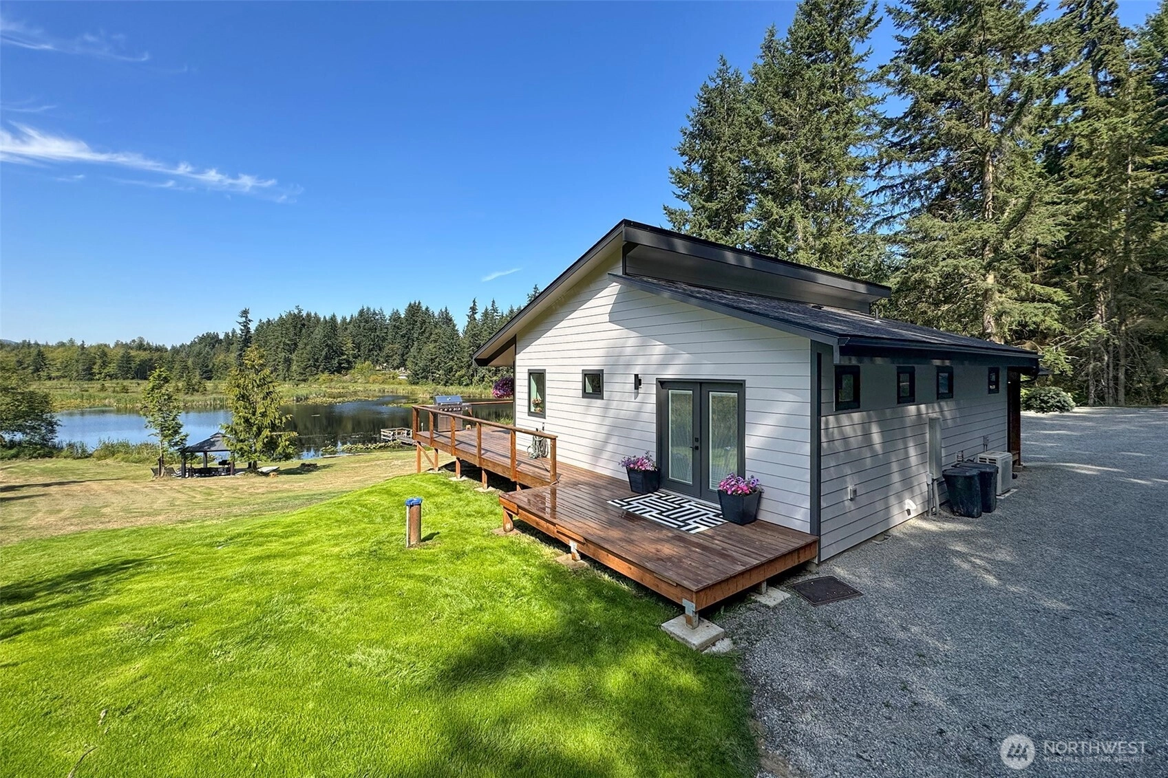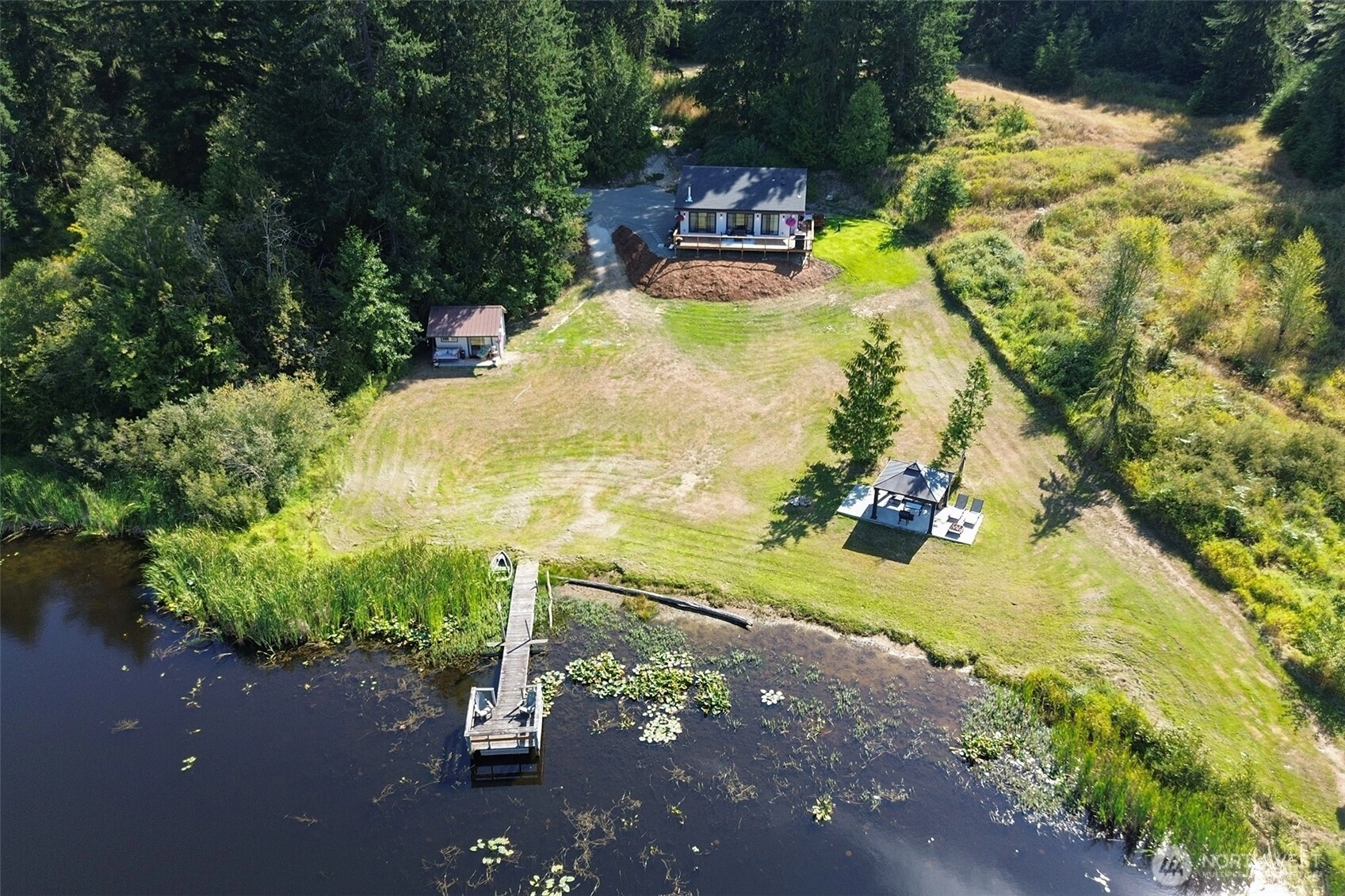 Abode Northwest is a modern, minimalist home inspired by the Pacific Northwest. With nearly 6 acres of premier waterfront on private Lake Sharon, this brand-new 2025 custom build boasts sweeping views of Lake Sharon and the Olympic Mountains, with a private dock and great bass fishing at your back door. Sunlit single-level 2 bed 2 bath living with vaulted ceilings and French doors to a west-facing deck for golden-hour sunsets. Spa-style primary bath with custom tile work and heated floors. Detached ADU with kitchen and bath, detached garage, cabana/gazebo, and outbuildings for gear and hobbies. Quiet dead-end lane—enjoy birdsong, stargazing, and the rhythms of nature. Classic simple Northwest living minutes to town, trails, and salt water