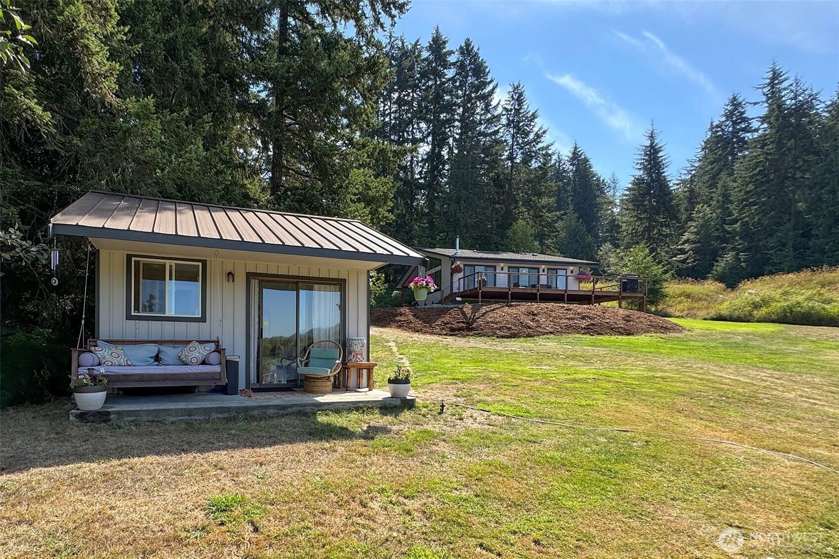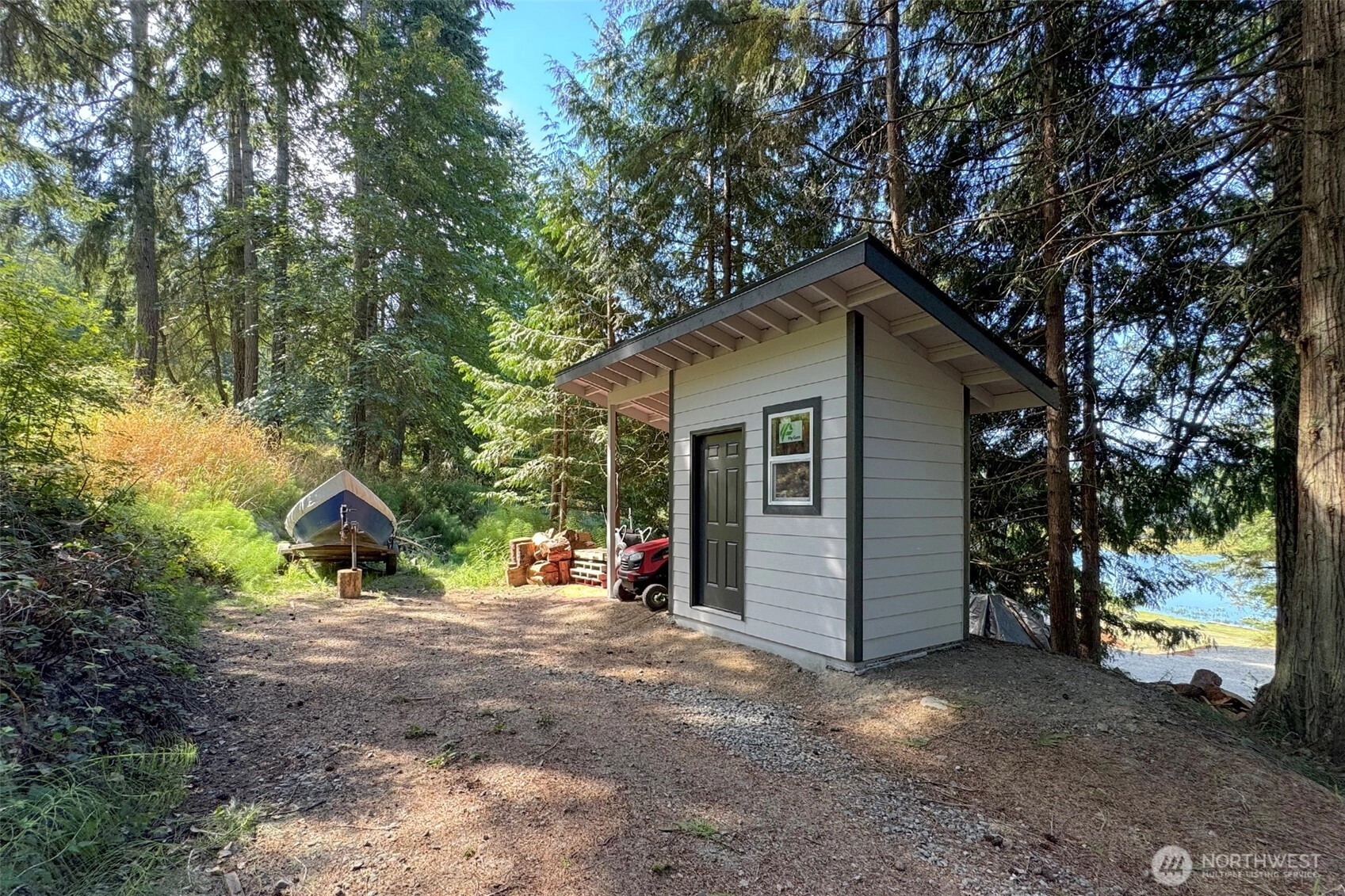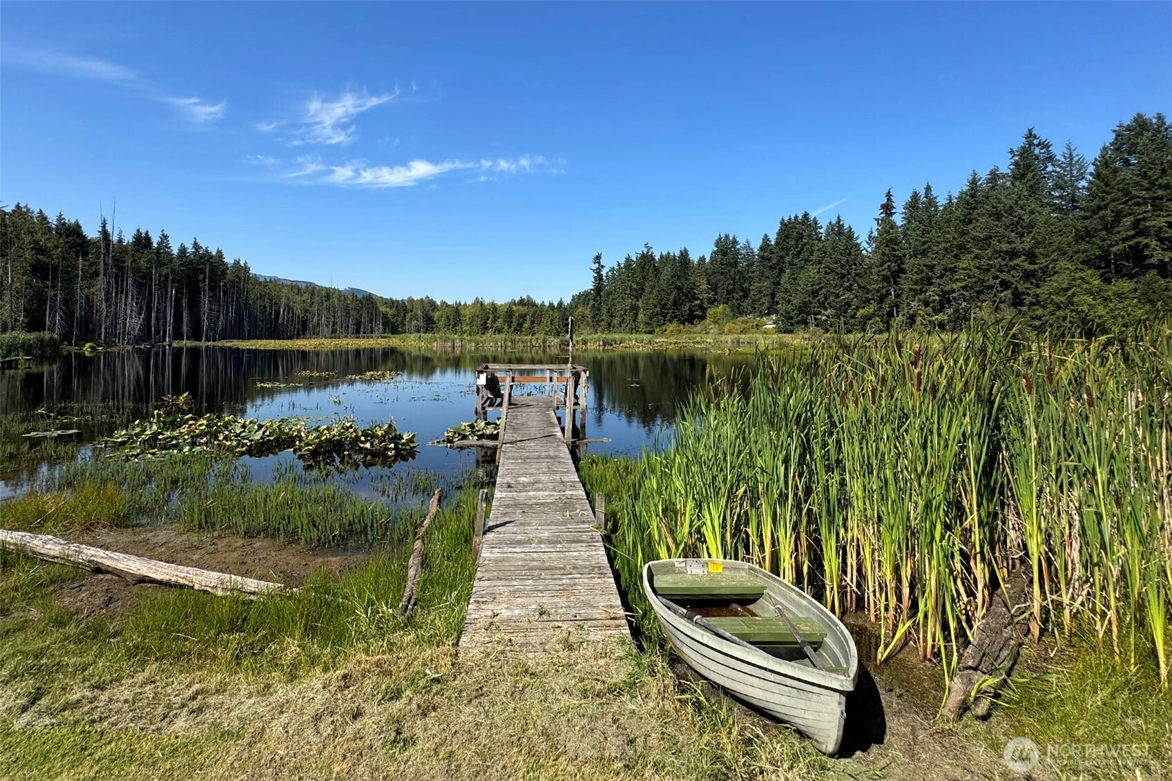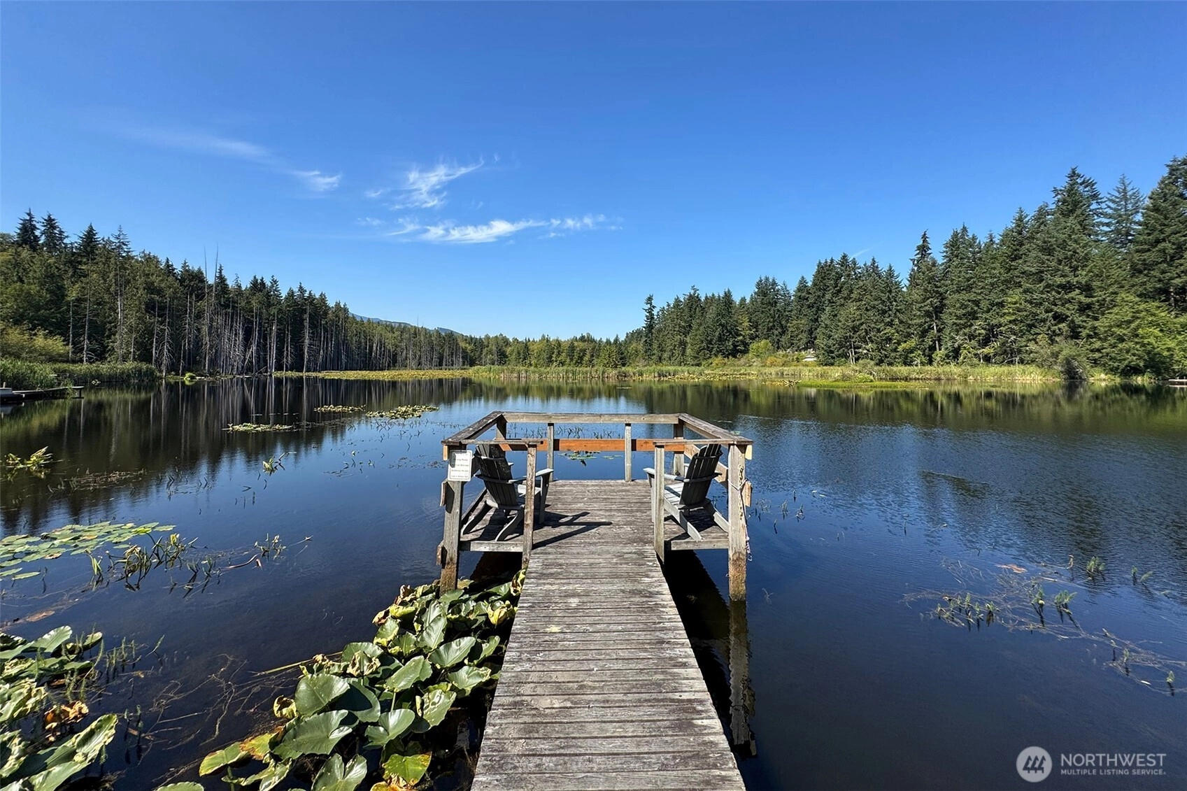 Abode Northwest is a modern, minimalist home inspired by the Pacific Northwest. With nearly 6 acres of premier waterfront on private Lake Sharon, this brand-new 2025 custom build boasts sweeping views of Lake Sharon and the Olympic Mountains, with a private dock and great bass fishing at your back door. Sunlit single-level 2 bed 2 bath living with vaulted ceilings and French doors to a west-facing deck for golden-hour sunsets. Spa-style primary bath with custom tile work and heated floors. Detached ADU with kitchen and bath, detached garage, cabana/gazebo, and outbuildings for gear and hobbies. Quiet dead-end lane—enjoy birdsong, stargazing, and the rhythms of nature. Classic simple Northwest living minutes to town, trails, and salt water