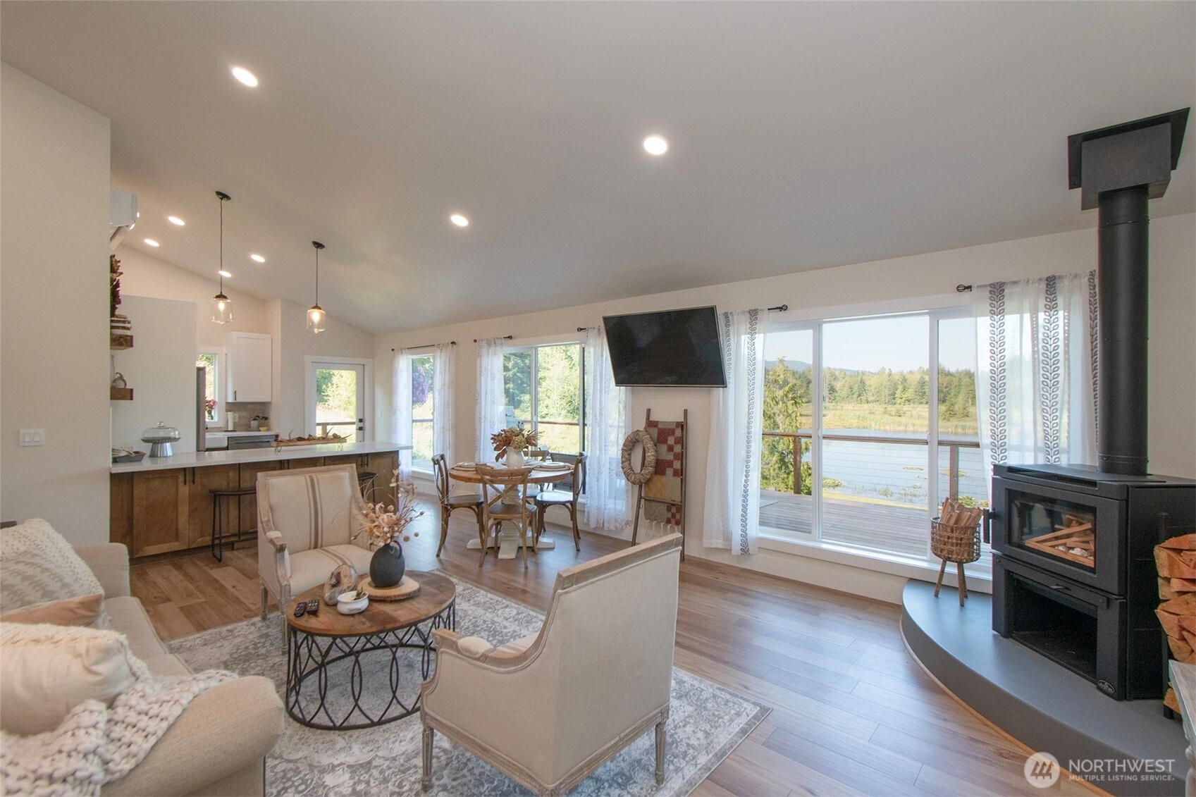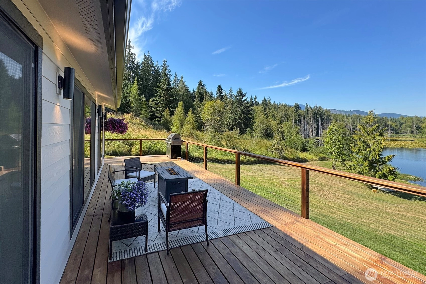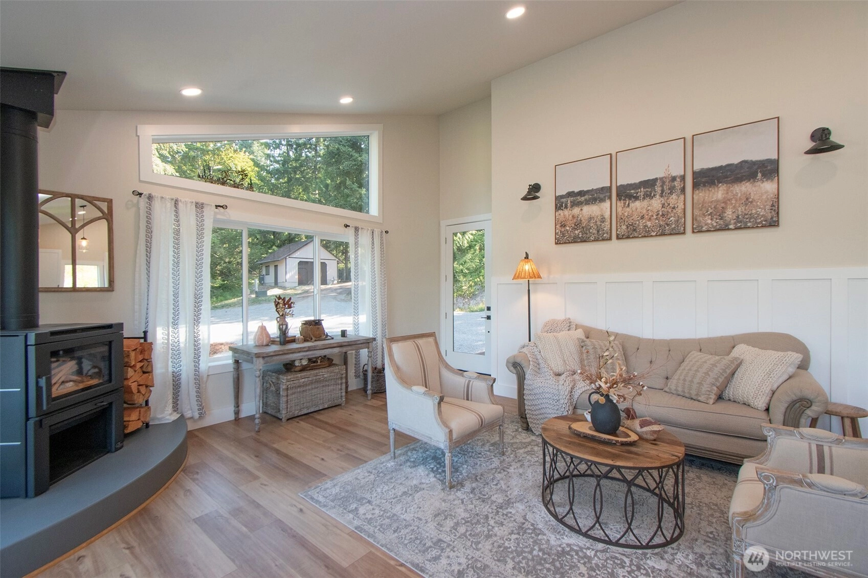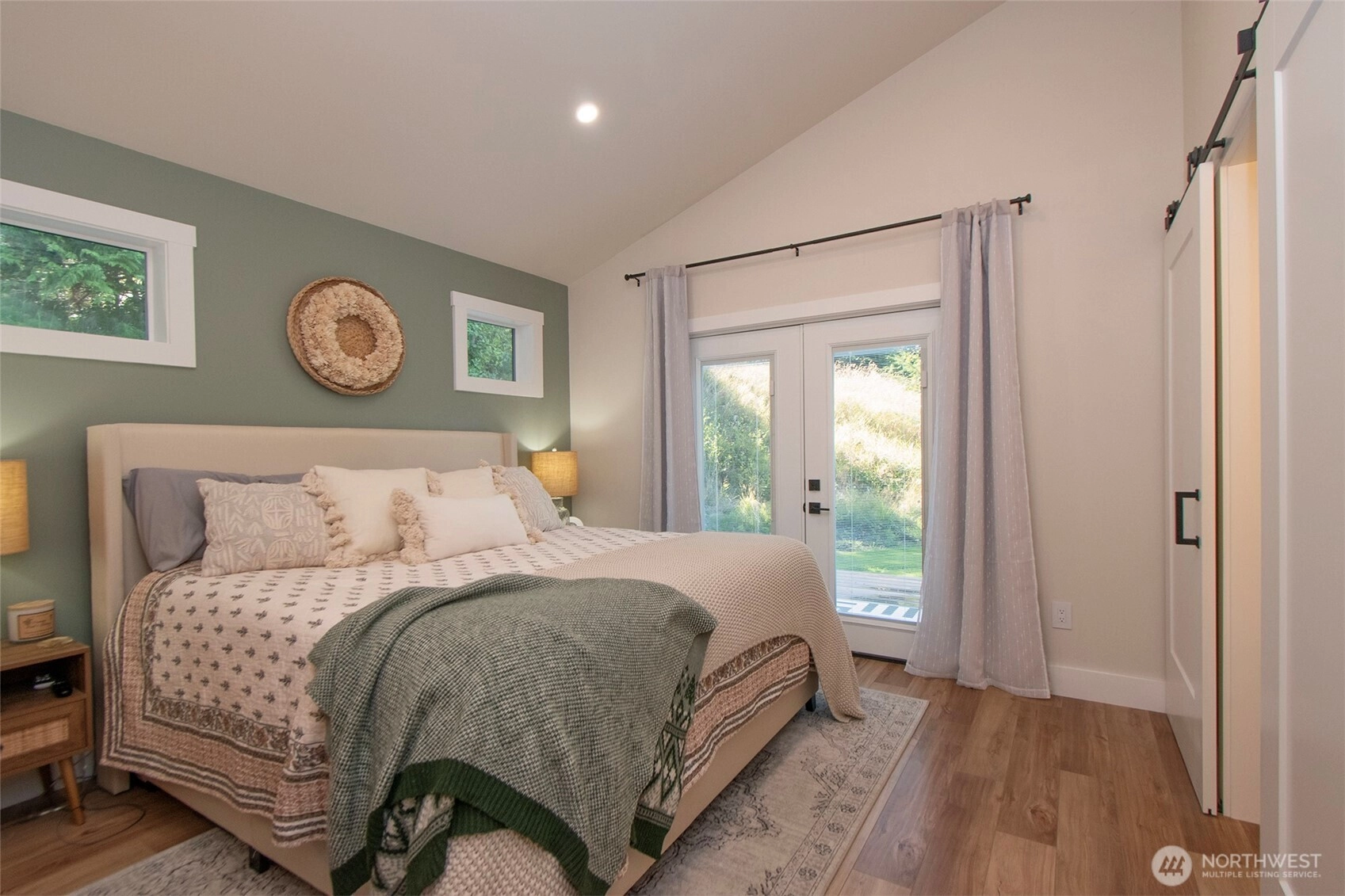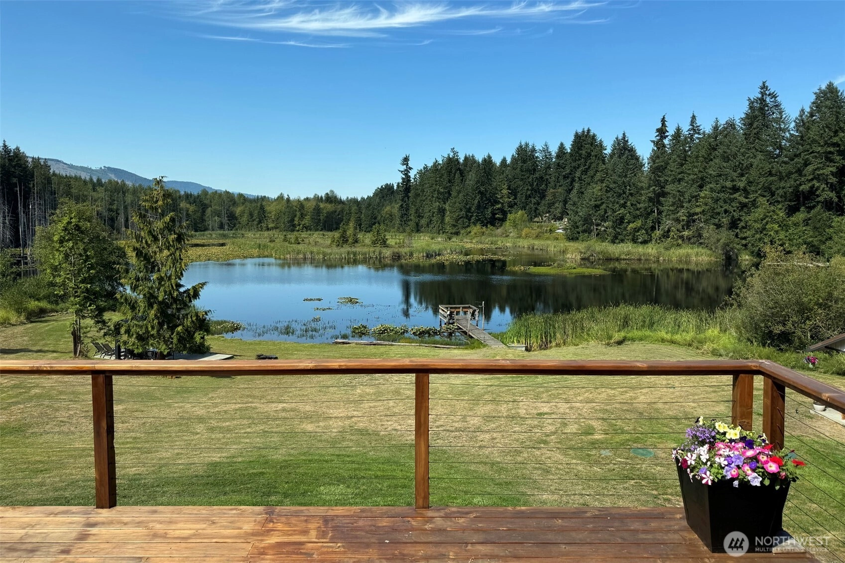 Abode Northwest is a modern, minimalist home inspired by the Pacific Northwest. With nearly 6 acres of premier waterfront on private Lake Sharon, this brand-new 2025 custom build boasts sweeping views of Lake Sharon and the Olympic Mountains, with a private dock and great bass fishing at your back door. Sunlit single-level 2 bed 2 bath living with vaulted ceilings and French doors to a west-facing deck for golden-hour sunsets. Spa-style primary bath with custom tile work and heated floors. Detached ADU with kitchen and bath, detached garage, cabana/gazebo, and outbuildings for gear and hobbies. Quiet dead-end lane—enjoy birdsong, stargazing, and the rhythms of nature. Classic simple Northwest living minutes to town, trails, and salt water