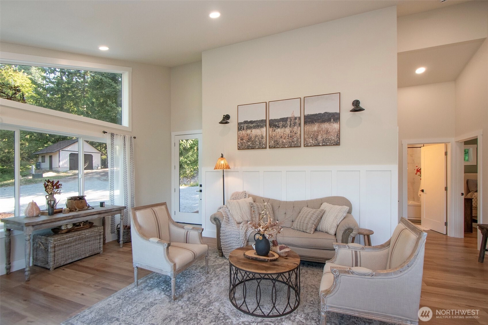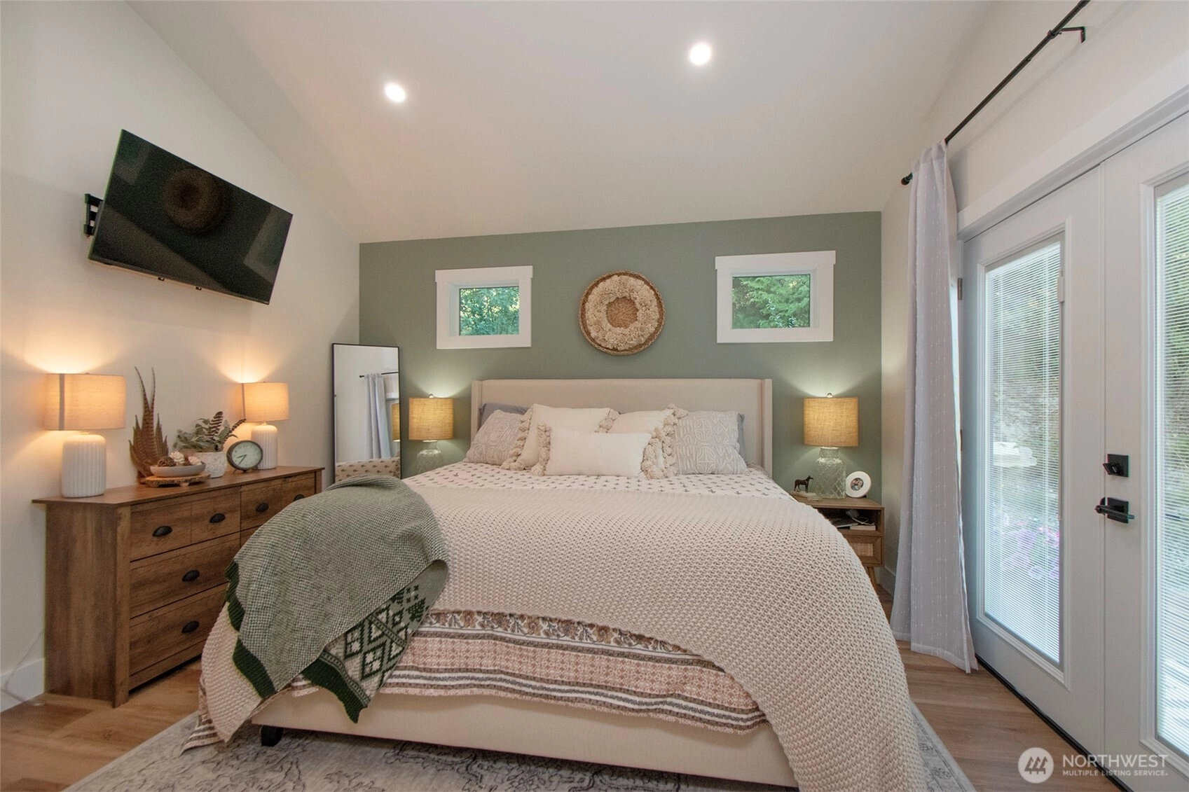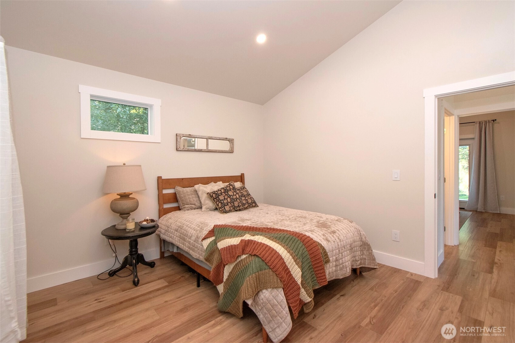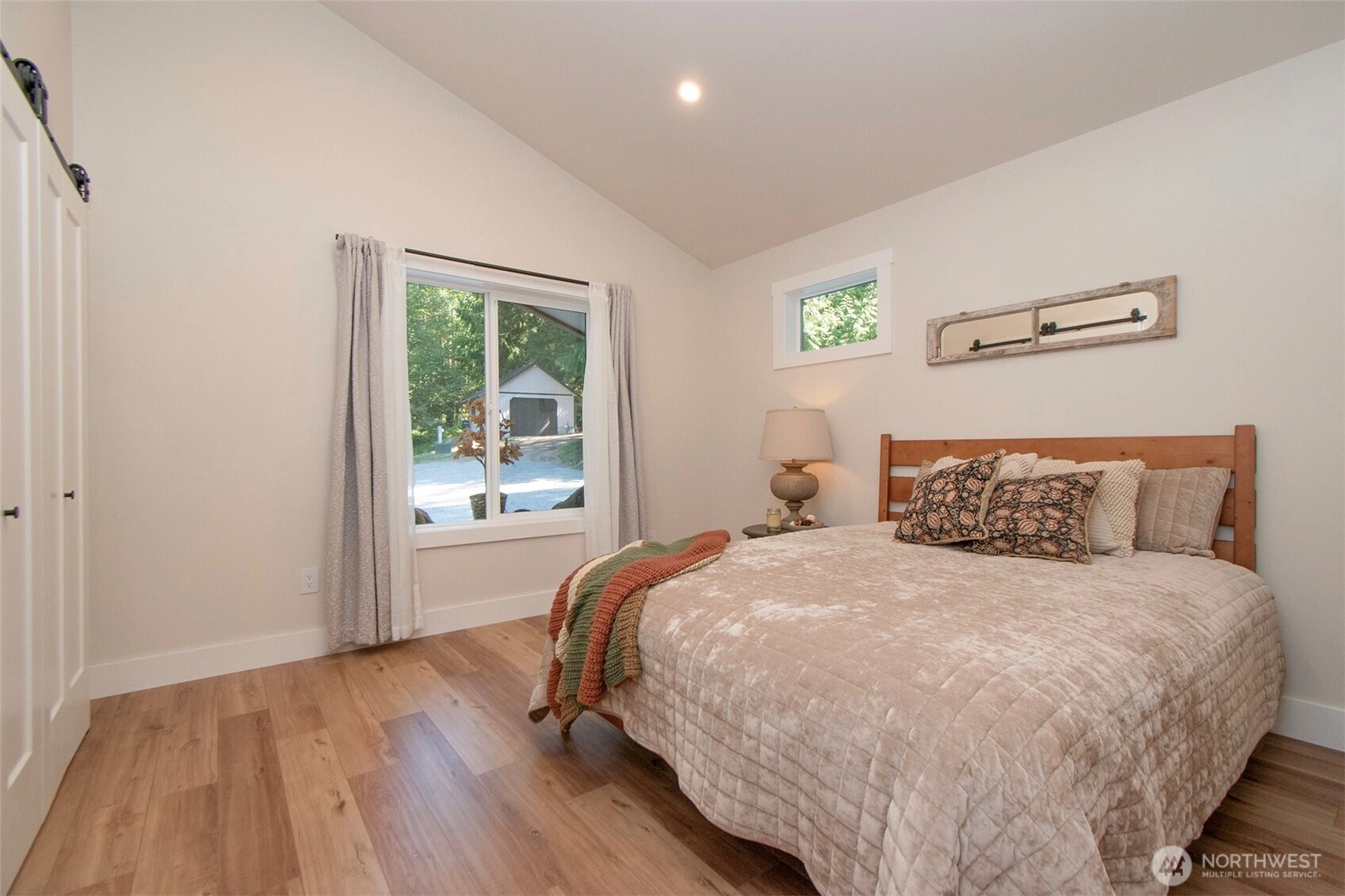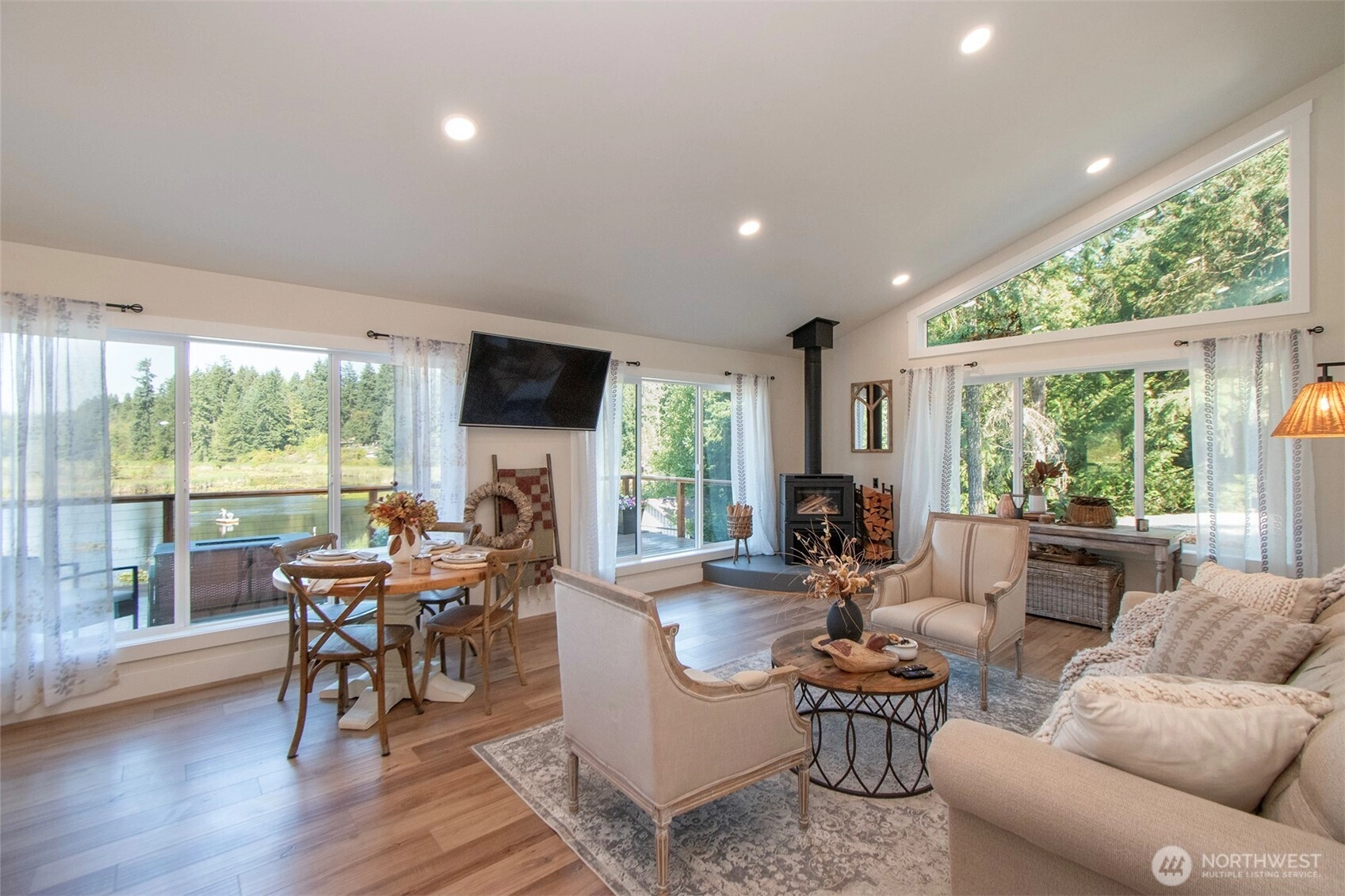Abode Northwest is a modern, minimalist home inspired by the Pacific Northwest. With nearly 6 acres of premier waterfront on private Lake Sharon, this brand-new 2025 custom build boasts sweeping views of Lake Sharon and the Olympic Mountains, with a private dock and great bass fishing at your back door. Sunlit single-level 2 bed 2 bath living with vaulted ceilings and French doors to a west-facing deck for golden-hour sunsets. Spa-style primary bath with custom tile work and heated floors. Detached ADU with kitchen and bath, detached garage, cabana/gazebo, and outbuildings for gear and hobbies. Quiet dead-end lane—enjoy birdsong, stargazing, and the rhythms of nature. Classic simple Northwest living minutes to town, trails, and salt water