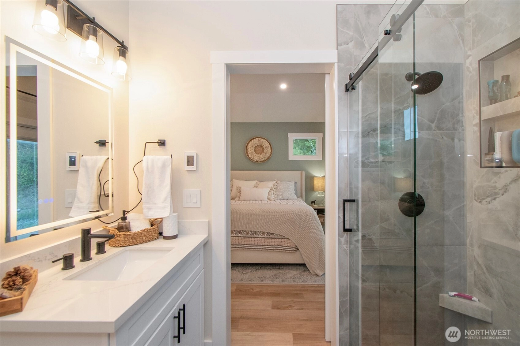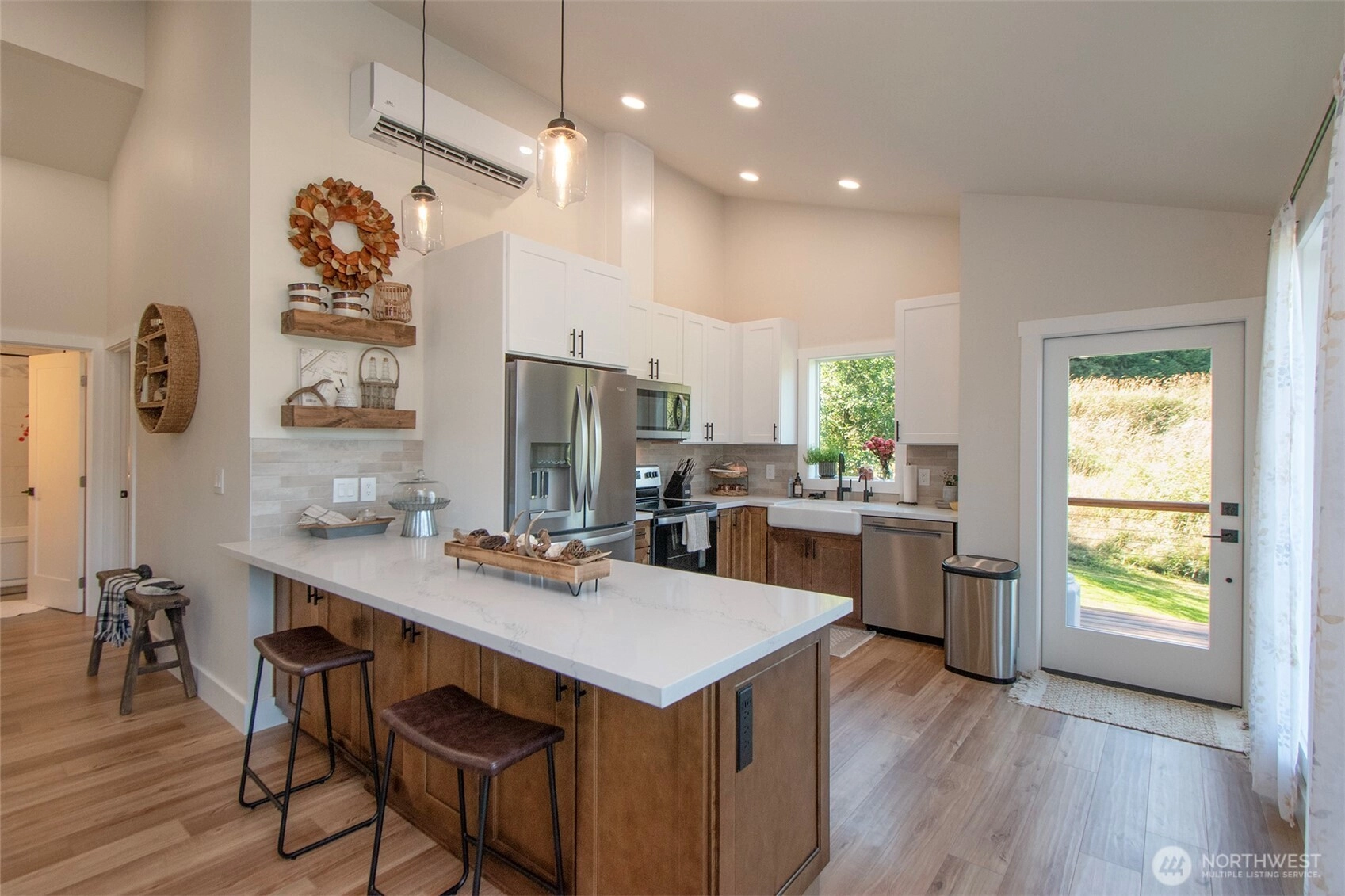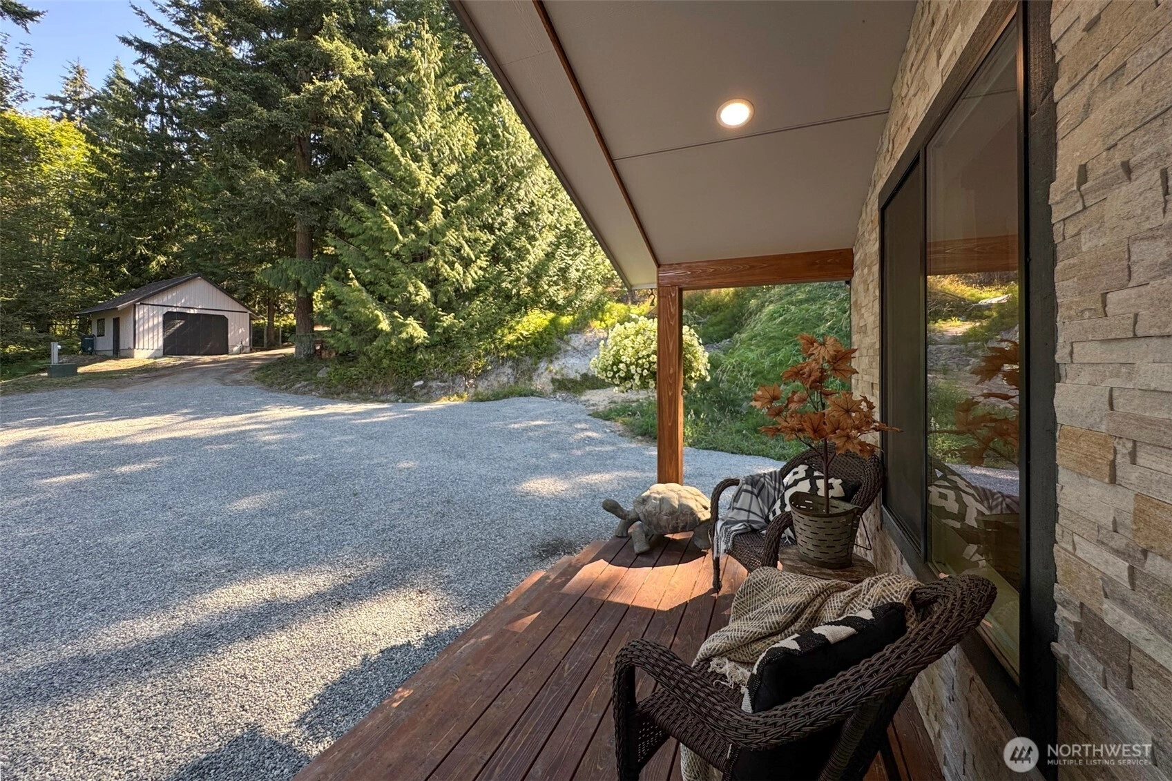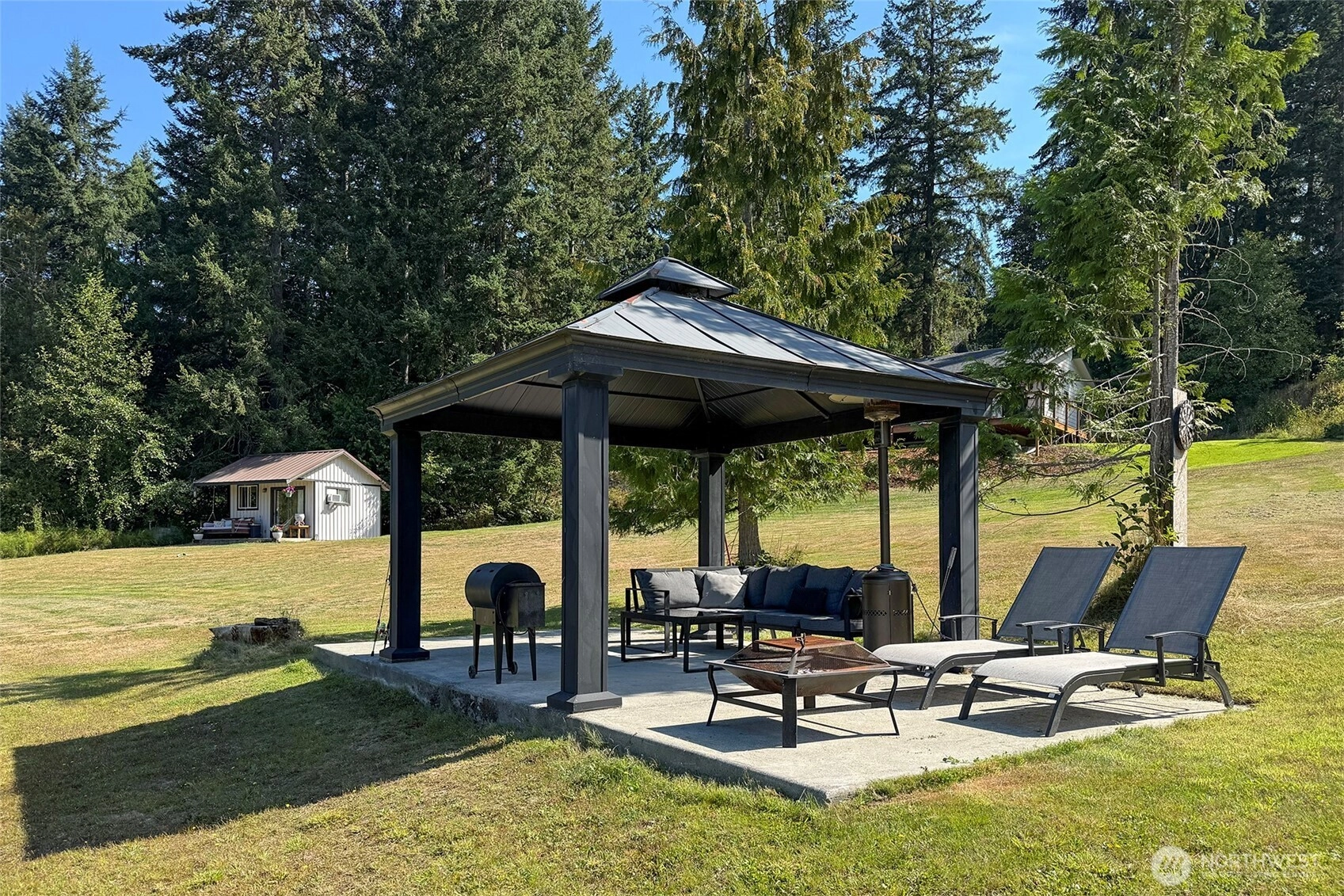 Abode Northwest is a modern, minimalist home inspired by the Pacific Northwest. With nearly 6 acres of premier waterfront on private Lake Sharon, this brand-new 2025 custom build boasts sweeping views of Lake Sharon and the Olympic Mountains, with a private dock and great bass fishing at your back door. Sunlit single-level 2 bed 2 bath living with vaulted ceilings and French doors to a west-facing deck for golden-hour sunsets. Spa-style primary bath with custom tile work and heated floors. Detached ADU with kitchen and bath, detached garage, cabana/gazebo, and outbuildings for gear and hobbies. Quiet dead-end lane—enjoy birdsong, stargazing, and the rhythms of nature. Classic simple Northwest living minutes to town, trails, and salt water