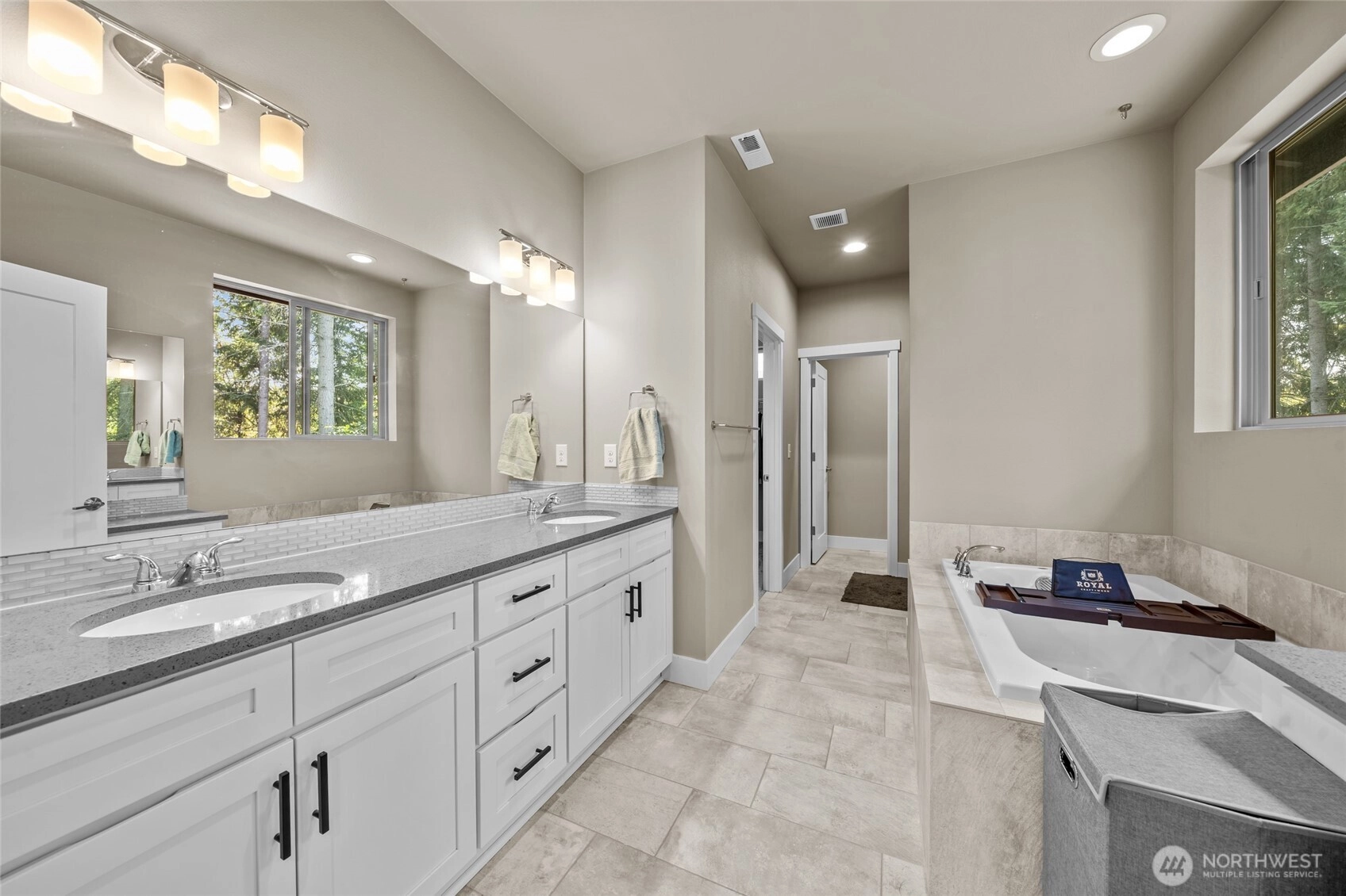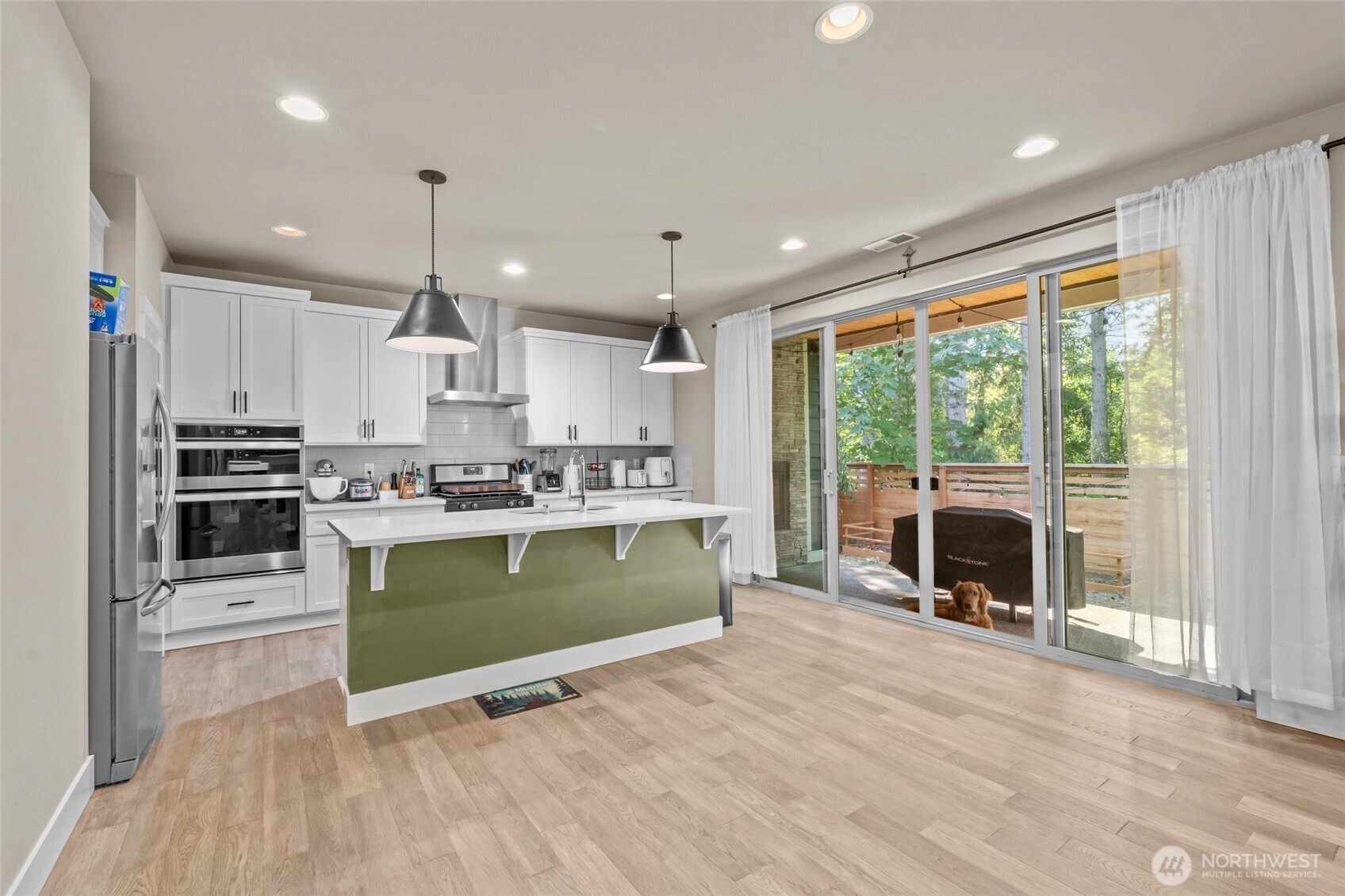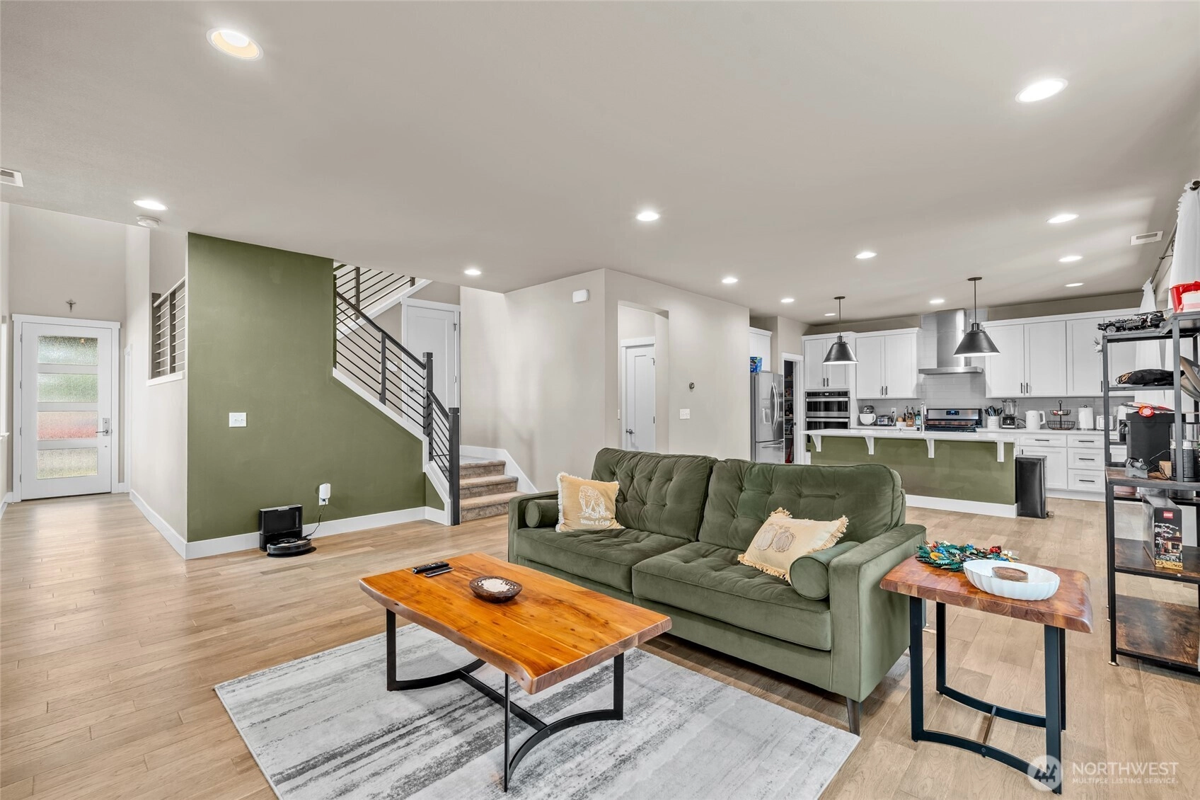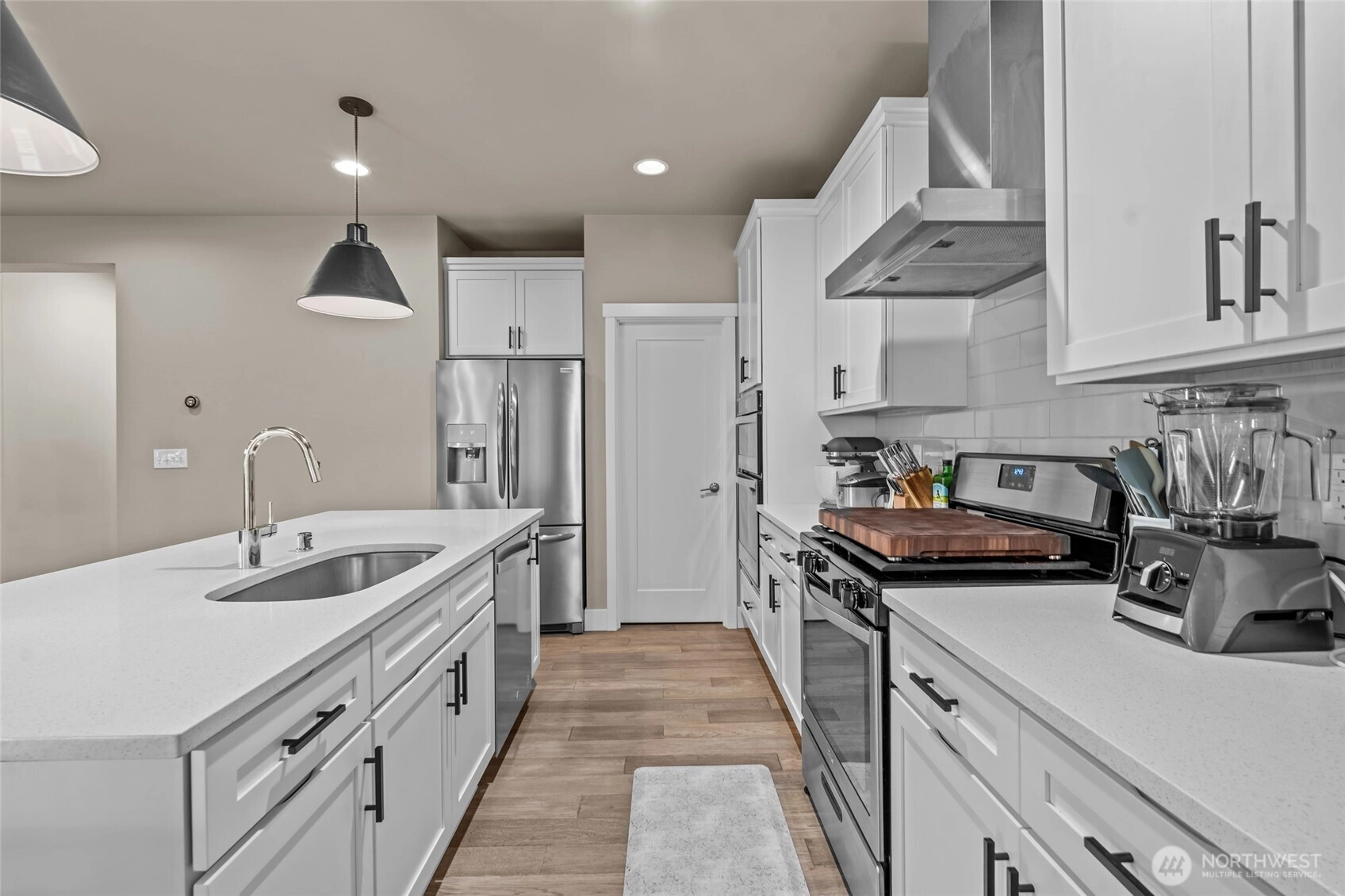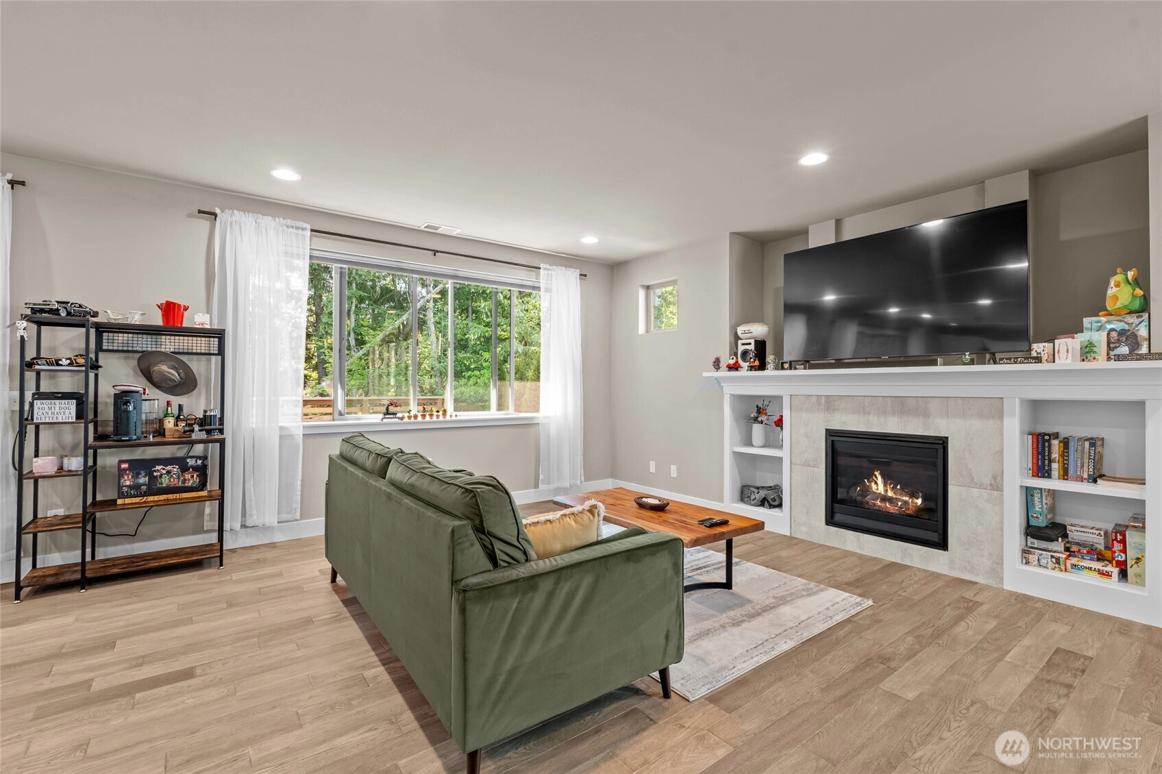 Welcome to this stunning Tehaleh retreat, where comfort and serenity greet you the moment you enter. This spacious 4-bedroom, 3+ bath home features a junior suite on the main level and a luxurious upstairs primary with two additional bedrooms, an oversized loft, and utility room. The open-concept main floor boasts 9’ ceilings, a gas fireplace with built-ins, and tree-lined views. The chef’s kitchen shines with tall soft-close cabinets, quartz counters, walk-in pantry, double oven, and gas range. Engineered hardwood flows throughout. The primary suite offers dual walk-ins, quartz vanities, soaker tub, and custom shower. Outside, enjoy a covered patio with fireplace, perfect for year-round relaxation. Central A/C completes this tranquil home.