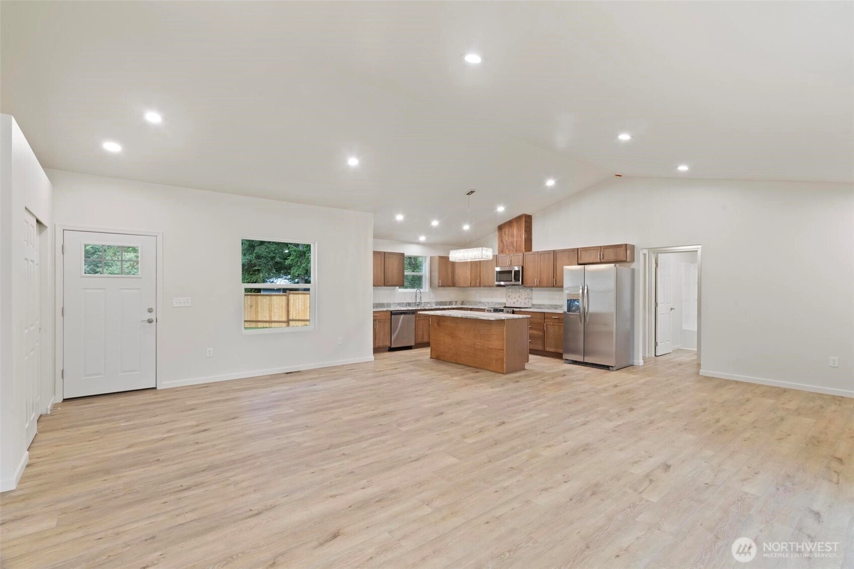 Custom Built, New 3Bd 2Bth, single-level home on half acre. Open concept w/vaulted ceilings & waterproof LVP flooring throughout. Kitchen w/new modern color cabinetry, island, granite counters & backsplash. Stainless appliances including dishwasher, stove, fridge & microwave. Stainless undermount sink w/disposal. Primary suite on opposite side of home from other bedrooms w/attached bath, double sinks, custom tiled 60in walk-in shower & walk-in closet. Energy efficiency features w/heat recovery ventilation, extra attic insulation, window u-factor .24, hybrid water heater, high efficiency forced air heat & ac. Wired for Fiber Internet. Large concrete driveway w/side trailer parking. No HOA. Home is move-in-ready.