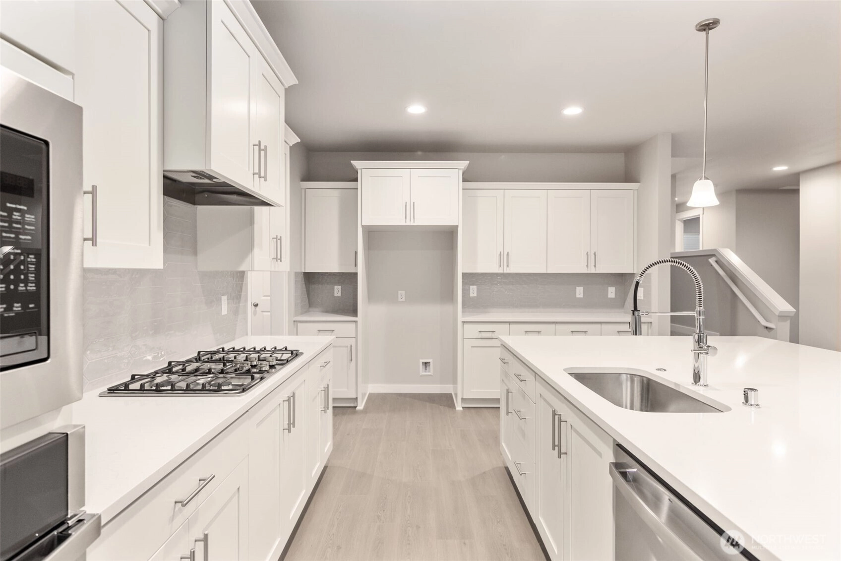 Discover your dream home in Tehaleh! This gorgeous green belt property offers park views from the covered front porch—perfect for relaxing or entertaining. The 2822 plan features a main-level guest suite with bath, an open layout with a spacious great room and gourmet kitchen with an oversized island, built-in oven, microwave, and gas cooktop. A versatile barn-door flex space can be an office or prep area, along with a large pantry and mudroom. Upstairs, enjoy a primary suite with views, three additional bedrooms, a utility room, and shared bath with double sinks. Plus, a rear extended covered patio creates year-round outdoor living. Bonney Lake Schools, Move-in ready! Special financing rates available!