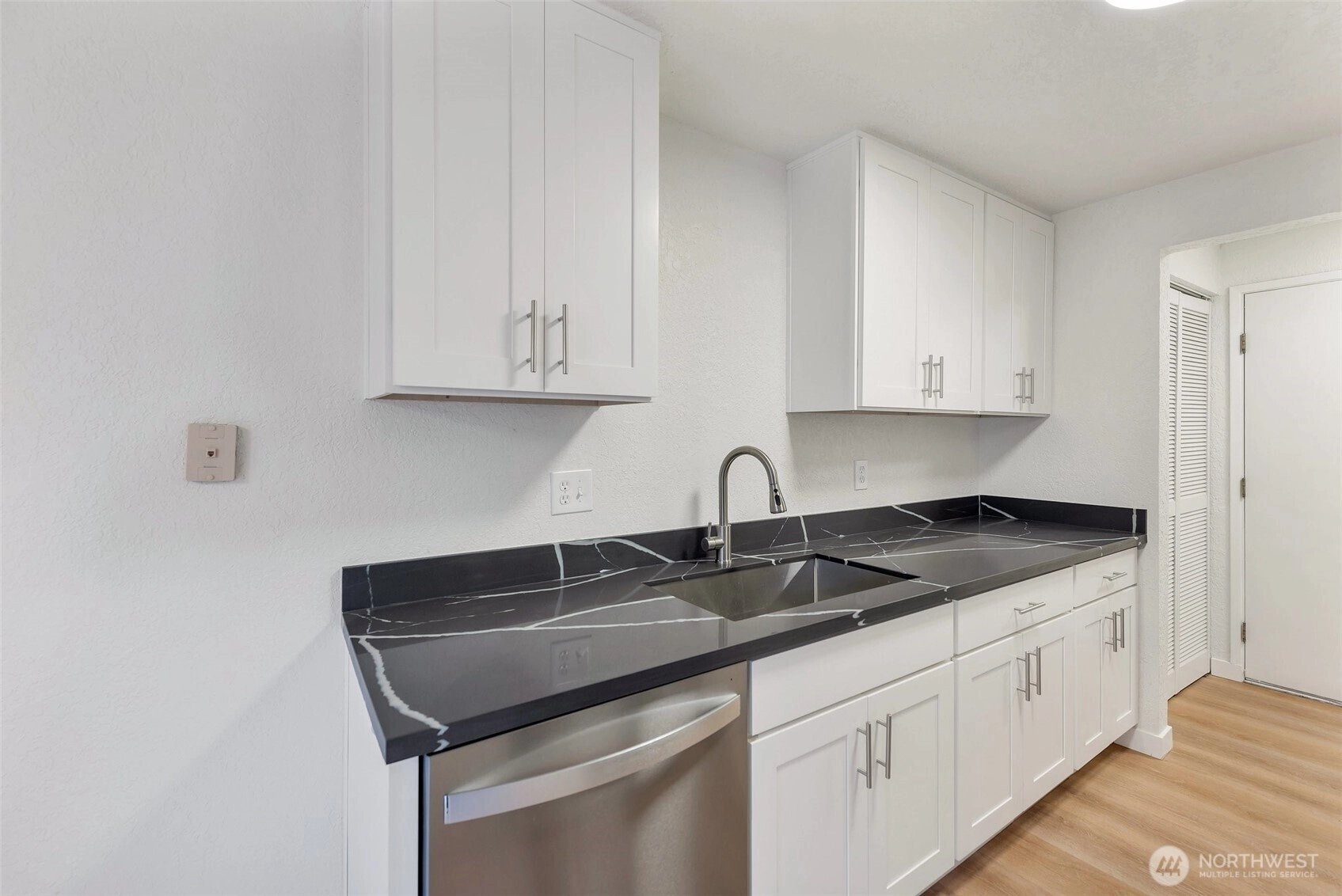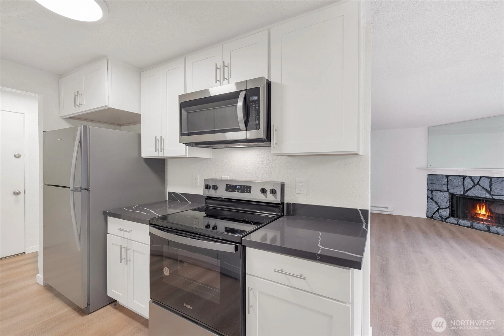 Step into this beautifully updated condominium, where modern comfort meets thoughtful design. The newly remodeled kitchen features sleek quartz countertops, soft close shaker cabinets and brand-new stainless steel appliances. The spacious primary bedroom offers direct access to the newly renovated bathroom and boasts a large closet. Relax in the light-filled living room with a cozy fireplace and brand-new flooring throughout.Enjoy outdoor living with your own patio, complete with additional storage space. Located in a prime area, you're just steps away from restaurants, shops, schools, parks, and more! This charming small complex also offers plenty of parking for your convenience.