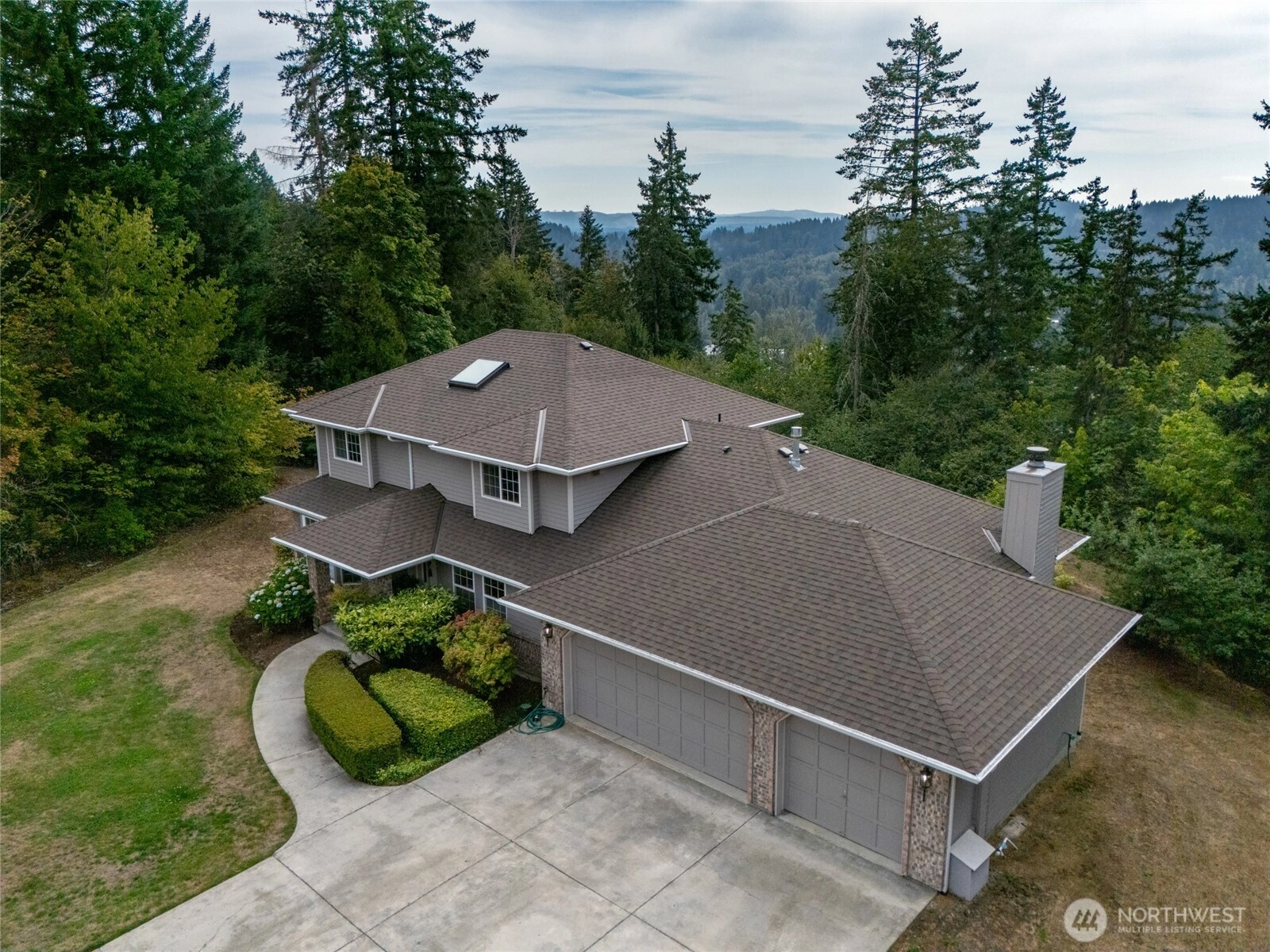 Custom 2-story w/fully finished basement on 18.56 acres. Potential to subdivide. Territorial view of mt & valley. Landscaped lawn, garden beds, large driveway w/room for RV parking & attached 3-car garage. Big deck off the kitchen to watch sunsets or the grazing deer nearby. Main floor includes living room, formal & informal dining, kitchen island cooktop, family room A/C, 1/2 bath, laundry room, den. Vaulted ceiling entry, hardwoods, & skylight lead upstairs to 3 bdrms, 2 baths including the primary suite w/jetted tub & walk-in closet. Downstairs has 2 extra finished rooms, 1 bath, rec room w/kitchenette & huge storage room. Propane gas FA, septic, public water in this comfortable country home, private, yet close to all amenities.
