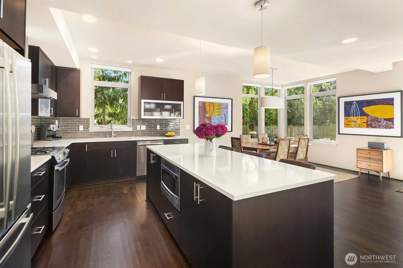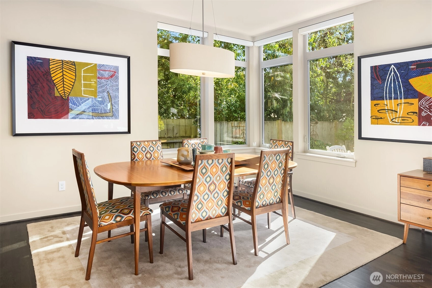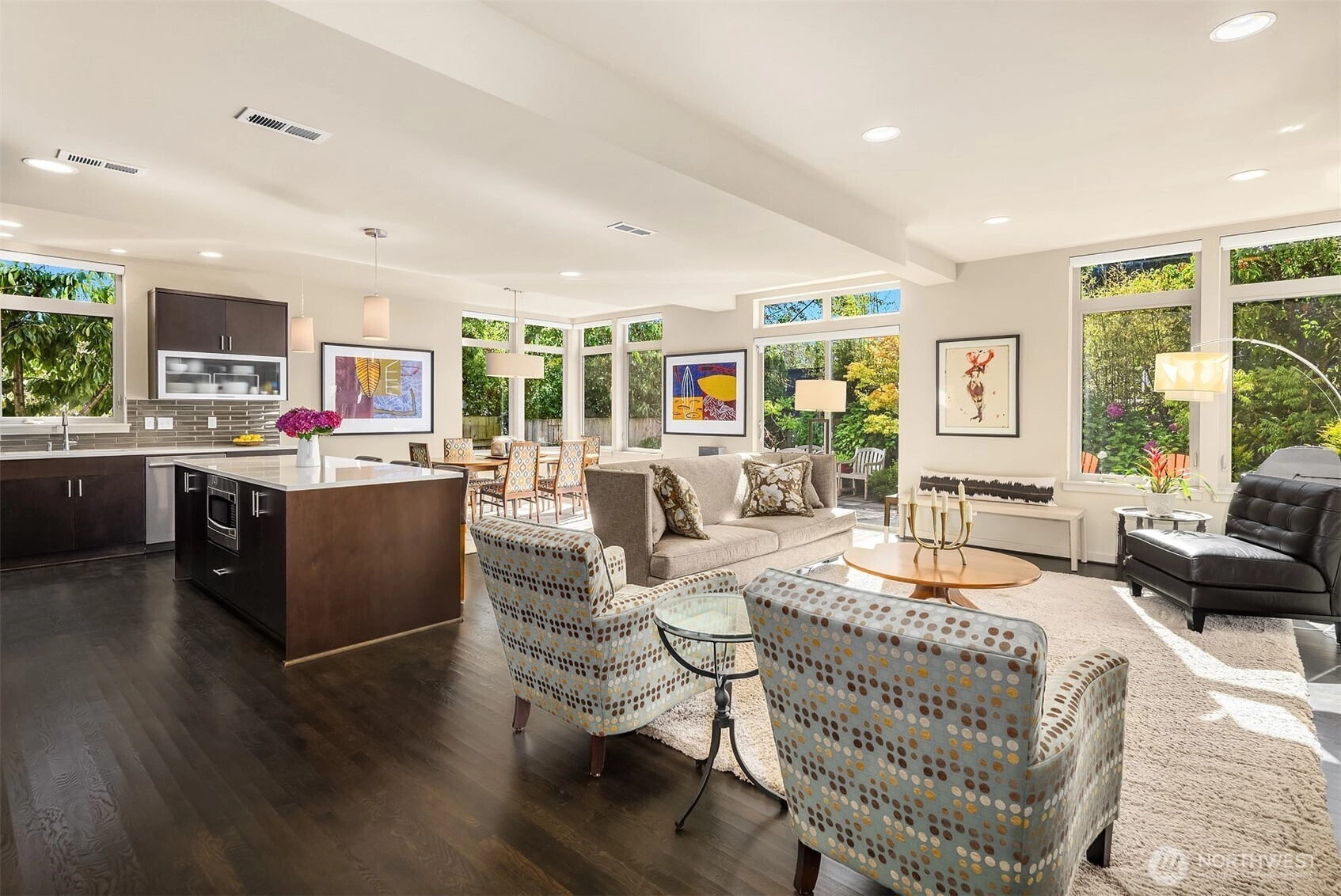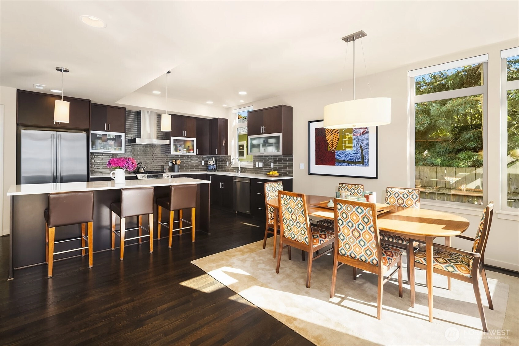 Exceptional modern home in coveted Phinney Ridge with striking design & effortless flow. Dramatic open spaces, ebony oak floors & walls of glass, invite light in. The gourmet kitchen is designed for easy living & entertaining w/ quartz counters, stainless appliances, walk-in pantry & an oversized island. Step outside to the lush west-facing garden with room to lounge and dine—perfect for summer evenings! Retreat upstairs to 3 spacious bedrooms, including a luxe primary suite + laundry. Modern comforts include A/C, a 2-car attached garage, abundant storage, and the rare perk of all living space above grade. Unbeatable walkability just steps to vibrant Phinney/Greenwood shops, restaurants & parks. This home defines sophisticated urban living!