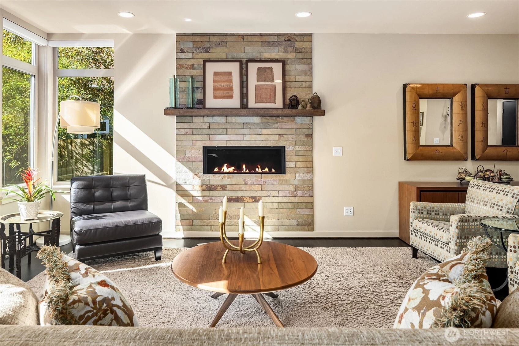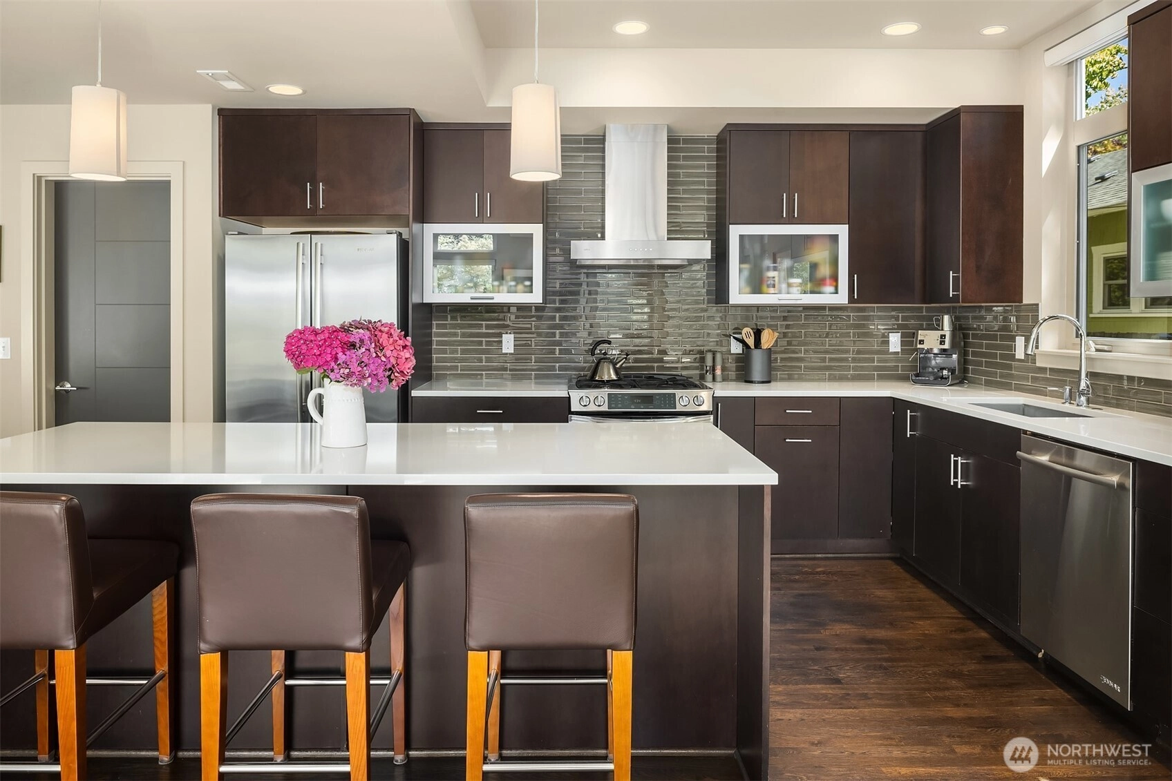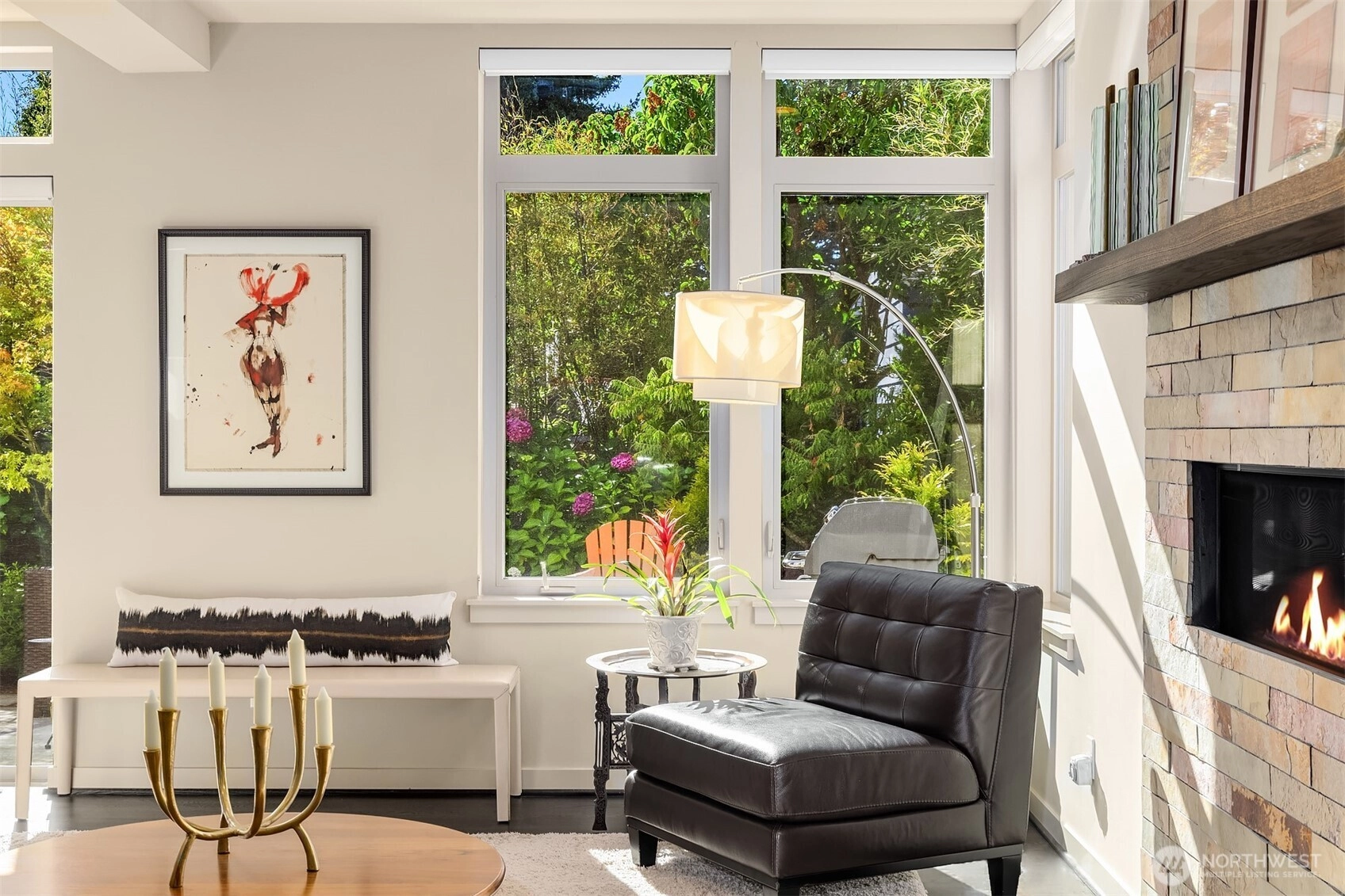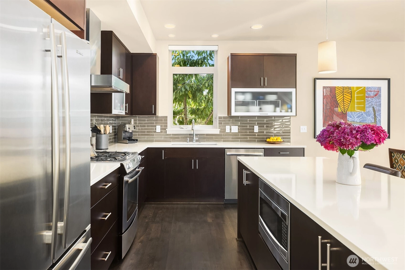 Exceptional modern home in coveted Phinney Ridge with striking design & effortless flow. Dramatic open spaces, ebony oak floors & walls of glass, invite light in. The gourmet kitchen is designed for easy living & entertaining w/ quartz counters, stainless appliances, walk-in pantry & an oversized island. Step outside to the lush west-facing garden with room to lounge and dine—perfect for summer evenings! Retreat upstairs to 3 spacious bedrooms, including a luxe primary suite + laundry. Modern comforts include A/C, a 2-car attached garage, abundant storage, and the rare perk of all living space above grade. Unbeatable walkability just steps to vibrant Phinney/Greenwood shops, restaurants & parks. This home defines sophisticated urban living!