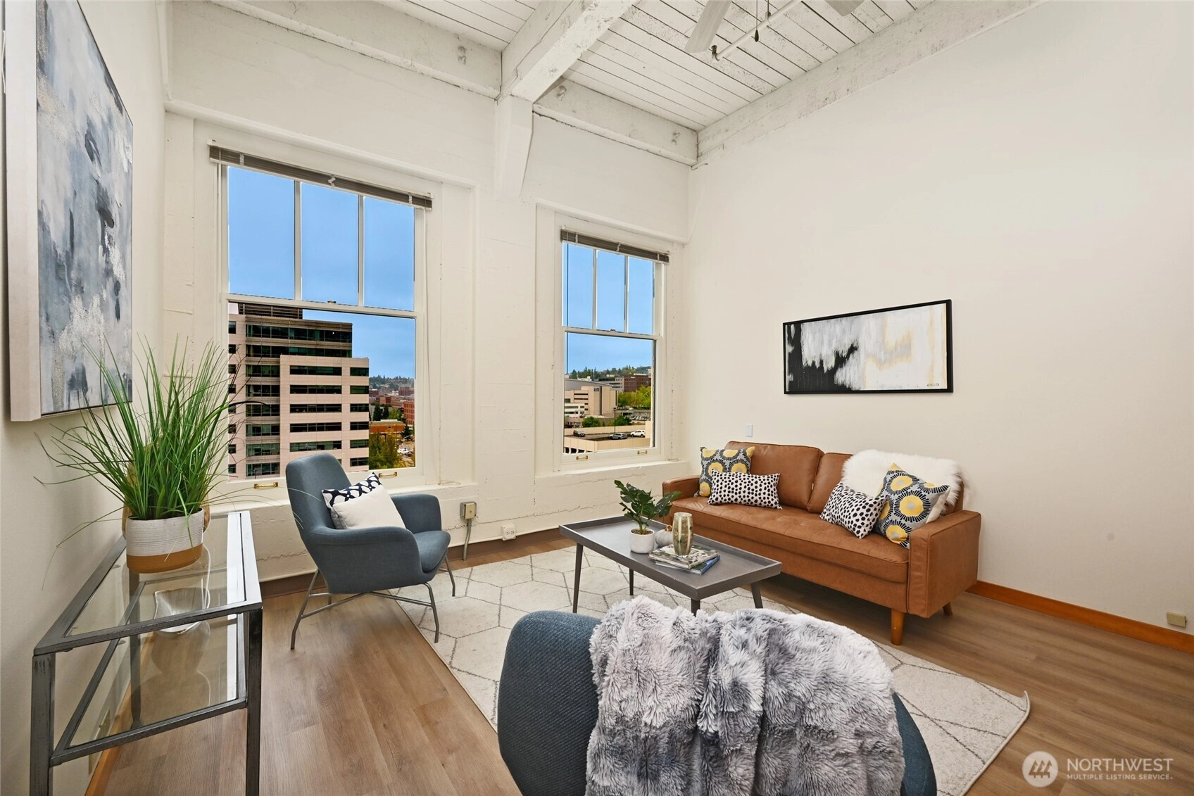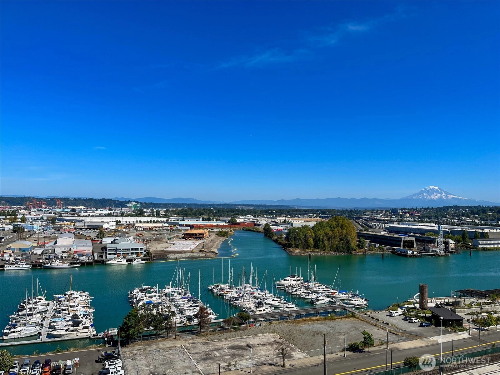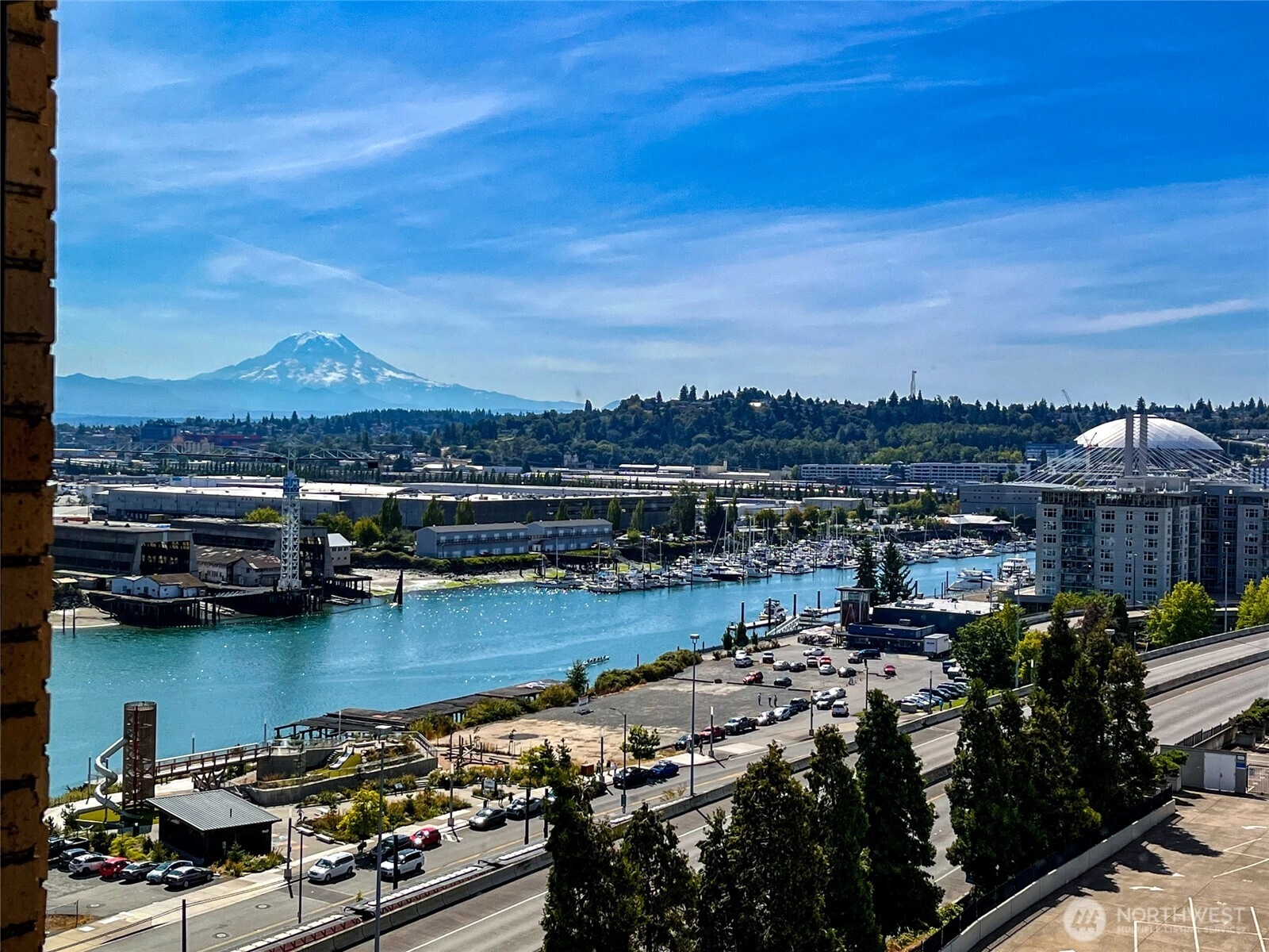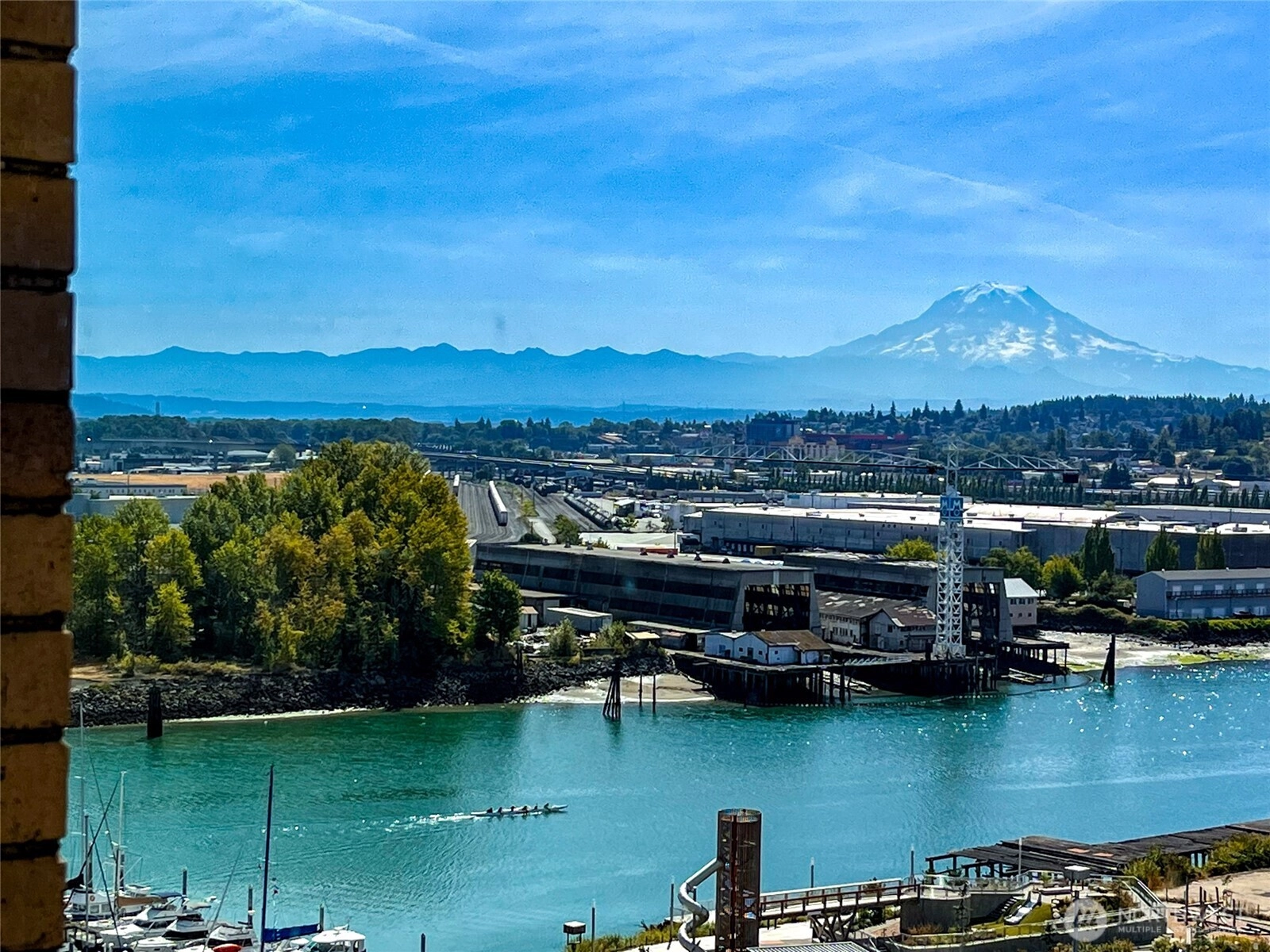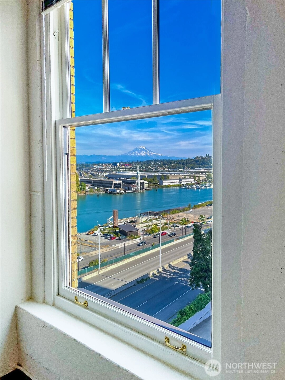 Beautiful historic Cliff Street Lofts top floor penthouse with spectacular unobstructed view of Mt Rainier, Thea Foss waterway and city! Spacious open room concept with NEW 8 foot insulated windows and 12 foot ceiling. NEW luxury plank floors, freshly painted, bright living/dining area with ceiling fan, contemporary kitchen, washer/dryer combo and closet. Large bedroom, 12 foot ceiling and fan. Garage parking space and storage locker. Cliff Street Loft amenities include a free laundry room, rooftop deck with outstanding views, barbeque, garden and more. Close to shops, restaurants, entertainment, UW campus and street car. Easy access to I-5, museums, waterfront activities, Point Ruston, and Point Defiance Park. Ready move in condition!
