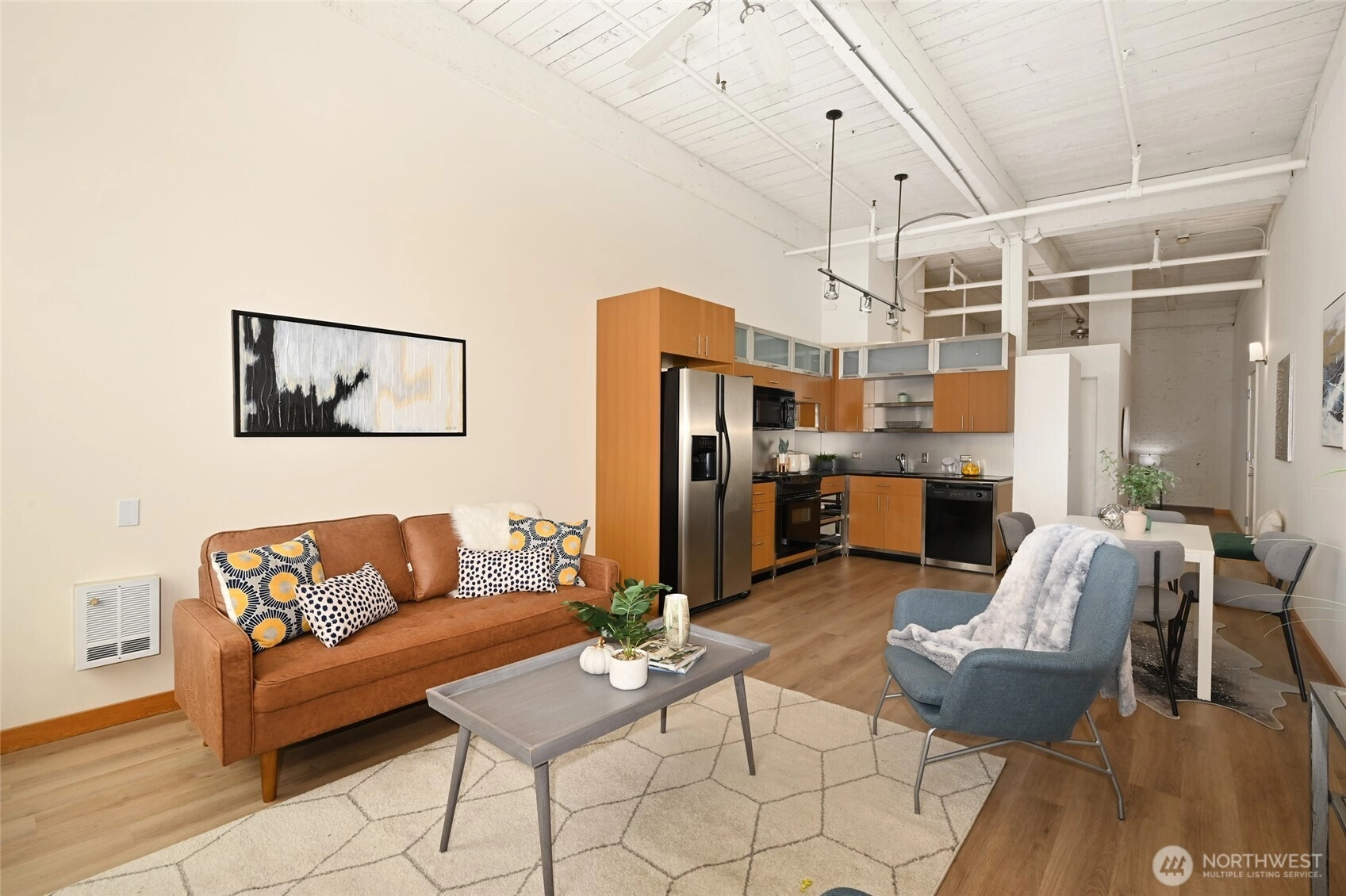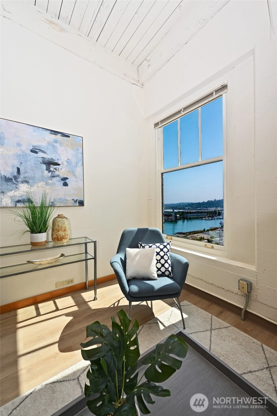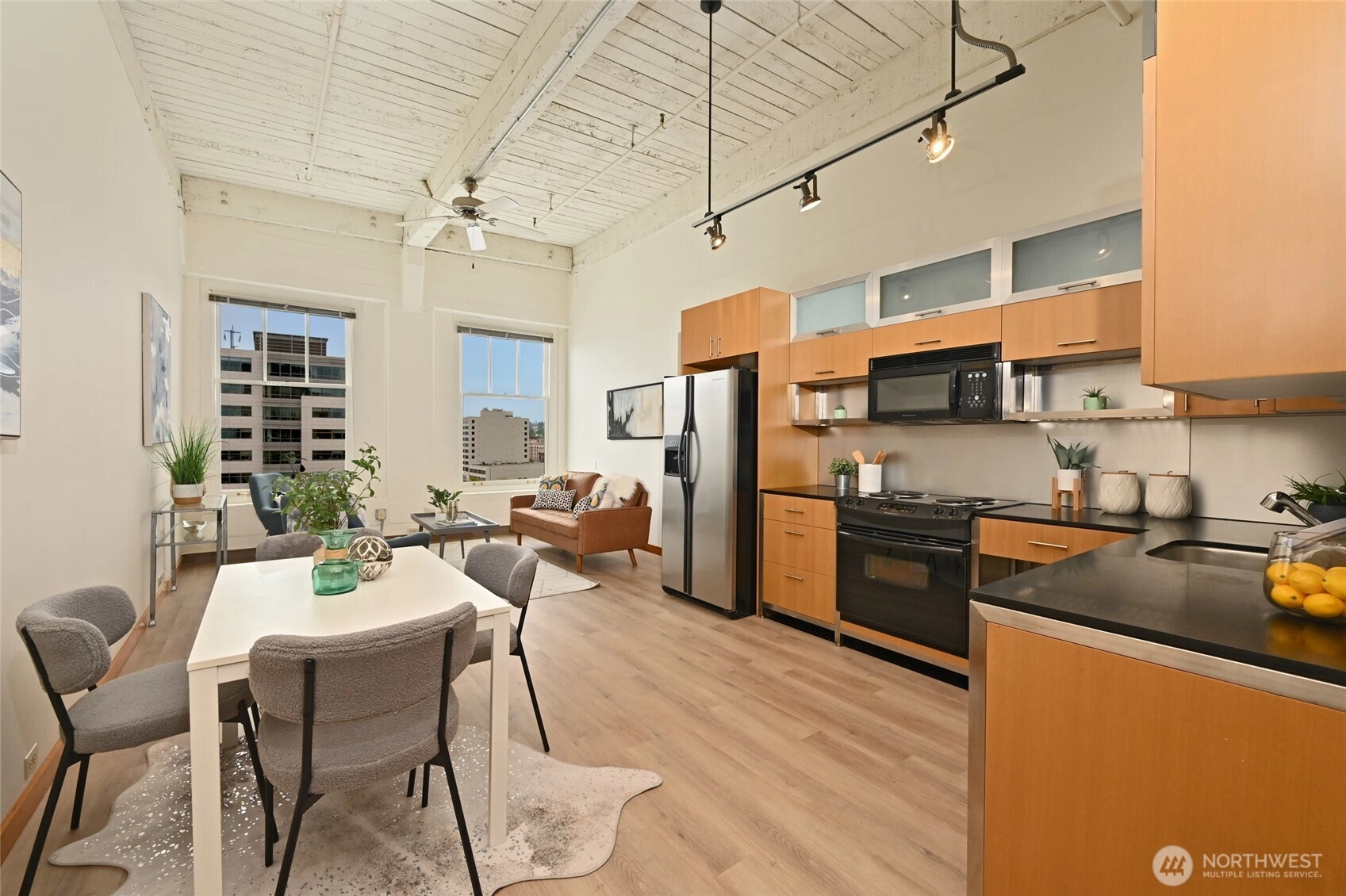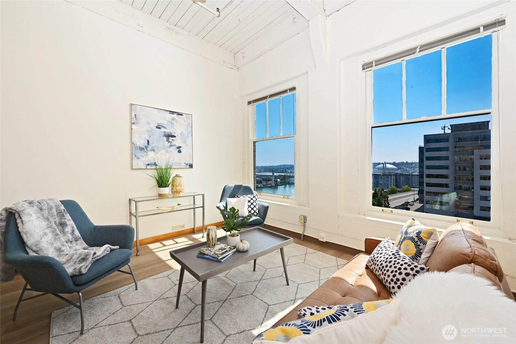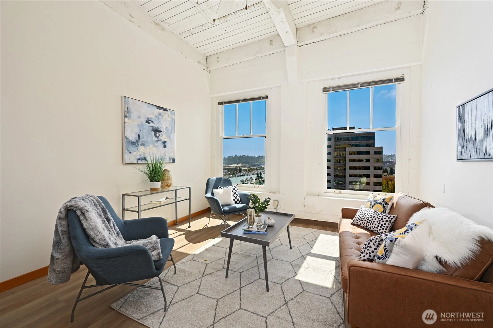 Beautiful historic Cliff Street Lofts top floor penthouse with spectacular unobstructed view of Mt Rainier, Thea Foss waterway and city! Spacious open room concept with NEW 8 foot insulated windows and 12 foot ceiling. NEW luxury plank floors, freshly painted, bright living/dining area with ceiling fan, contemporary kitchen, washer/dryer combo and closet. Large bedroom, 12 foot ceiling and fan. Garage parking space and storage locker. Cliff Street Loft amenities include a free laundry room, rooftop deck with outstanding views, barbeque, garden and more. Close to shops, restaurants, entertainment, UW campus and street car. Easy access to I-5, museums, waterfront activities, Point Ruston, and Point Defiance Park. Ready move in condition!