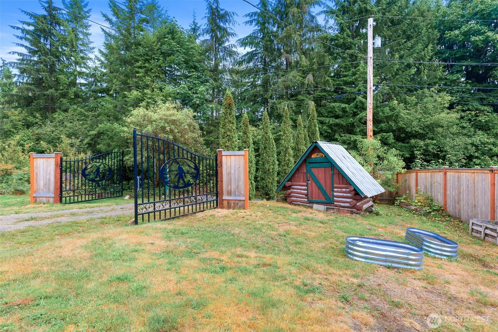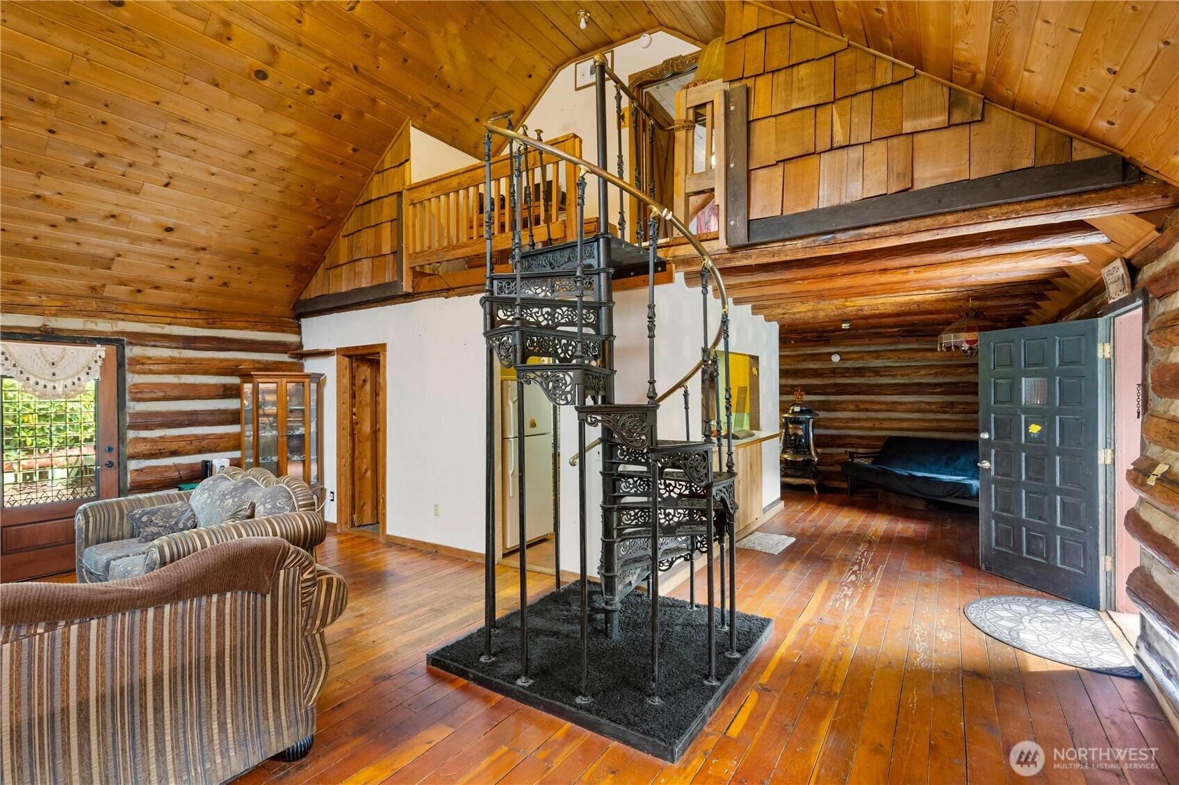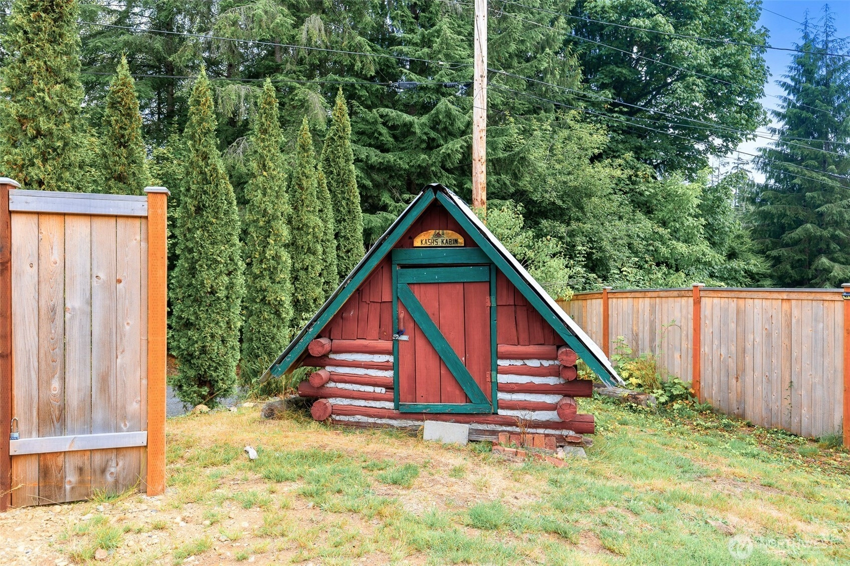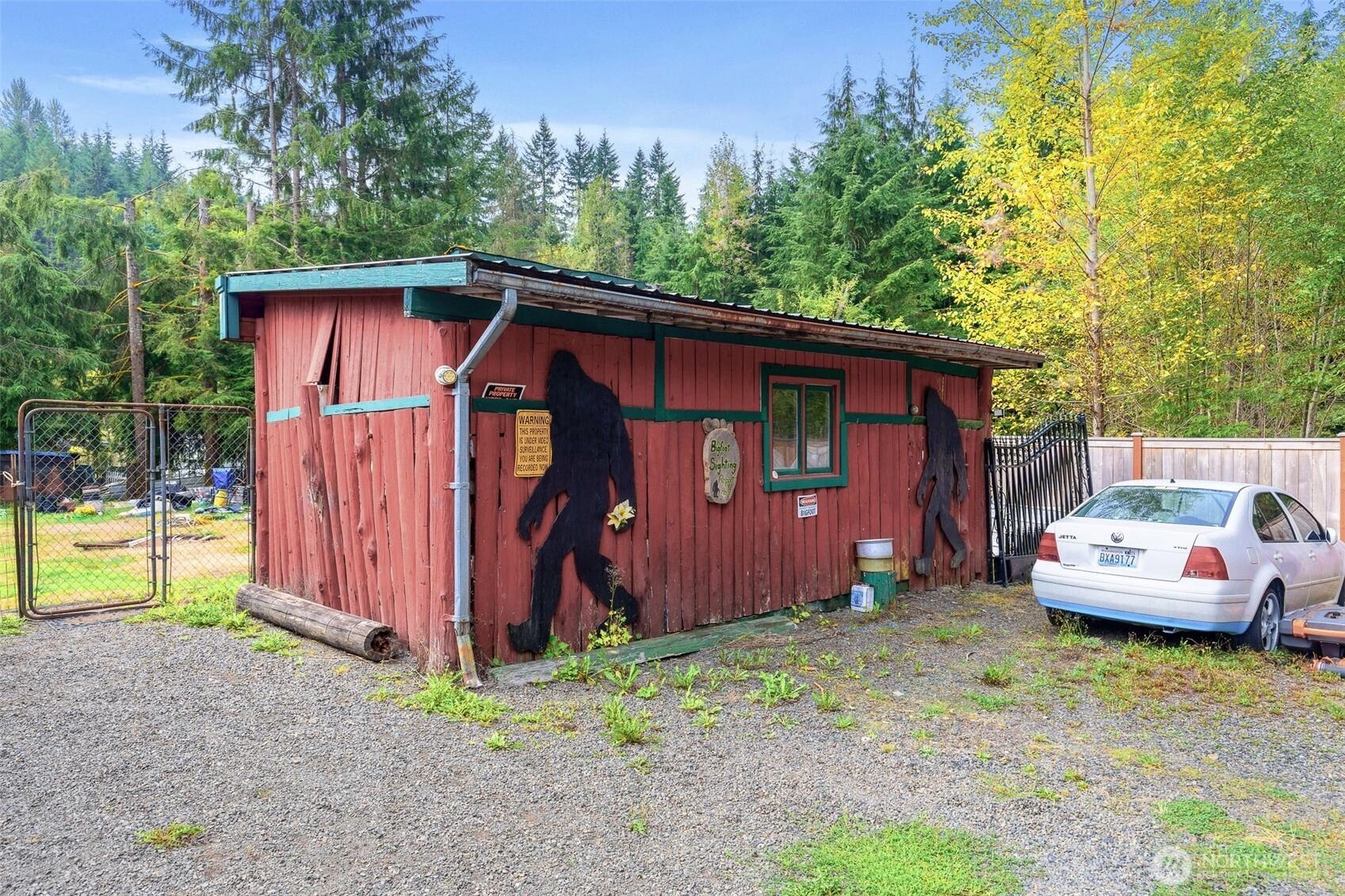 One-of-a-Kind Log Cabin with Bigfoot Flair in Granite Falls. Nestled in the foothills, this two-story tamarack log cabin was once home to the author of Bigfoot: Myth or Reality. Bigfoot greets you at the gates & stands watch at the entrance, setting the tone for a property like no other. Inside, a circular ornate staircase links the main level bedroom, full bath, & living space w/a loft above. Built from Alaska’s toughest tamarack wood, the cabin combines rustic strength with timeless charm, enhanced by a new roof and chimney. On a quarter-acre cul-de-sac lot in River N Forest, you’ll find multiple outbuildings—including a children’s cabin, saloon-style shed, storage, & wood shed—plus room to grow vegetables in a peaceful, private setting.