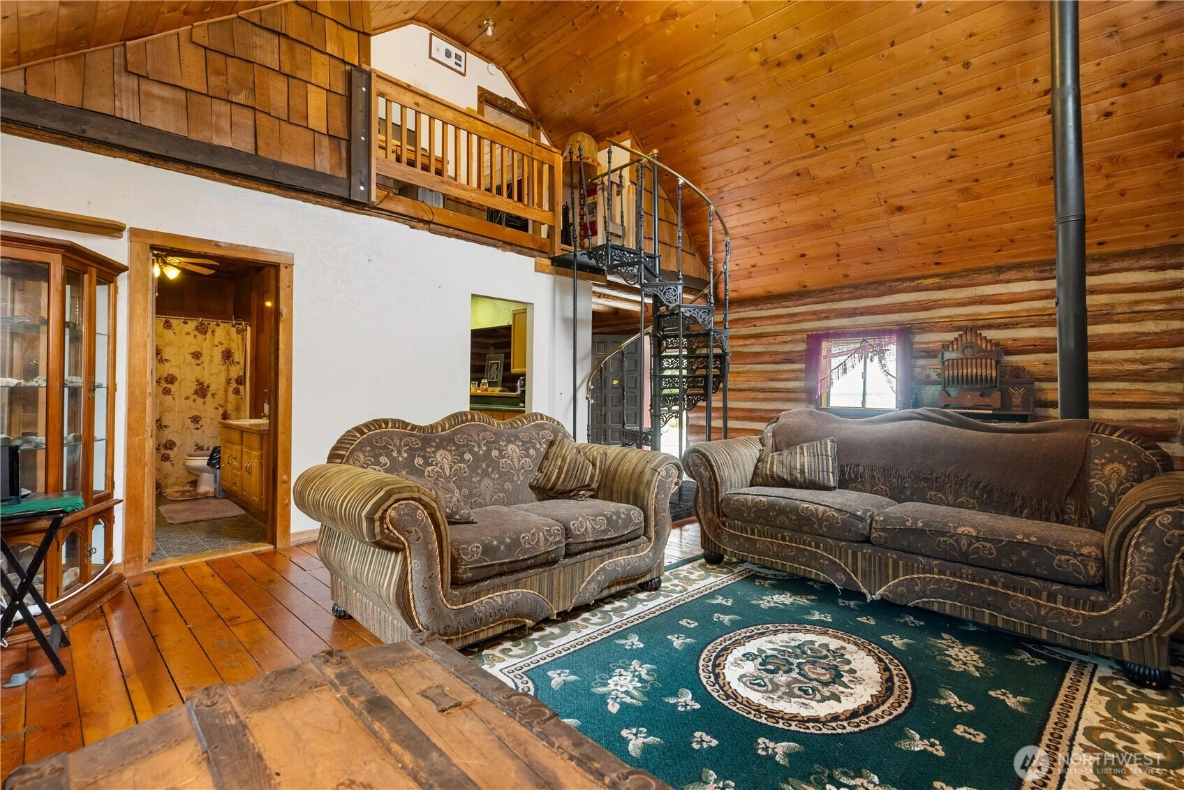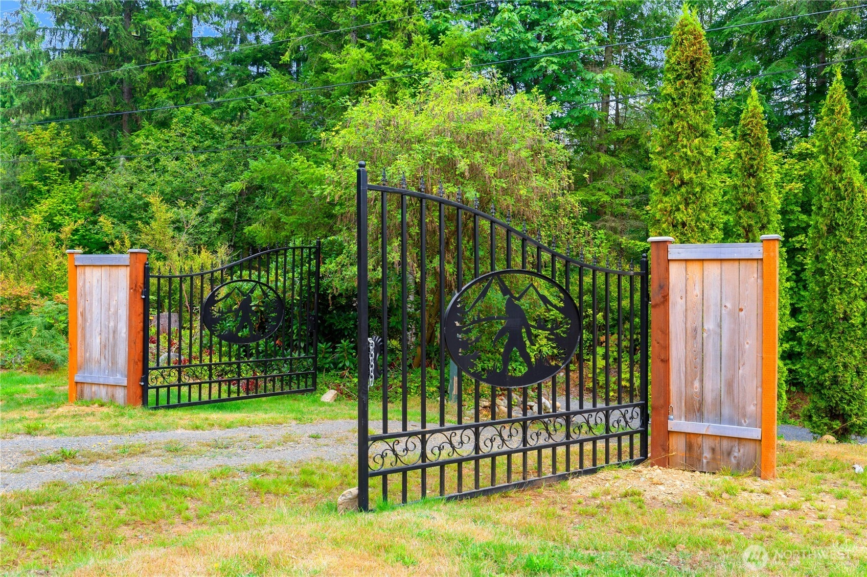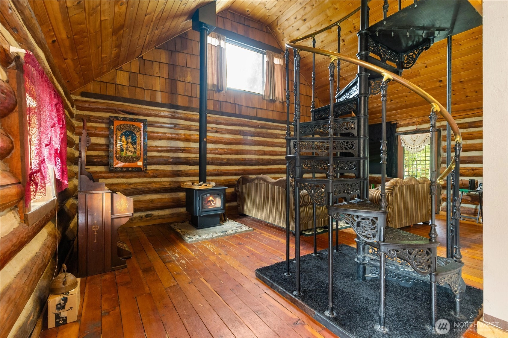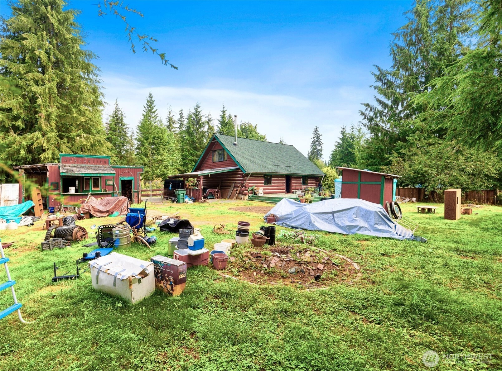 One-of-a-Kind Log Cabin with Bigfoot Flair in Granite Falls. Nestled in the foothills, this two-story tamarack log cabin was once home to the author of Bigfoot: Myth or Reality. Bigfoot greets you at the gates & stands watch at the entrance, setting the tone for a property like no other. Inside, a circular ornate staircase links the main level bedroom, full bath, & living space w/a loft above. Built from Alaska’s toughest tamarack wood, the cabin combines rustic strength with timeless charm, enhanced by a new roof and chimney. On a quarter-acre cul-de-sac lot in River N Forest, you’ll find multiple outbuildings—including a children’s cabin, saloon-style shed, storage, & wood shed—plus room to grow vegetables in a peaceful, private setting.