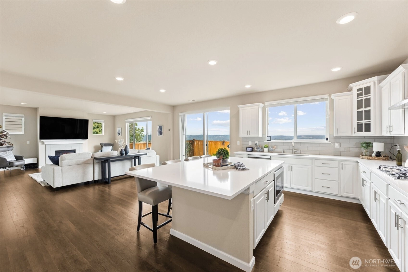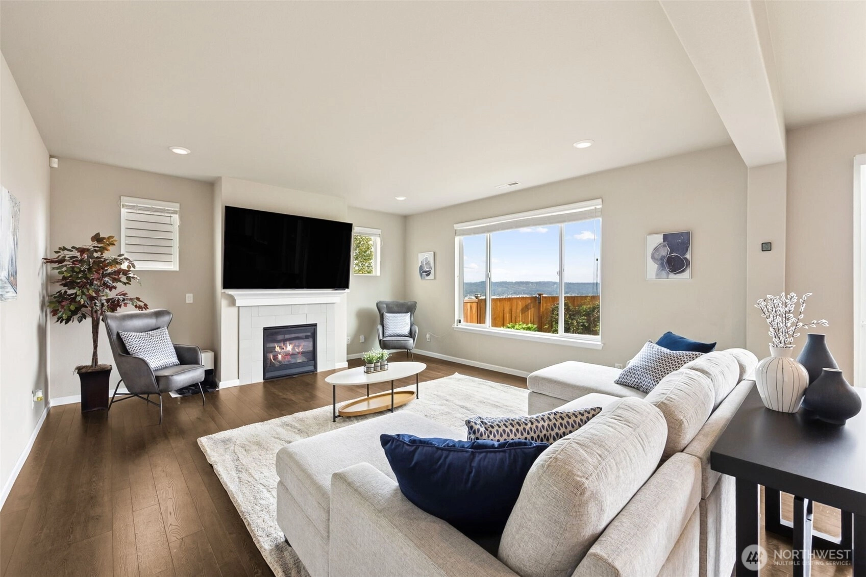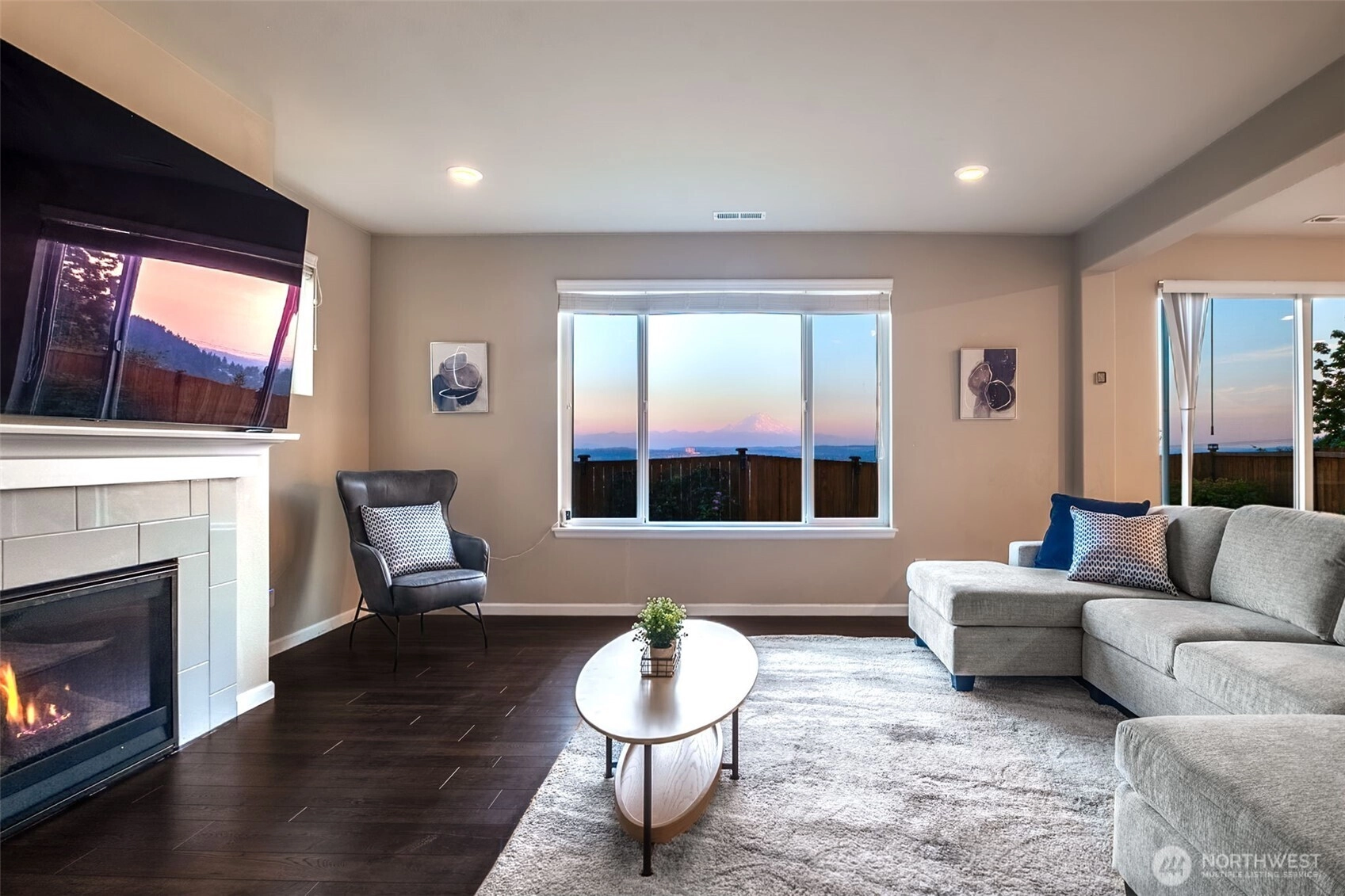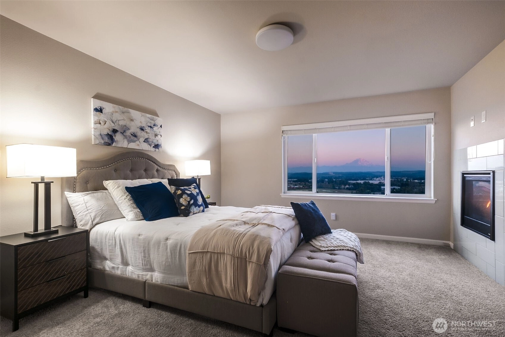 Stunning panoramic Mt. Rainier and sweeping Cascade Mountain views from all your back windows in this immaculate 2-story open-concept Lennar home. This home boasts the neighborhood’s finest view and an exceptional floorplan. Offering 3,341 sq ft, the main level features dining area, and great room with gas fireplace, complemented by a kitchen with white cabinetry, quartz counters, large island, double ovens, gas cooktop, and French door refrigerator. A bedroom and full bath are conveniently located on the main floor. Upstairs, the master suite includes a private retreat with fireplace, five-piece bath, and walk-in closet. Two additional bedrooms share a Jack-and-Jill bath, plus a versatile bonus room. Wi-Fi CERTIFIED™ Home Design.
