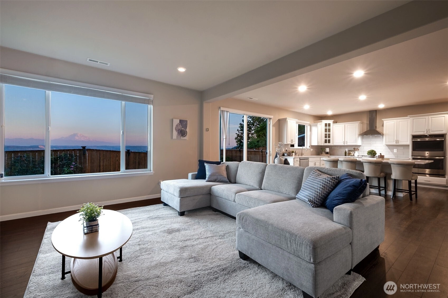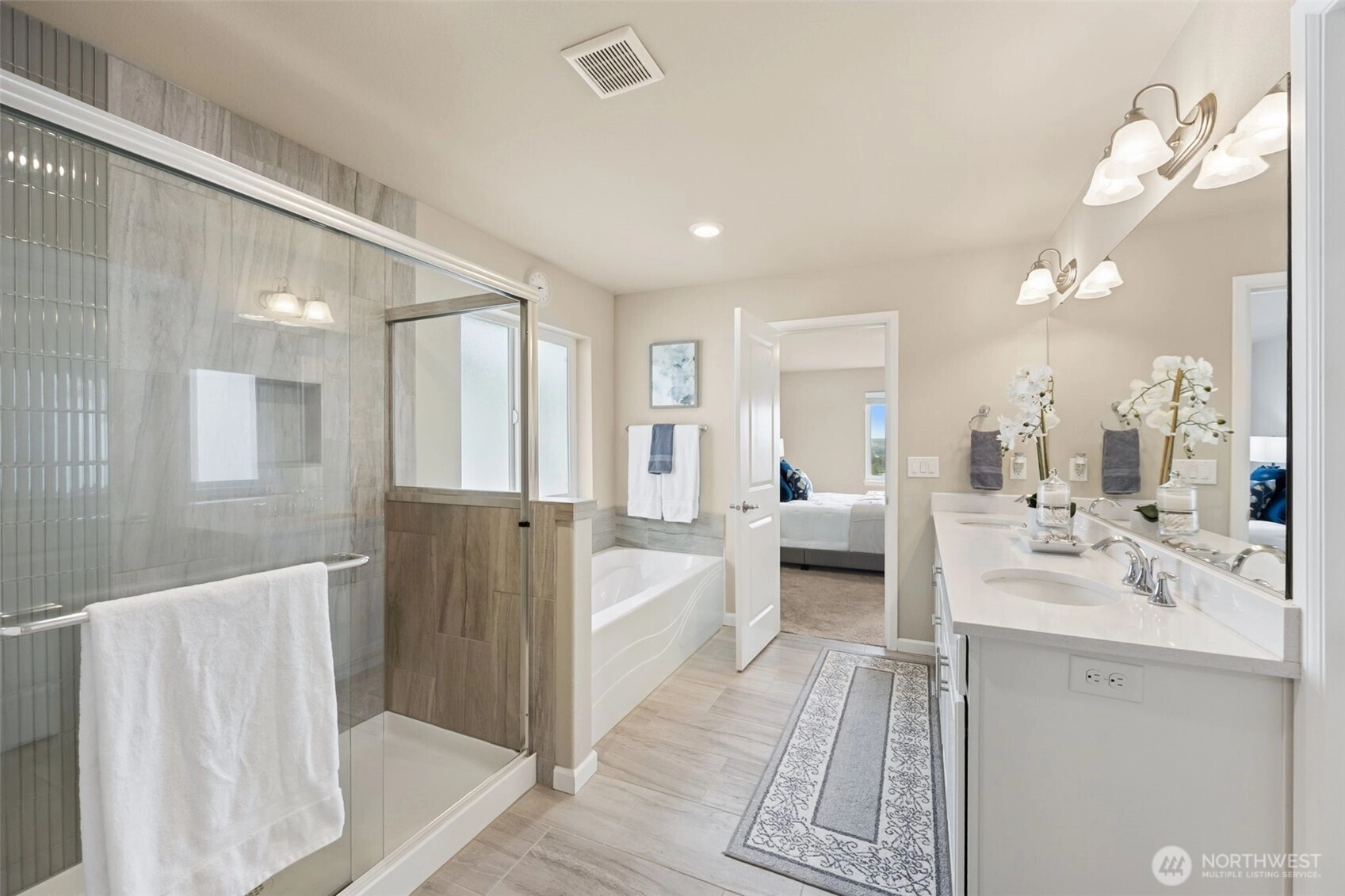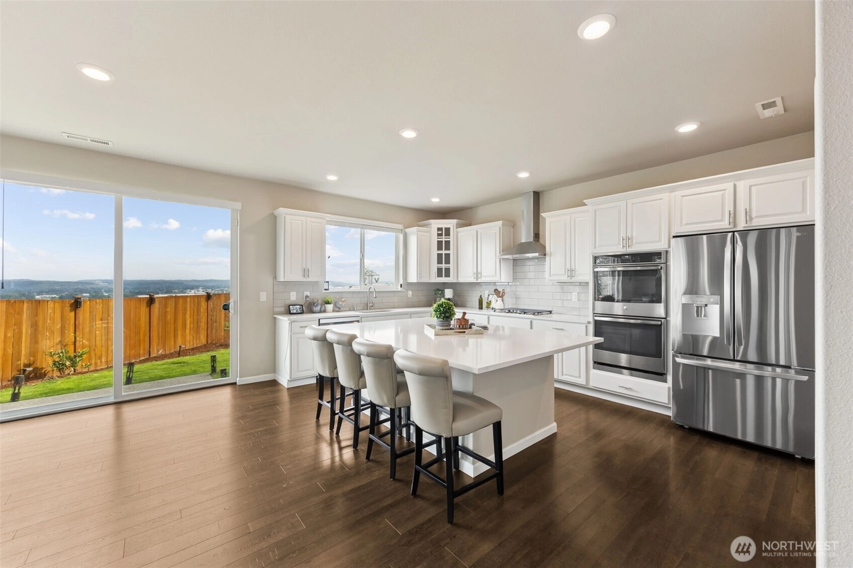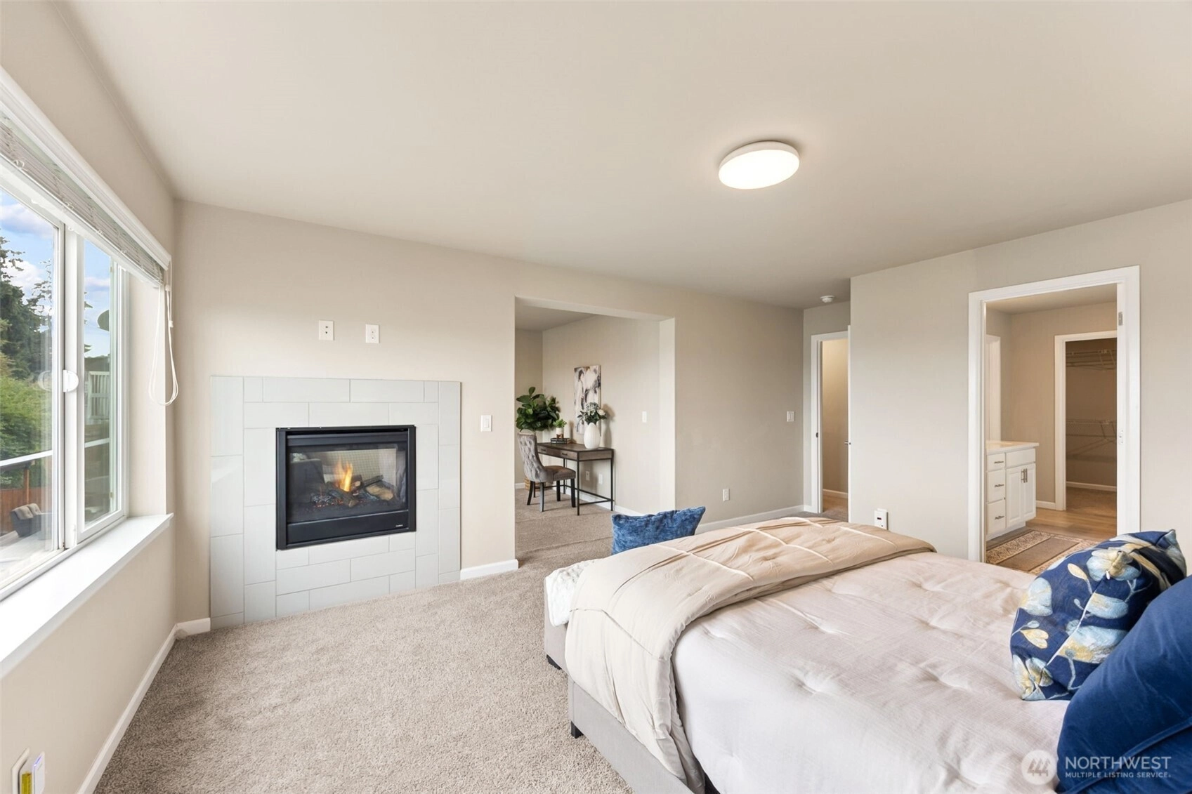 Stunning panoramic Mt. Rainier and sweeping Cascade Mountain views from all your back windows in this immaculate 2-story open-concept Lennar home. This home boasts the neighborhood’s finest view and an exceptional floorplan. Offering 3,341 sq ft, the main level features dining area, and great room with gas fireplace, complemented by a kitchen with white cabinetry, quartz counters, large island, double ovens, gas cooktop, and French door refrigerator. A bedroom and full bath are conveniently located on the main floor. Upstairs, the master suite includes a private retreat with fireplace, five-piece bath, and walk-in closet. Two additional bedrooms share a Jack-and-Jill bath, plus a versatile bonus room. Wi-Fi CERTIFIED™ Home Design.