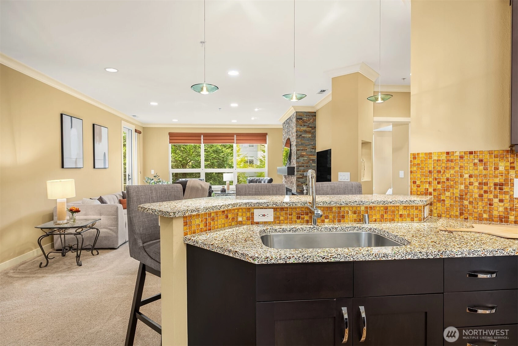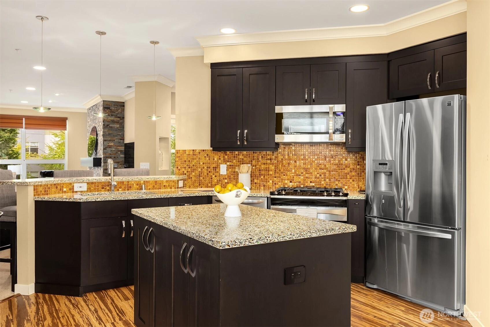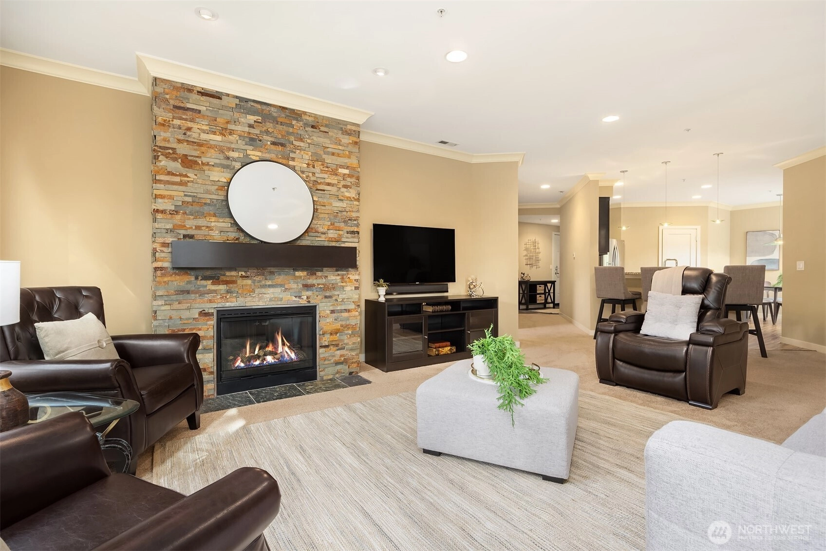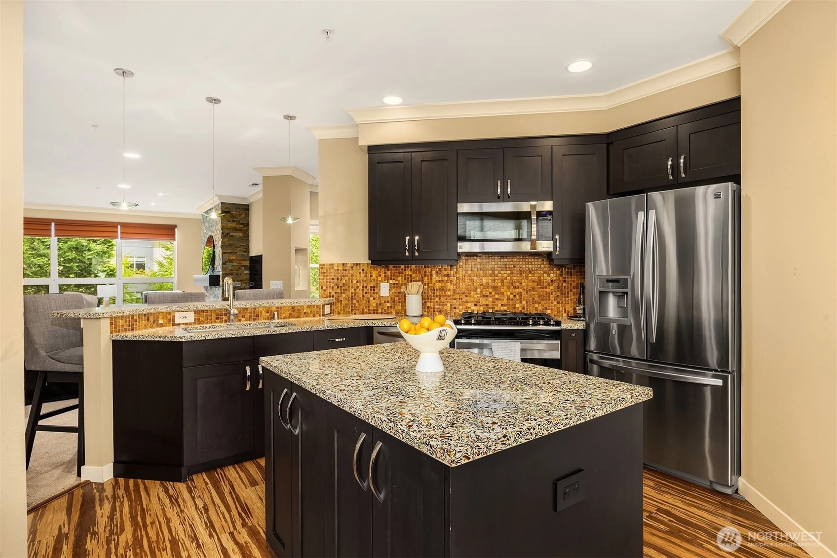 Welcome home to Park Ave building, located just a block from Kirkland Urban & DT! This south-facing, end unit enjoys abundant natural light & privacy. Fully remodeled in 2021, this 2bd/2ba condo offers a fabulous open floor plan. The open kitchen showcases striated bamboo flooring, recycled glass quartz countertops, custom cabinetry, pantry, built-in desk & lovely dining nook surrounded by windows. The oversized living room features a gas fireplace & access to the private covered deck. The spacious primary includes walk-in closet w/ built-ins, entrance to the patio, & 4-piece ensuite bath. A 2nd full bath & in-unit laundry room w/ built-in storage, complete this move-in ready unit! 2 assigned parking spots in secure garage + storage!