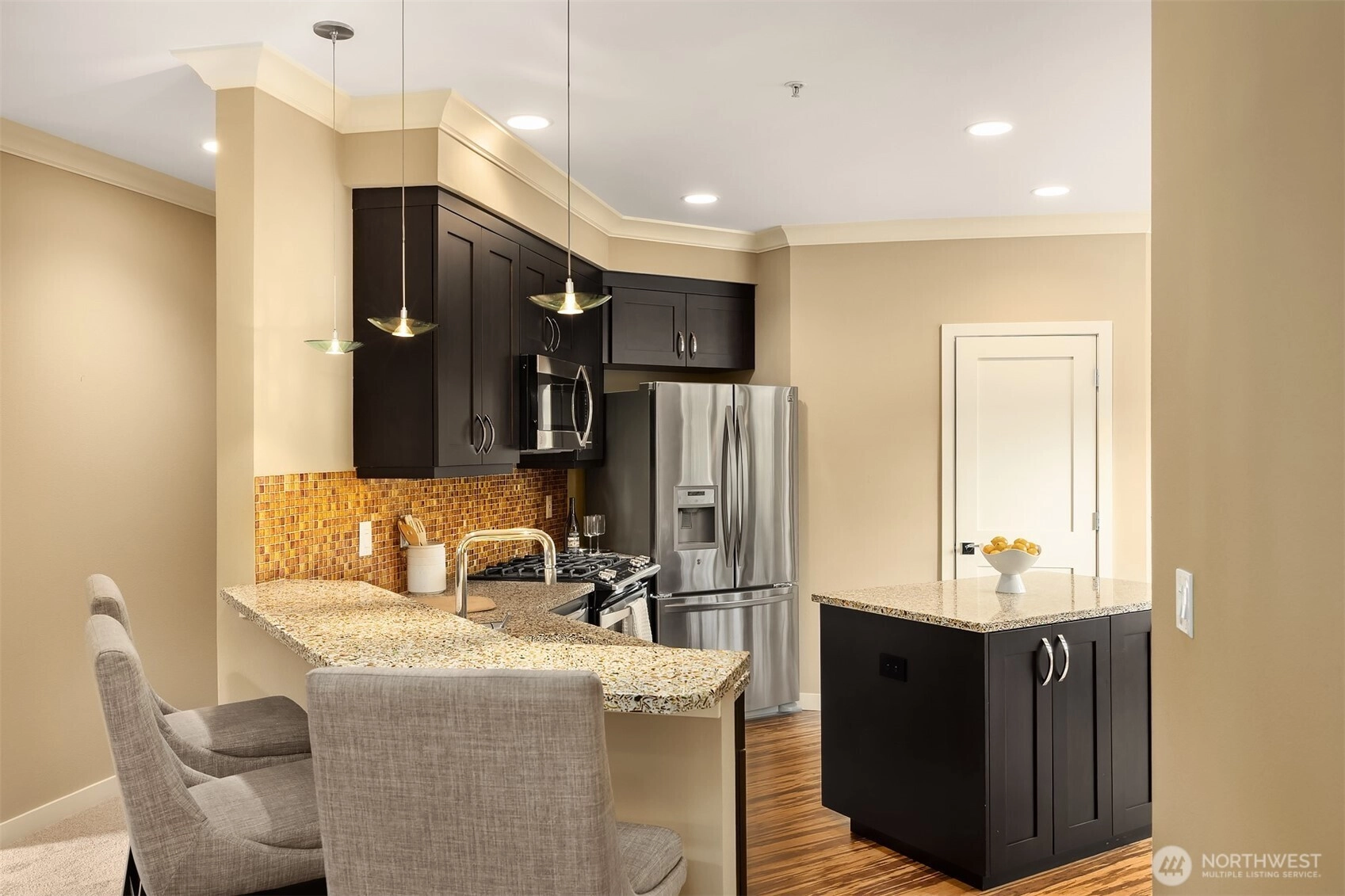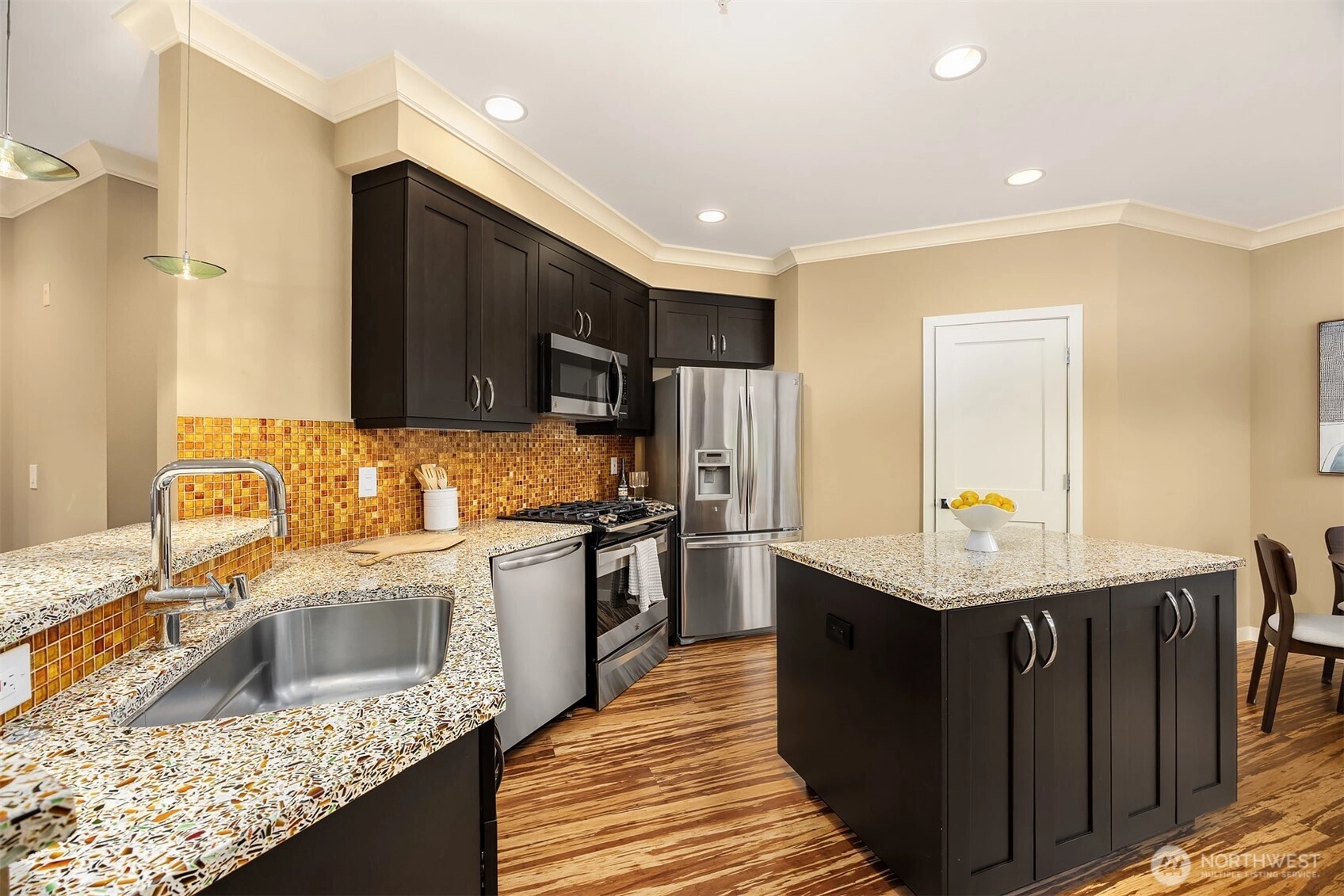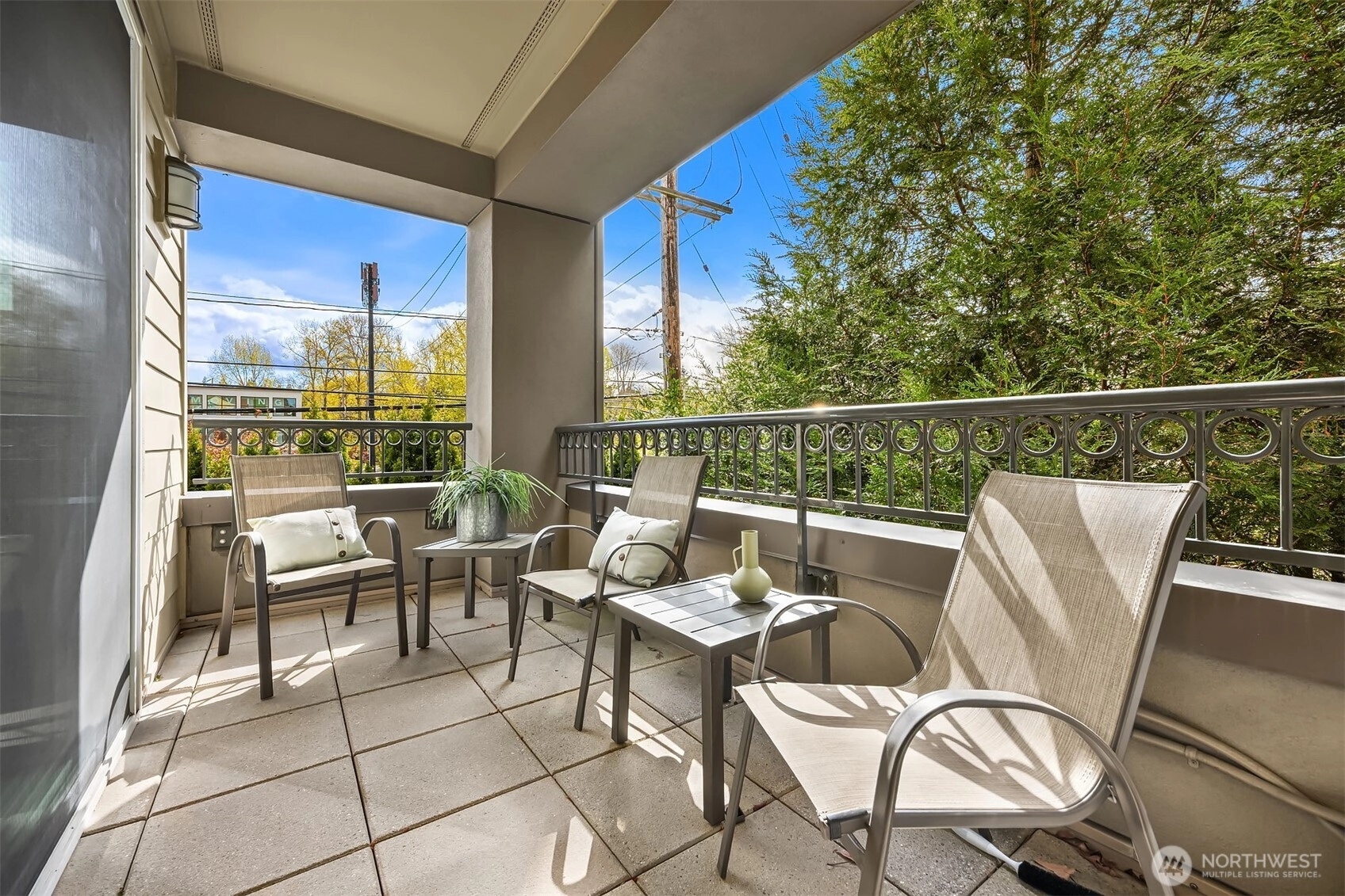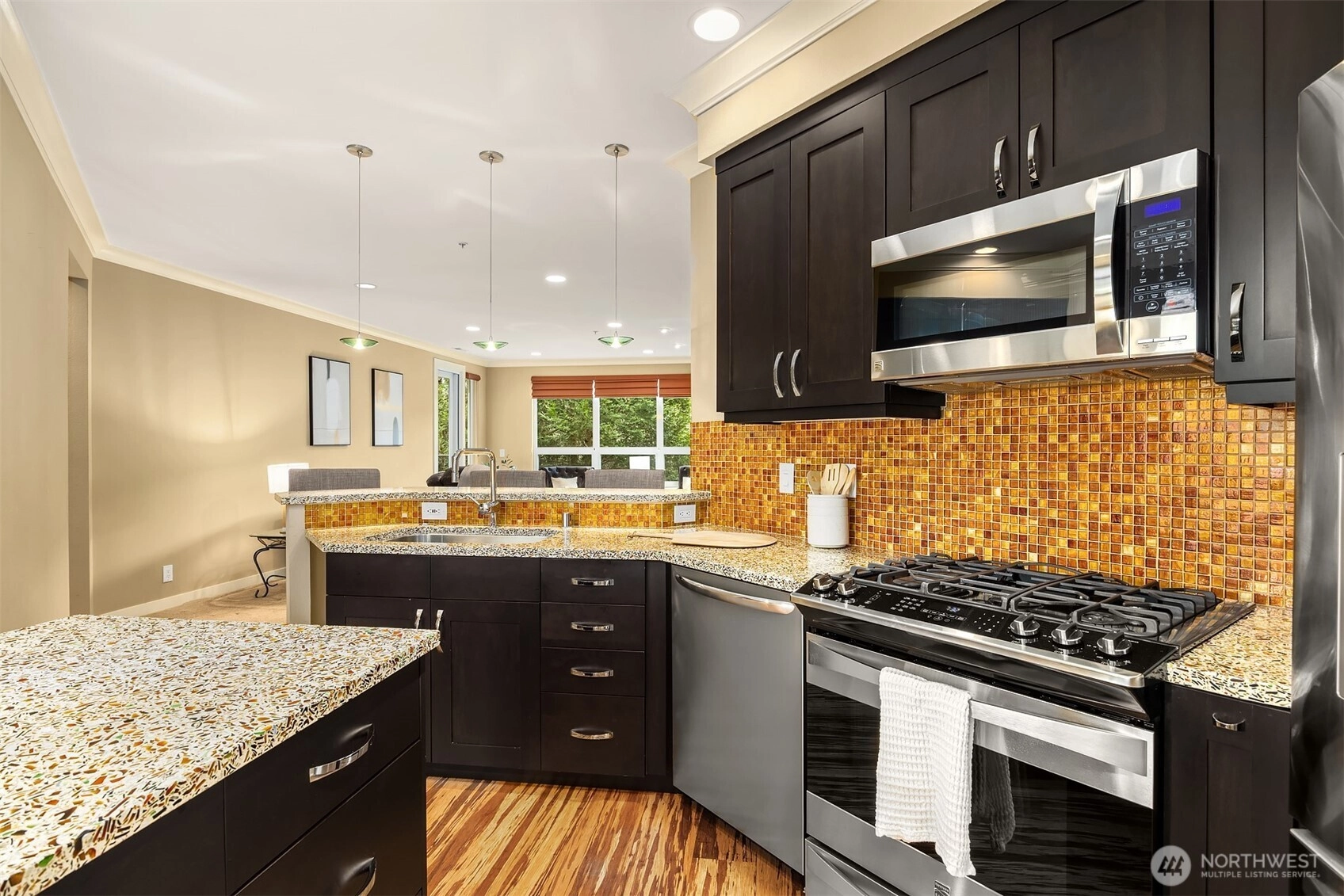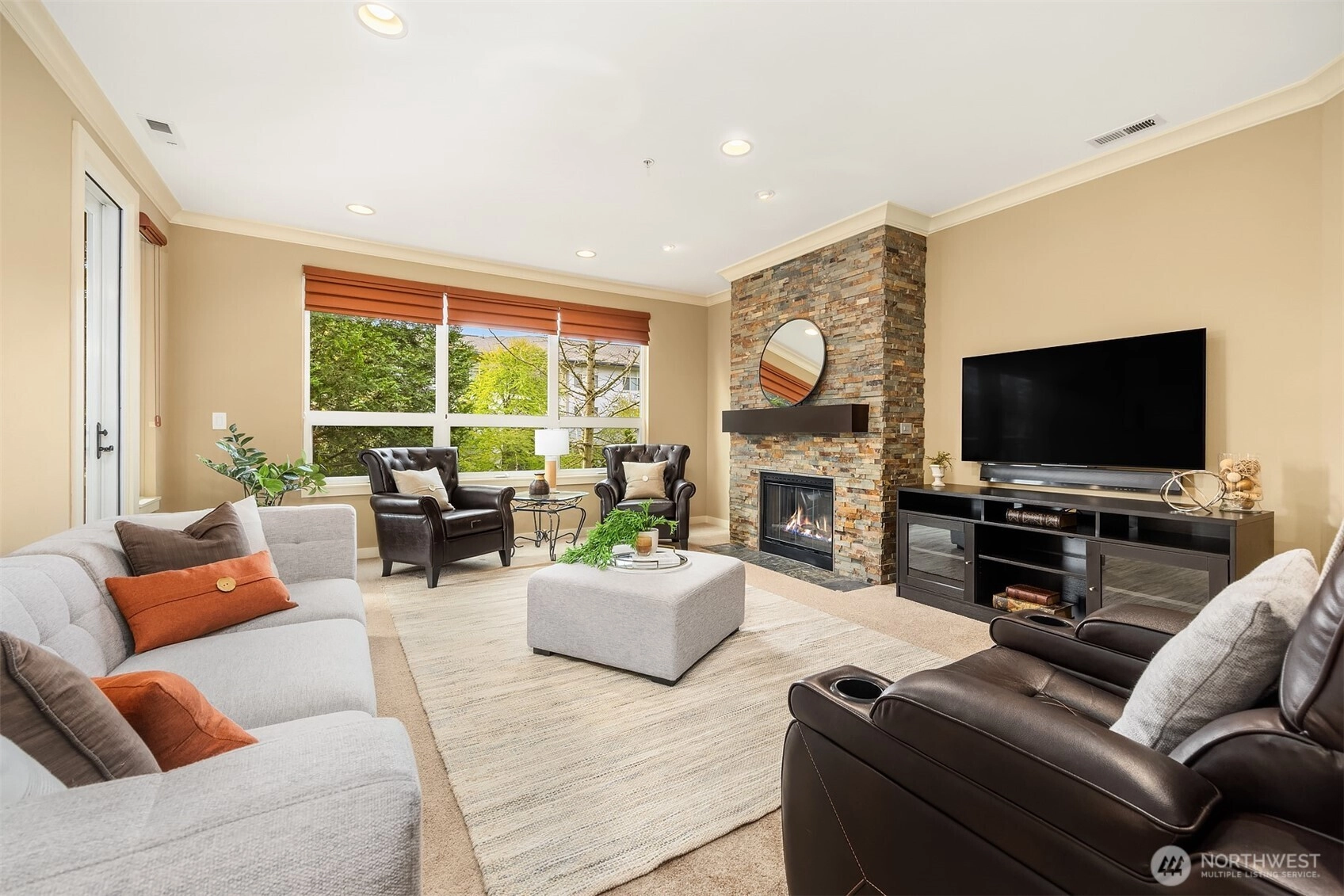 Welcome home to Park Ave building, located just a block from Kirkland Urban & DT! This south-facing, end unit enjoys abundant natural light & privacy. Fully remodeled in 2021, this 2bd/2ba condo offers a fabulous open floor plan. The open kitchen showcases striated bamboo flooring, recycled glass quartz countertops, custom cabinetry, pantry, built-in desk & lovely dining nook surrounded by windows. The oversized living room features a gas fireplace & access to the private covered deck. The spacious primary includes walk-in closet w/ built-ins, entrance to the patio, & 4-piece ensuite bath. A 2nd full bath & in-unit laundry room w/ built-in storage, complete this move-in ready unit! 2 assigned parking spots in secure garage + storage!