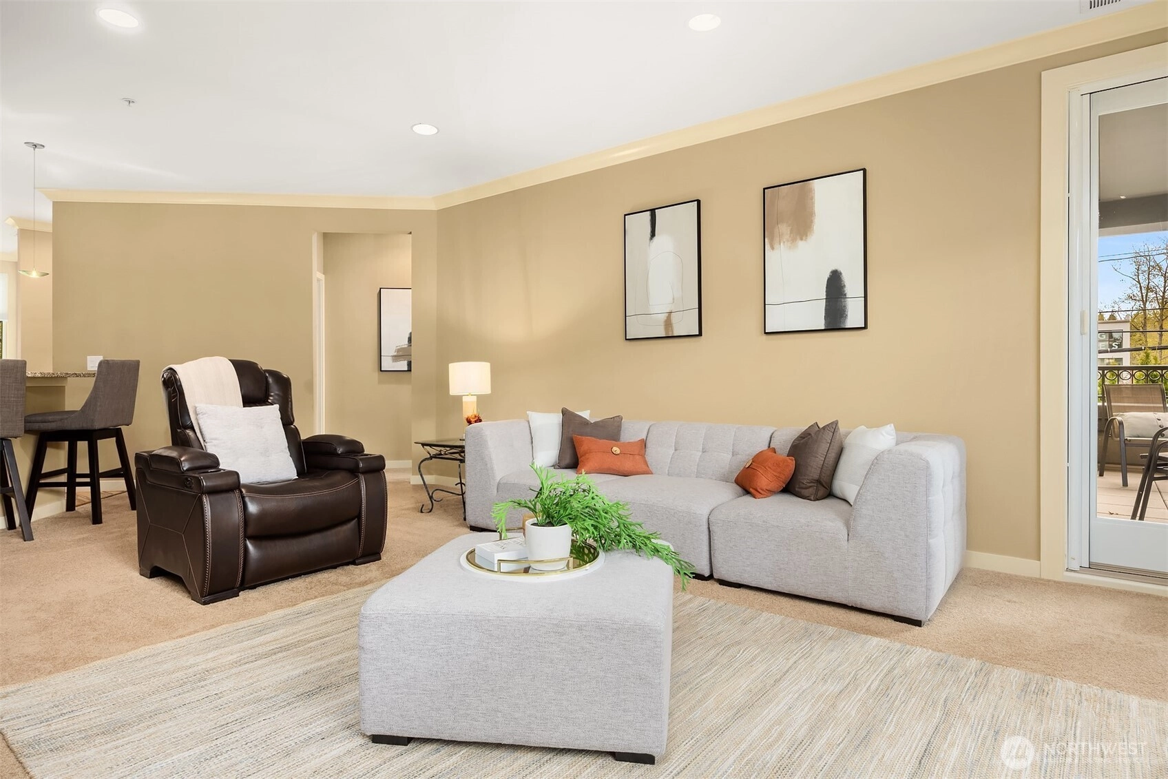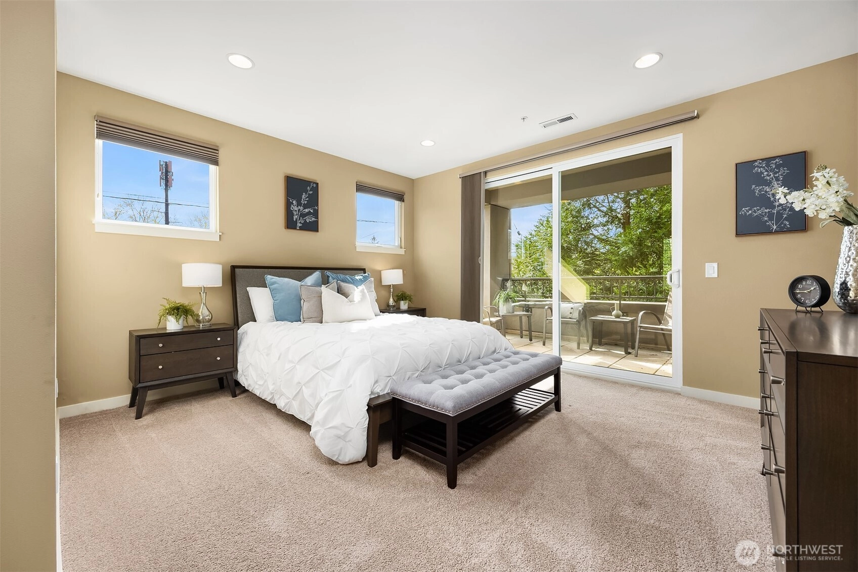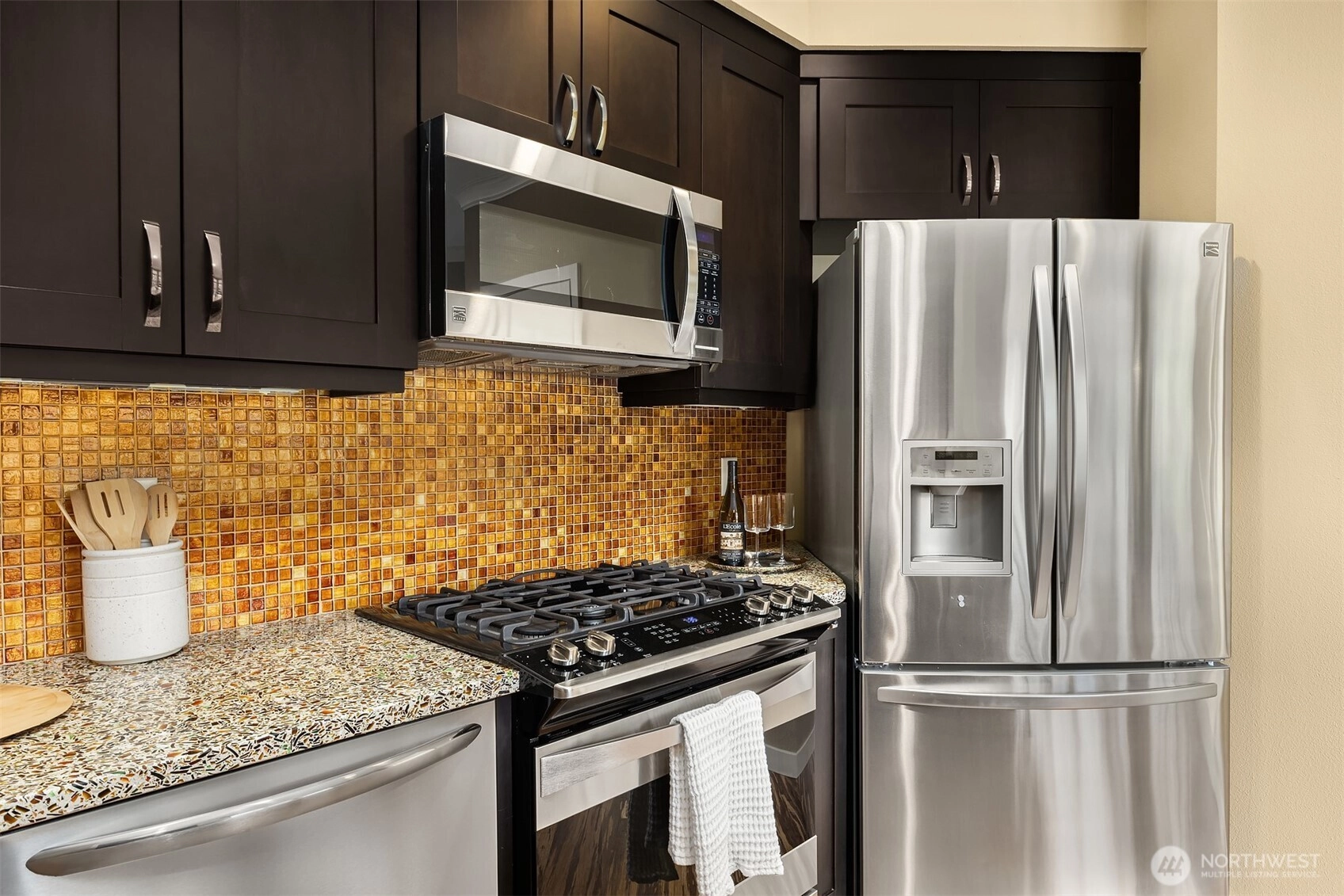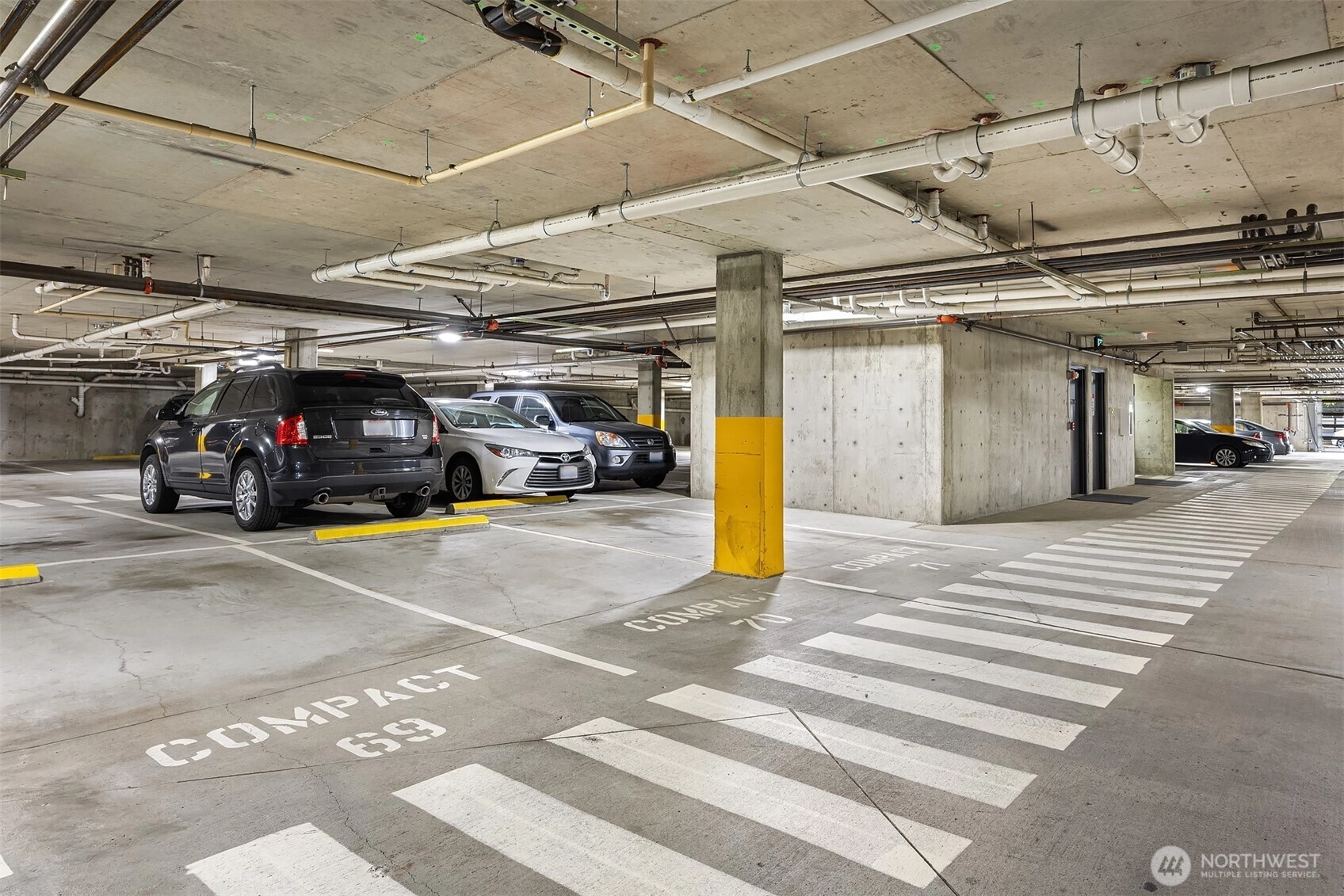 Welcome home to Park Ave building, located just a block from Kirkland Urban & DT! This south-facing, end unit enjoys abundant natural light & privacy. Fully remodeled in 2021, this 2bd/2ba condo offers a fabulous open floor plan. The open kitchen showcases striated bamboo flooring, recycled glass quartz countertops, custom cabinetry, pantry, built-in desk & lovely dining nook surrounded by windows. The oversized living room features a gas fireplace & access to the private covered deck. The spacious primary includes walk-in closet w/ built-ins, entrance to the patio, & 4-piece ensuite bath. A 2nd full bath & in-unit laundry room w/ built-in storage, complete this move-in ready unit! 2 assigned parking spots in secure garage + storage!