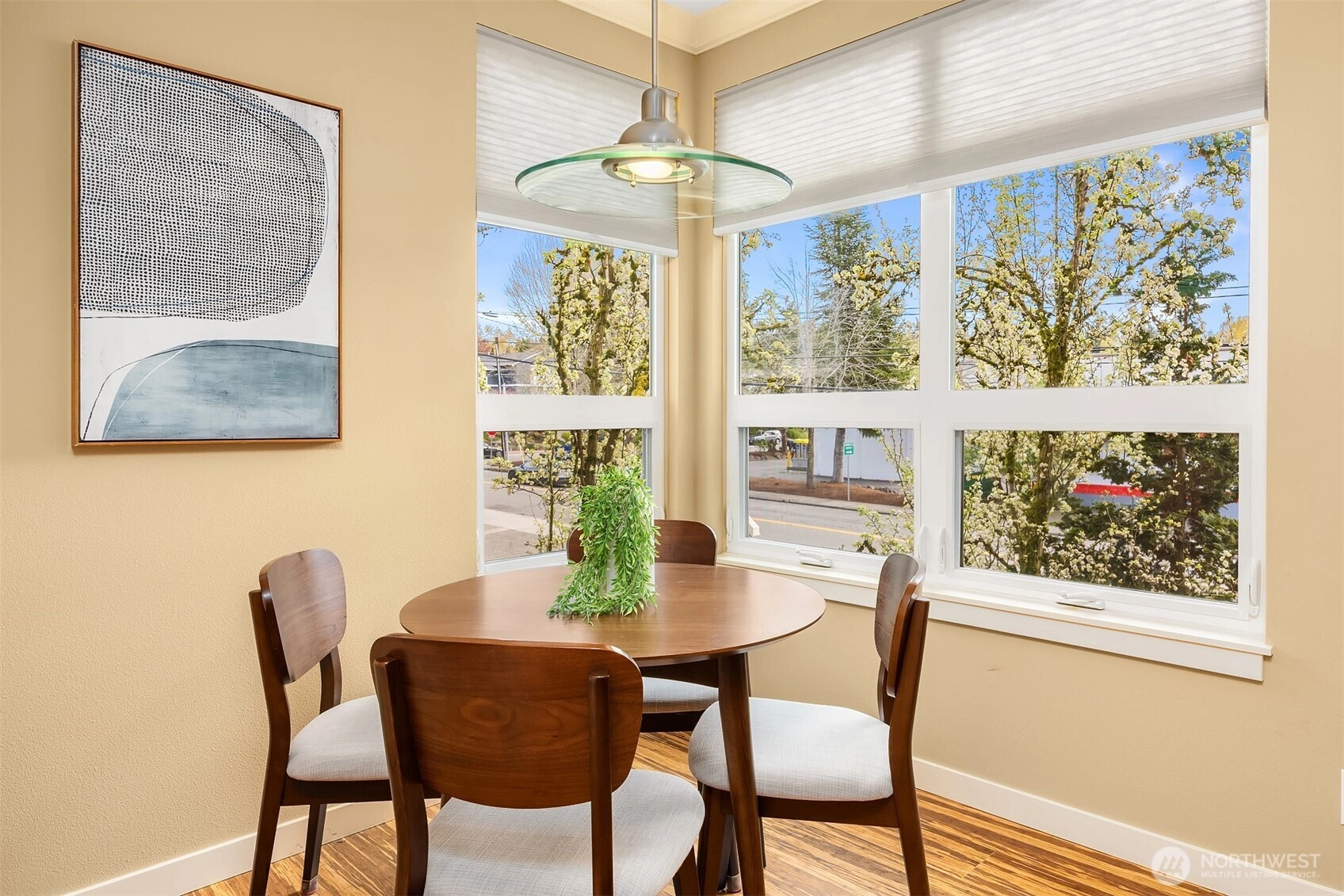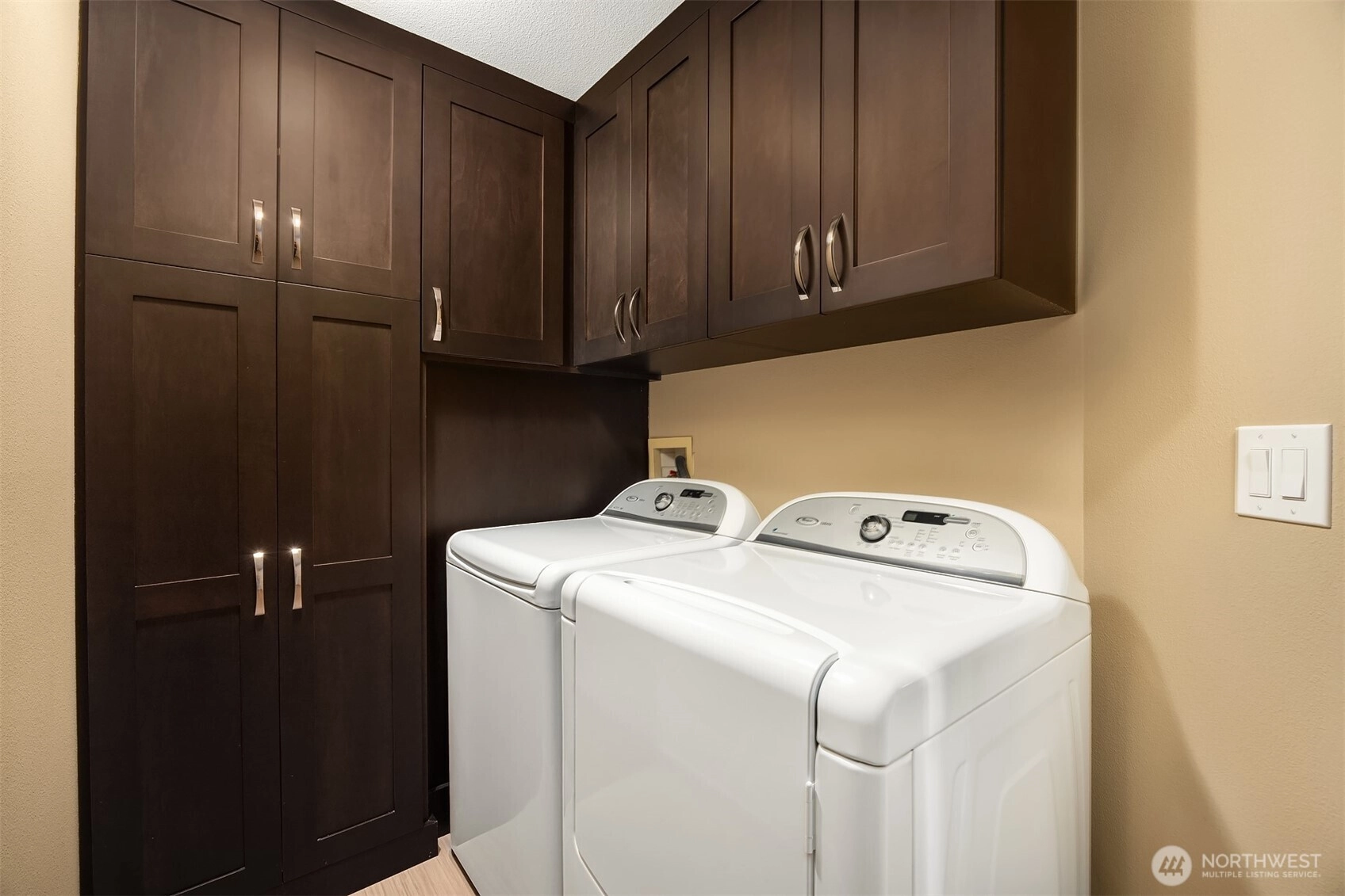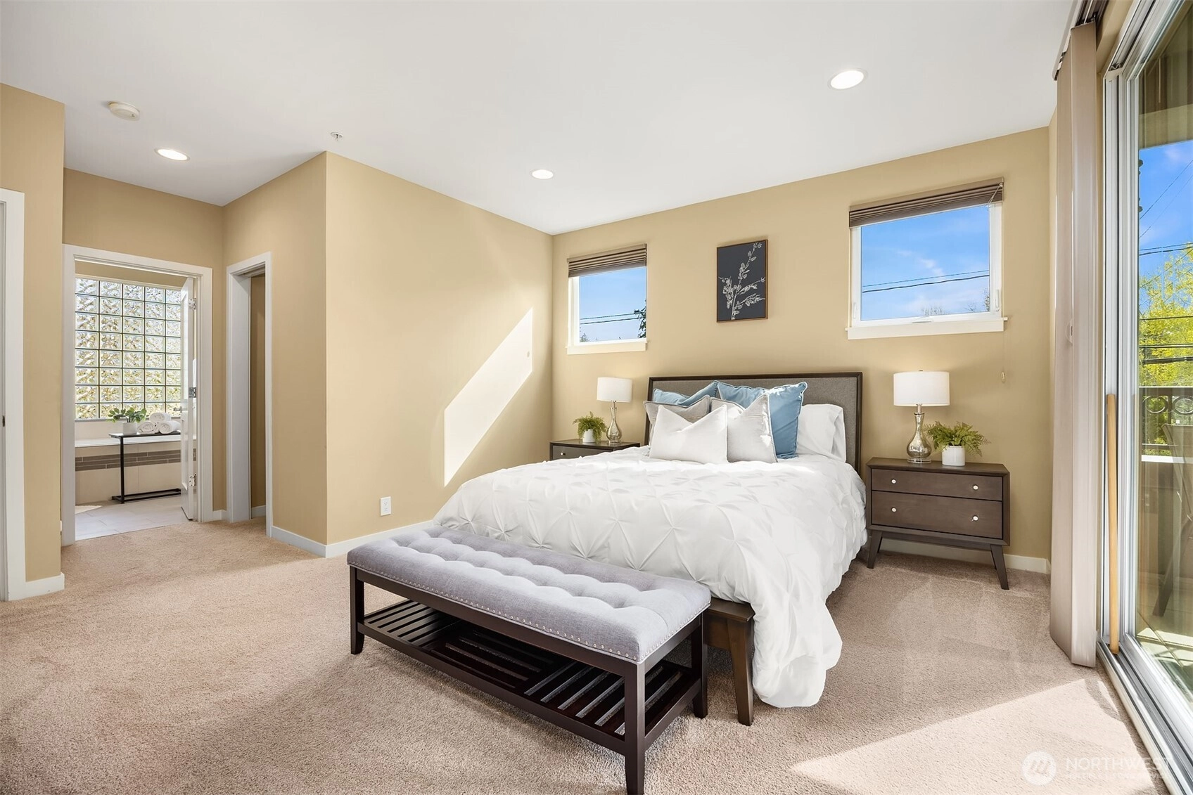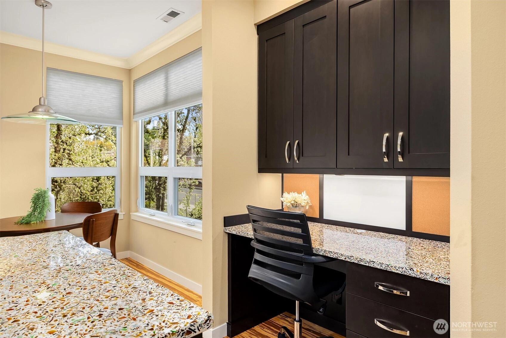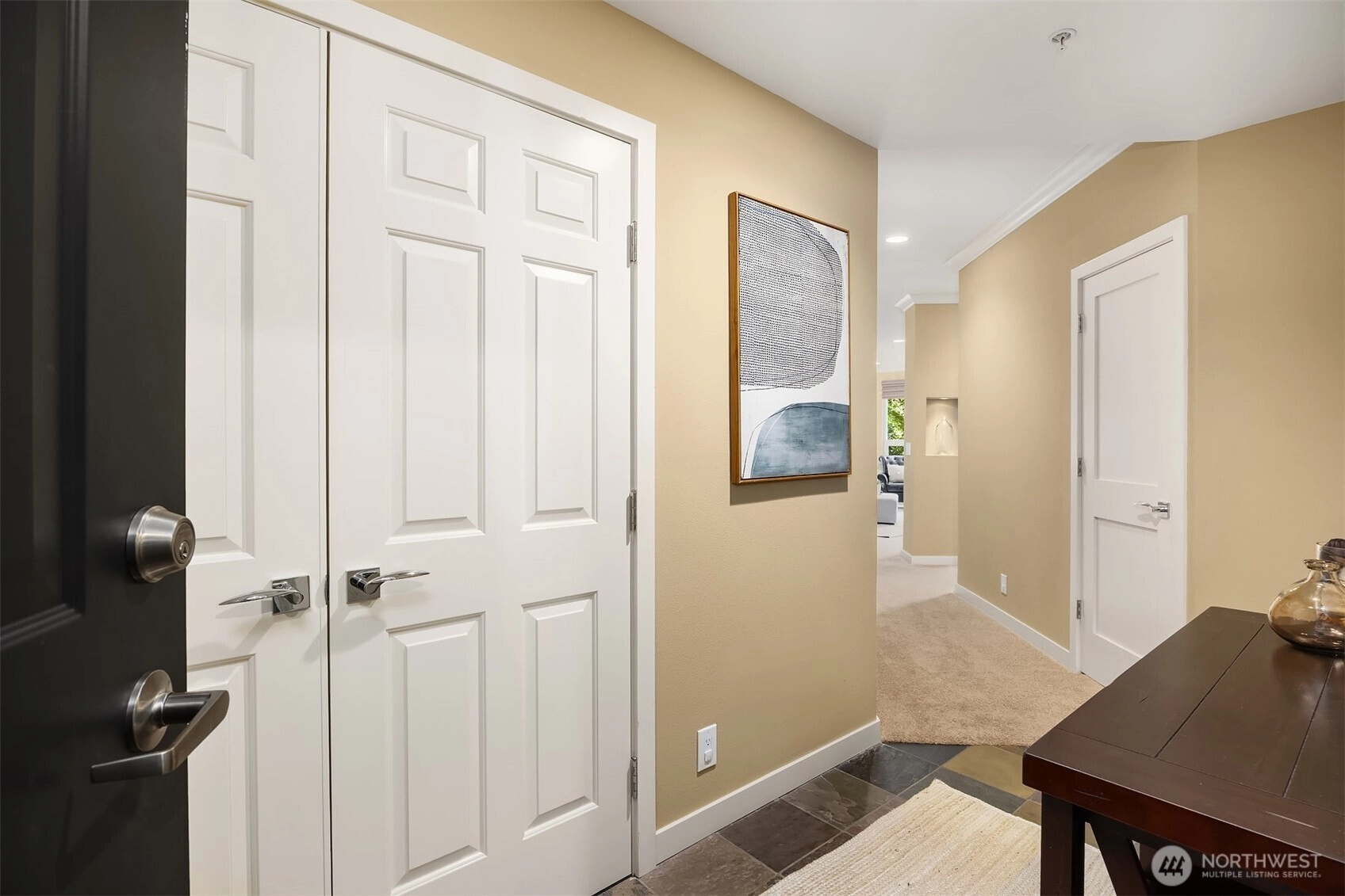 Welcome home to Park Ave building, located just a block from Kirkland Urban & DT! This south-facing, end unit enjoys abundant natural light & privacy. Fully remodeled in 2021, this 2bd/2ba condo offers a fabulous open floor plan. The open kitchen showcases striated bamboo flooring, recycled glass quartz countertops, custom cabinetry, pantry, built-in desk & lovely dining nook surrounded by windows. The oversized living room features a gas fireplace & access to the private covered deck. The spacious primary includes walk-in closet w/ built-ins, entrance to the patio, & 4-piece ensuite bath. A 2nd full bath & in-unit laundry room w/ built-in storage, complete this move-in ready unit! 2 assigned parking spots in secure garage + storage!