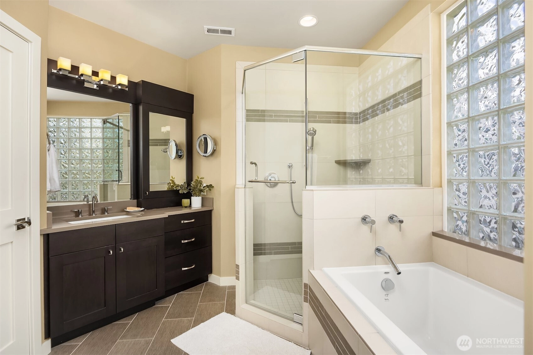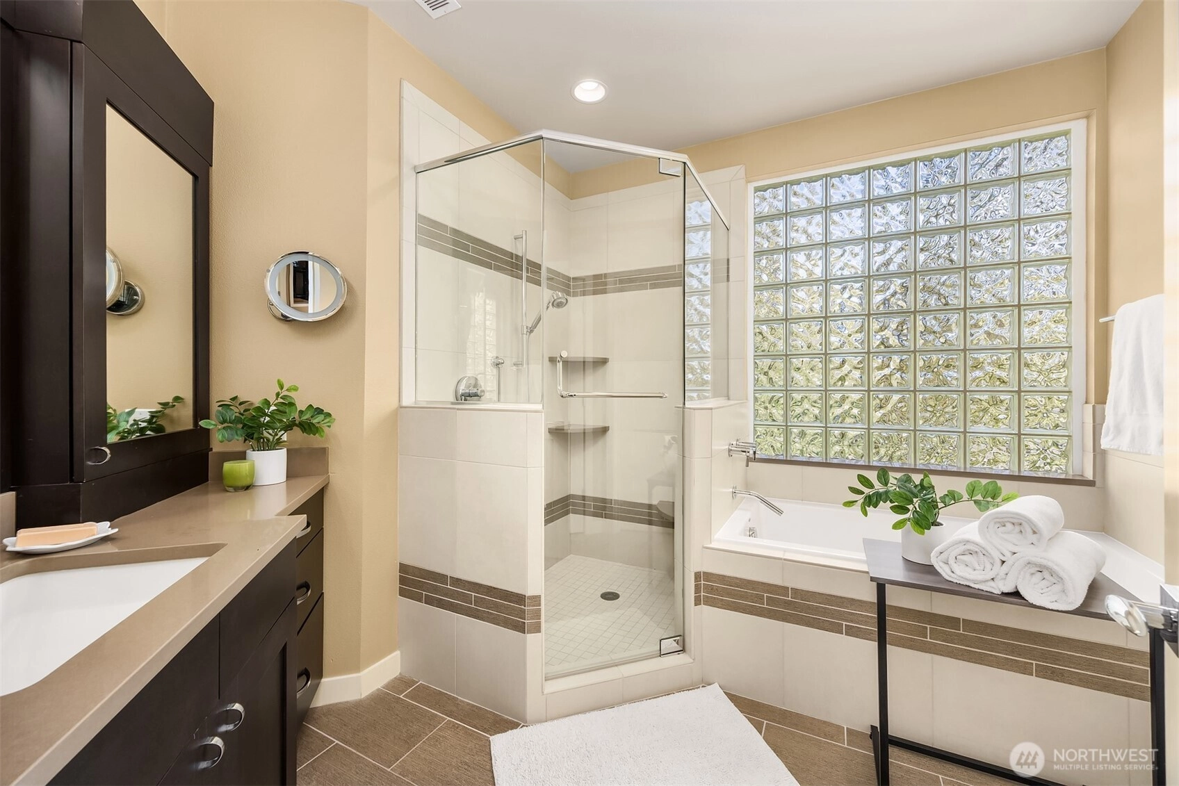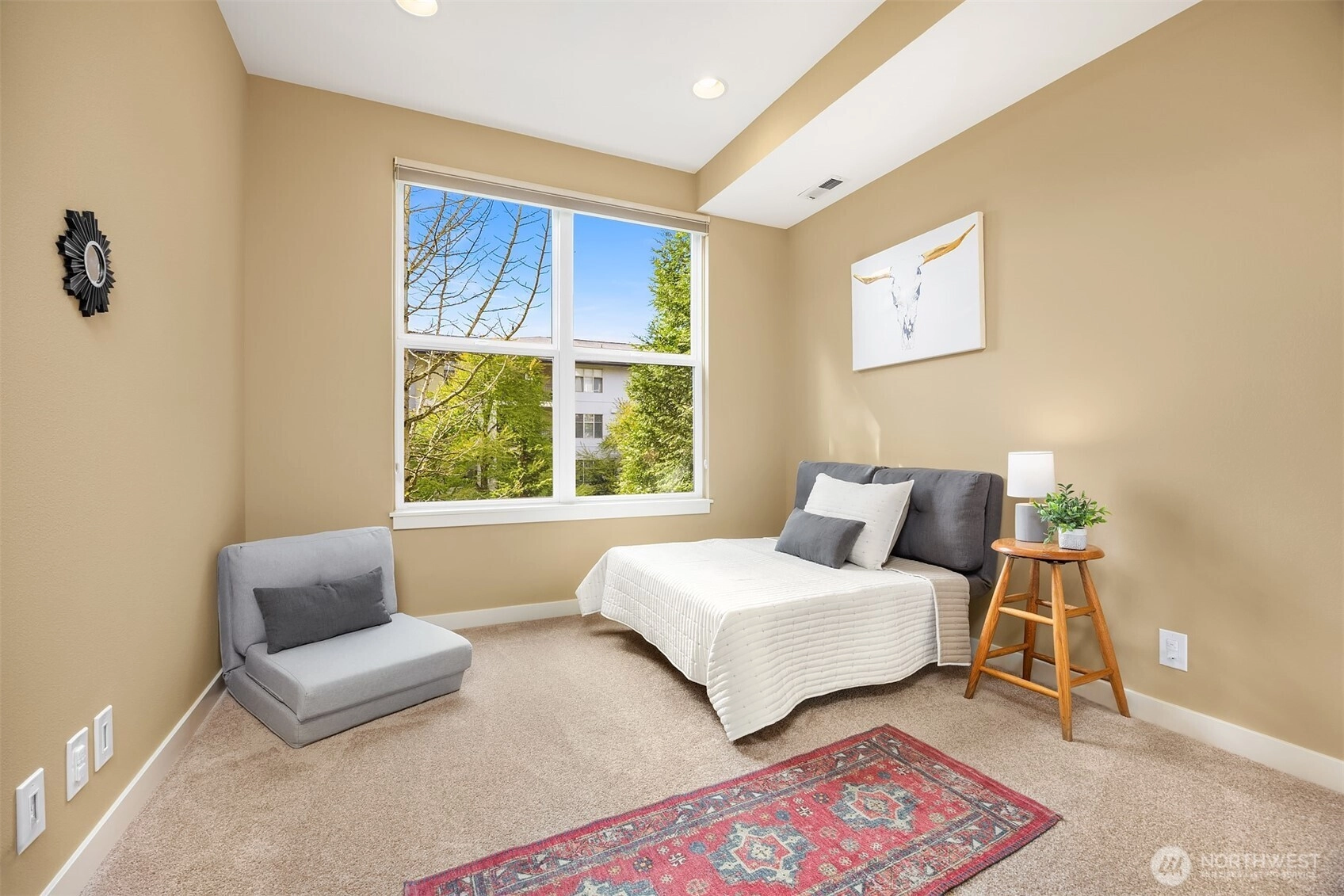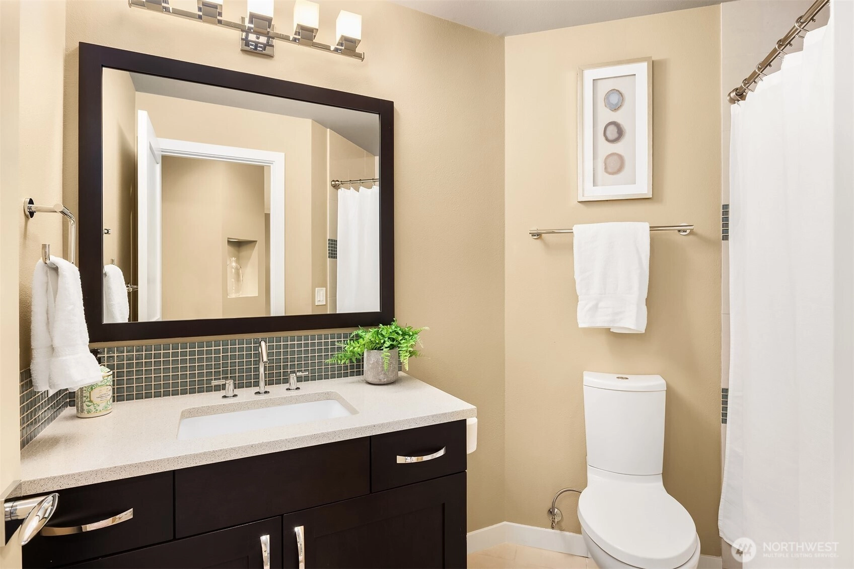 Welcome home to Park Ave building, located just a block from Kirkland Urban & DT! This south-facing, end unit enjoys abundant natural light & privacy. Fully remodeled in 2021, this 2bd/2ba condo offers a fabulous open floor plan. The open kitchen showcases striated bamboo flooring, recycled glass quartz countertops, custom cabinetry, pantry, built-in desk & lovely dining nook surrounded by windows. The oversized living room features a gas fireplace & access to the private covered deck. The spacious primary includes walk-in closet w/ built-ins, entrance to the patio, & 4-piece ensuite bath. A 2nd full bath & in-unit laundry room w/ built-in storage, complete this move-in ready unit! 2 assigned parking spots in secure garage + storage!