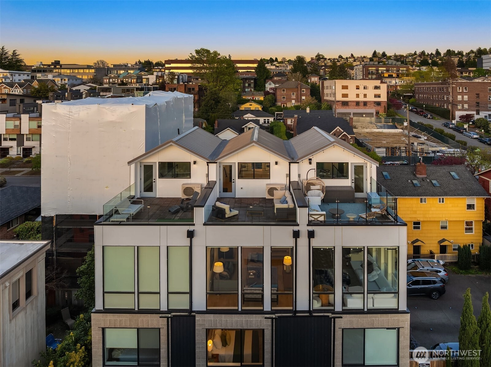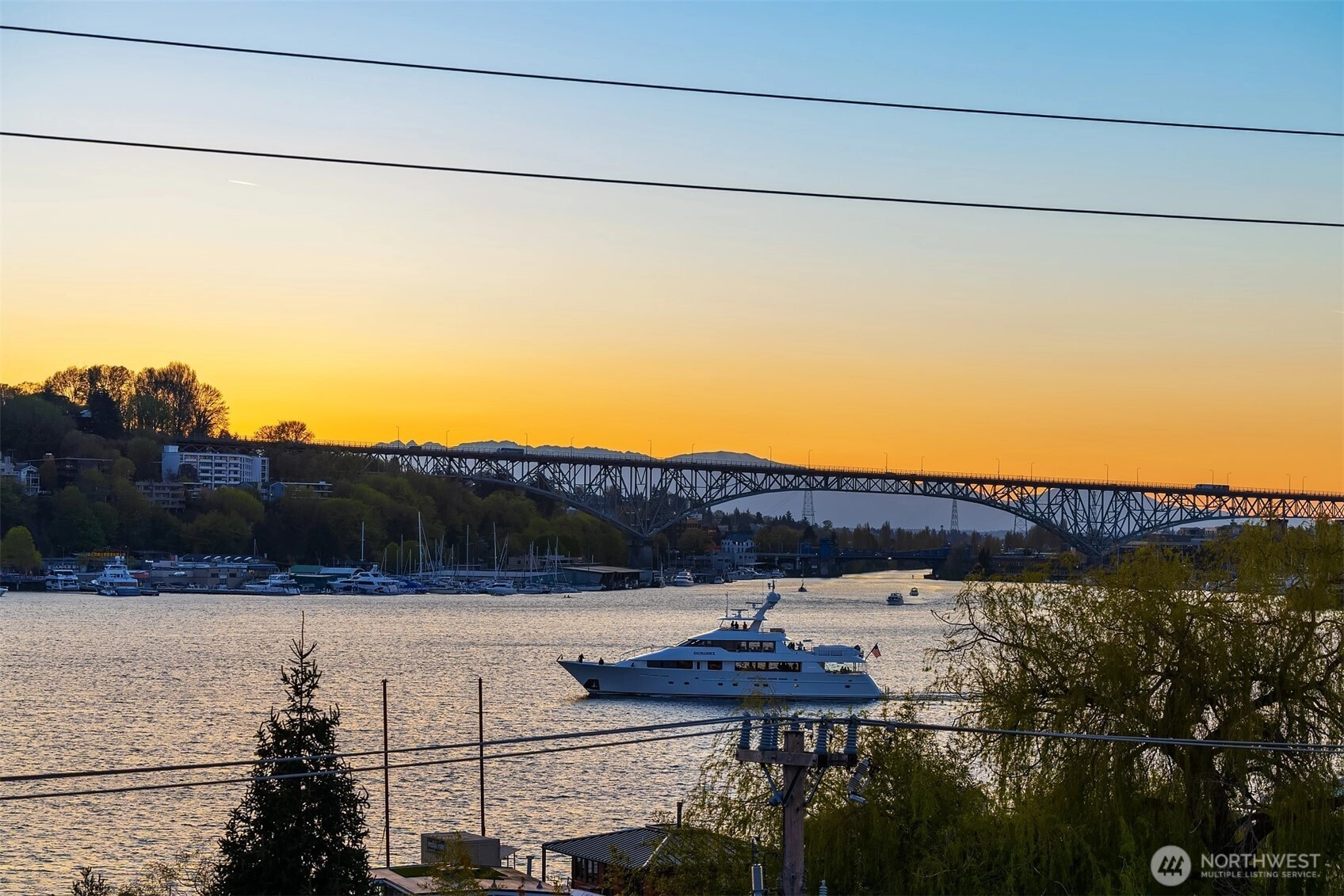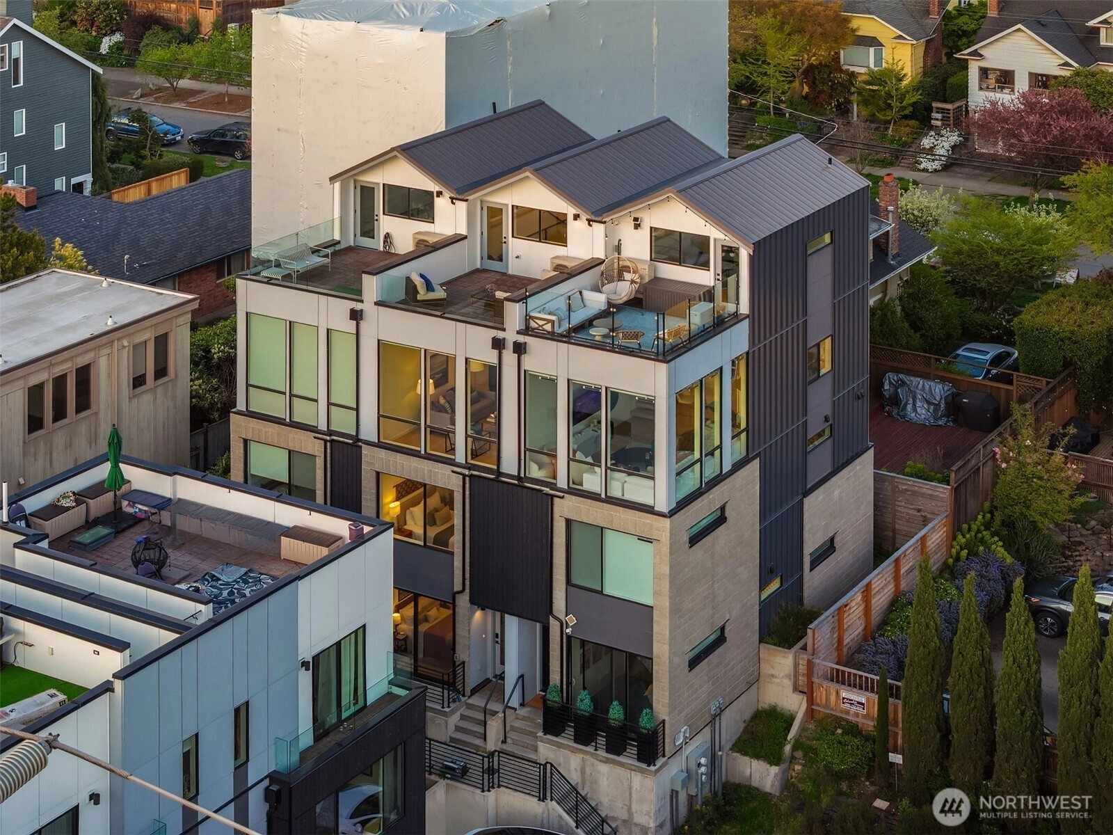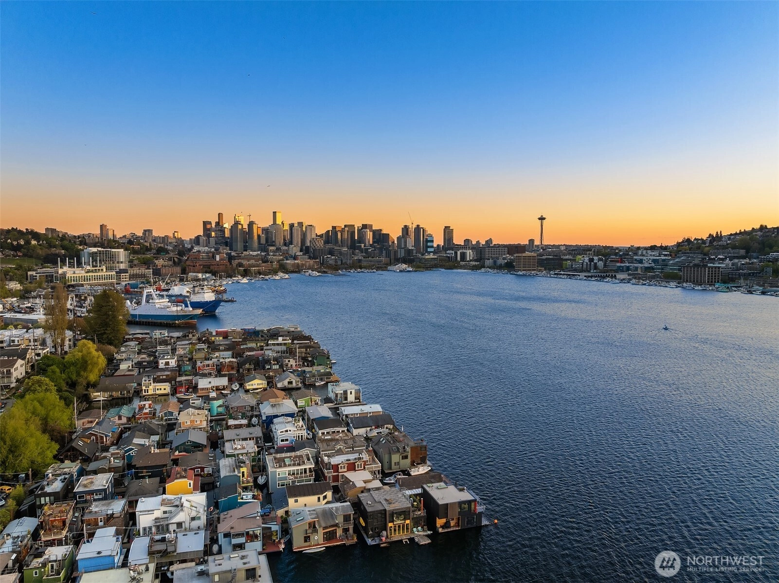 Modern Eastlake home just steps from Lake Union-- hop off your kayak and be home in seconds! Airy, light-filled home features striking design details including a floating staircase, glass railings, and double-height lofted ceilings. Enter into your lower level with two bedrooms, a full bathroom, and patio space. The second floor is your private retreat—complete with a spacious primary suite, ample closet space, laundry, and a spa-like bathroom. One deeded parking spot. On the top floor, you'll find an open-concept living space perfect for entertaining, with gas cooking, expansive windows framing views of Lake Union, and seamless flow to your rooftop deck. From Gas Works, Lake Union, to the city skyline, —the lifestyle is pure Seattle!