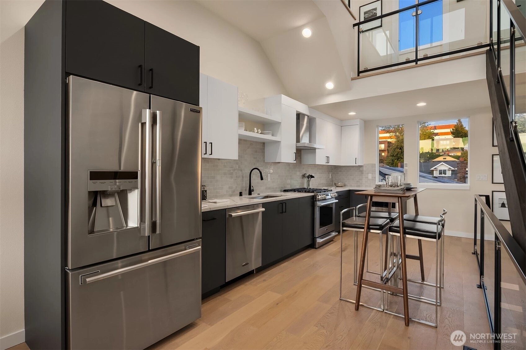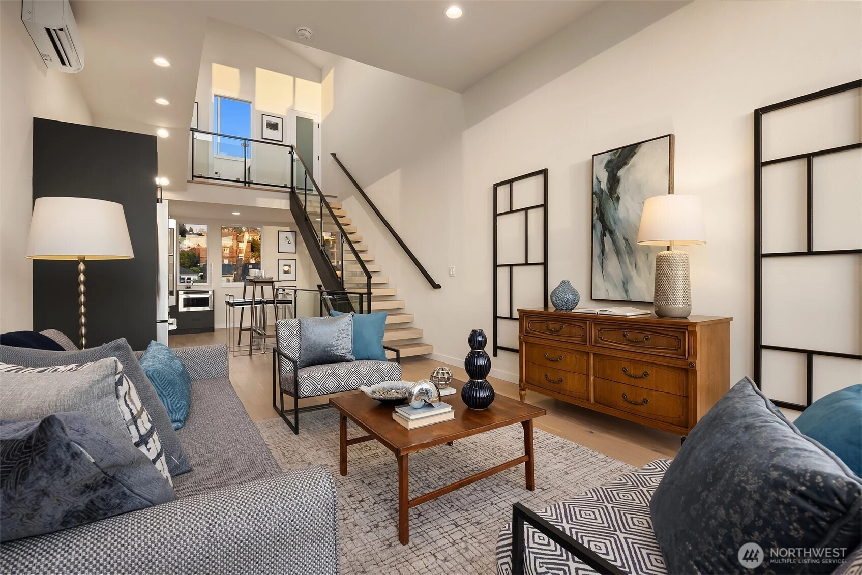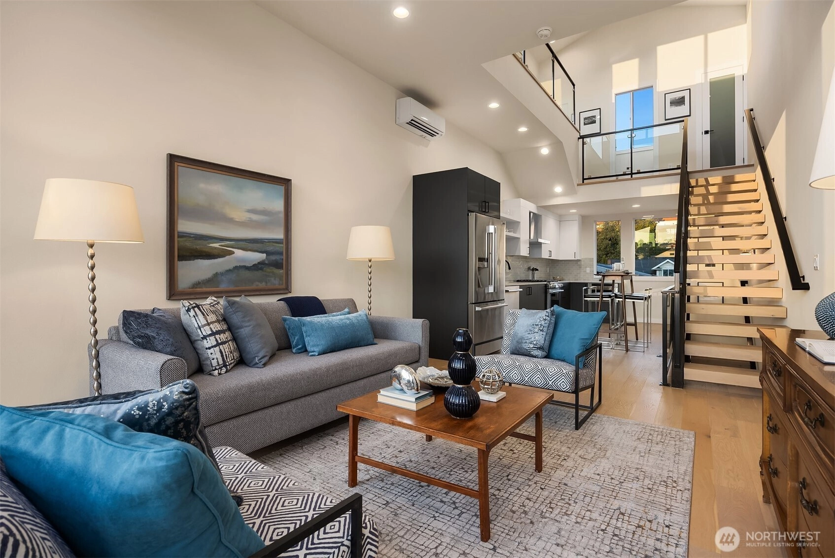 Modern Eastlake home just steps from Lake Union-- hop off your kayak and be home in seconds! Airy, light-filled home features striking design details including a floating staircase, glass railings, and double-height lofted ceilings. Enter into your lower level with two bedrooms, a full bathroom, and patio space. The second floor is your private retreat—complete with a spacious primary suite, ample closet space, laundry, and a spa-like bathroom. One deeded parking spot. On the top floor, you'll find an open-concept living space perfect for entertaining, with gas cooking, expansive windows framing views of Lake Union, and seamless flow to your rooftop deck. From Gas Works, Lake Union, to the city skyline, —the lifestyle is pure Seattle!