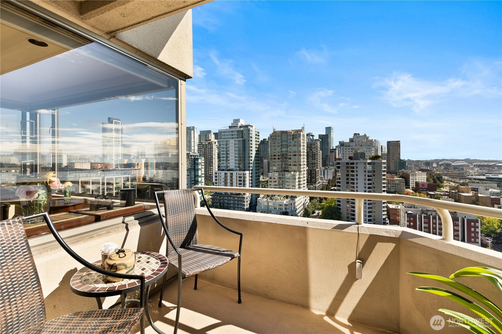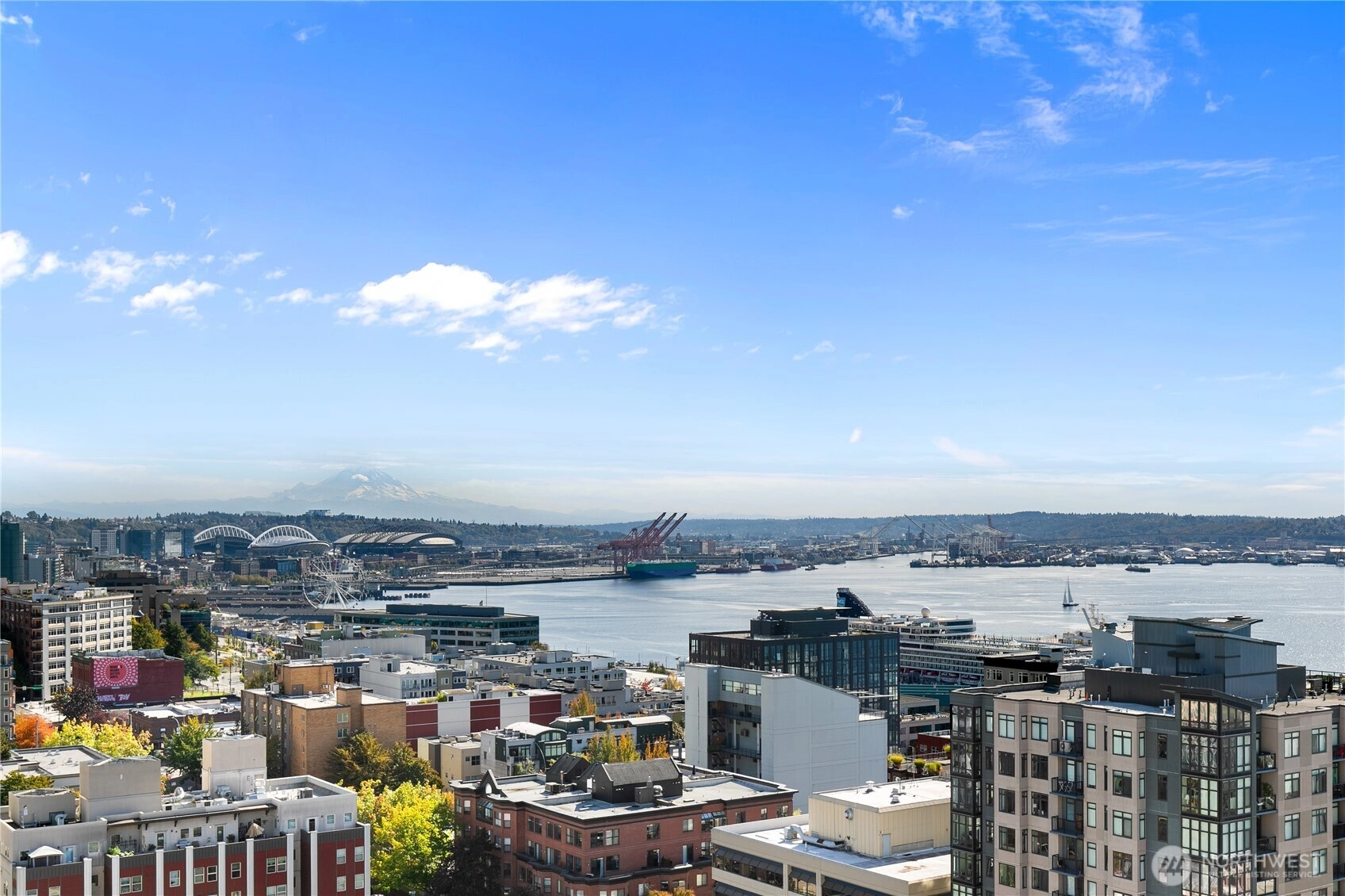 MORTGAGE SAVINGS MAY BE AVAILABLE FOR BUYERS OF THIS LISTING! Sweeping views of downtown, Space Needle, Elliott Bay, Mt. Rainier & the Waterfront from this 15th-floor corner unit. HOA covers: water, sewer, garbage, gas, Comcast TV, central A/C, 7/24 concierge, gym, sauna, hot tub, reservable Club Room, business center & an expansive rooftop deck. Premium, worry-free living. Two Bed/2 bath condo is flooded w/ natural light from walls of windows & private balcony. Updated baths and kitchen w/SS appliances, 9ft ceilings, motorized blinds, built in credenza in dining area, entertainment center in the living room & a large 2nd bedroom. Secured DEEDED parking spot & FREE guest parking, evenings & weekends. Walkscore® of 97.