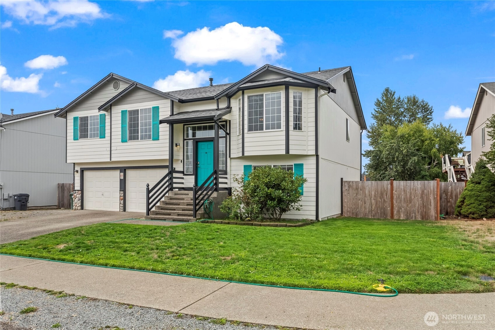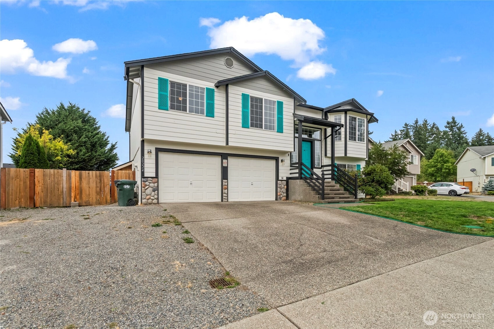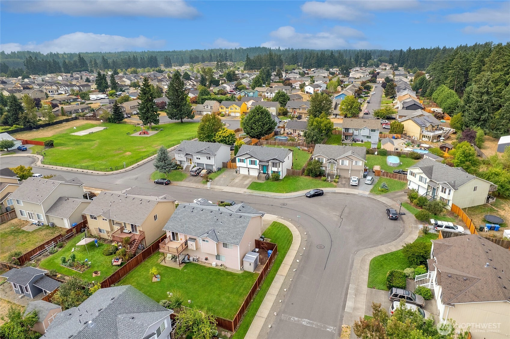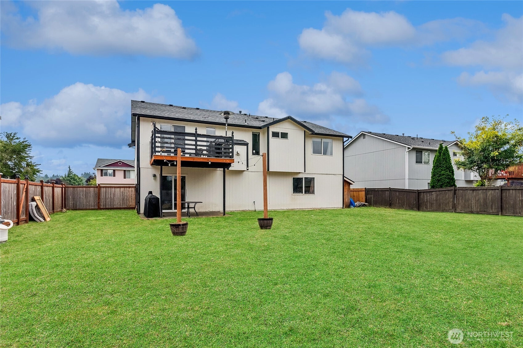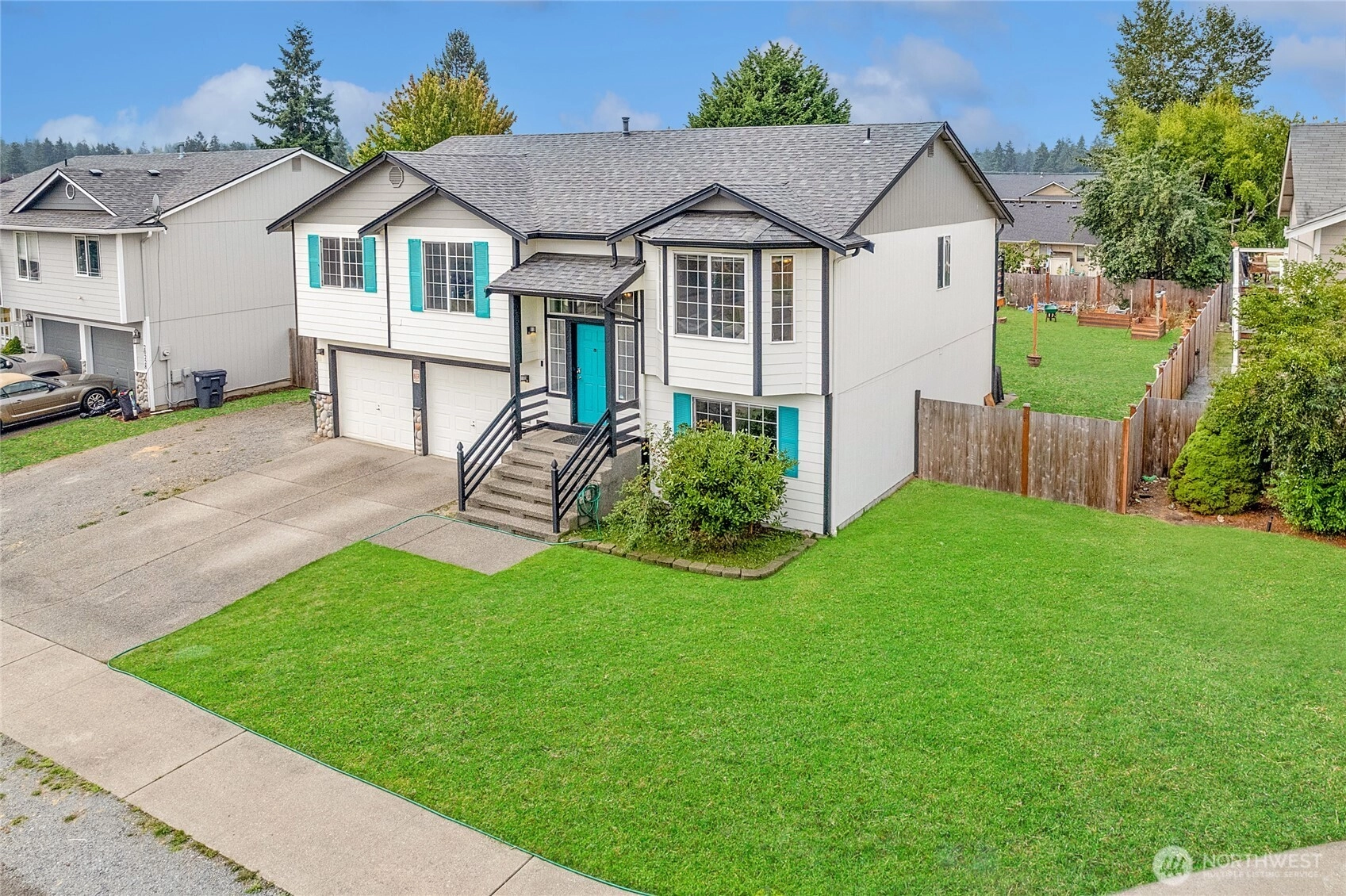 This spacious 5-bedroom, 3-bath home sits on a large, fully fenced quarter-acre lot—perfect for entertaining, relaxing, or gardening. The open layout features vaulted ceilings, a gas fireplace, and both formal and casual dining areas. The kitchen flows seamlessly into the main living space, making it easy to host or unwind. Upstairs, the primary suite includes a tile-surround soaking tub and separate shower. Downstairs offers a full bath and a second living area—ideal as a lounge, game room, or hangout space—that opens directly to the private backyard. Located next to a wide open field with a sport court and playground, and just minutes from South Hill or Graham shopping and dining, with easy access to major arterials.