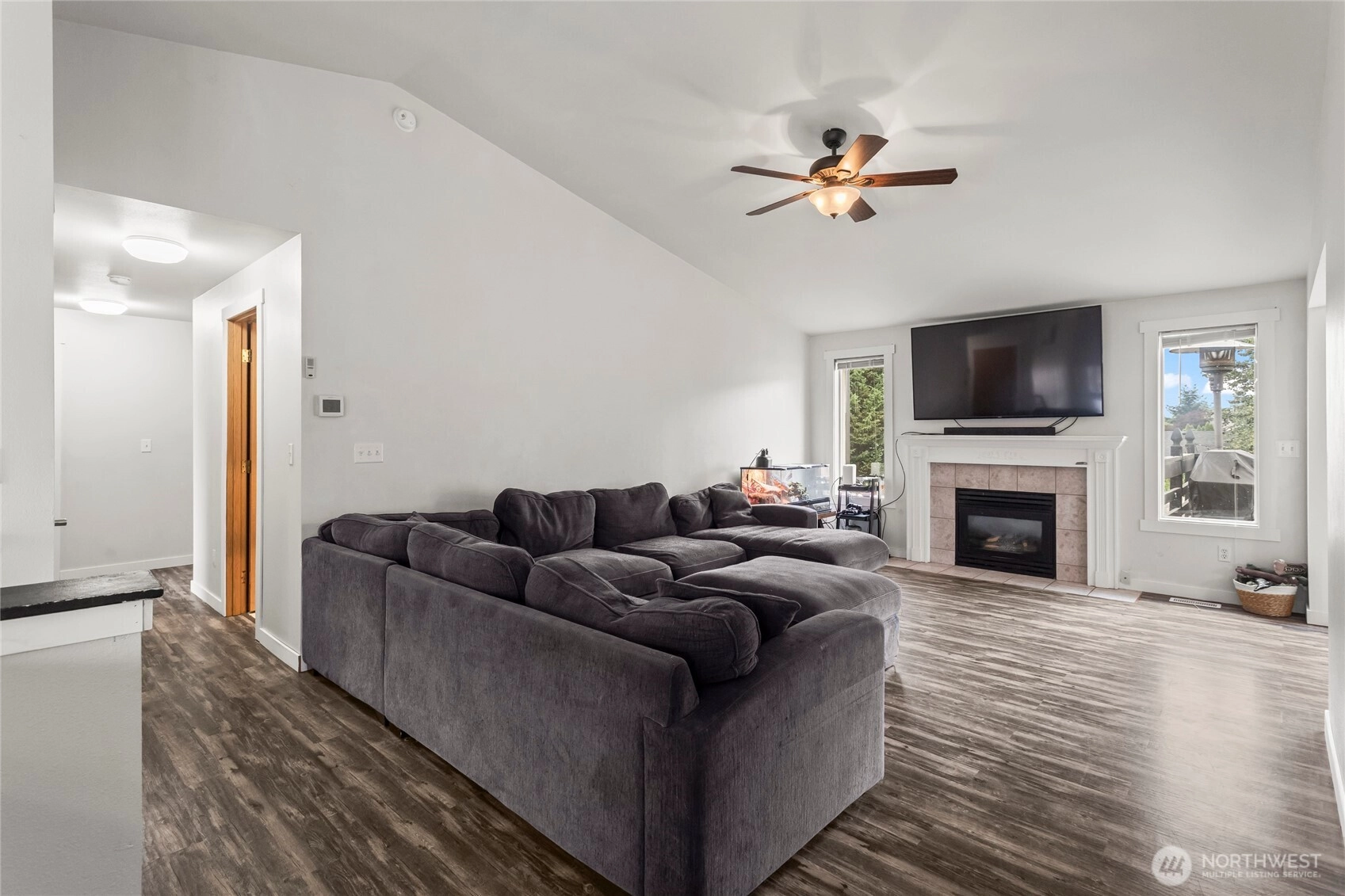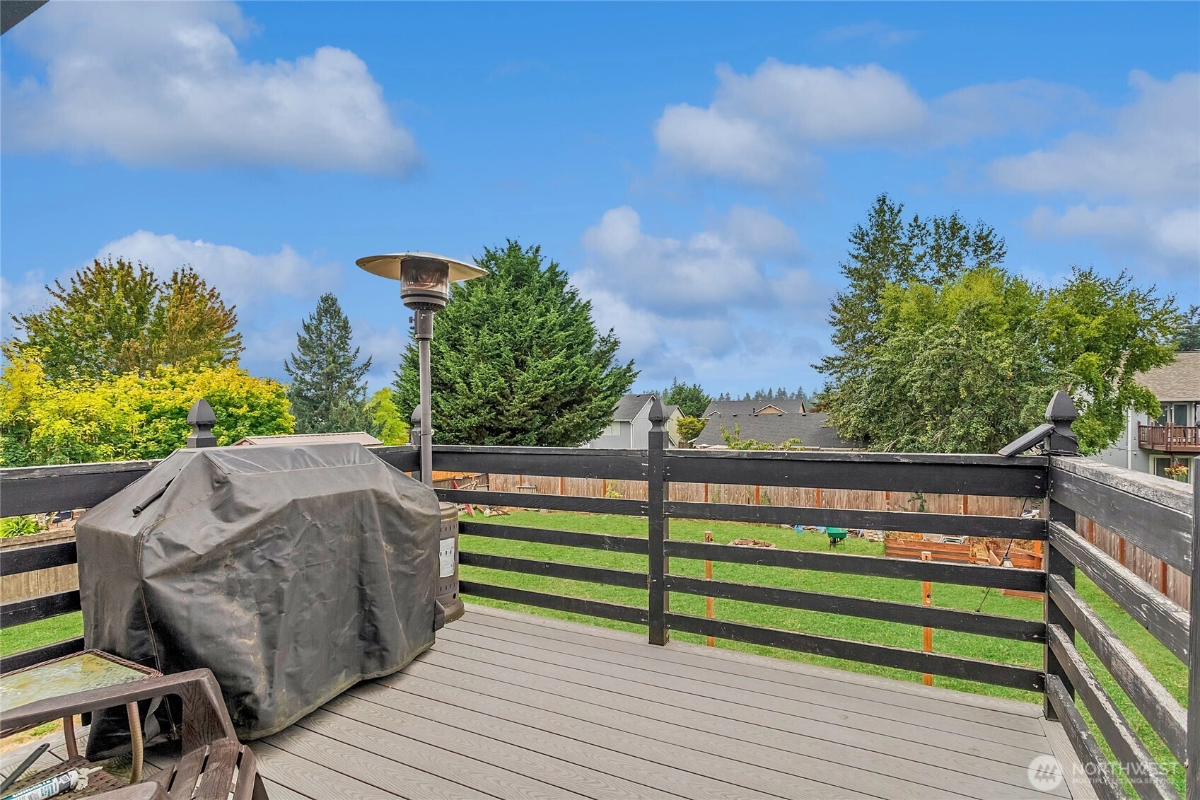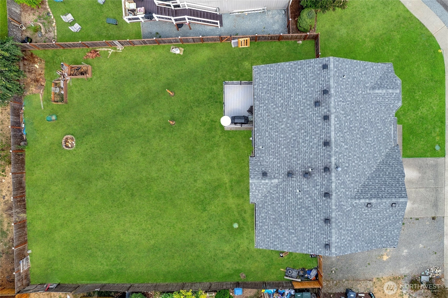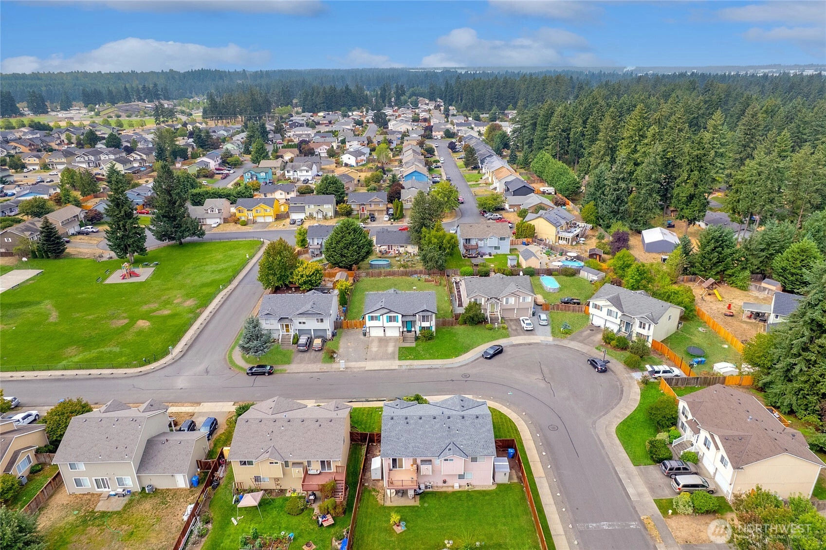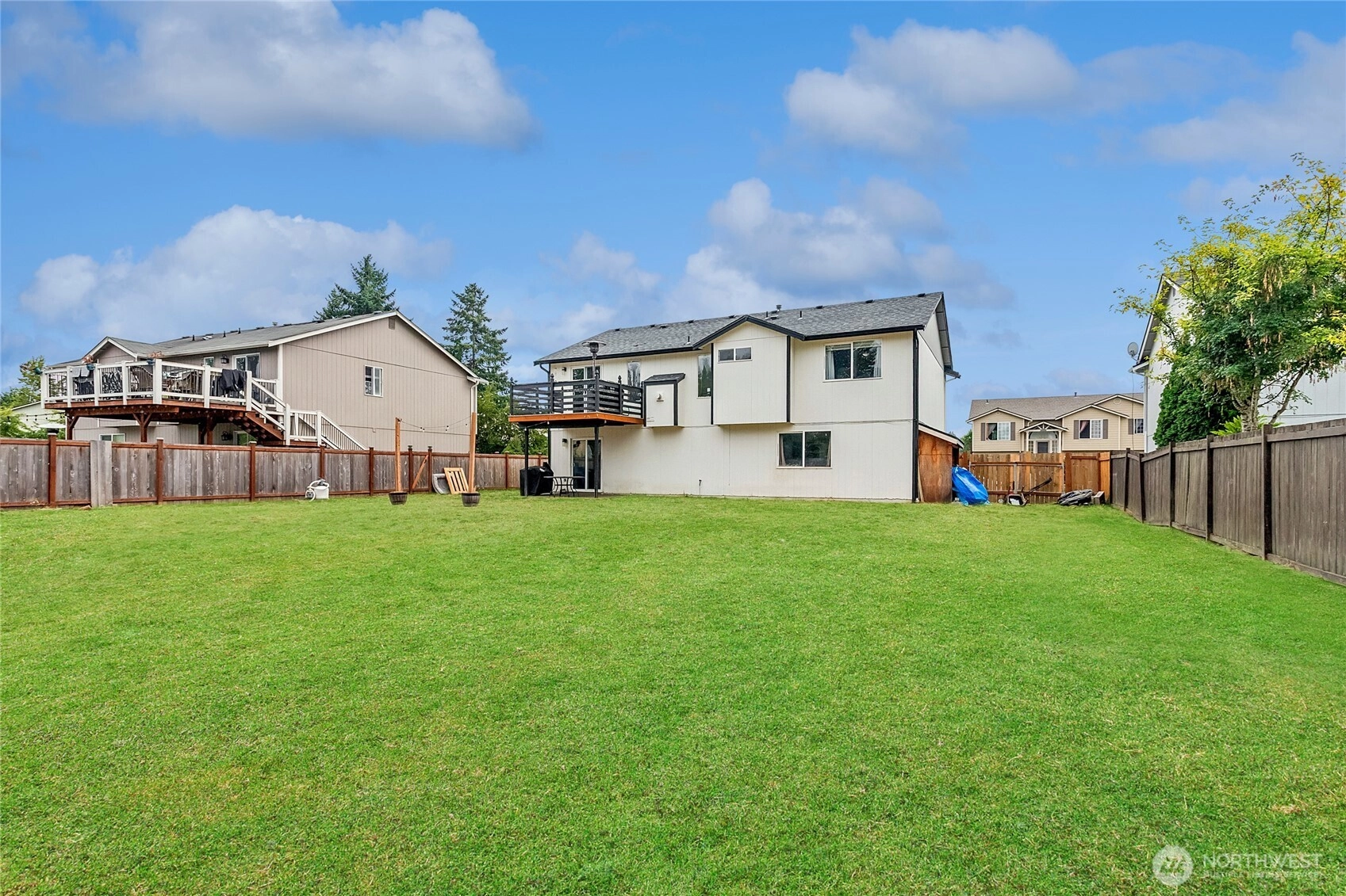 This spacious 5-bedroom, 3-bath home sits on a large, fully fenced quarter-acre lot—perfect for entertaining, relaxing, or gardening. The open layout features vaulted ceilings, a gas fireplace, and both formal and casual dining areas. The kitchen flows seamlessly into the main living space, making it easy to host or unwind. Upstairs, the primary suite includes a tile-surround soaking tub and separate shower. Downstairs offers a full bath and a second living area—ideal as a lounge, game room, or hangout space—that opens directly to the private backyard. Located next to a wide open field with a sport court and playground, and just minutes from South Hill or Graham shopping and dining, with easy access to major arterials.