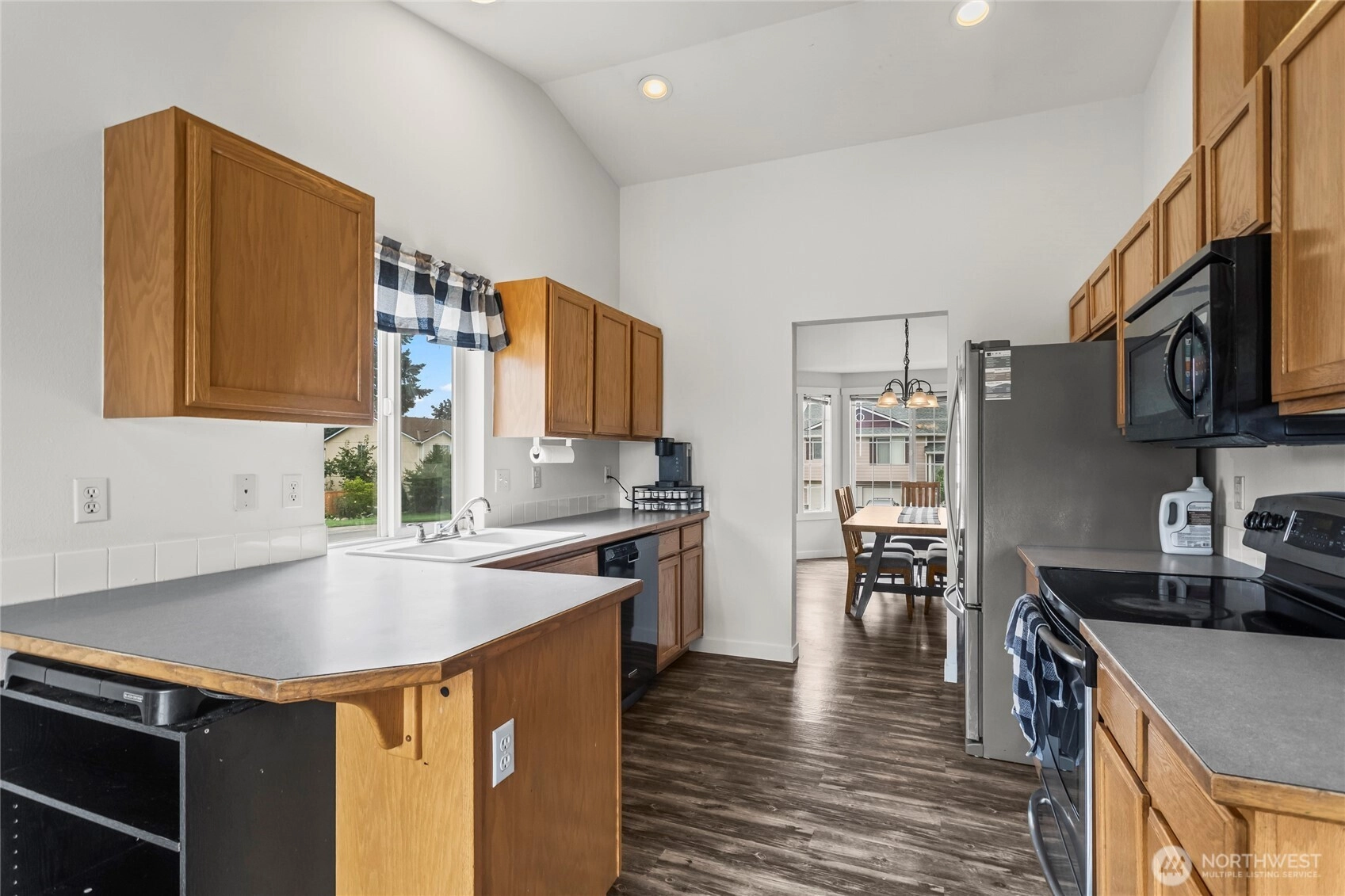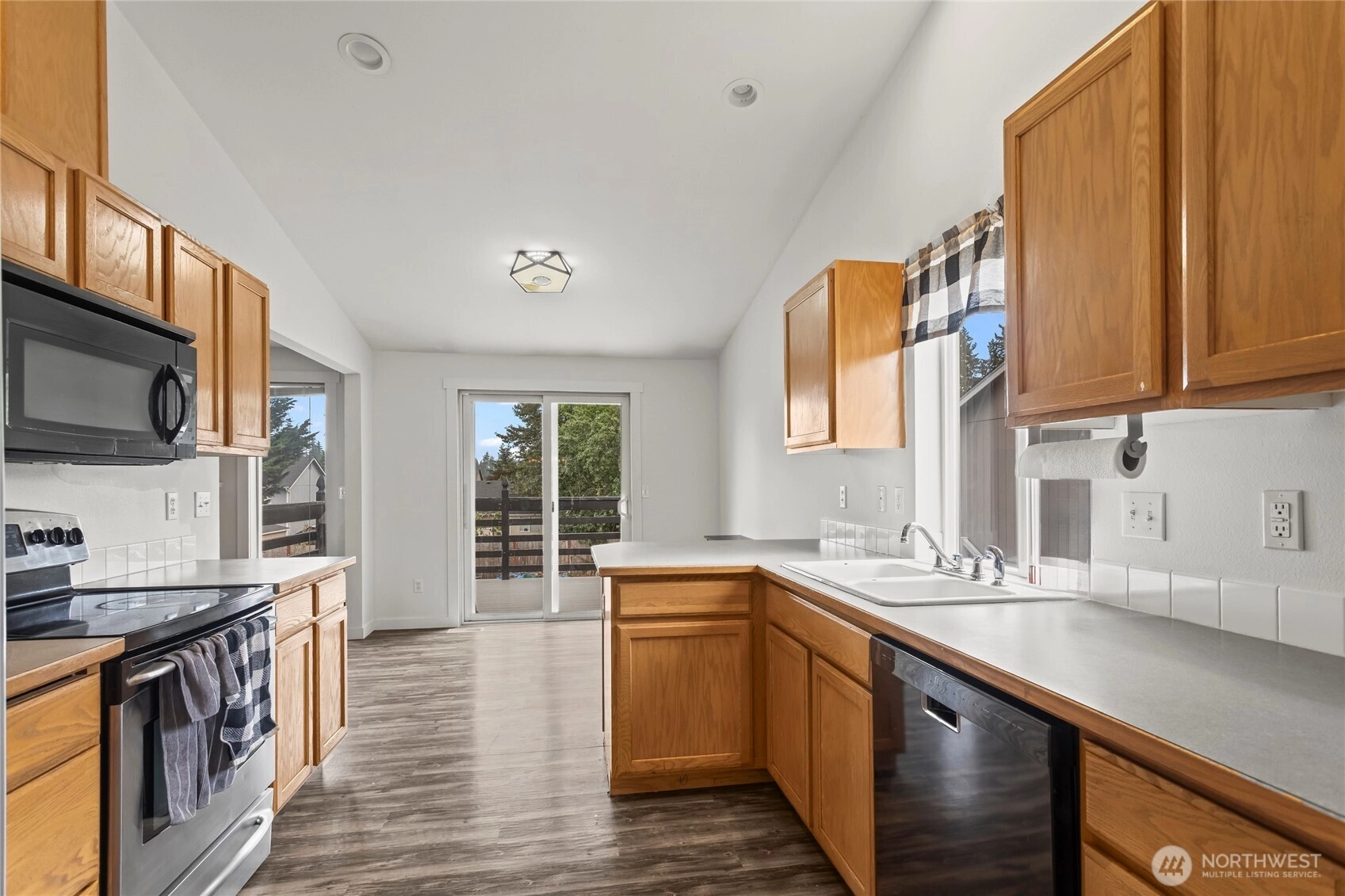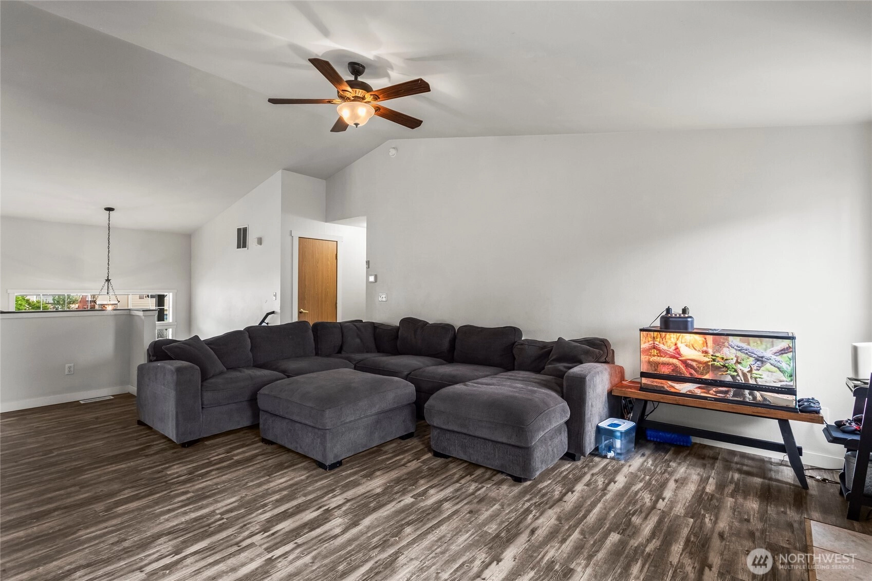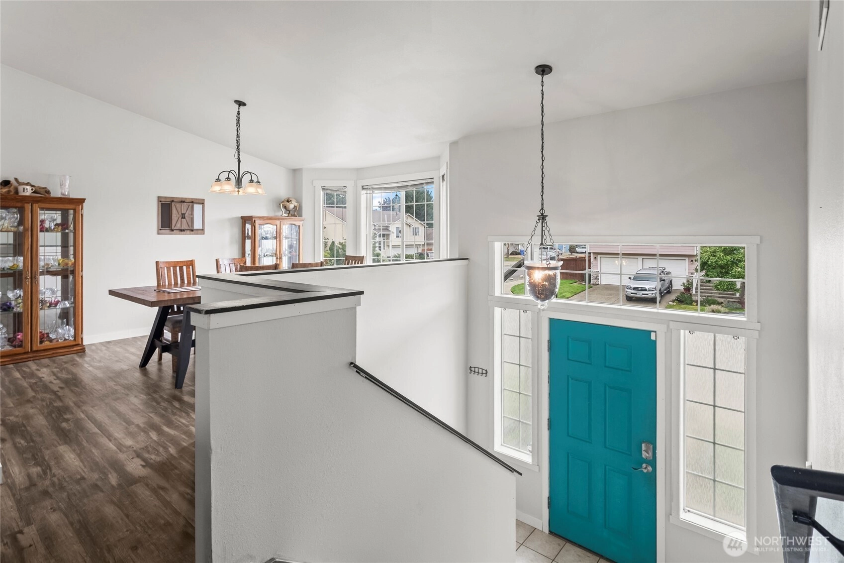 This spacious 5-bedroom, 3-bath home sits on a large, fully fenced quarter-acre lot—perfect for entertaining, relaxing, or gardening. The open layout features vaulted ceilings, a gas fireplace, and both formal and casual dining areas. The kitchen flows seamlessly into the main living space, making it easy to host or unwind. Upstairs, the primary suite includes a tile-surround soaking tub and separate shower. Downstairs offers a full bath and a second living area—ideal as a lounge, game room, or hangout space—that opens directly to the private backyard. Located next to a wide open field with a sport court and playground, and just minutes from South Hill or Graham shopping and dining, with easy access to major arterials.