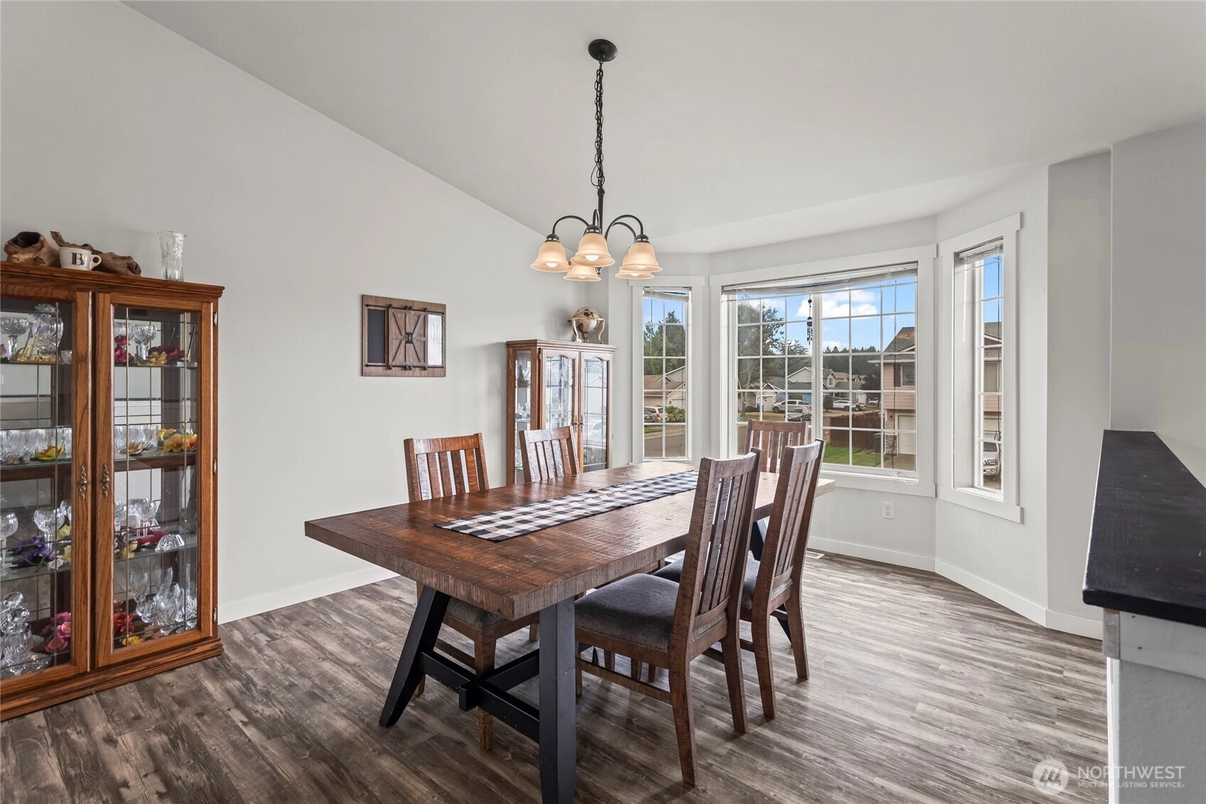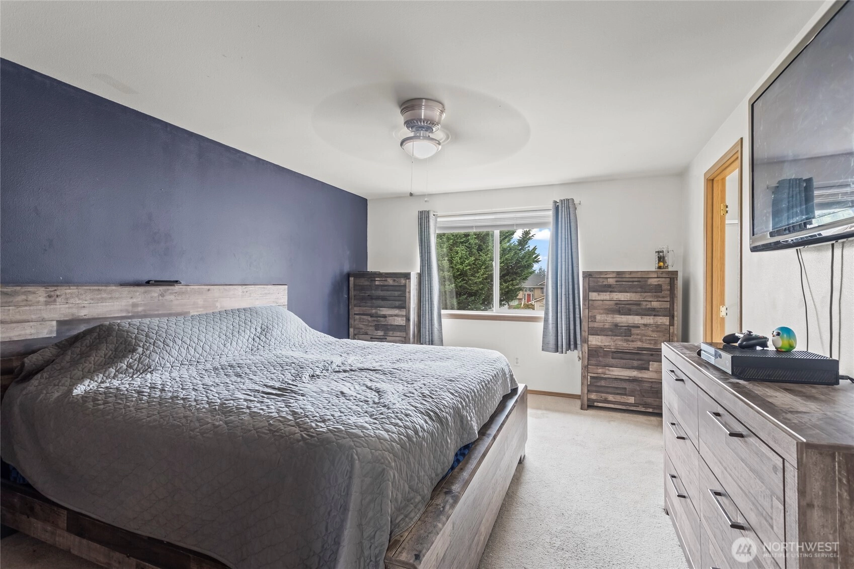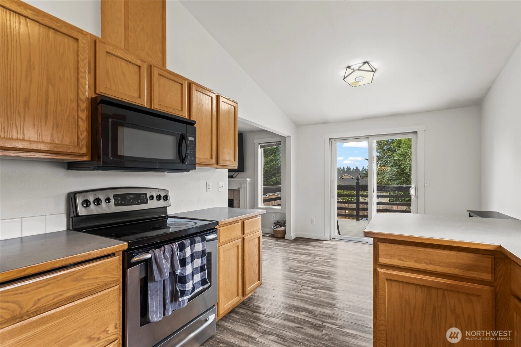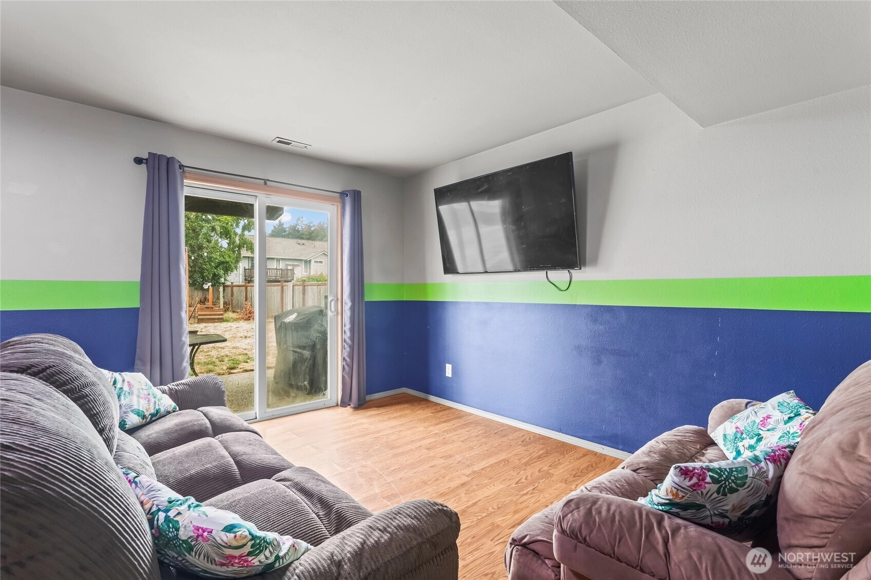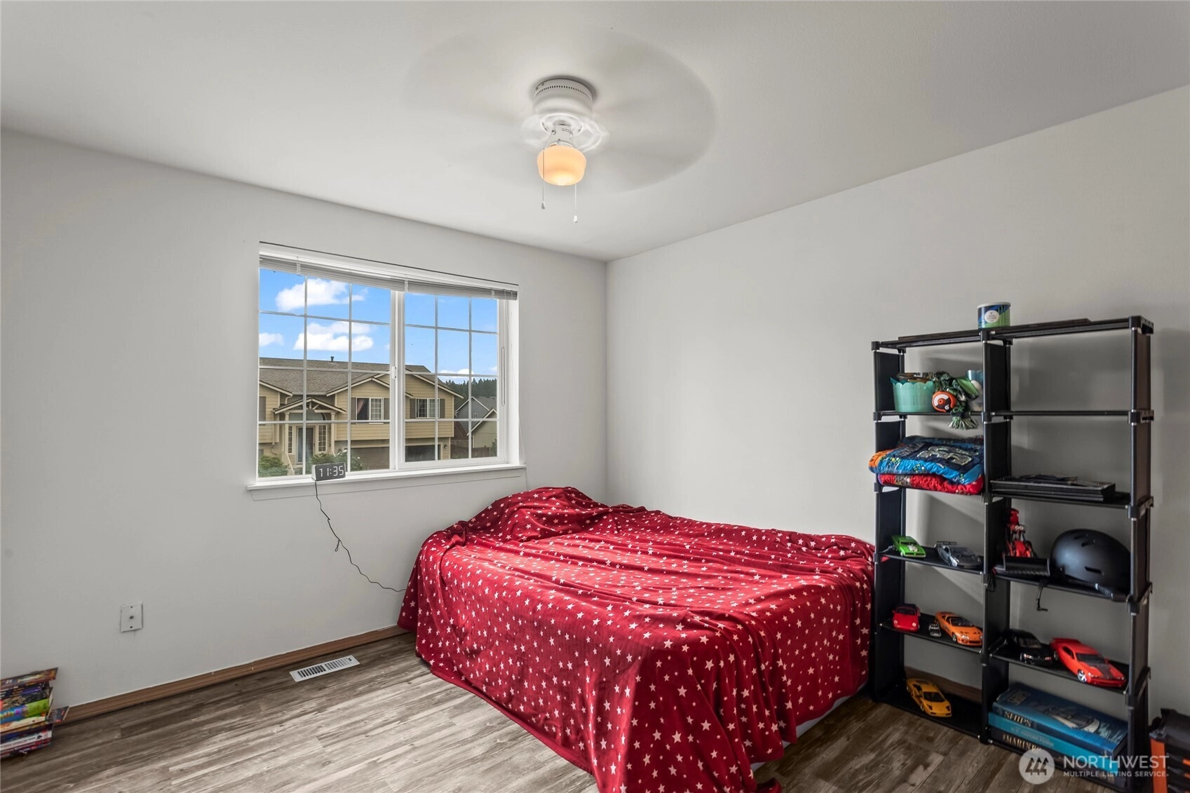 This spacious 5-bedroom, 3-bath home sits on a large, fully fenced quarter-acre lot—perfect for entertaining, relaxing, or gardening. The open layout features vaulted ceilings, a gas fireplace, and both formal and casual dining areas. The kitchen flows seamlessly into the main living space, making it easy to host or unwind. Upstairs, the primary suite includes a tile-surround soaking tub and separate shower. Downstairs offers a full bath and a second living area—ideal as a lounge, game room, or hangout space—that opens directly to the private backyard. Located next to a wide open field with a sport court and playground, and just minutes from South Hill or Graham shopping and dining, with easy access to major arterials.
