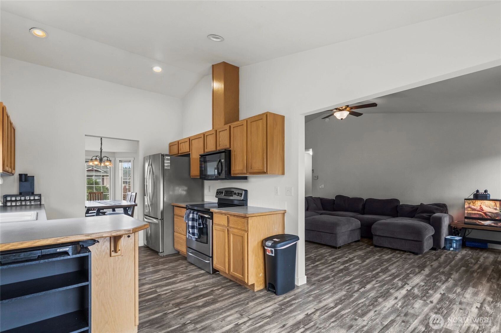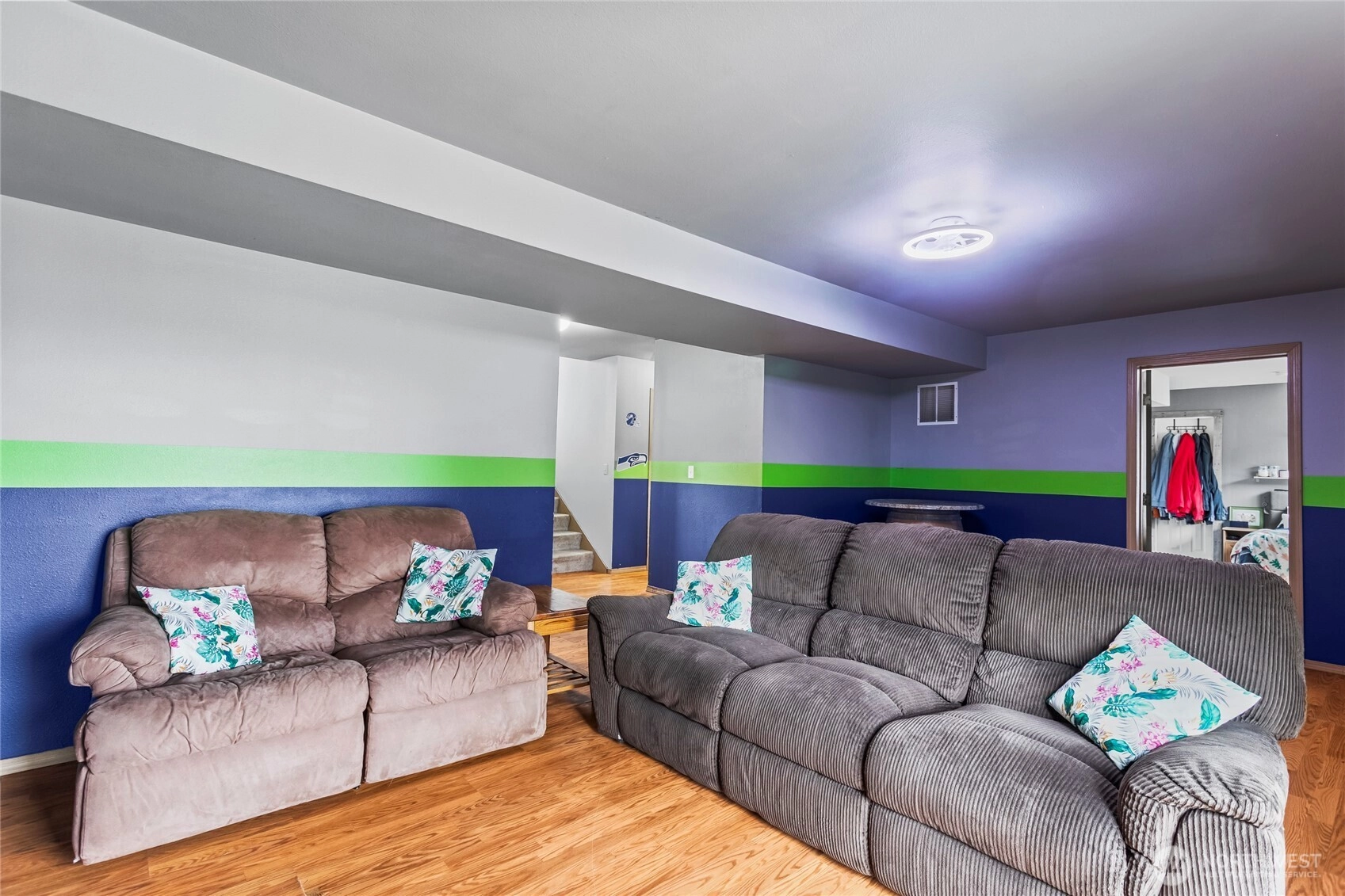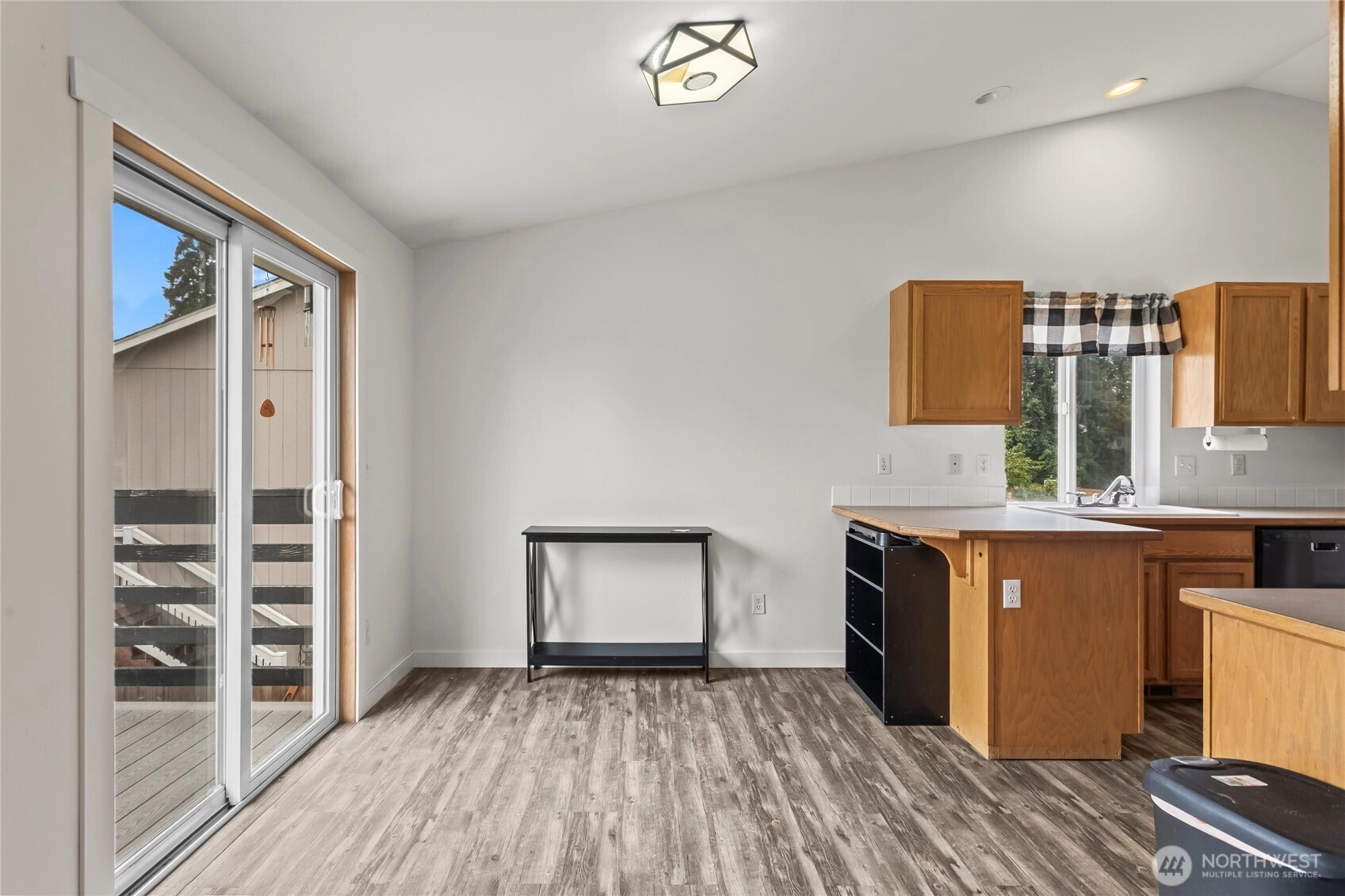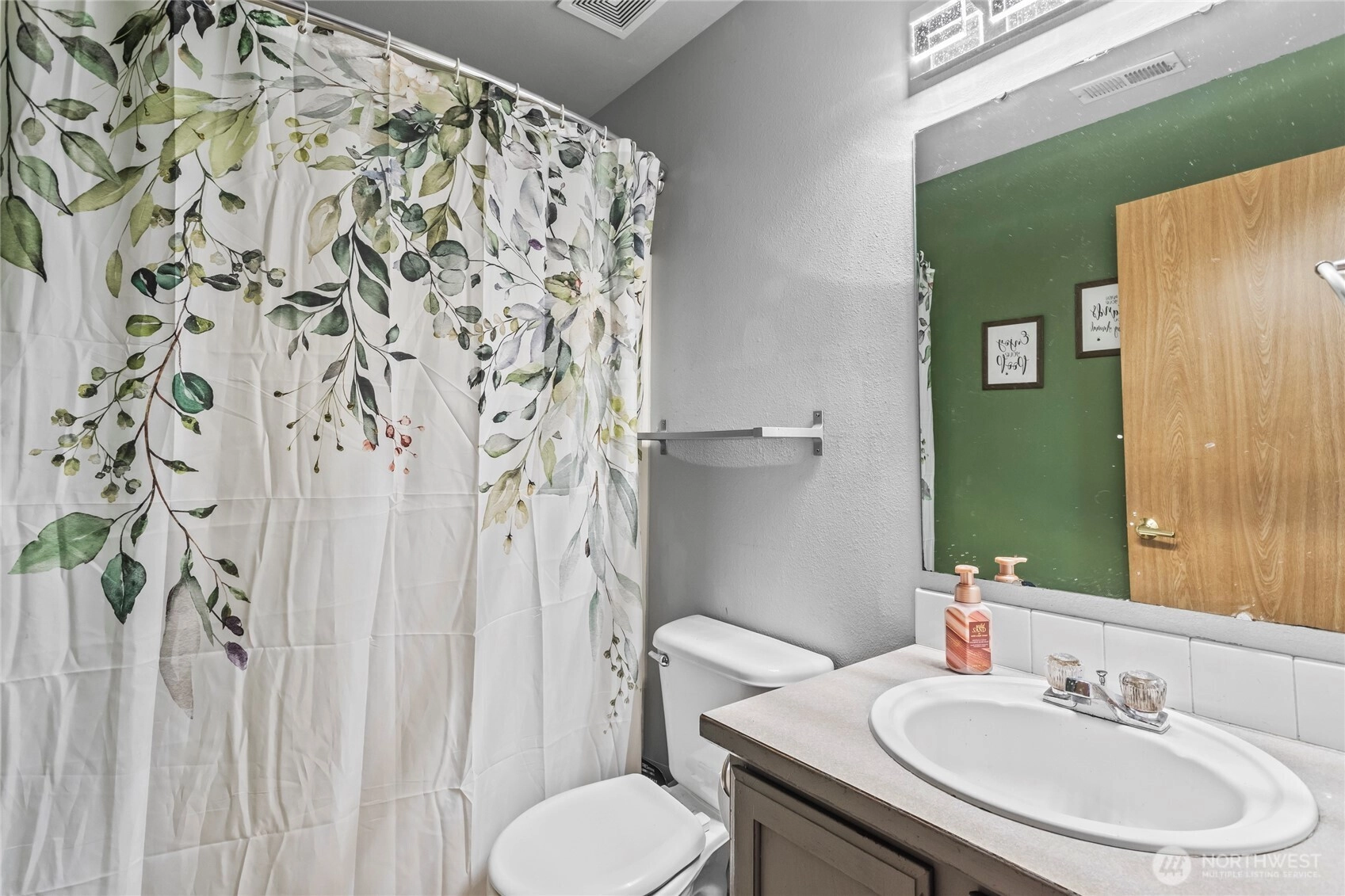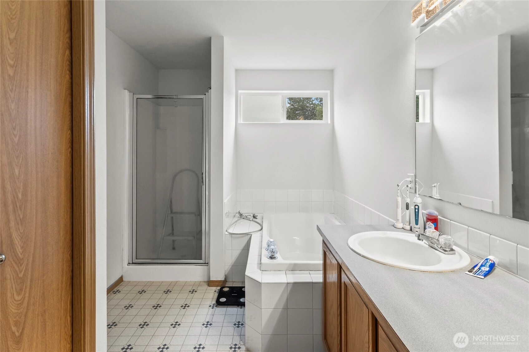 This spacious 5-bedroom, 3-bath home sits on a large, fully fenced quarter-acre lot—perfect for entertaining, relaxing, or gardening. The open layout features vaulted ceilings, a gas fireplace, and both formal and casual dining areas. The kitchen flows seamlessly into the main living space, making it easy to host or unwind. Upstairs, the primary suite includes a tile-surround soaking tub and separate shower. Downstairs offers a full bath and a second living area—ideal as a lounge, game room, or hangout space—that opens directly to the private backyard. Located next to a wide open field with a sport court and playground, and just minutes from South Hill or Graham shopping and dining, with easy access to major arterials.