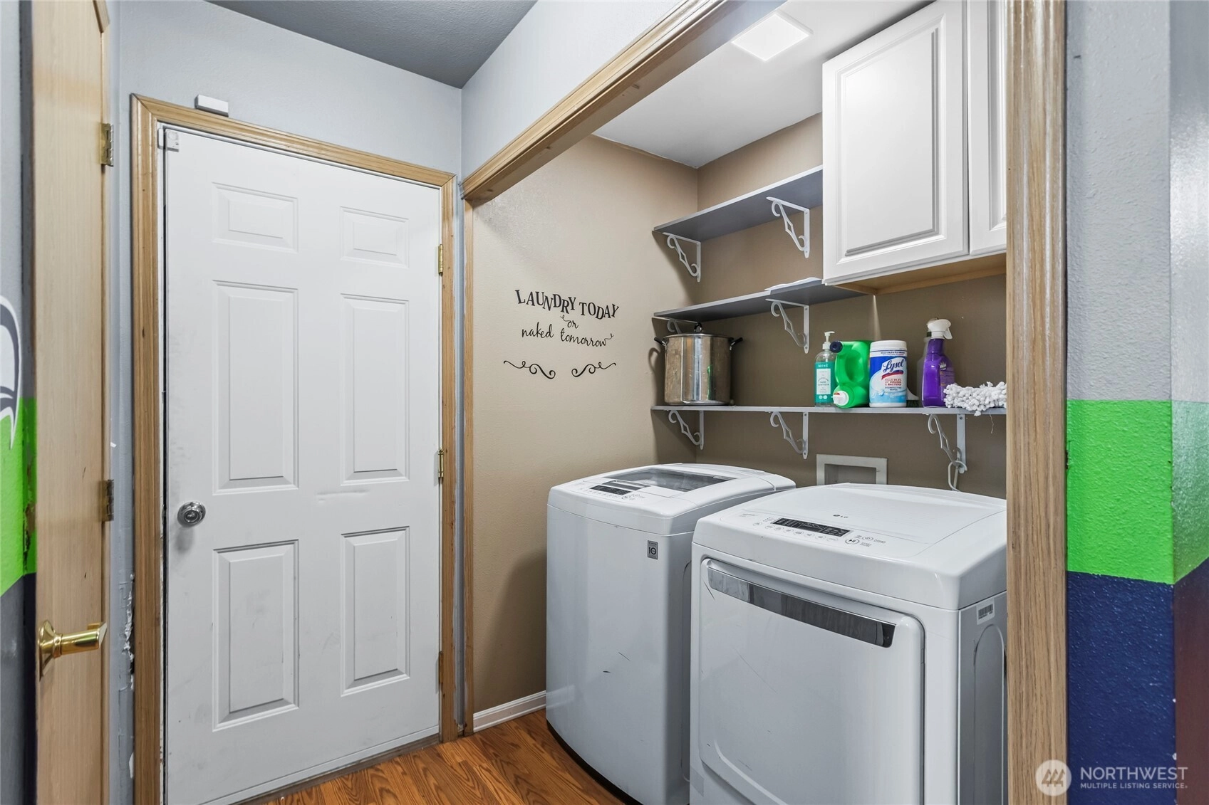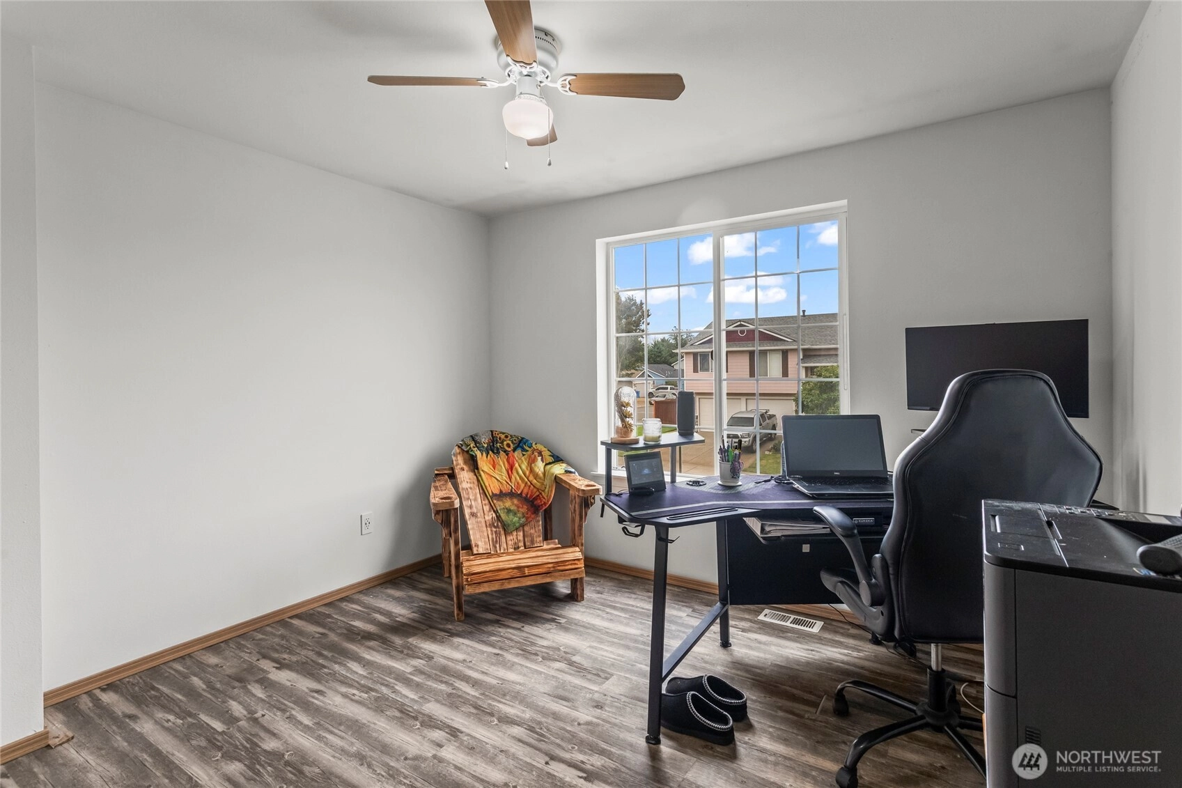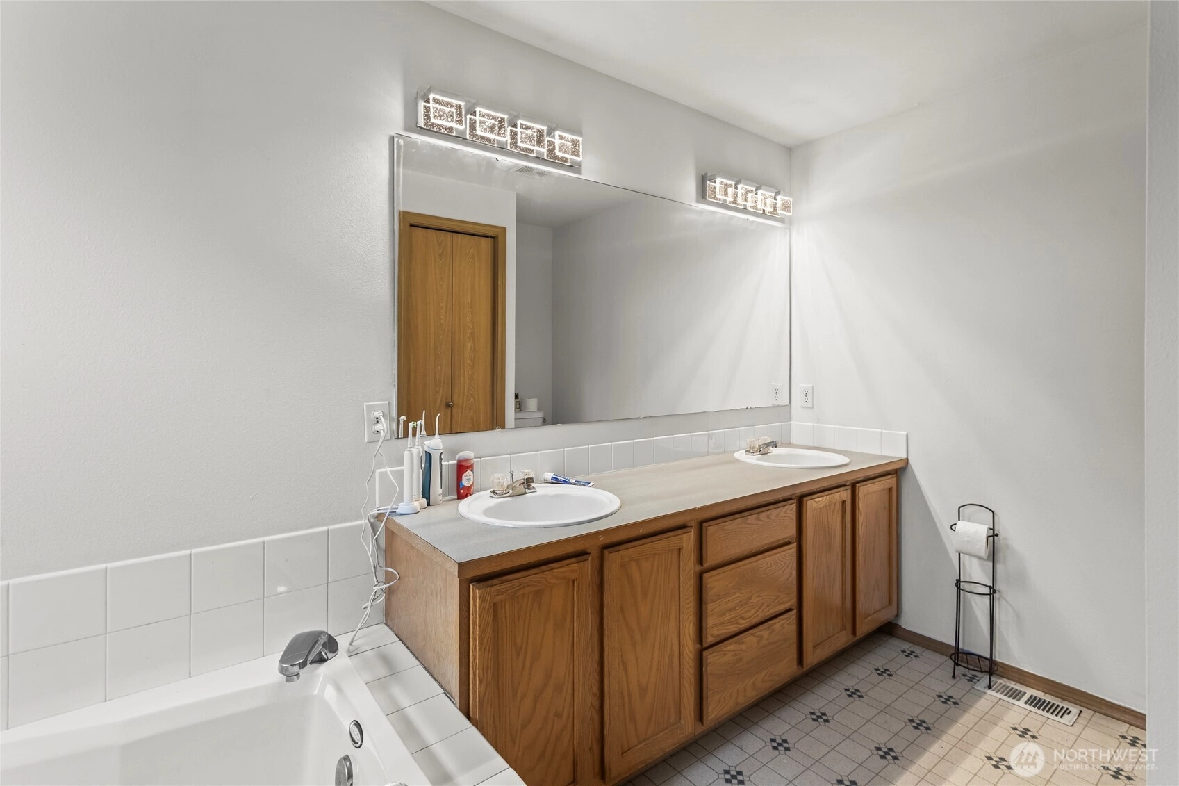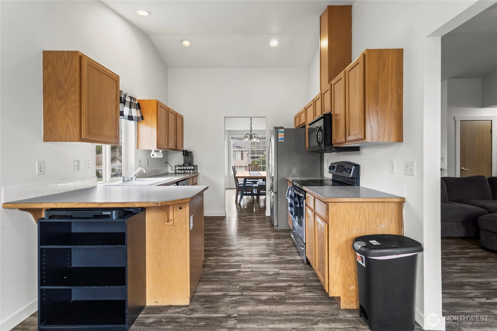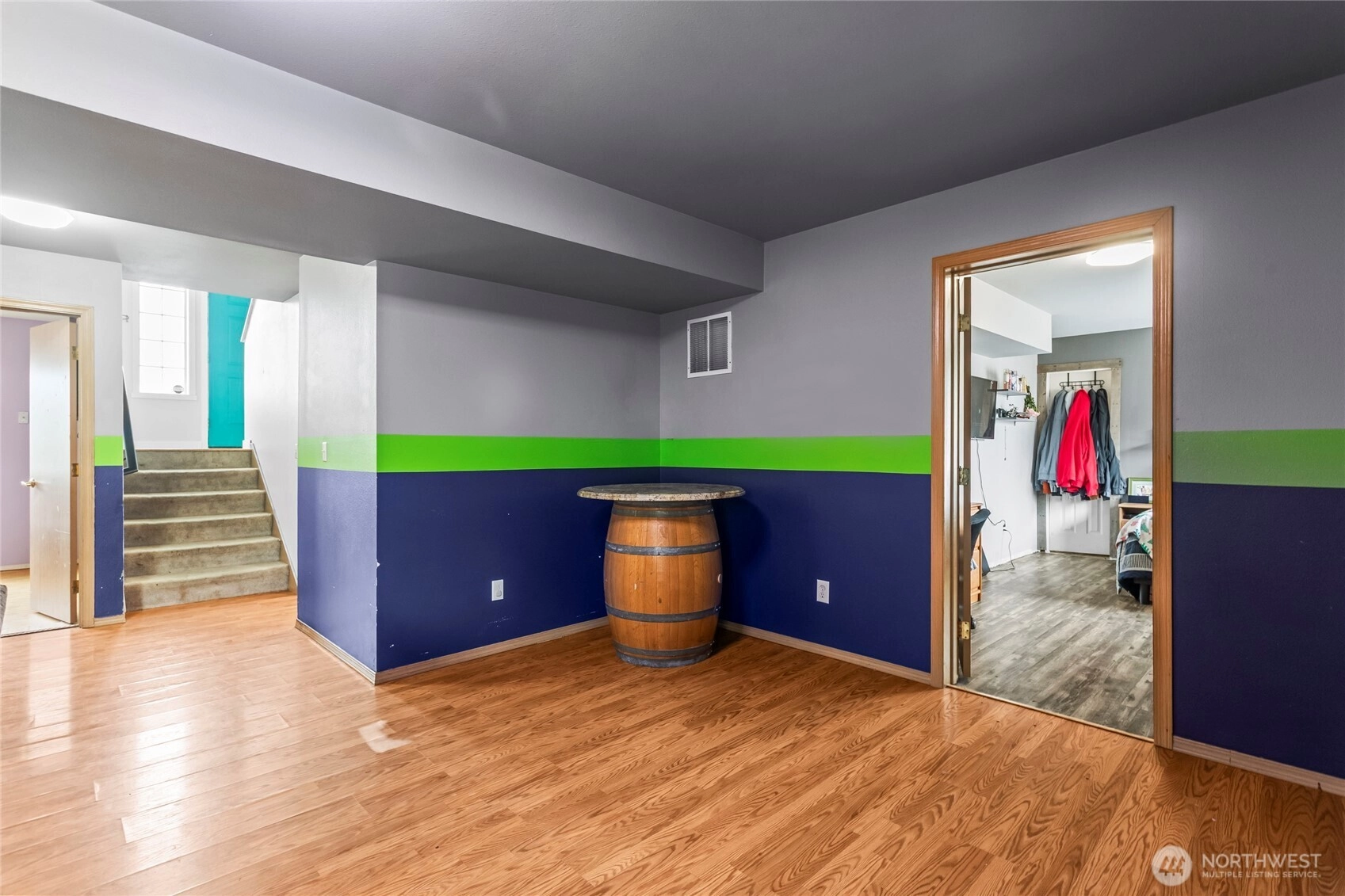 This spacious 5-bedroom, 3-bath home sits on a large, fully fenced quarter-acre lot—perfect for entertaining, relaxing, or gardening. The open layout features vaulted ceilings, a gas fireplace, and both formal and casual dining areas. The kitchen flows seamlessly into the main living space, making it easy to host or unwind. Upstairs, the primary suite includes a tile-surround soaking tub and separate shower. Downstairs offers a full bath and a second living area—ideal as a lounge, game room, or hangout space—that opens directly to the private backyard. Located next to a wide open field with a sport court and playground, and just minutes from South Hill or Graham shopping and dining, with easy access to major arterials.