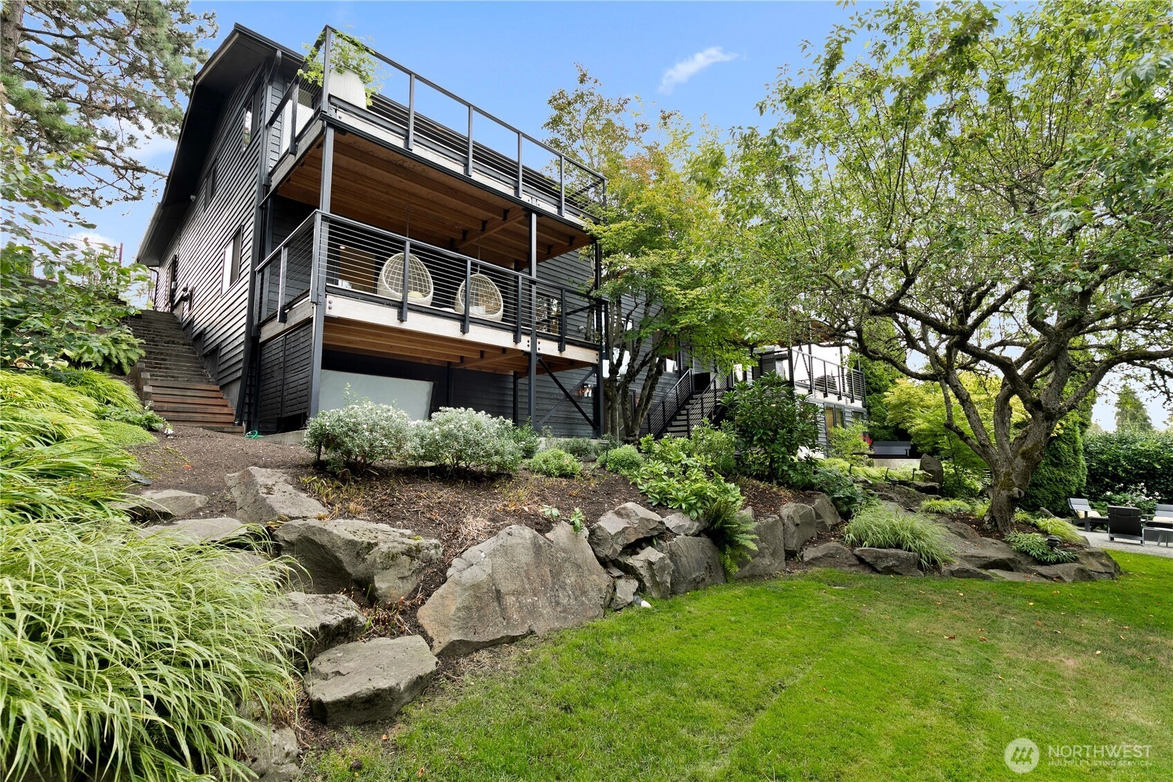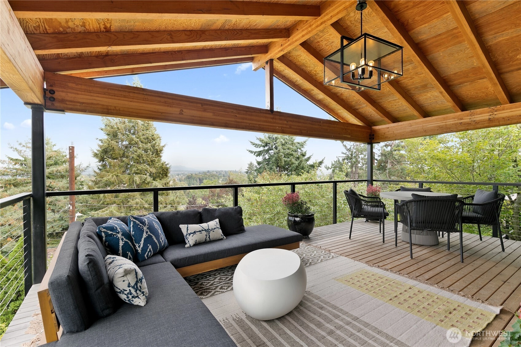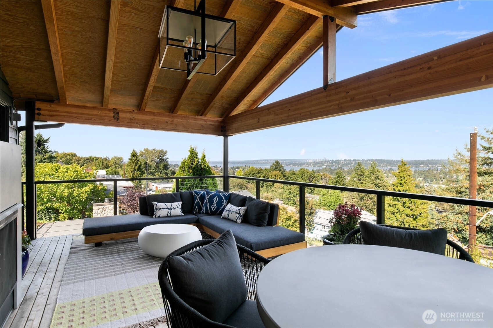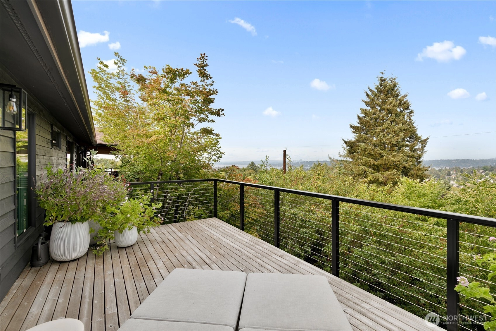 An architectural showpiece w/breathtaking Lake WA, Bellevue & Cascade views, this home was reimagined from the studs up in 2020. Light-filled interiors feature an open layout, oak floors, floating steel staircase, bespoke finishes, & high-end appliances (Sub-Zero, Wolf, Viking, Bosch). The primary suite offers a spa-inspired 5-pc ba & California closet. Enjoy effortless indoor-outdoor living w/5 steel-framed decks—4 covered—plus a private hottub. The fully fenced double lot boasts lush landscaping, raised garden beds & a greenhouse. Add’l highlights include a heated storage/flex rm, gym/studio, 2-car garage & generous off-street parking at the end of a quiet dead-end street—just 15 min to dwntn Seattle & close to light rail, parks & dining.