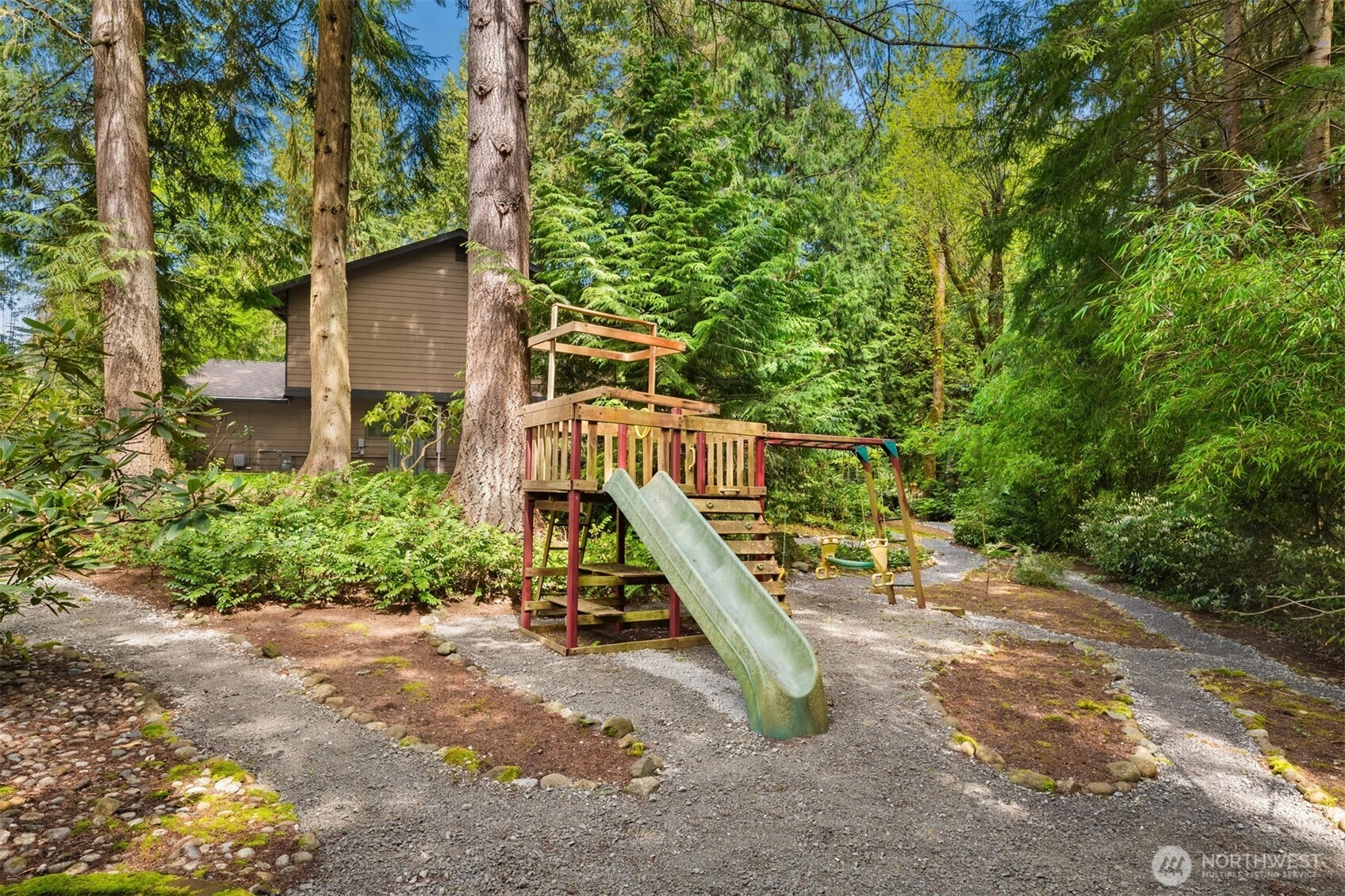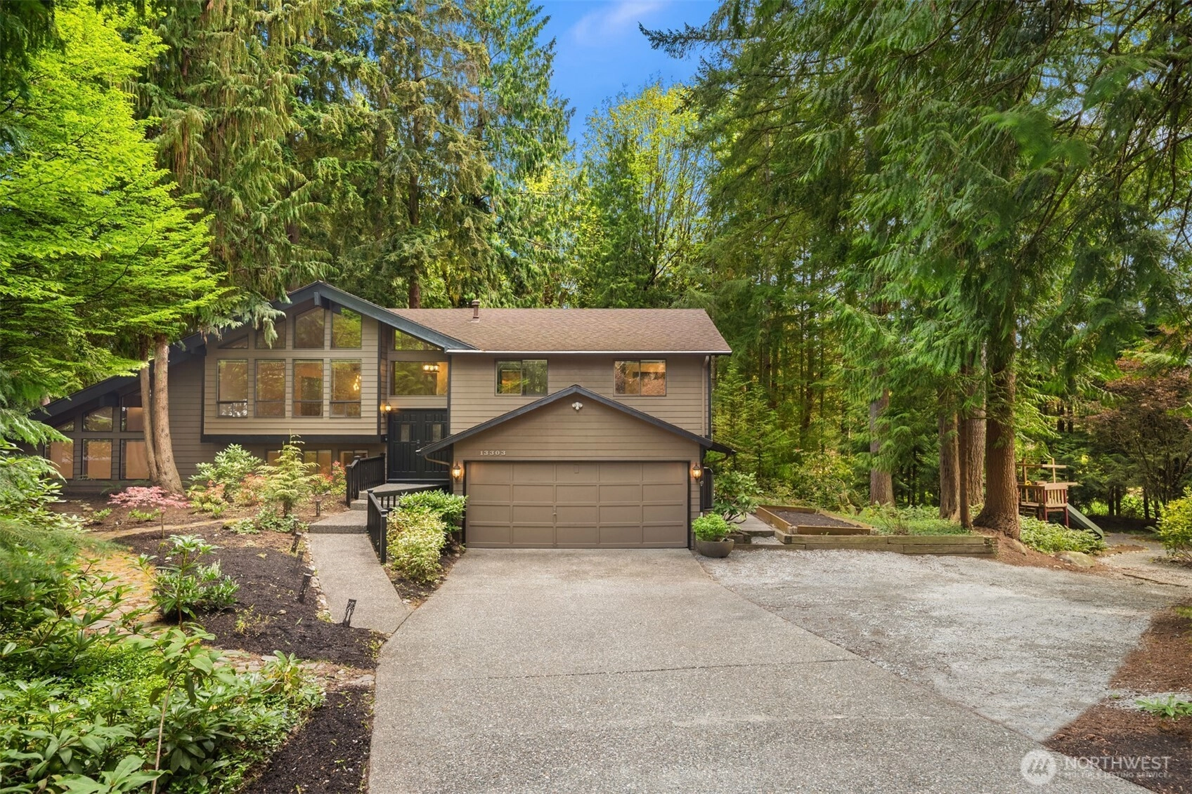 Whimsically tucked-away on 1/2 acre wooded wonderland in Wingate, this secluded 2,556sf 4 bed 3 bath architectural stunner is a rare & special find! Soaring windows & open beam vaulted ceilings throughout. Grand foyer with slate tile & open rail staircase. Spacious top floor living room with hardwoods opens to formal dining, kitchen with quartz counters & dramatic open rail balcony overlooking expansive 23x23 family room addition with skylights, gas fireplace & mezzanine loft. Primary suite with upgraded bath. Bonus room with office/flex space. An outdoor living oasis backed to a scenic greenbelt with sprawling patios, meandering trails, raised gardens, playground, RV/boat parking & upper level entertainment deck with peekaboo pond views!