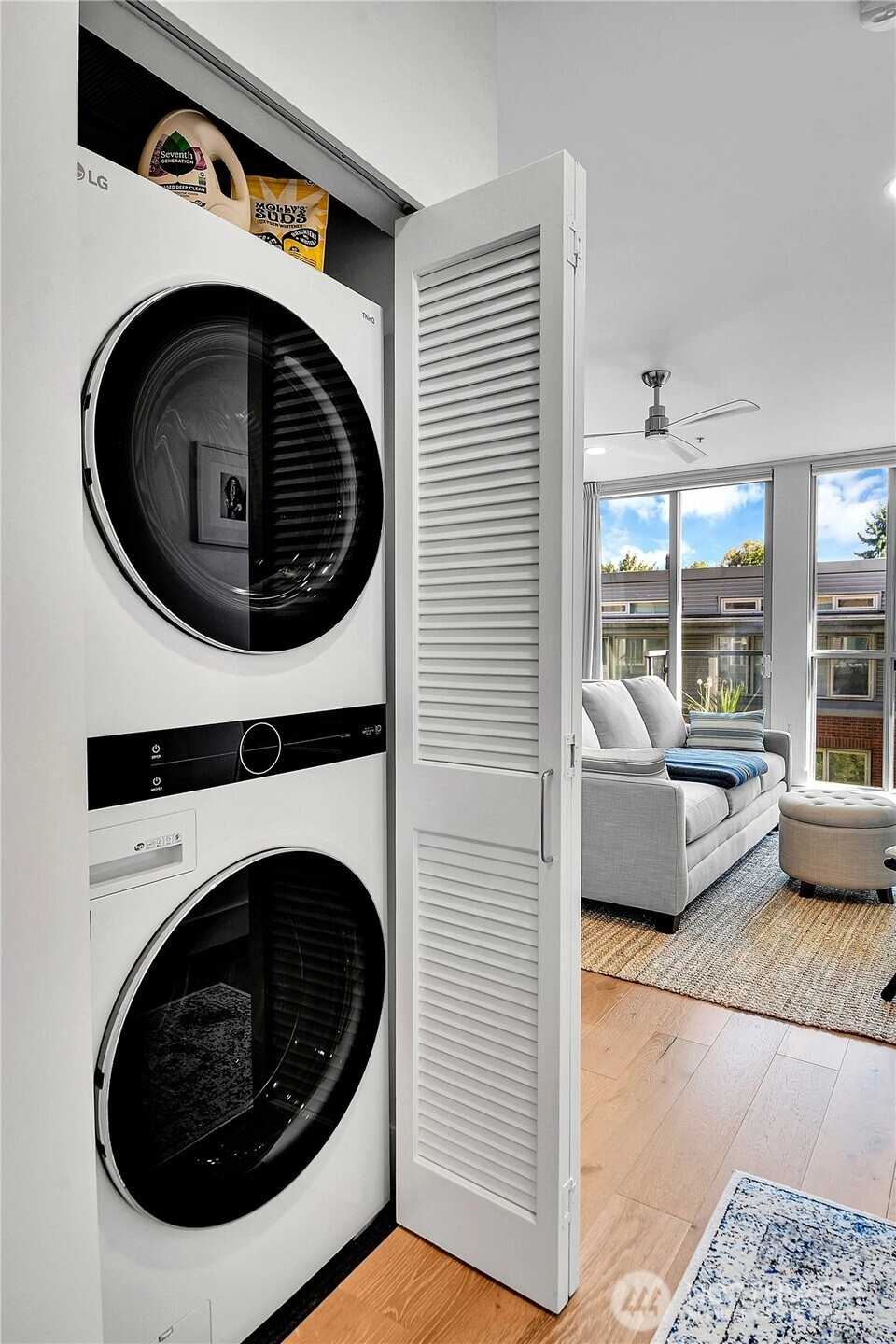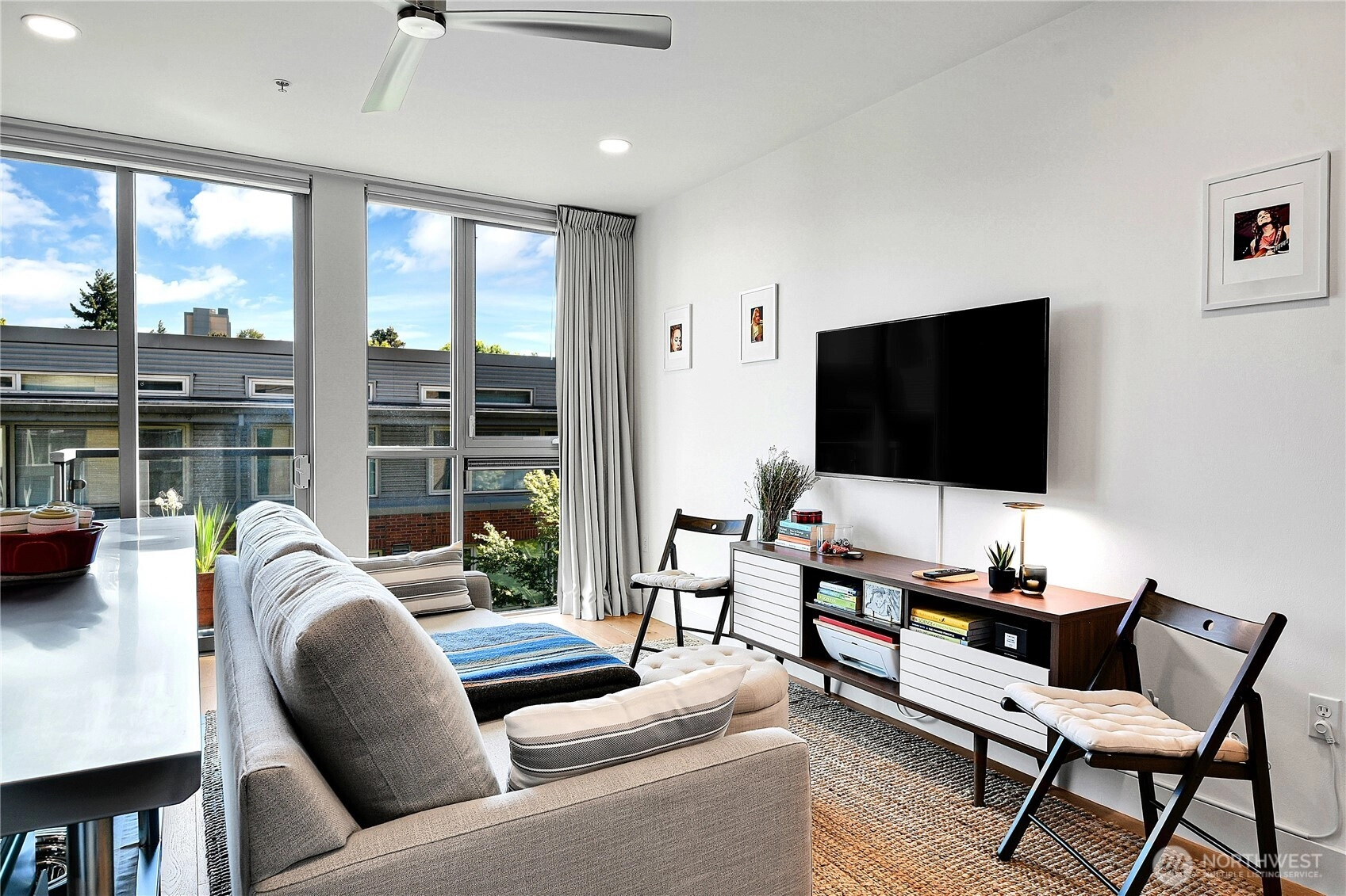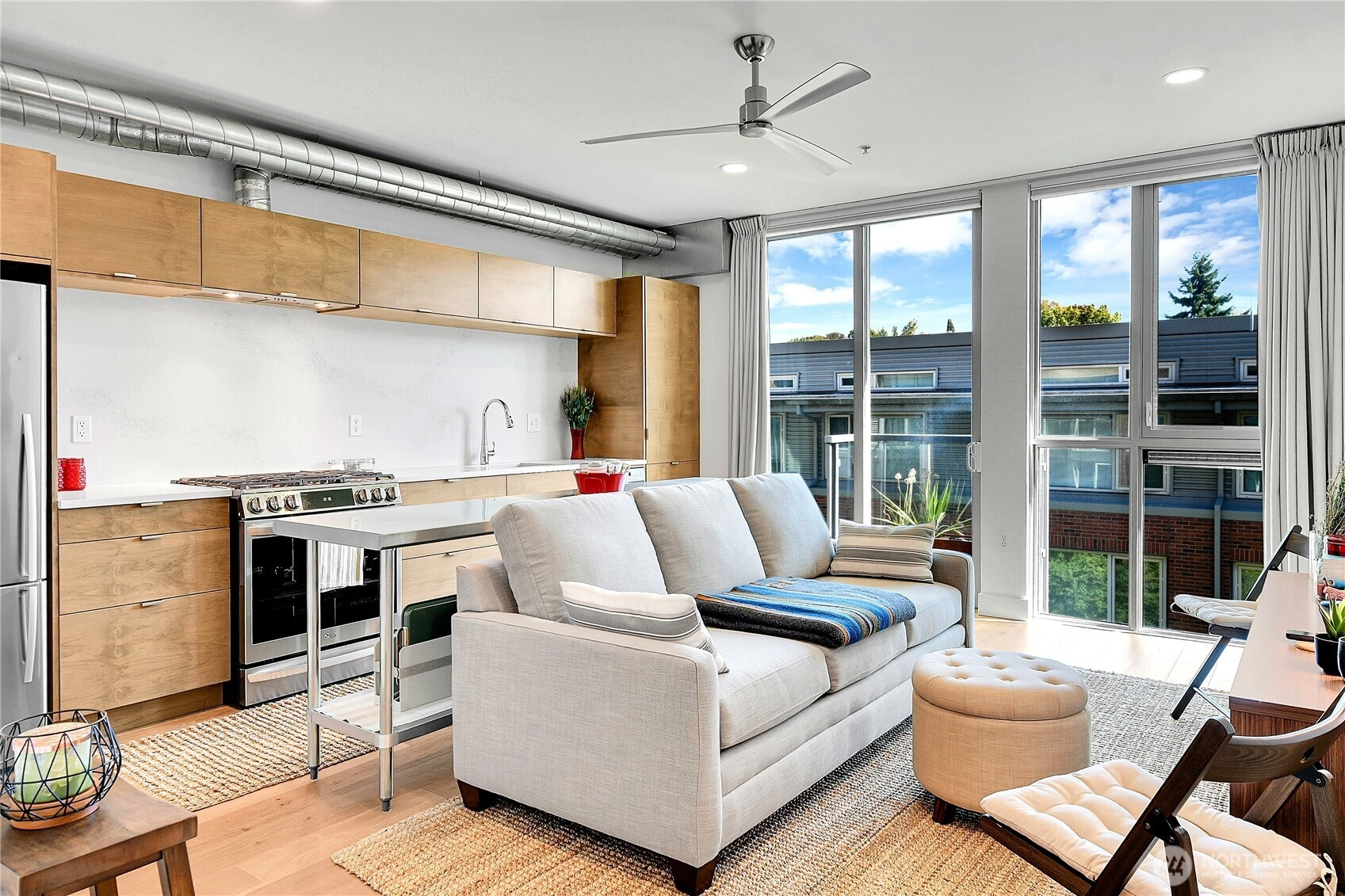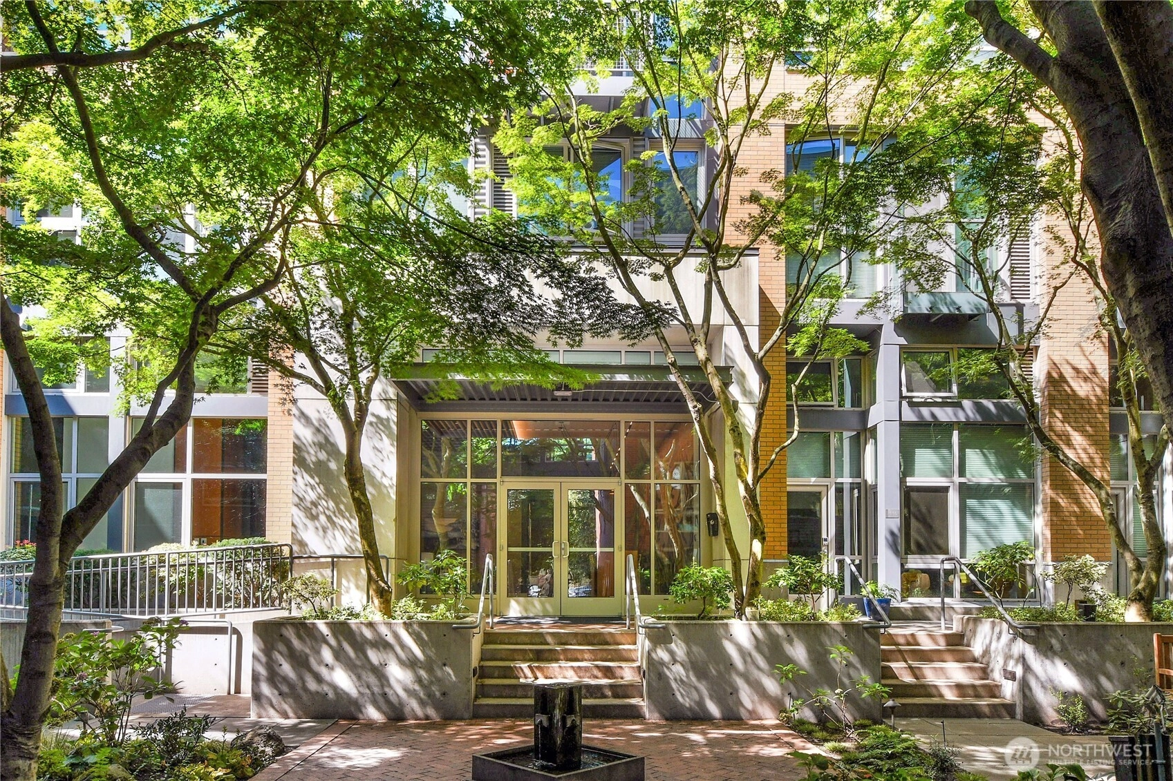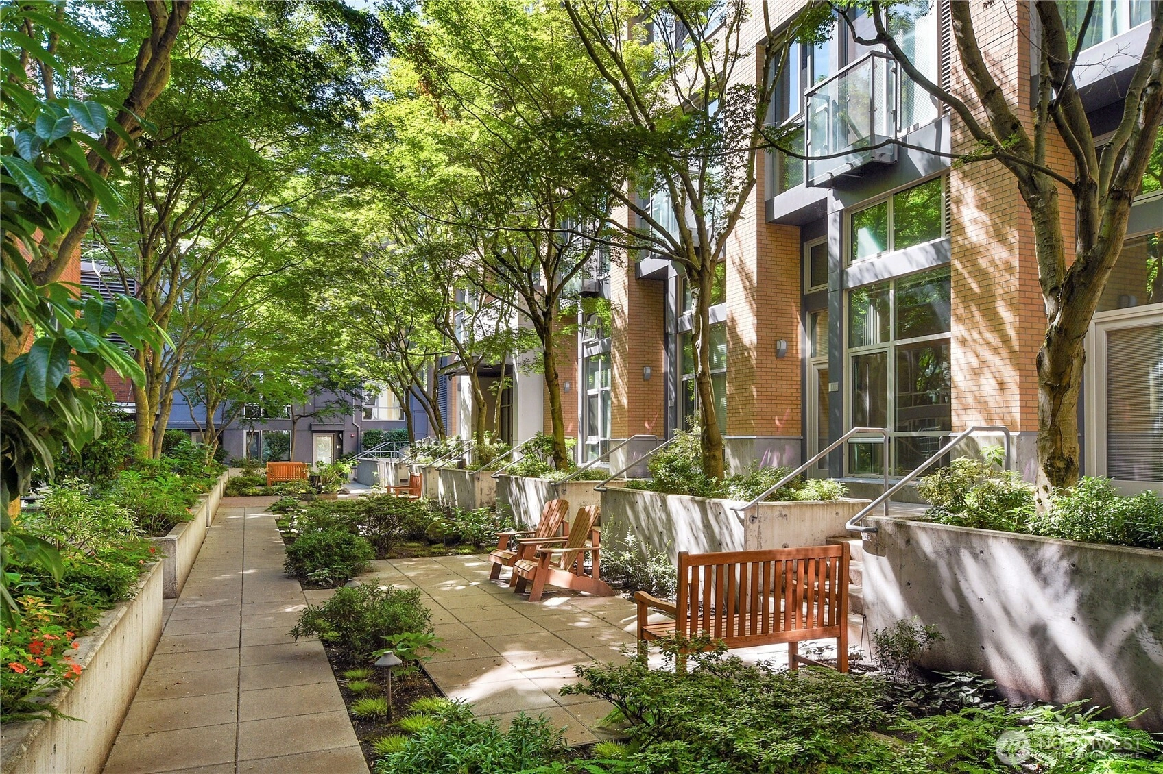 Sought after BRIX building in the heart of Capitol Hill! Light filled home with an east facing wall of windows and serene views of a lush courtyard. Highly upgraded including a gorgeous full bath, custom zoned recessed lighting and ceiling fans, gleaming wide plank oak hardwood floors, custom alder soft close cabinets & honed slab counter tops with marble quartz back splash. New gas oven range, dishwasher, washer/dryer, quiet convection heat, Hunter Douglas remote binds. Relax or entertain on rooftop deck w/views, gardens and barbeques. Leave the car in your secure garage, you are only steps away from shopping, cafes and fine dining, Light Rail, Volunteer Park. Pet friendly! Worry free living with Onsite building manager and a well run HOA