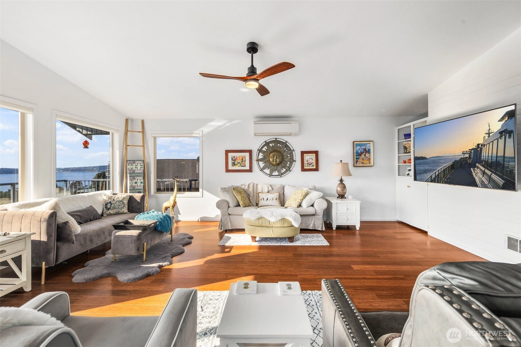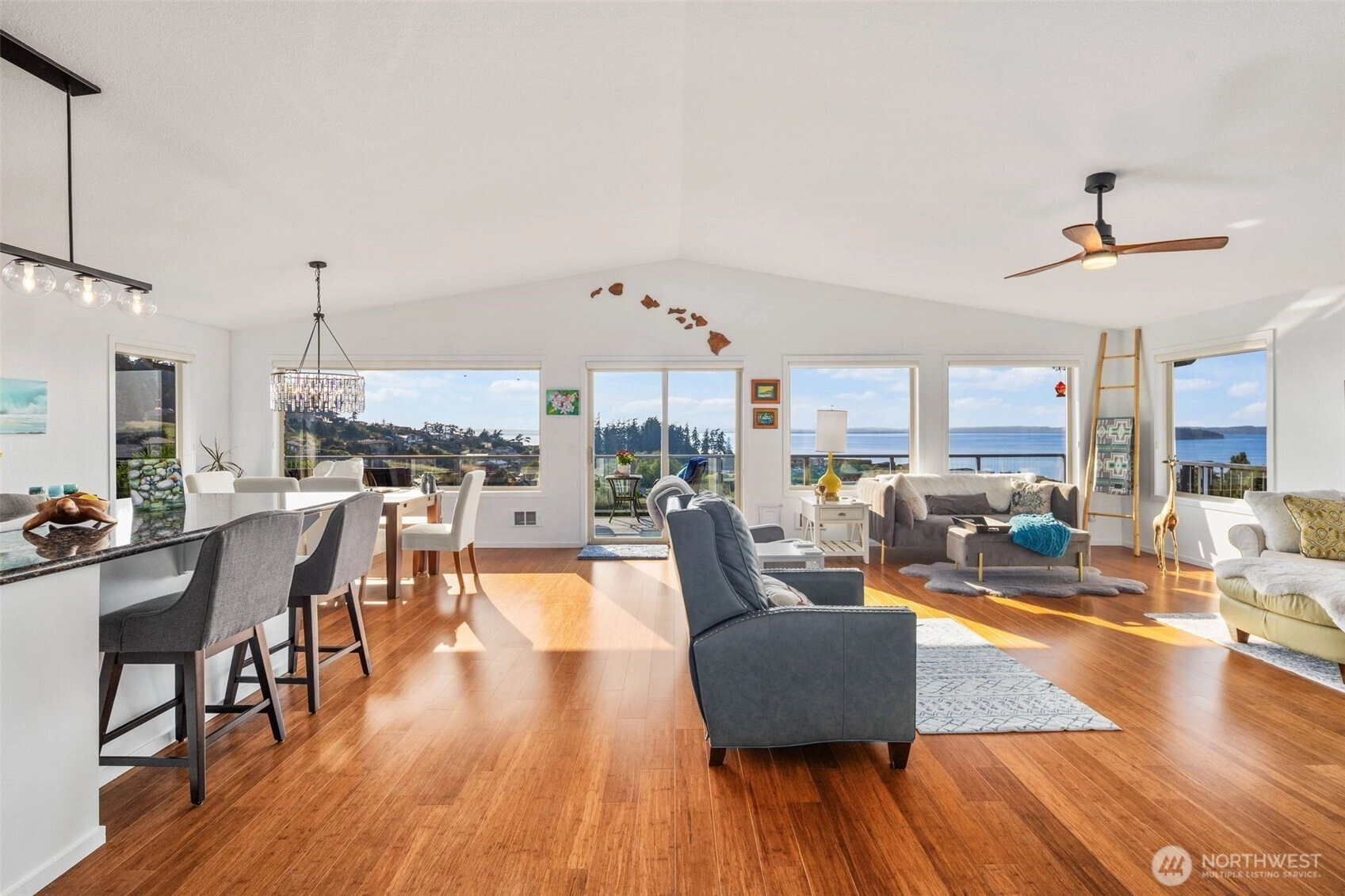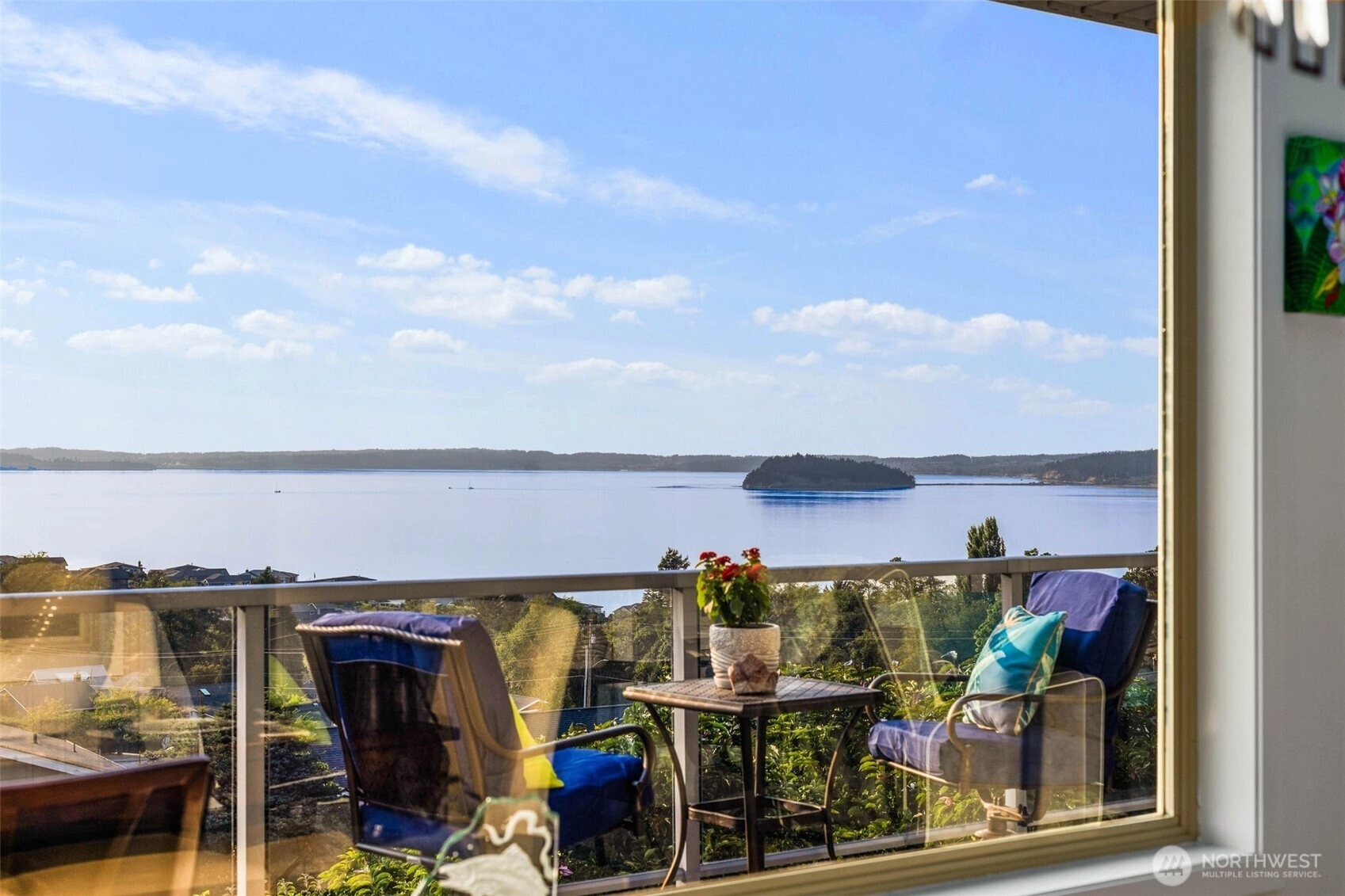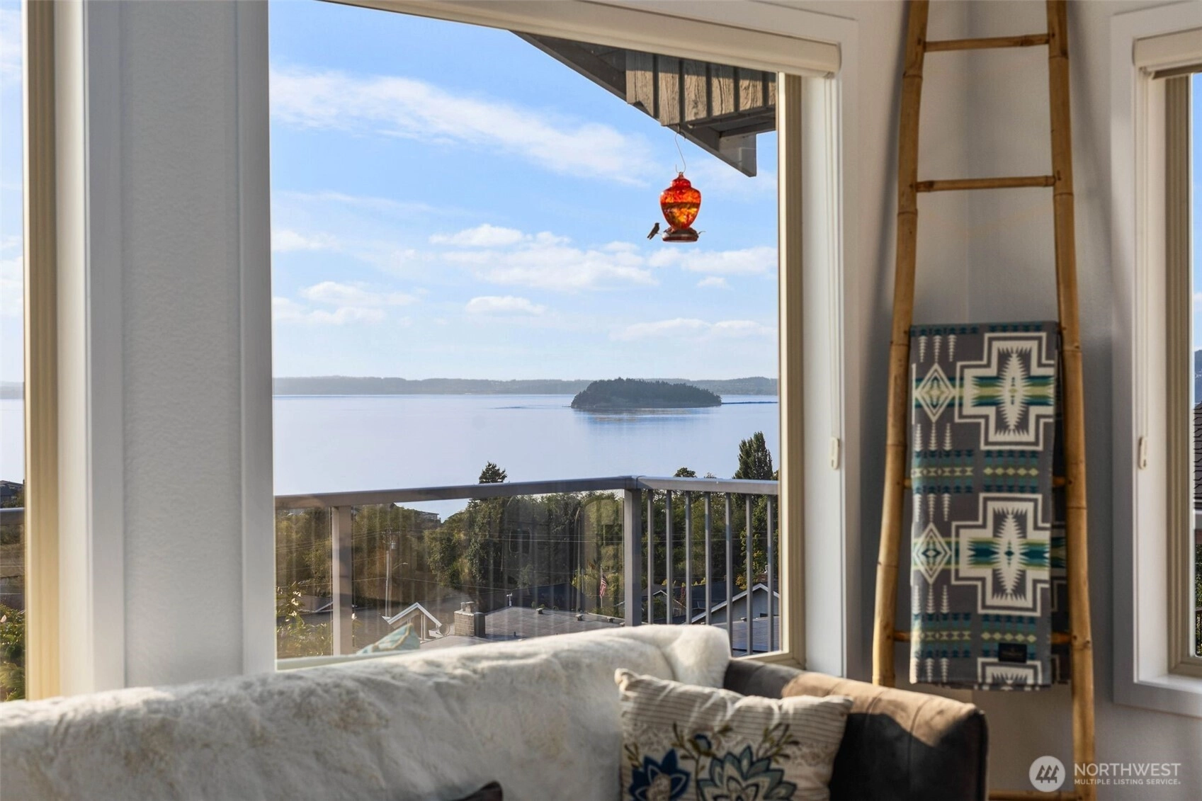 Experience island paradise with the perfect view, neighborhood, and house! This updated 2-bed, 3-bath home features bright open-concept living, vaulted ceilings, new bamboo floors, and a wraparound deck with stunning Sound and territorial views. The chef’s kitchen boasts slab granite counters, a breakfast bar, and stainless appliances. Downstairs includes a flex room with a walk-in storage closet and murphy bed, a family room opening to the beautiful backyard and view, and a 2-car garage with epoxy floor. The carport/boat house at the main entry provides level access. There’s also possible RV parking. Enjoy a private neighborhood beach and boat launch. No ferry needed—minutes from I-5!