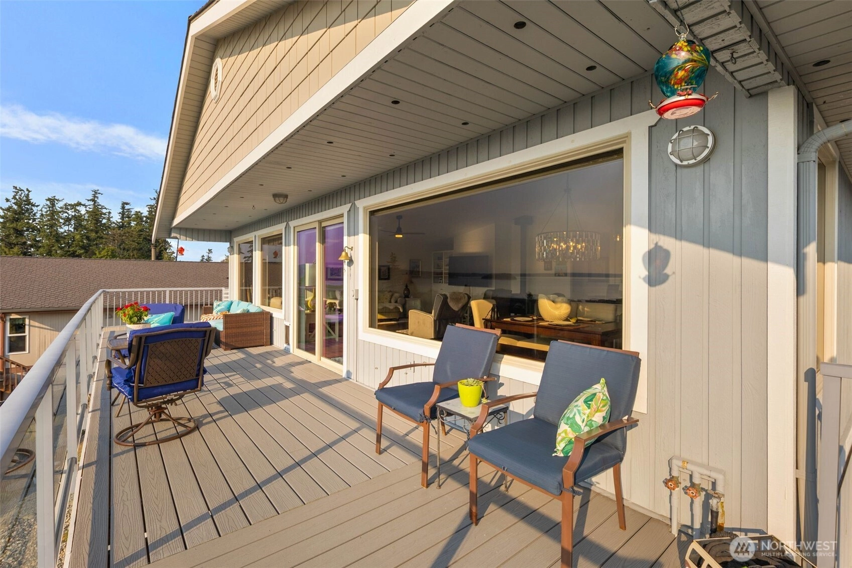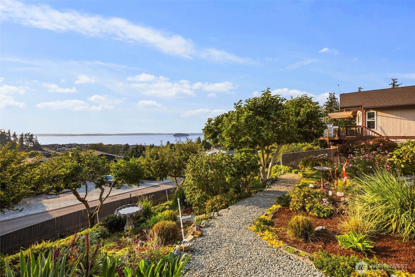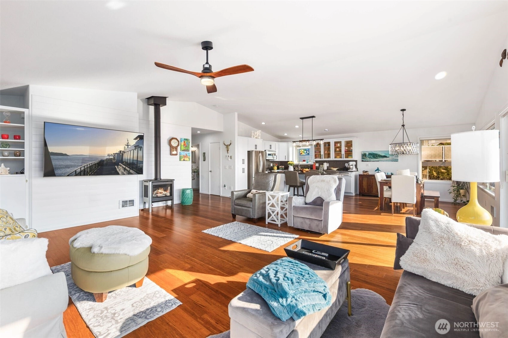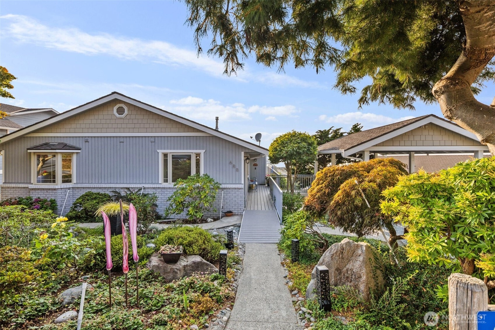 Experience island paradise with the perfect view, neighborhood, and house! This updated 2-bed, 3-bath home features bright open-concept living, vaulted ceilings, new bamboo floors, and a wraparound deck with stunning Sound and territorial views. The chef’s kitchen boasts slab granite counters, a breakfast bar, and stainless appliances. Downstairs includes a flex room with a walk-in storage closet and murphy bed, a family room opening to the beautiful backyard and view, and a 2-car garage with epoxy floor. The carport/boat house at the main entry provides level access. There’s also possible RV parking. Enjoy a private neighborhood beach and boat launch. No ferry needed—minutes from I-5!