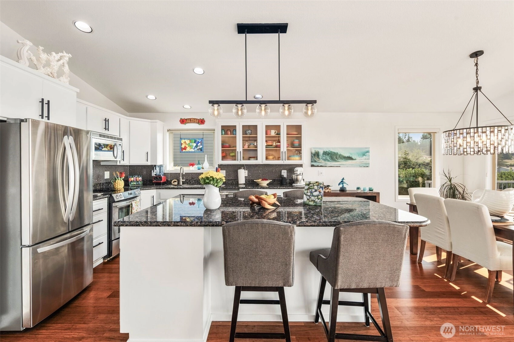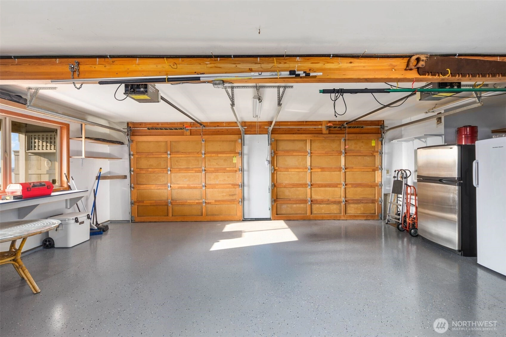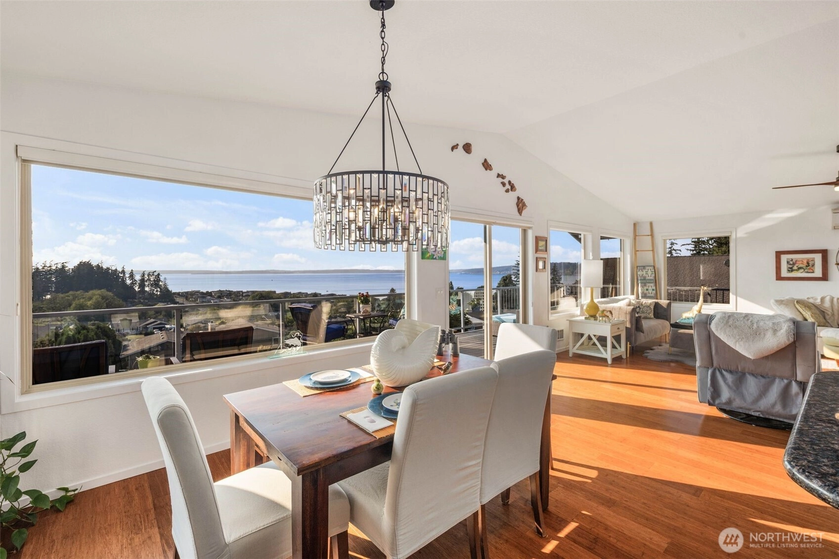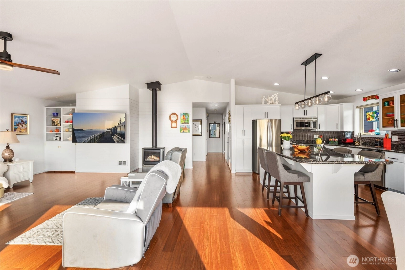 Experience island paradise with the perfect view, neighborhood, and house! This updated 2-bed, 3-bath home features bright open-concept living, vaulted ceilings, new bamboo floors, and a wraparound deck with stunning Sound and territorial views. The chef’s kitchen boasts slab granite counters, a breakfast bar, and stainless appliances. Downstairs includes a flex room with a walk-in storage closet and murphy bed, a family room opening to the beautiful backyard and view, and a 2-car garage with epoxy floor. The carport/boat house at the main entry provides level access. There’s also possible RV parking. Enjoy a private neighborhood beach and boat launch. No ferry needed—minutes from I-5!