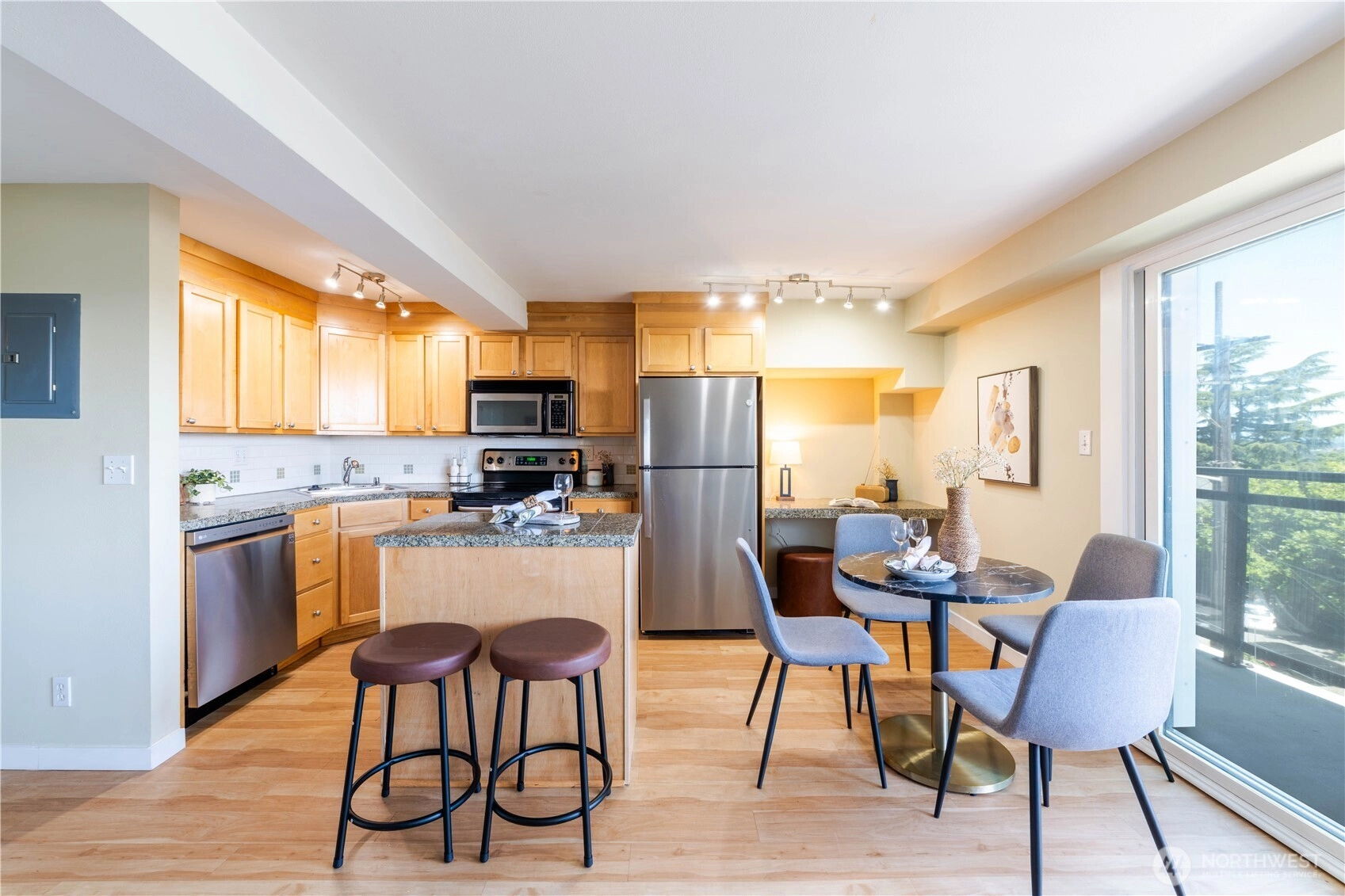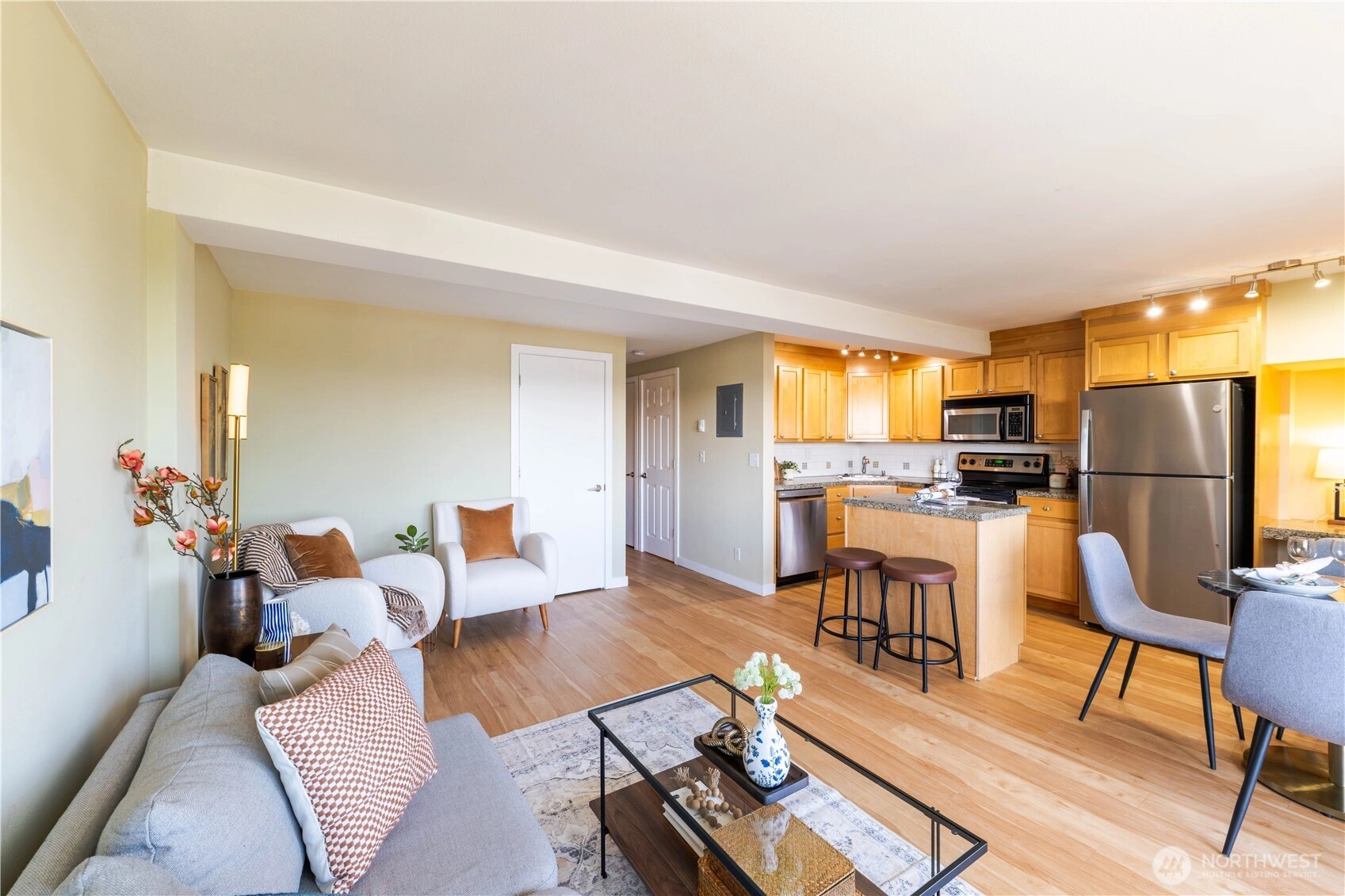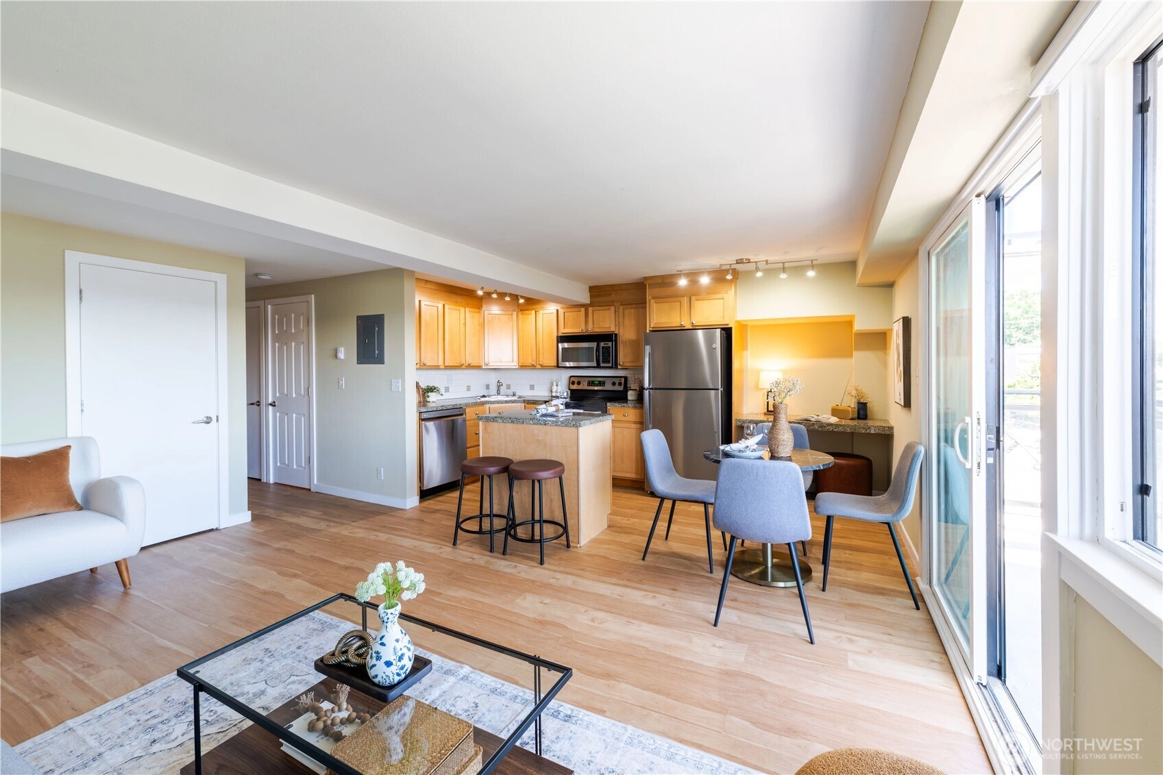 Spectacular views abound in this light filled 2 bedroom, 1 bath Seattle condo! 5th floor of the well-maintained Taylor building, sip your coffee on your deck while you take in the views of Queen Anne, Lake Union, downtown Seattle, and the Cascade Mountain range! This is a really great location, close to many employers, restaurants and night life. Nearby Fremont and Ballard and all kinds of recreation are very near. Go Kayaking on Lake Union, enjoy Queen Anne, and the whole South Lake Union Area. Storage Unit included. Deep parking space in common garage can fit 2 small cars in a row Newer roof and exterior of building. NO RENTAL CAP!