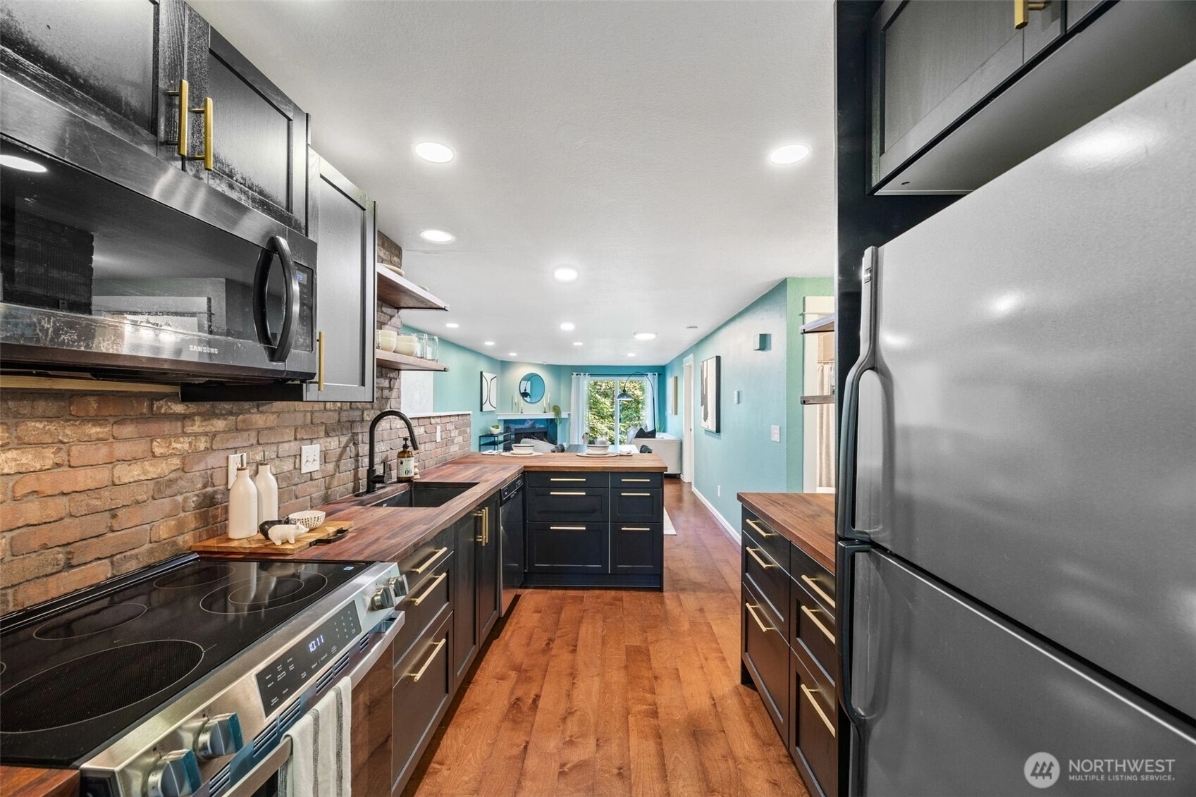 Stylish and move-in ready, this beautifully updated Kirkland condo blends comfort with modern design. The kitchen features a reclaimed brick backsplash, butcher block countertops, and stainless steel appliances, while engineered hardwood flooring flows throughout. Bathrooms are tastefully refreshed with large-format tile, adding a sleek touch. Step outside to your private patio with direct backyard access to a trail that leads straight into the heart of Kirkland. Two dedicated parking spaces, including a carport. No rental restrictions, plus amenities like a pool and hot tub. Just minutes from downtown Kirkland, waterfront trails, parks, Google, and the farmers market, this home puts the very best of Kirkland right at your doorstep.
