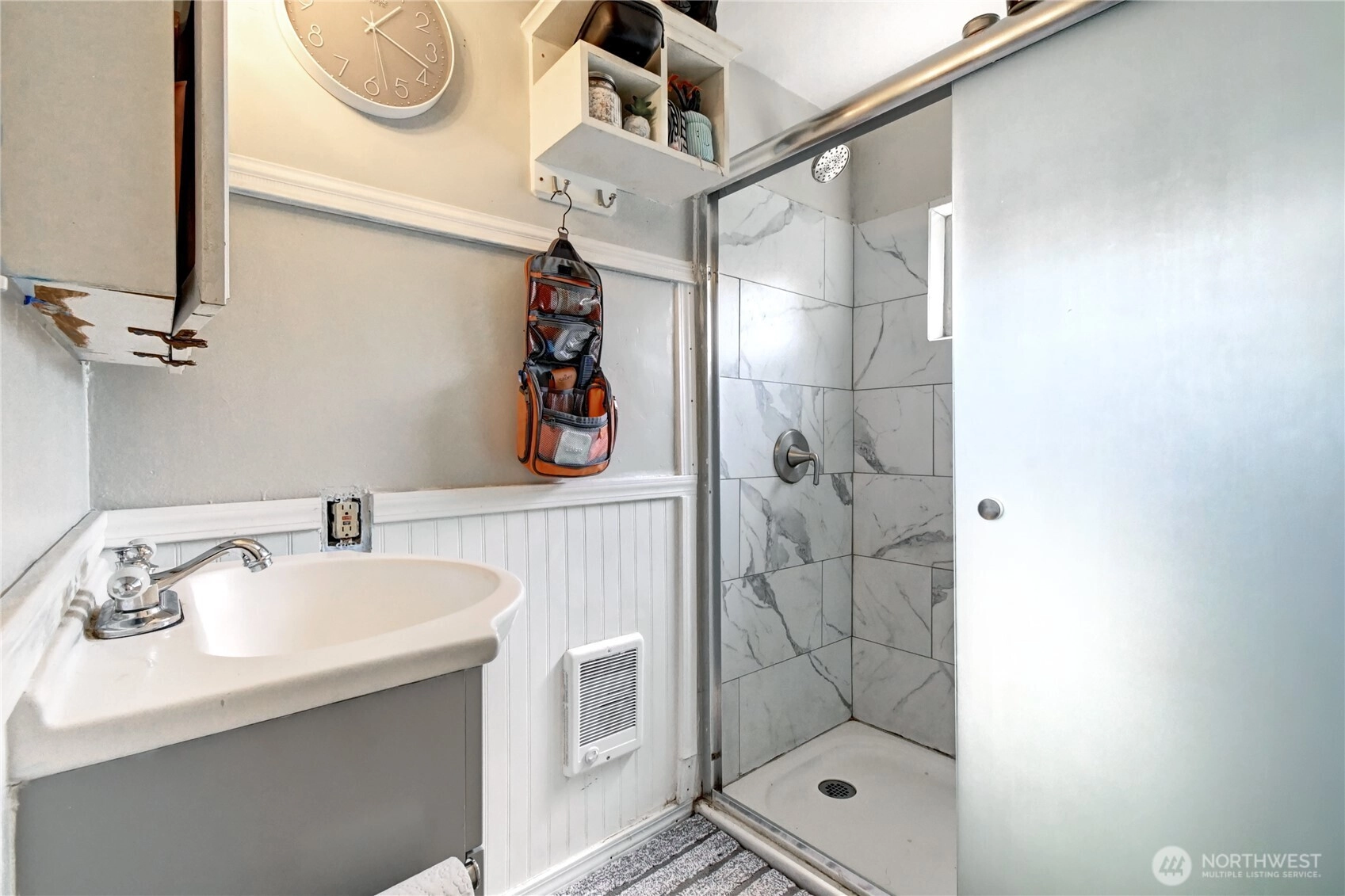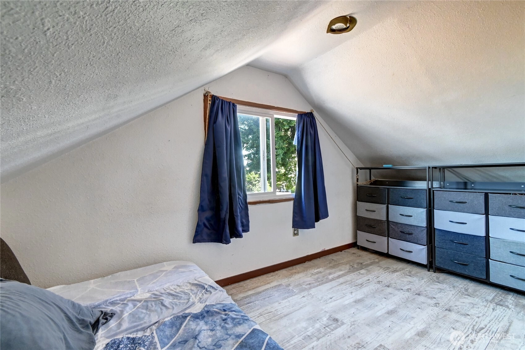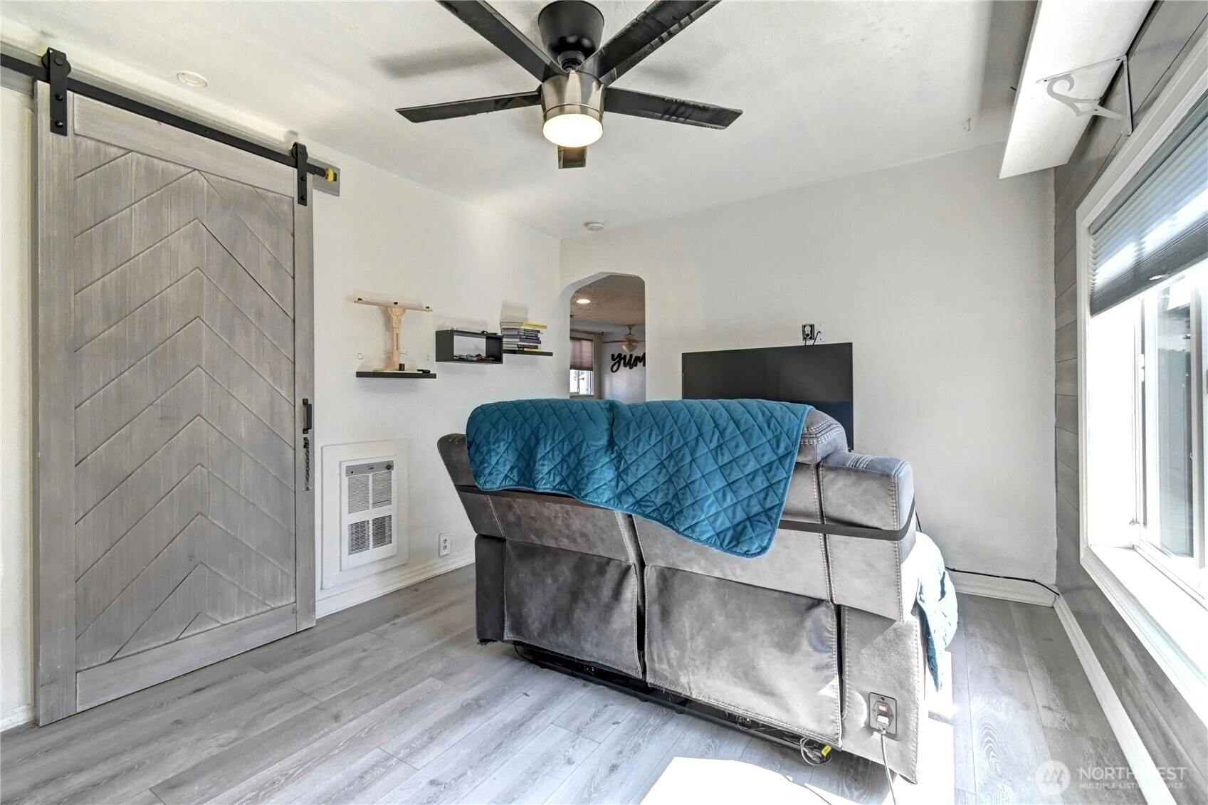 NEW PRICE! North Everett two story with 3 bedrooms and 2 baths. Cozy front porch and fully fenced in yard with shed/shop area great for your hobbies. Updated flooring with laminate wood floors, main floor bedroom with stylish barn door, kitchen with eating space, 3/4 bath and laundry room, along with extra storage area by the stairway. Upstairs you will find the primary suite with built-in closet, full bath and 3rd bedroom. Enjoy all that Everett has to offer with the local restaurants, shops, waterfront marina and the Angels of the wind arena.